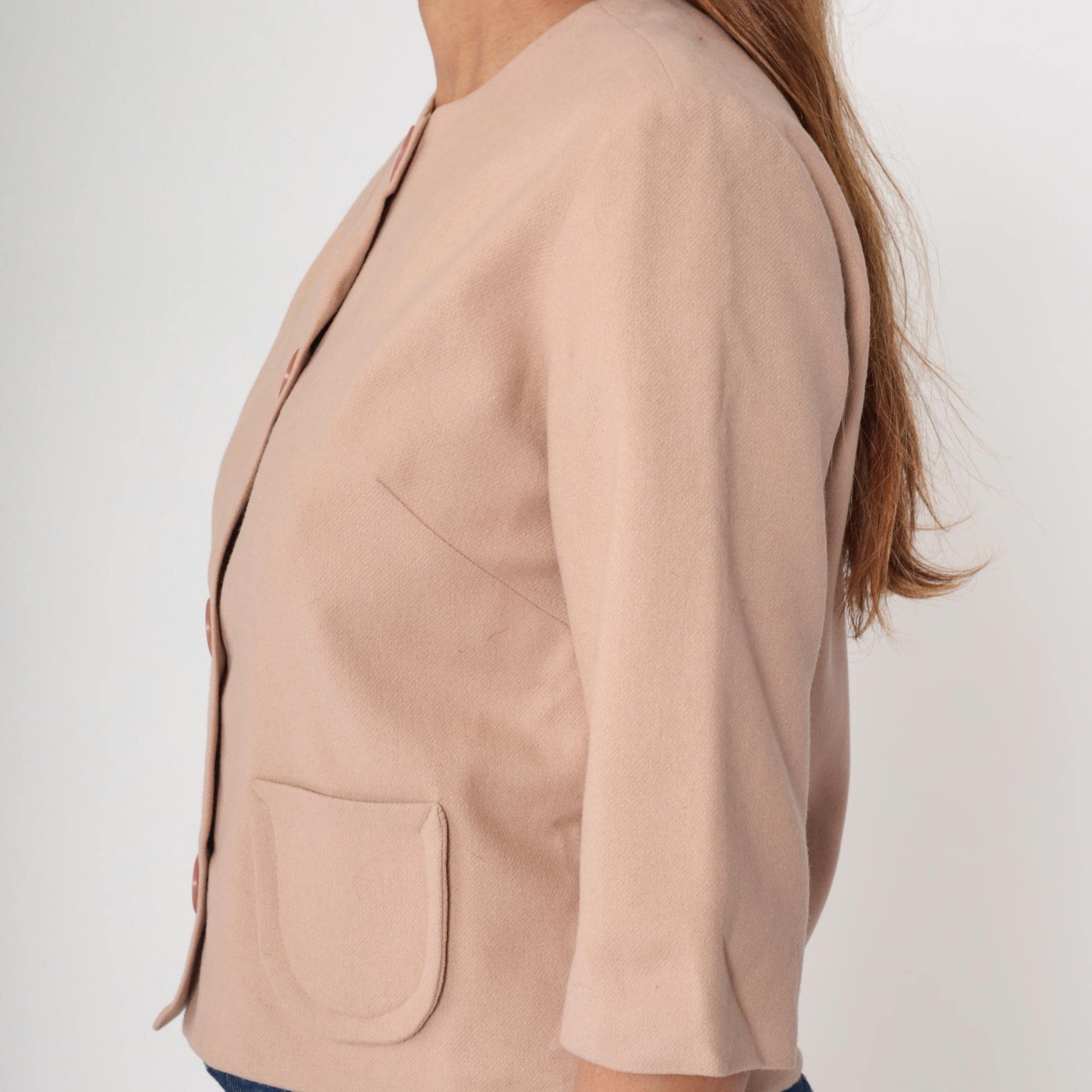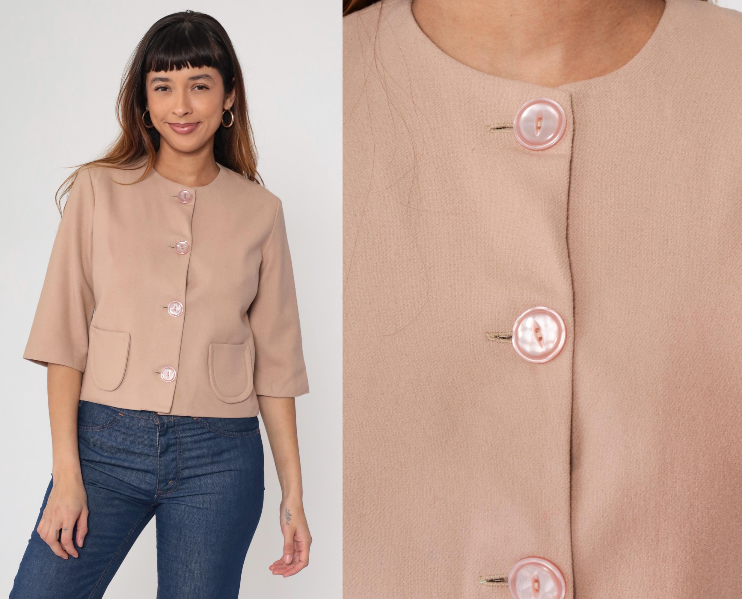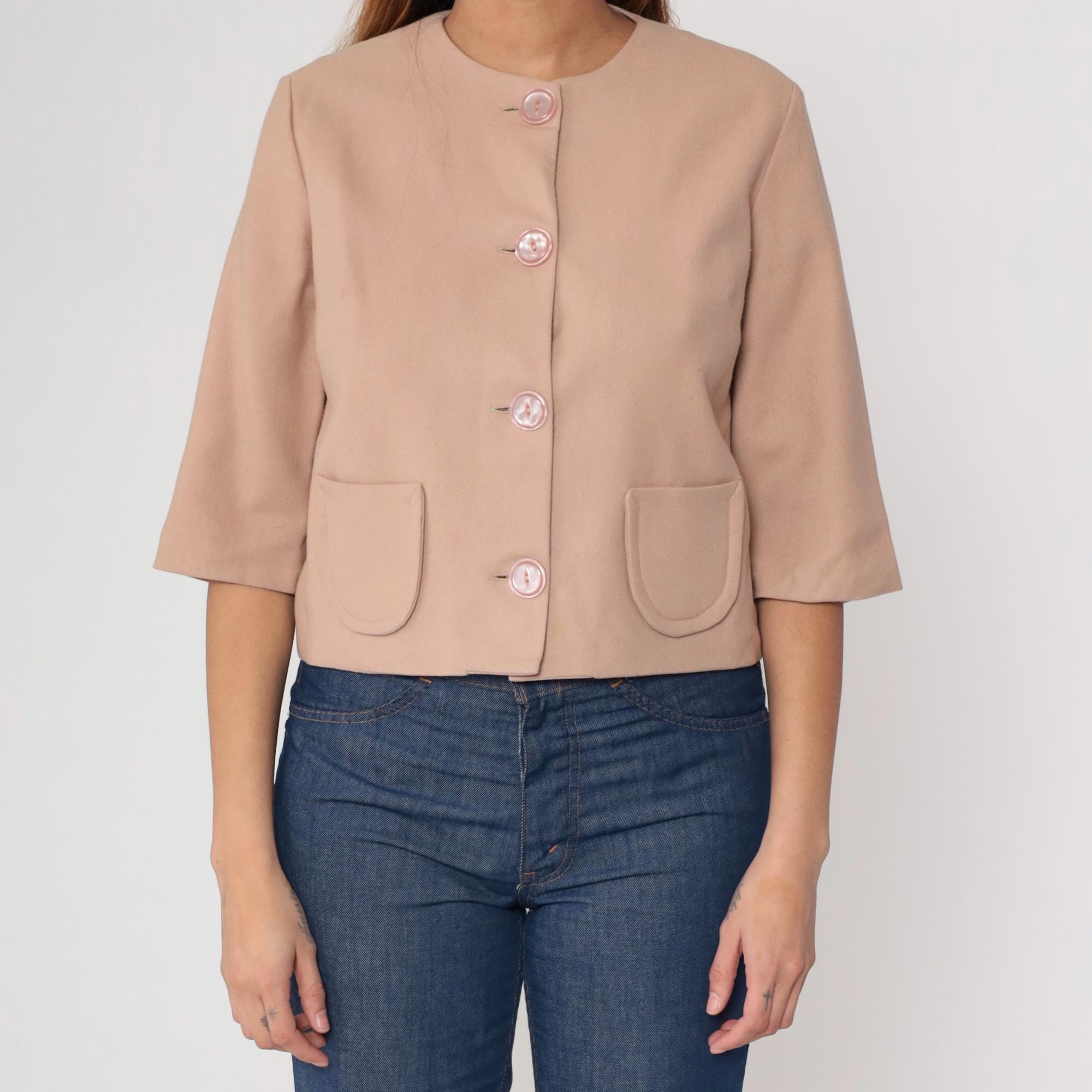 0s cropped jacket in beige wool blend featuring pink pearlized buttons and a round neckline. Designed with short sleeves, a boxy silhouette, and two front pockets.