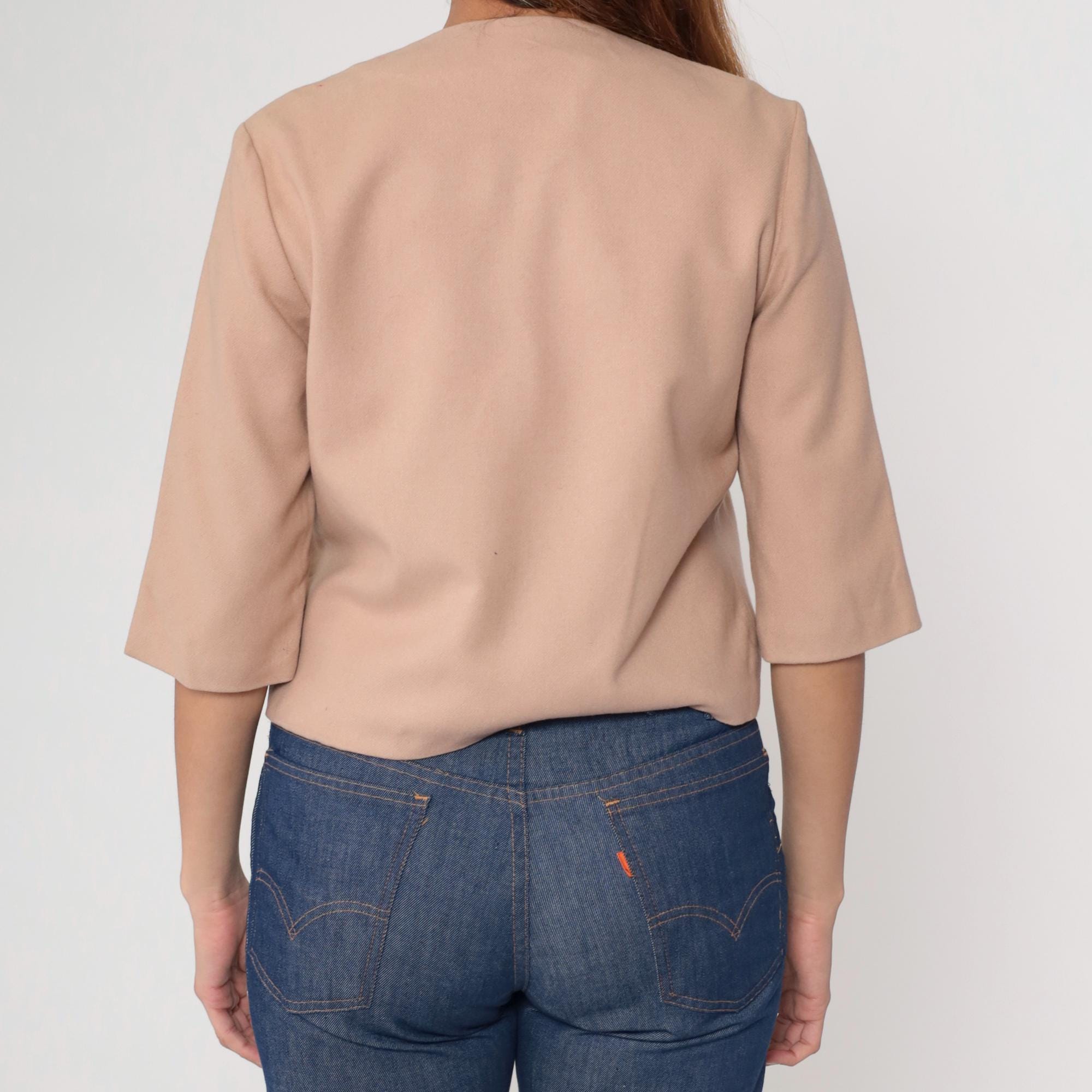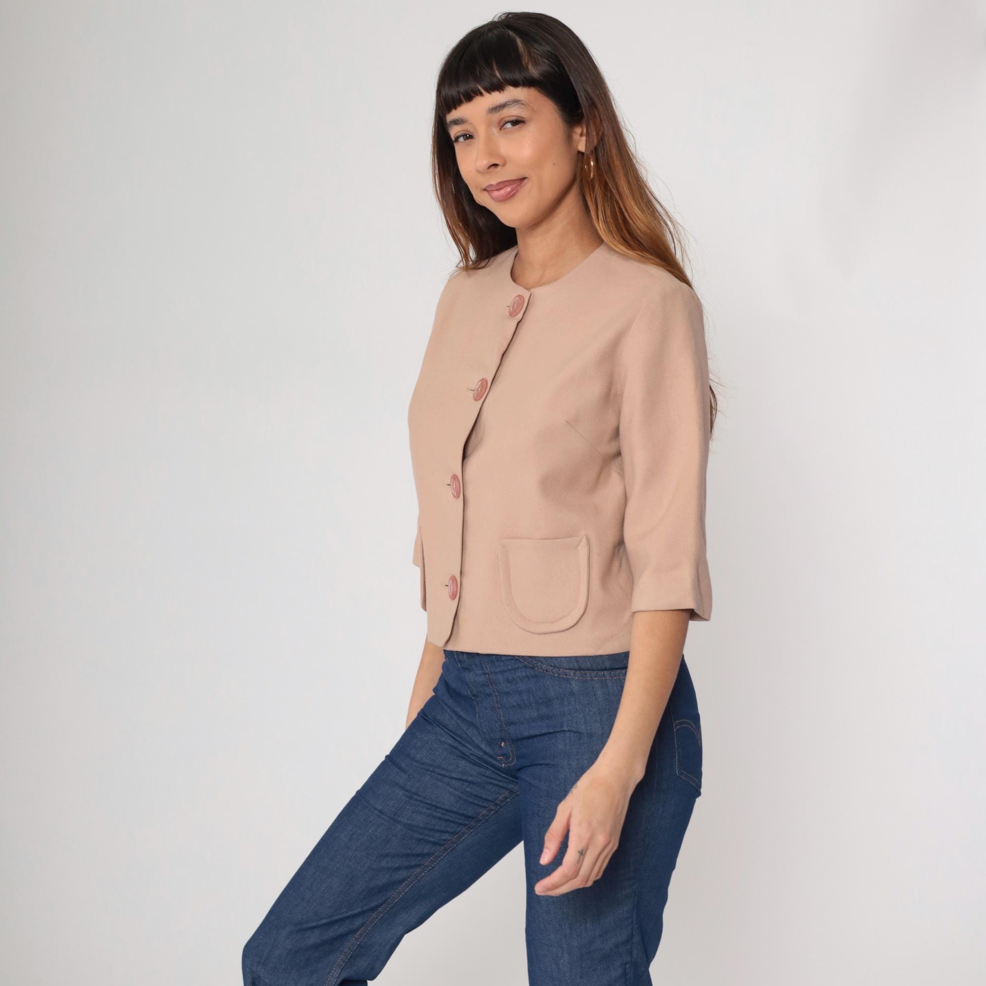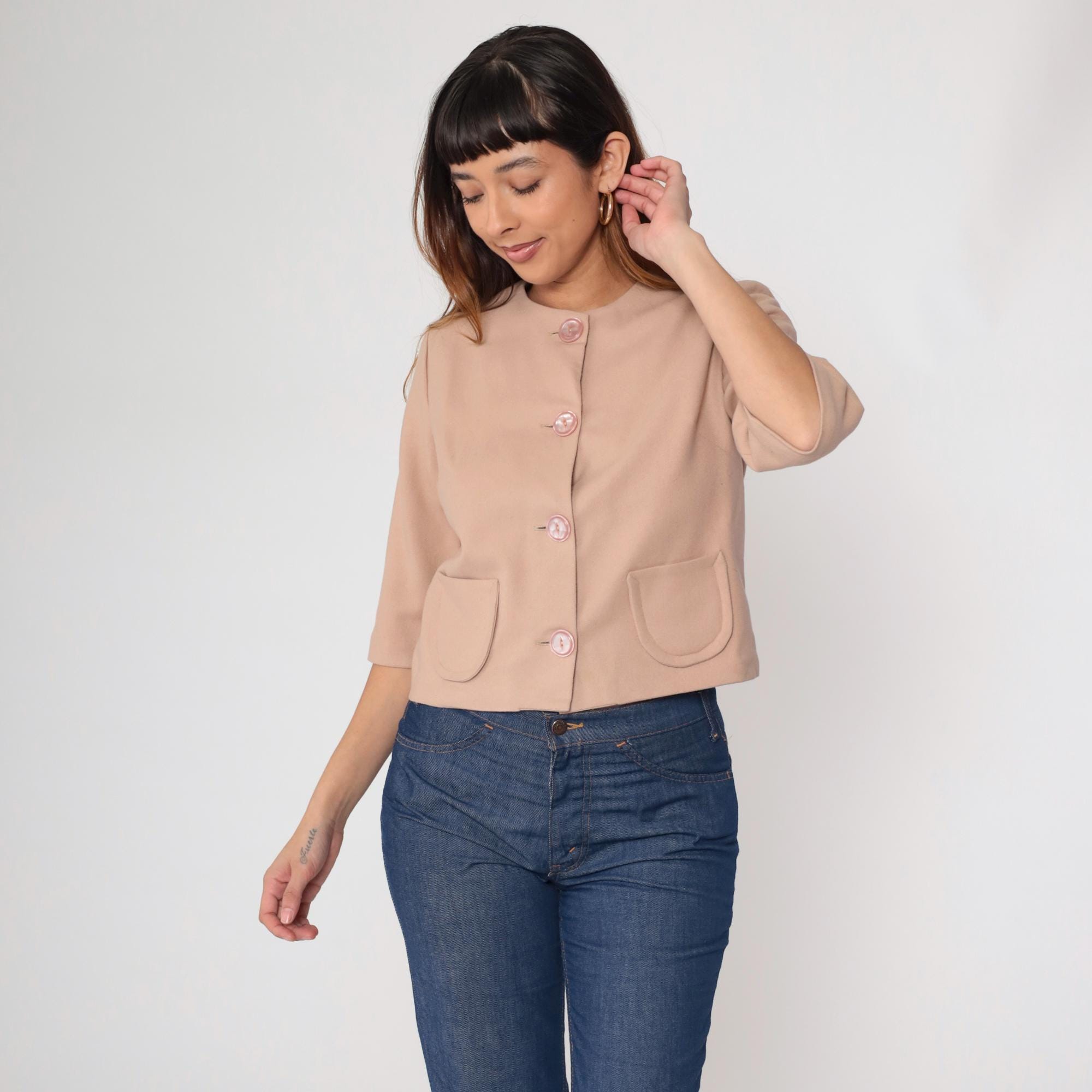 0s cropped jacket in beige wool blend featuring pink pearlized buttons and a round neckline. Designed with short sleeves, a boxy silhouette, and two front pockets.