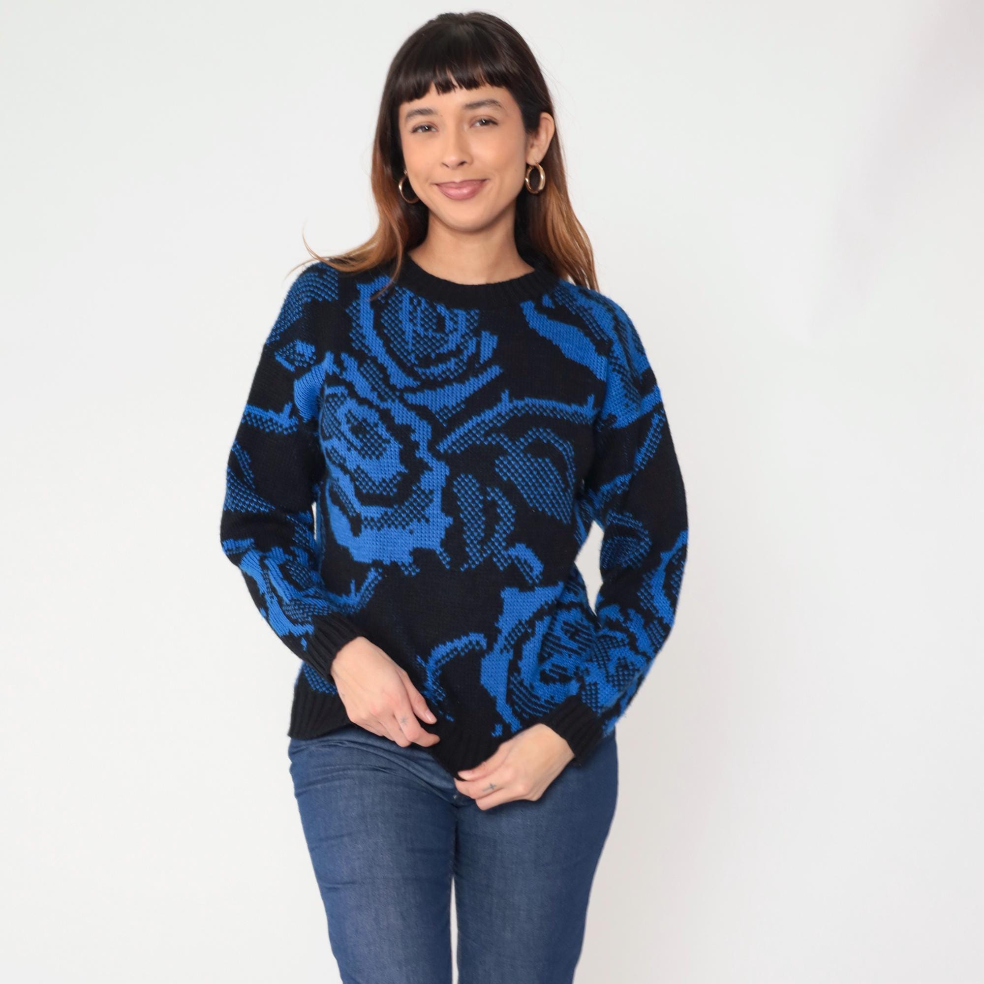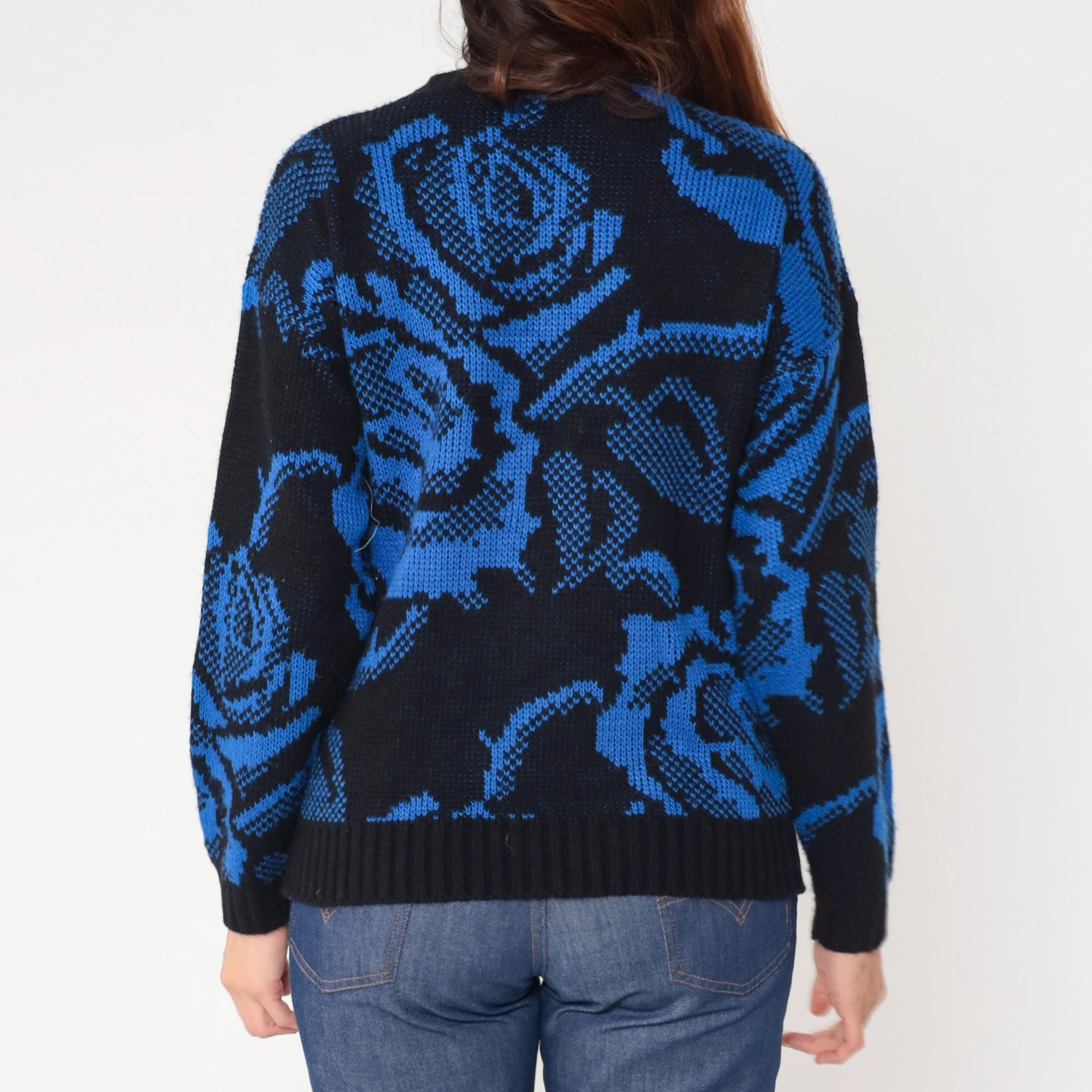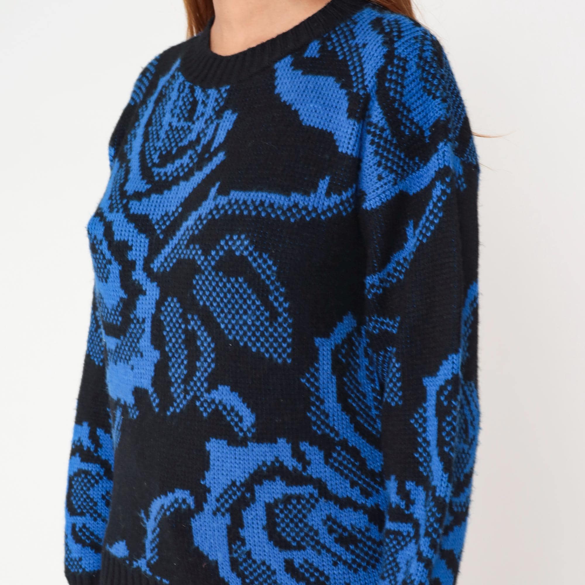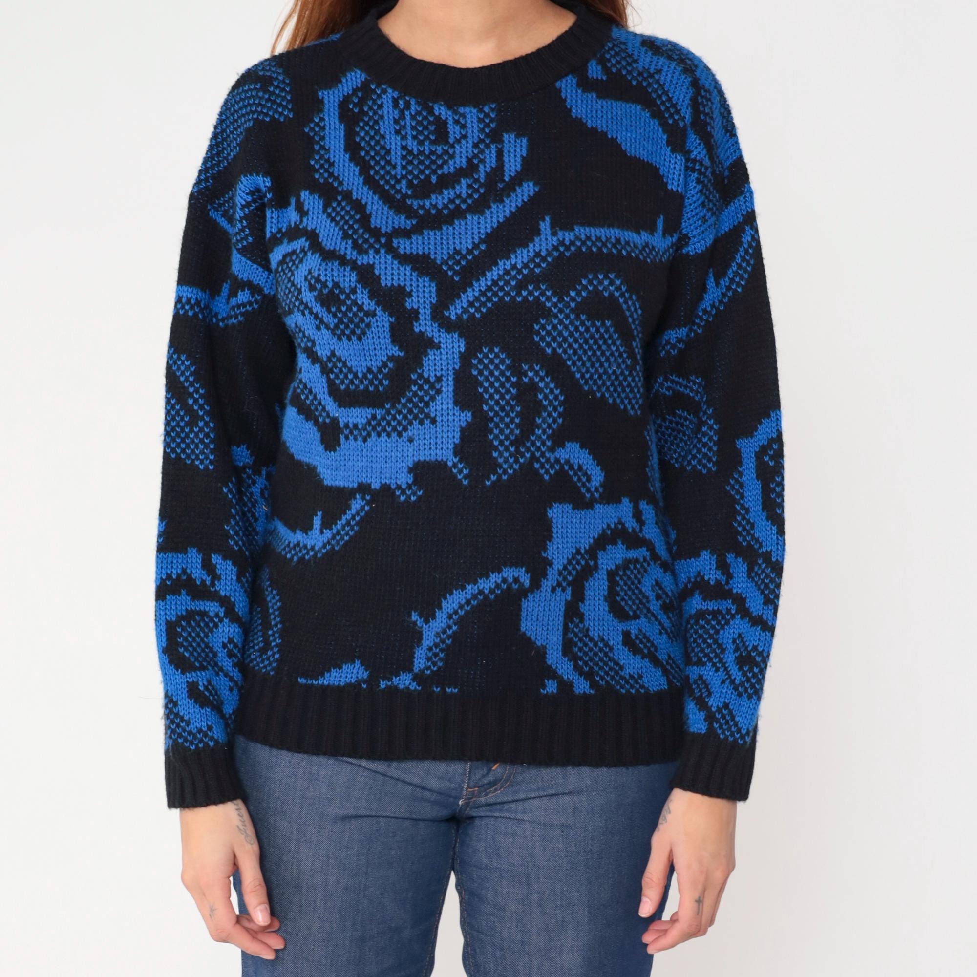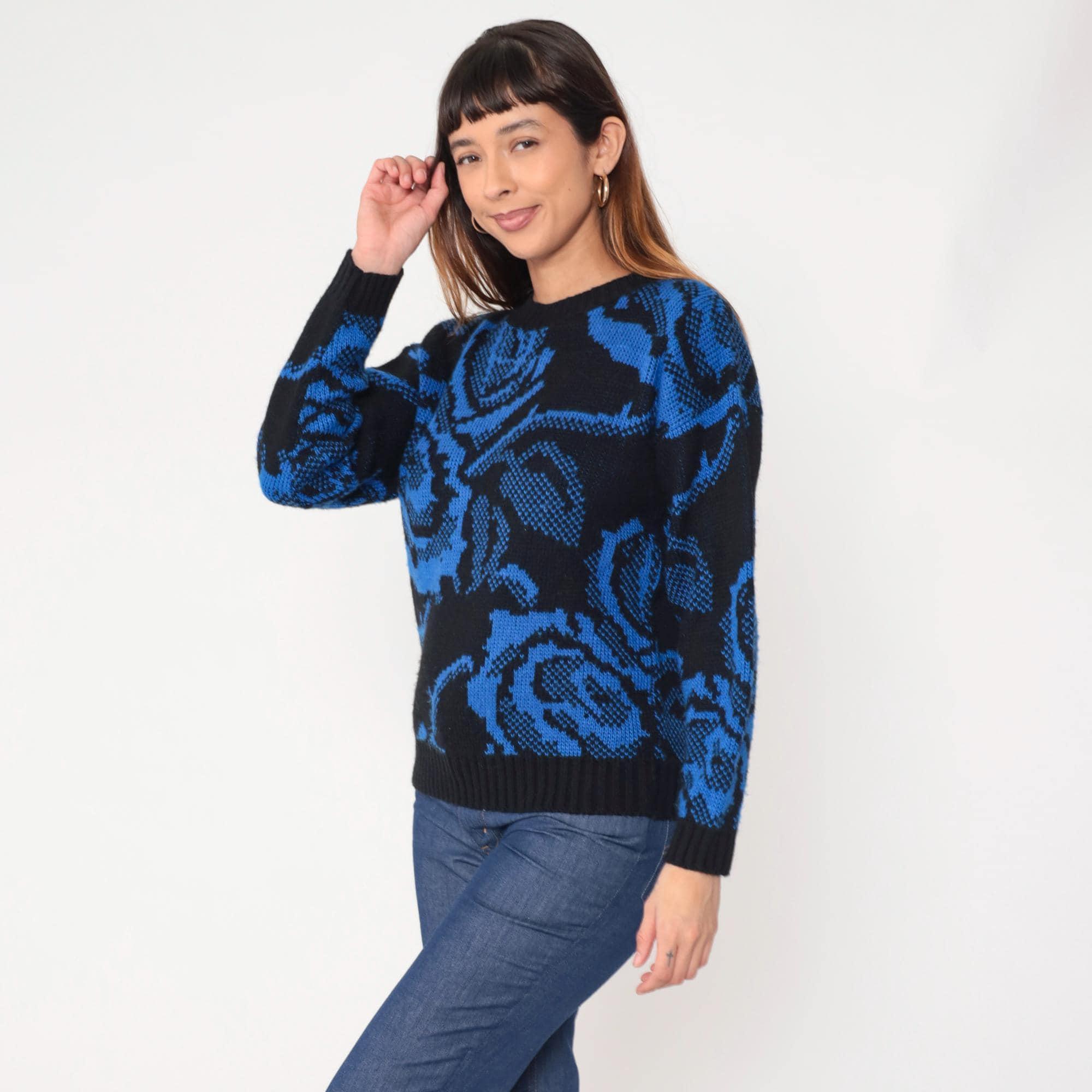 80s blue and black floral sweater by Basic Outlook featuring an oversized rose pattern throughout. Made from 100% acrylic with a crew neckline, ribbed cuffs, and hem.