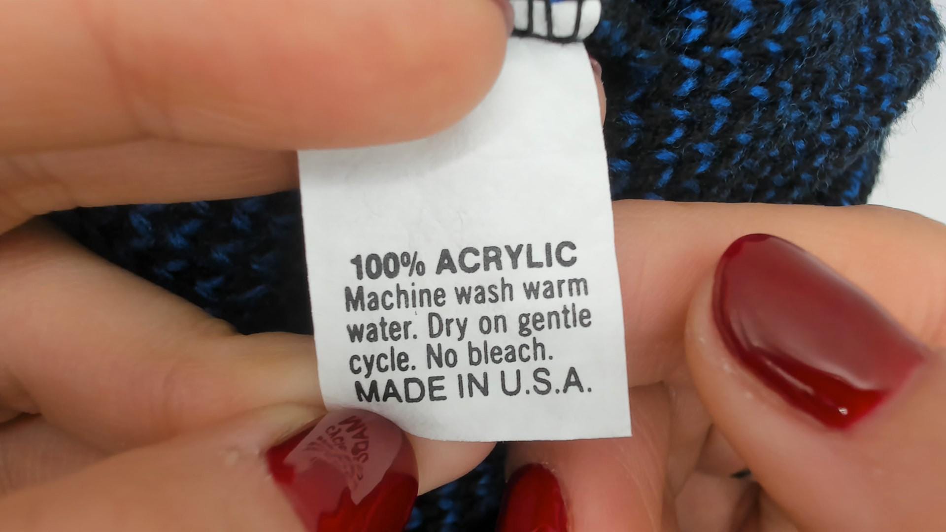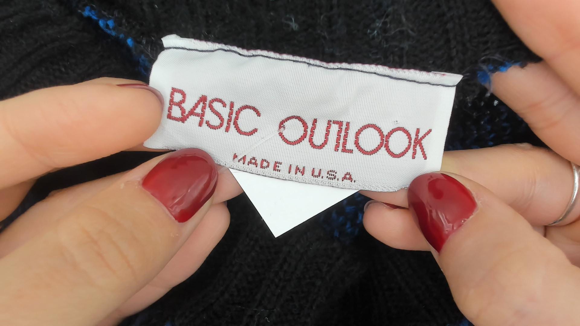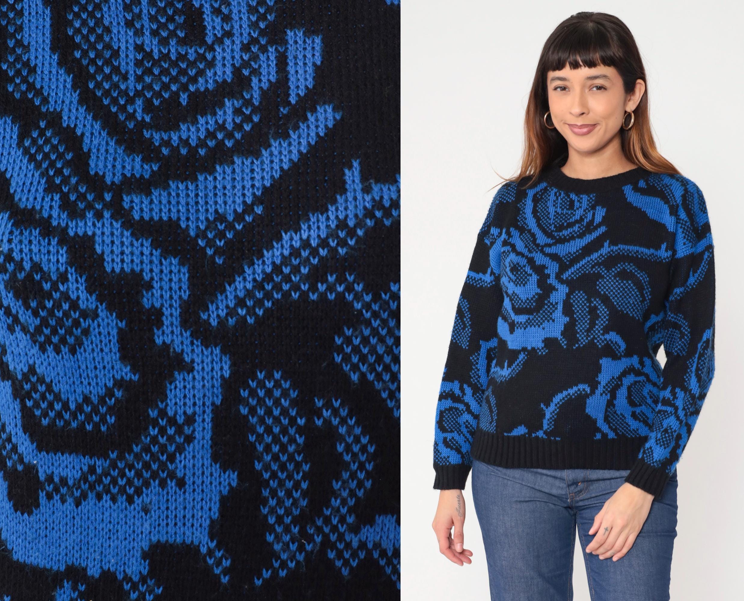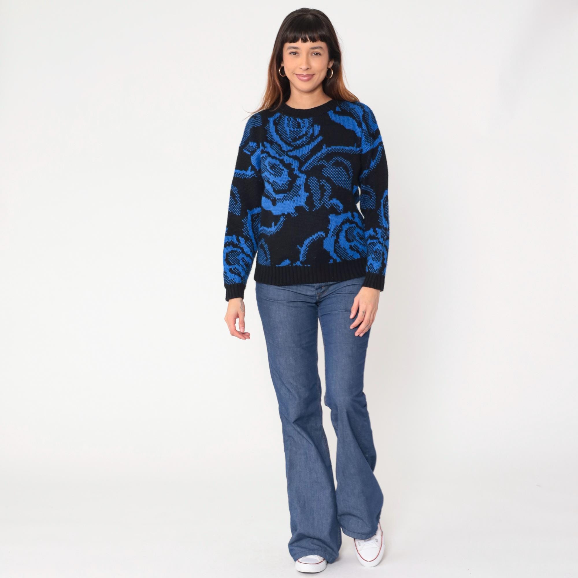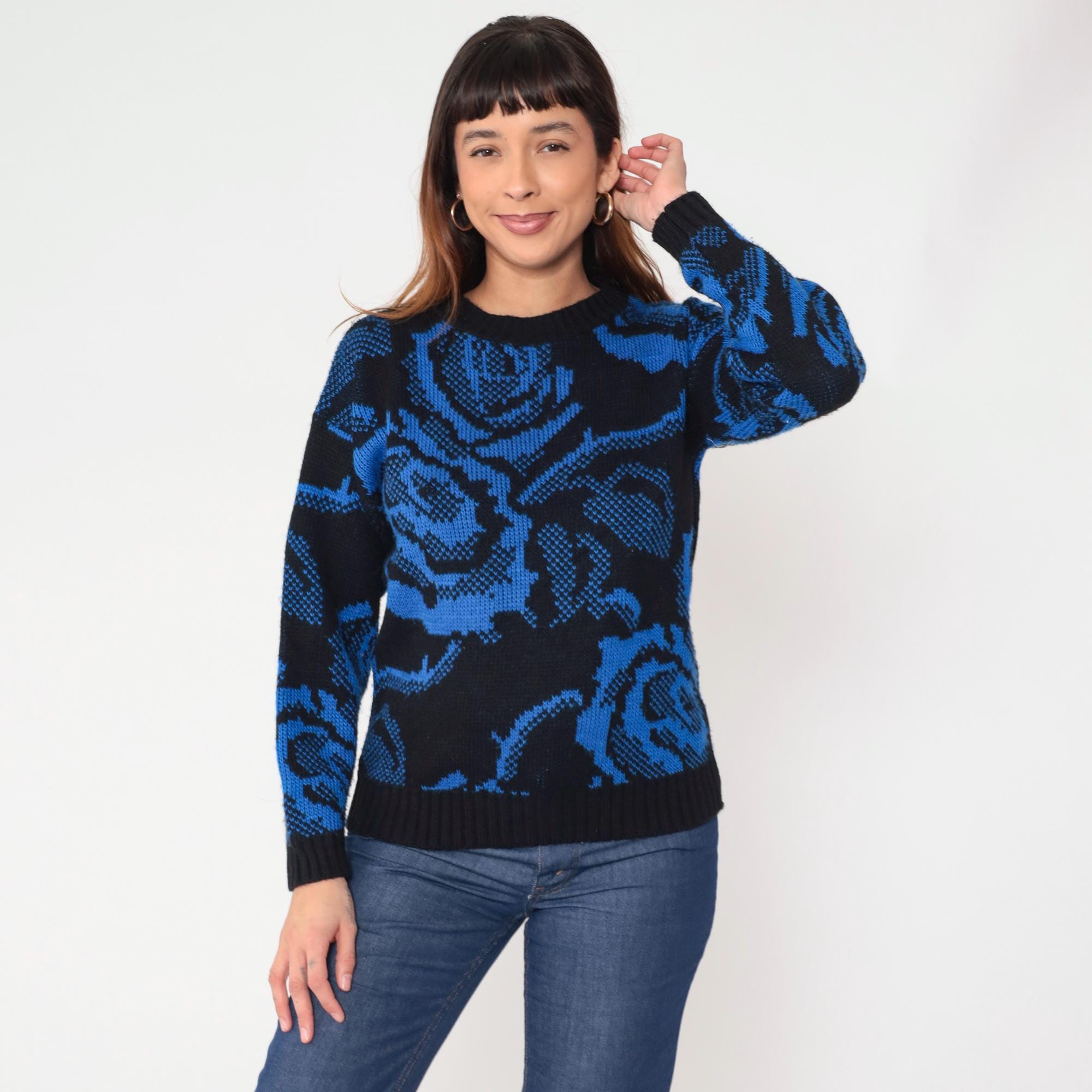 80s blue and black floral sweater by Basic Outlook featuring an oversized rose pattern throughout. Made from 100% acrylic with a crew neckline, ribbed cuffs, and hem.