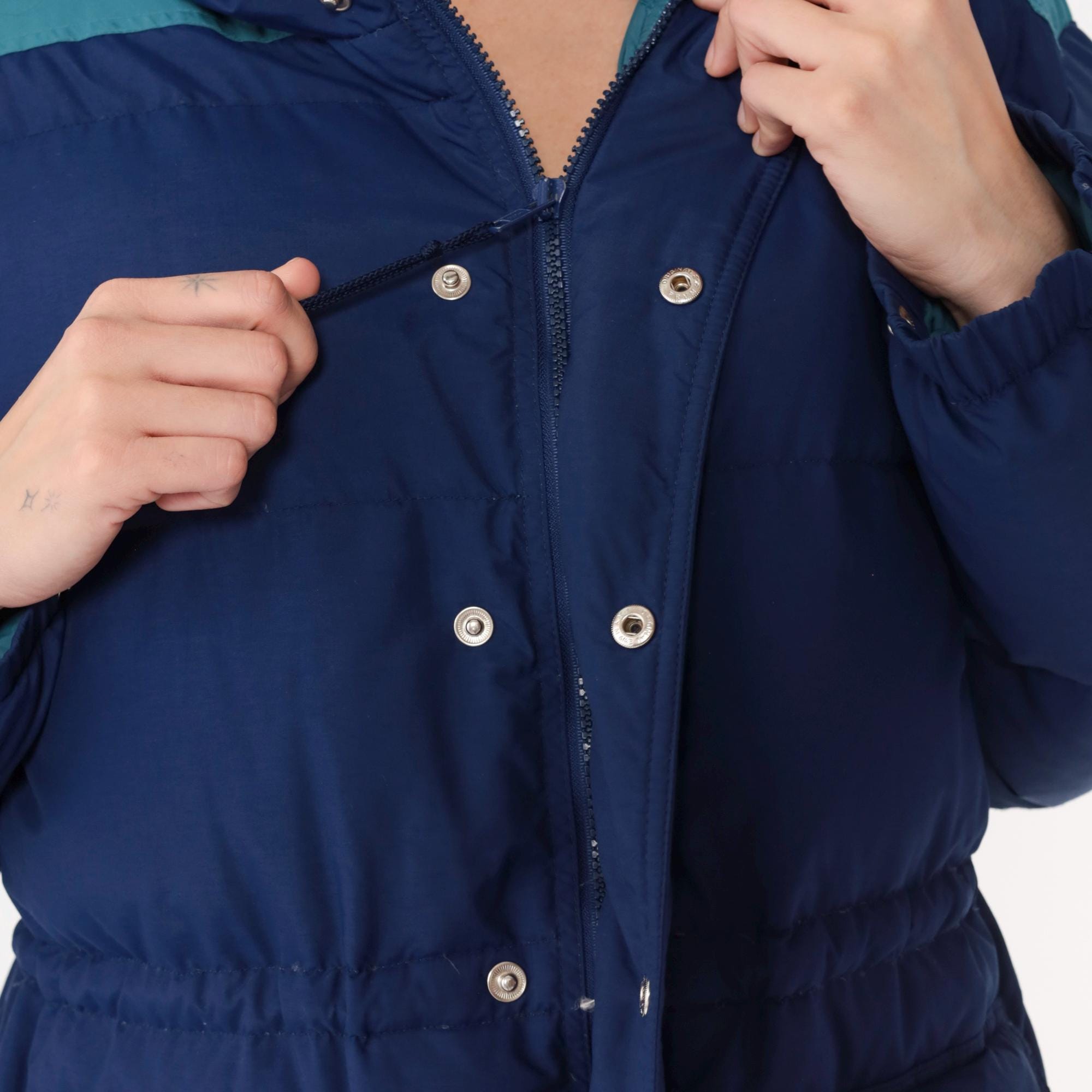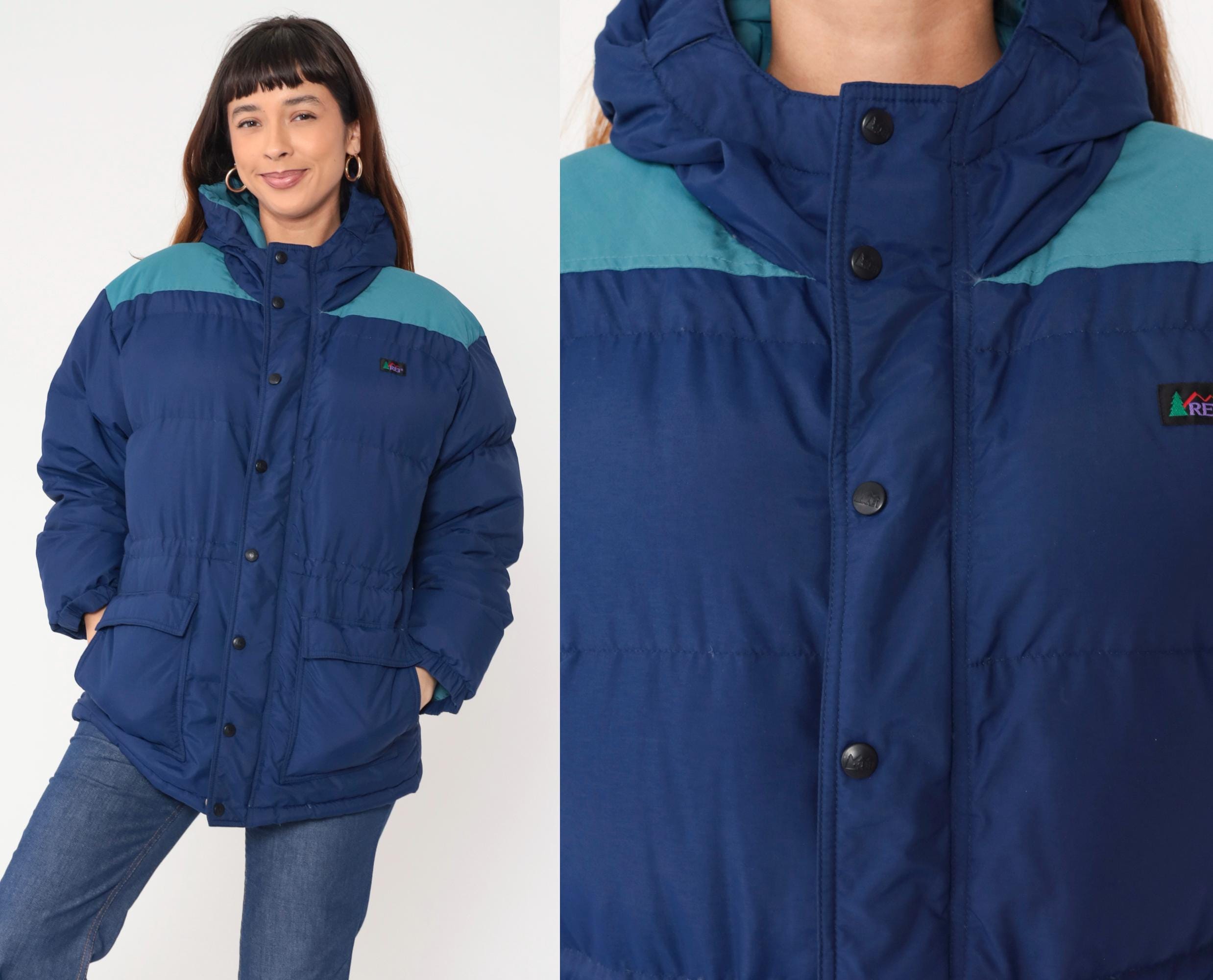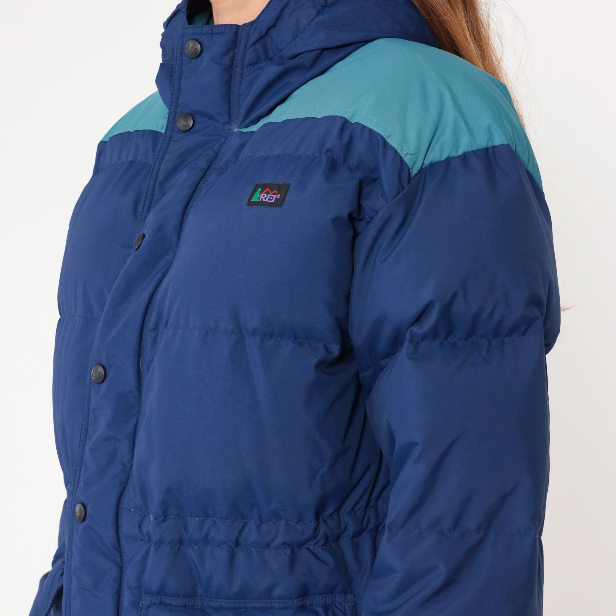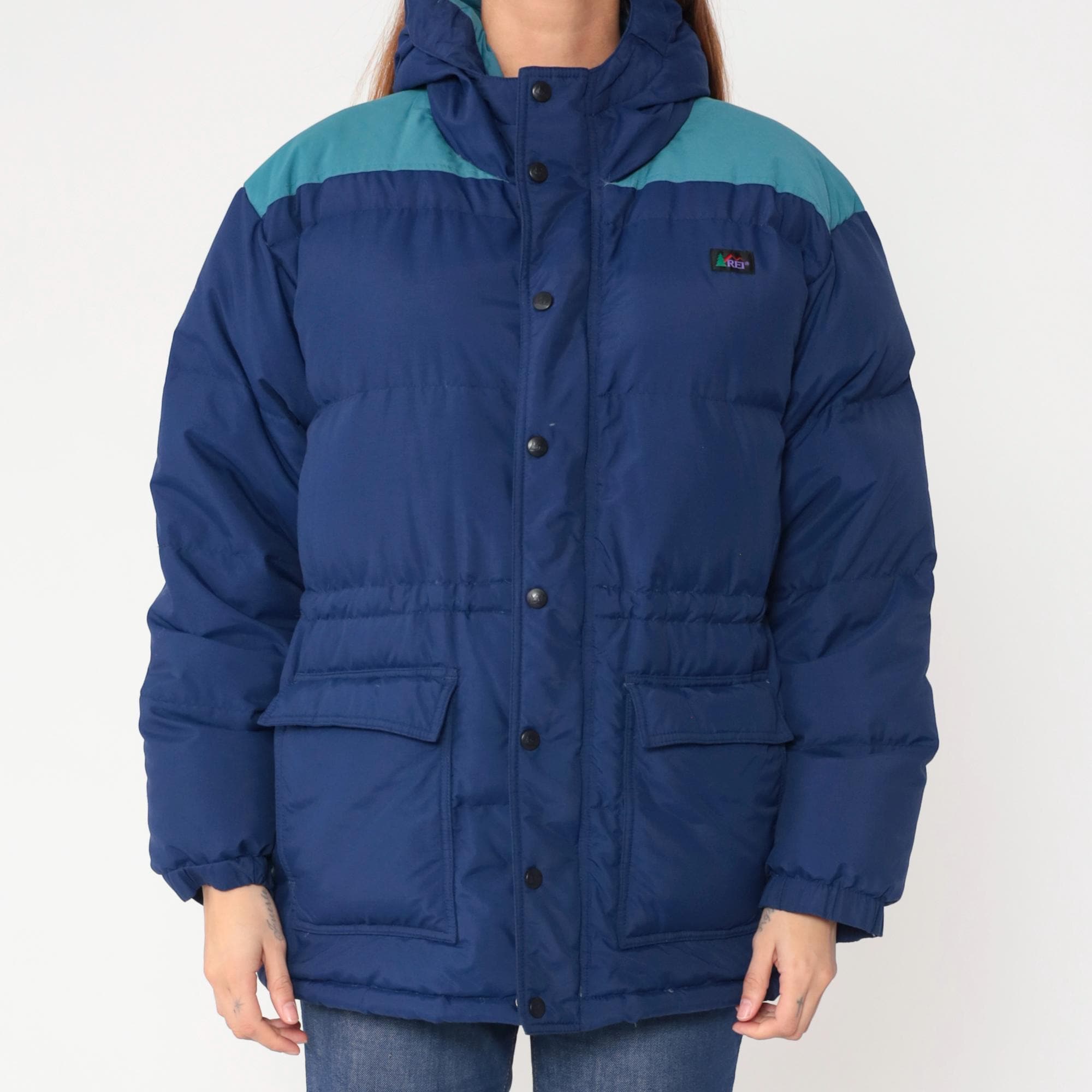 Y2K REI puffer jacket in navy blue with teal shoulder panels. Features a hood, zip and snap front closure, large front pockets, and adjustable waist. Made from a nylon shell with a goose down fill for insulation.