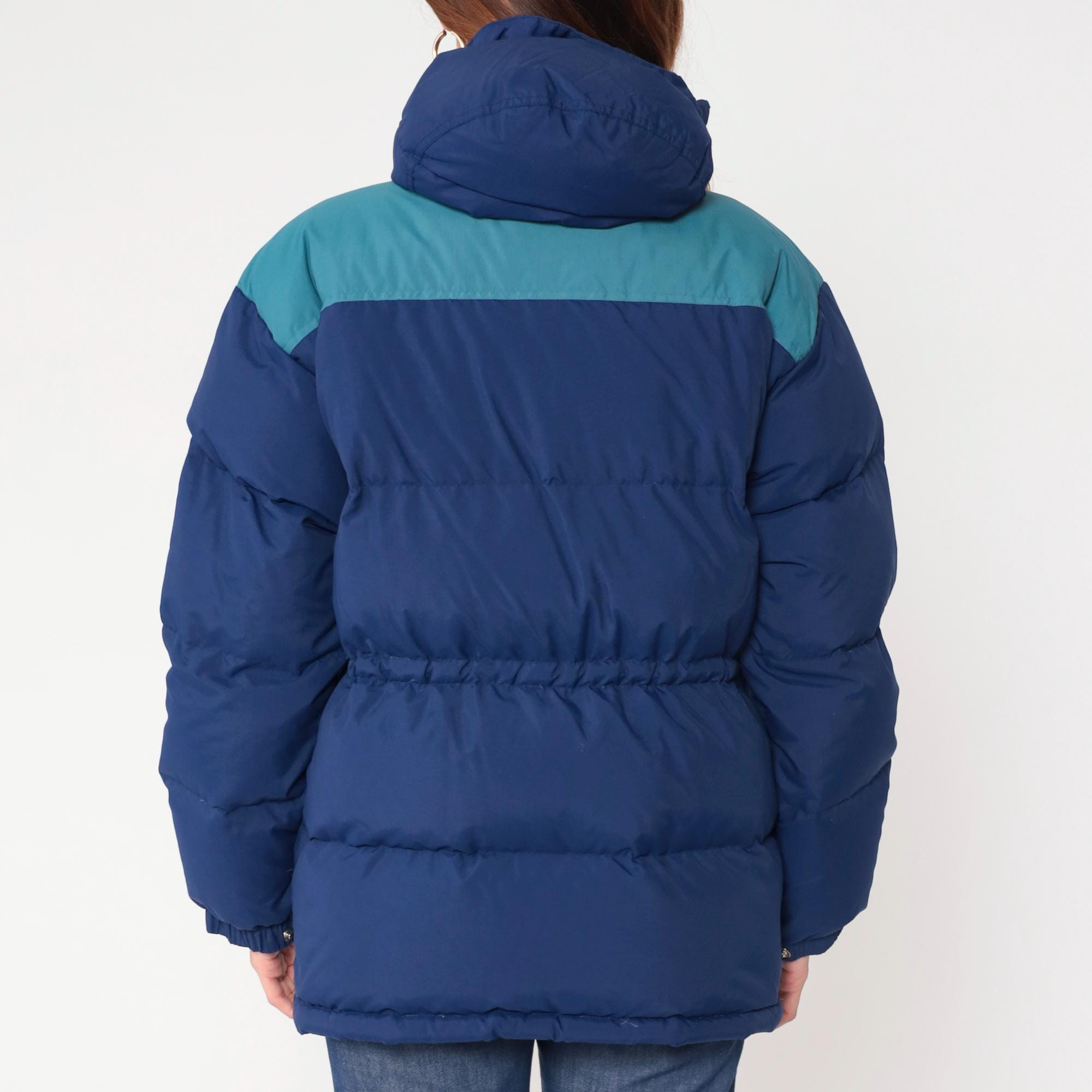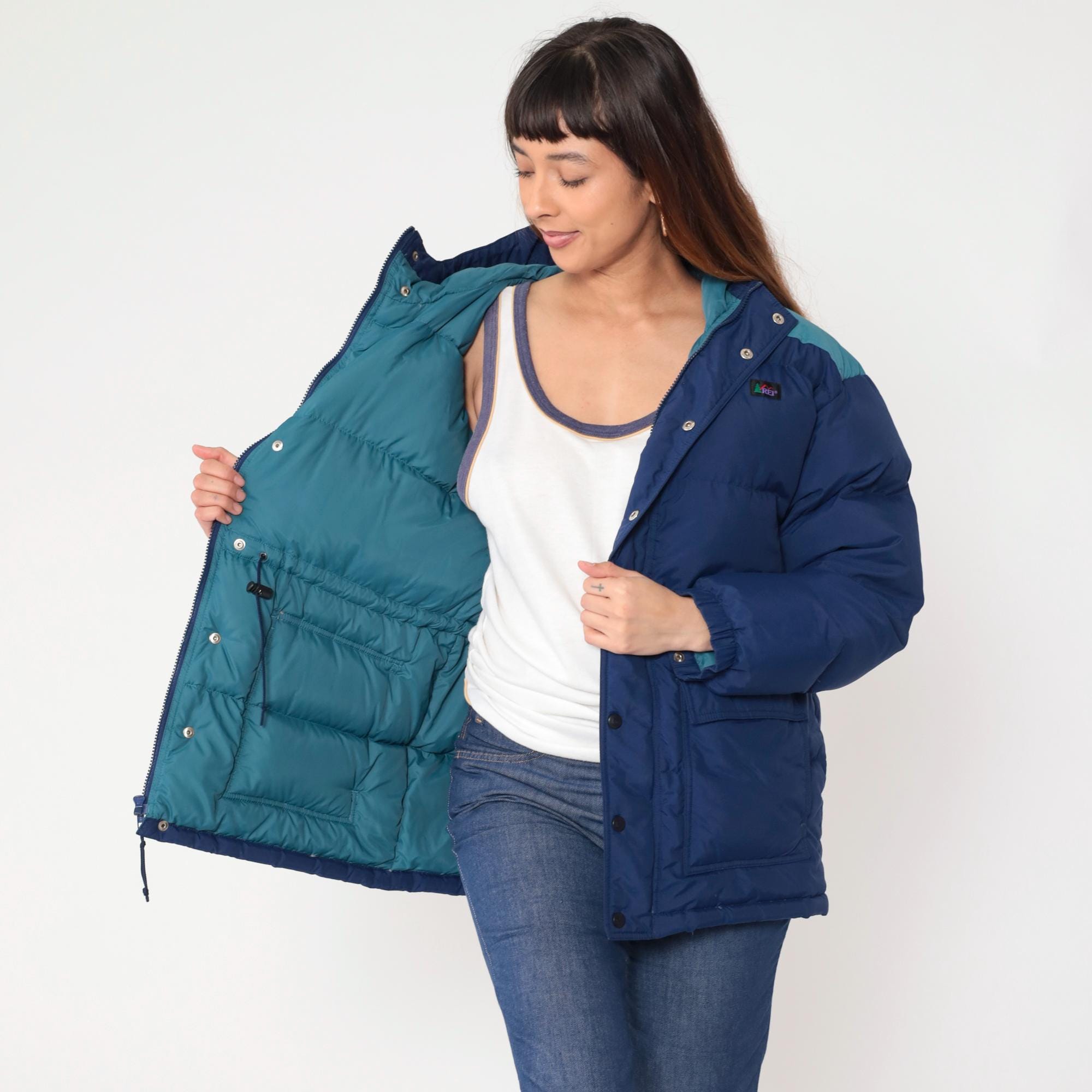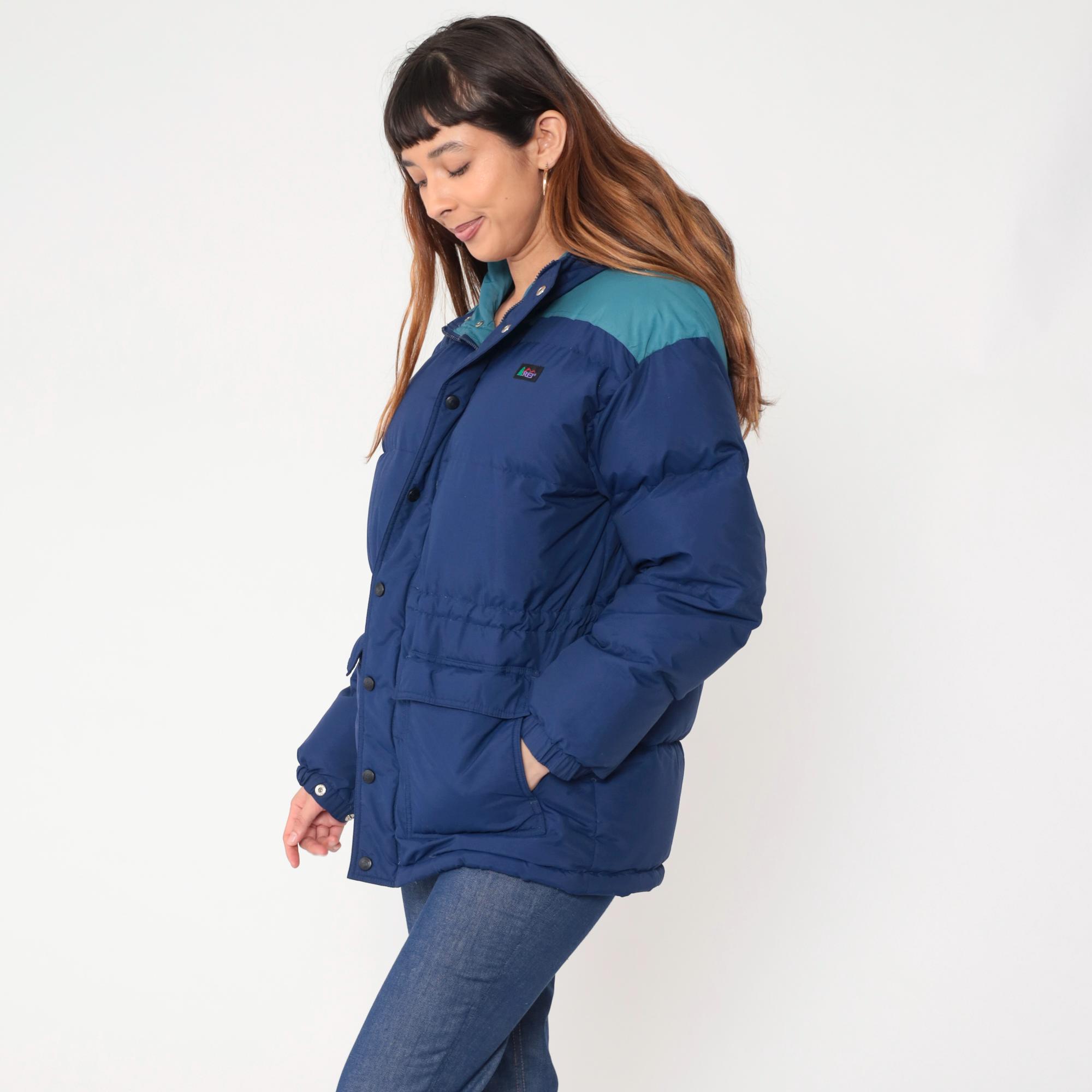 Y2K REI puffer jacket in navy blue with teal shoulder panels. Features a hood, zip and snap front closure, large front pockets, and adjustable waist. Made from a nylon shell with a goose down fill for insulation.
