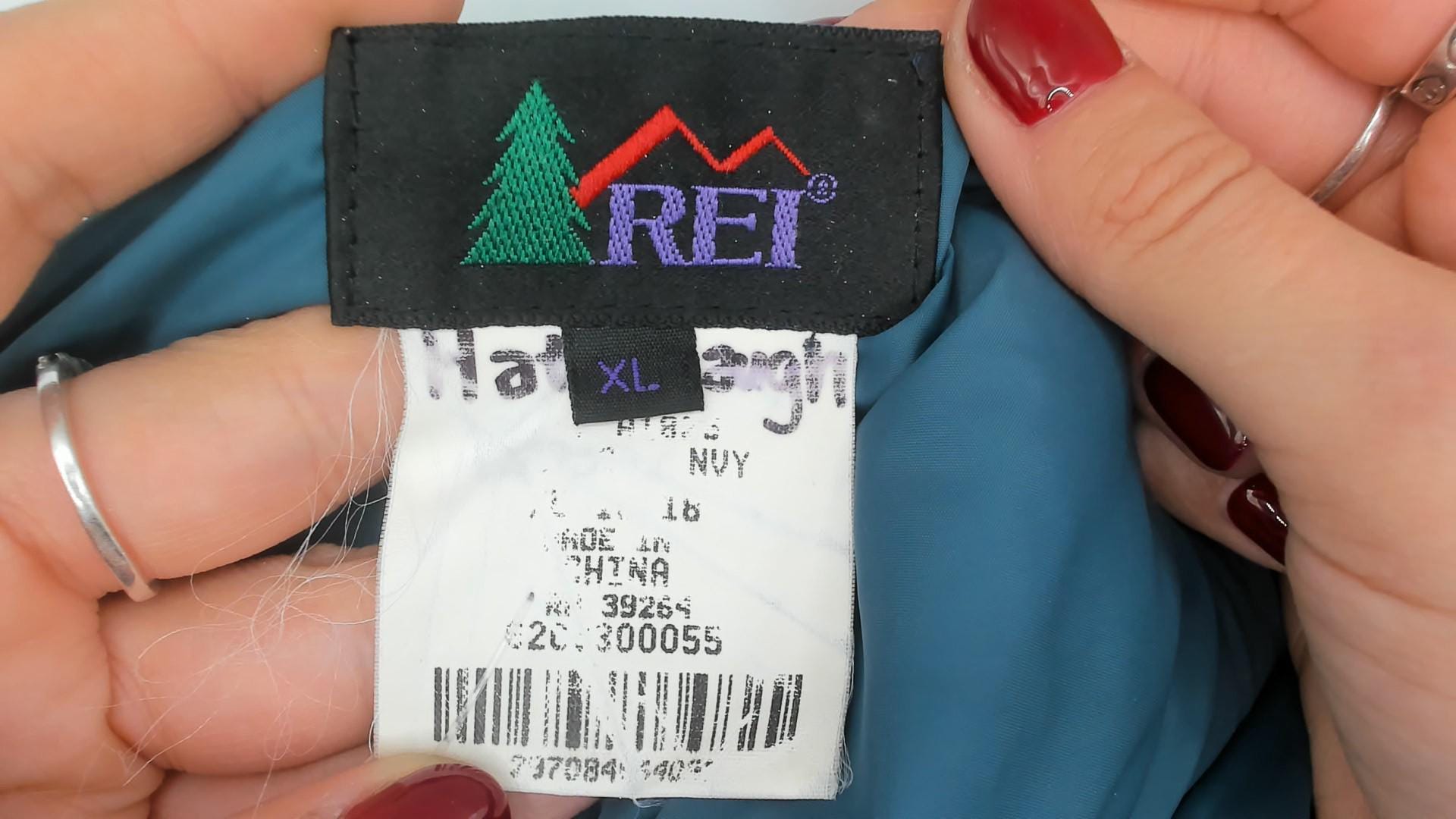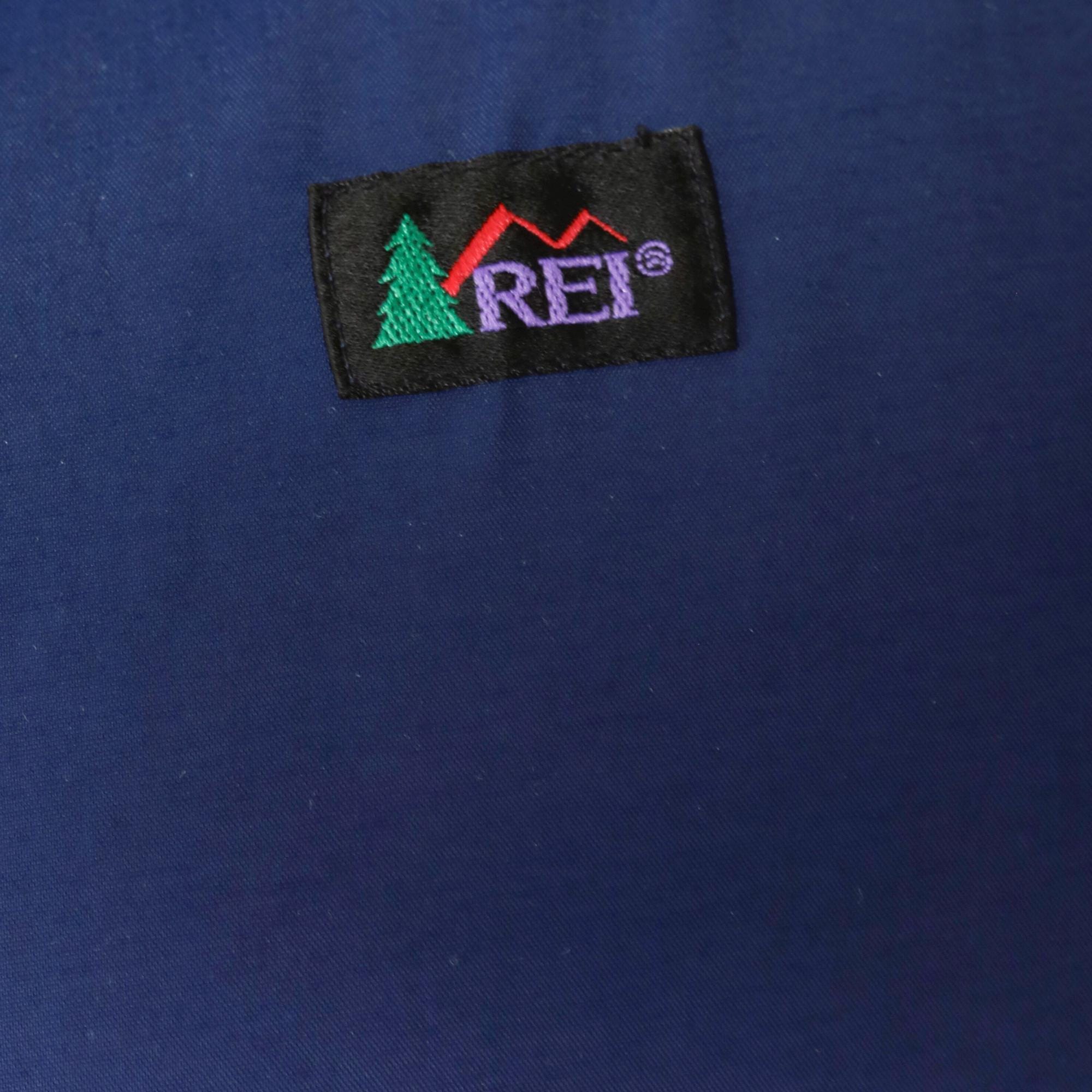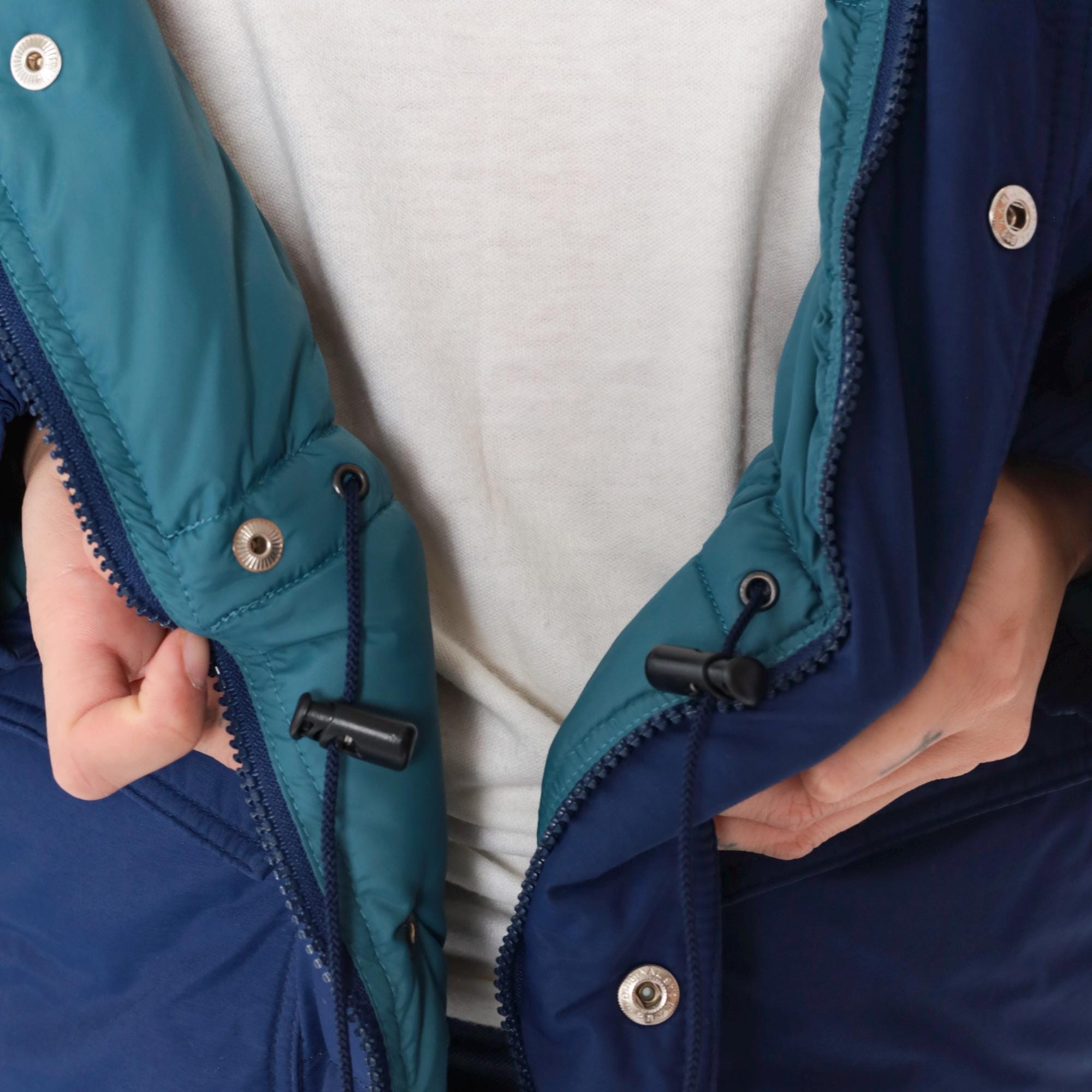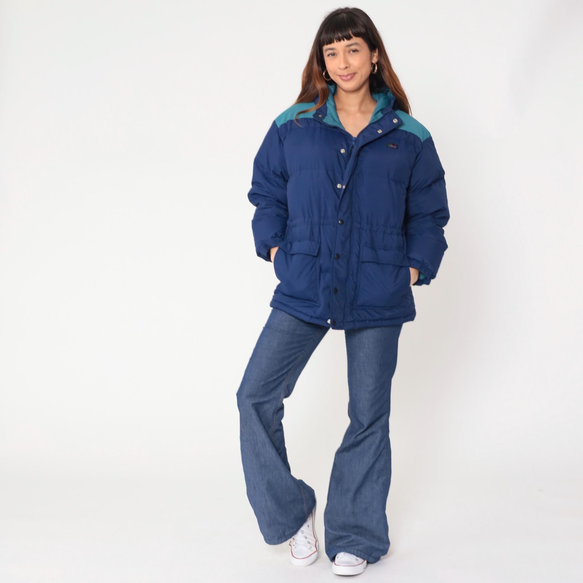 Y2K REI puffer jacket in navy blue with teal shoulder panels. Features a hood, zip and snap front closure, large front pockets, and adjustable waist. Made from a nylon shell with a goose down fill for insulation.