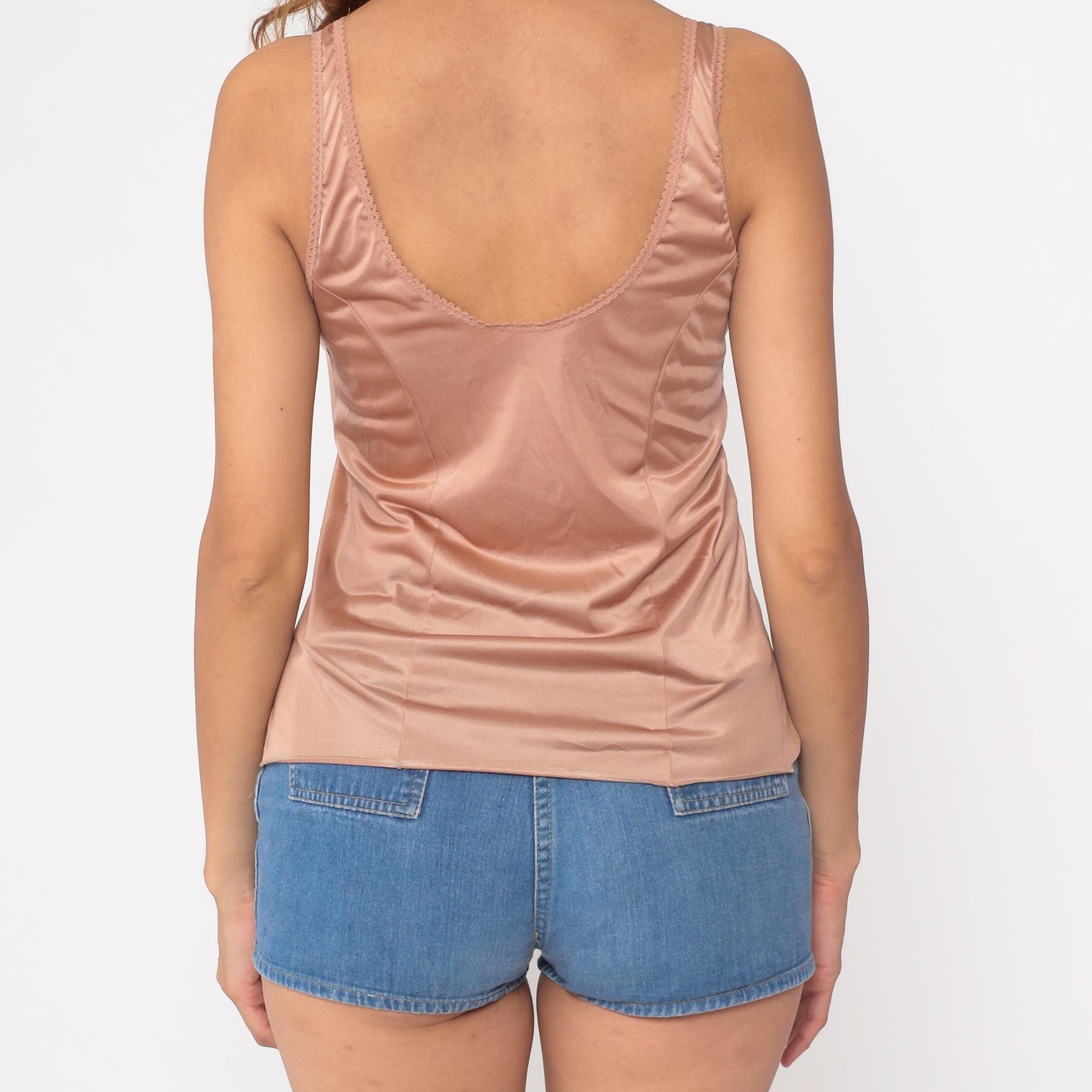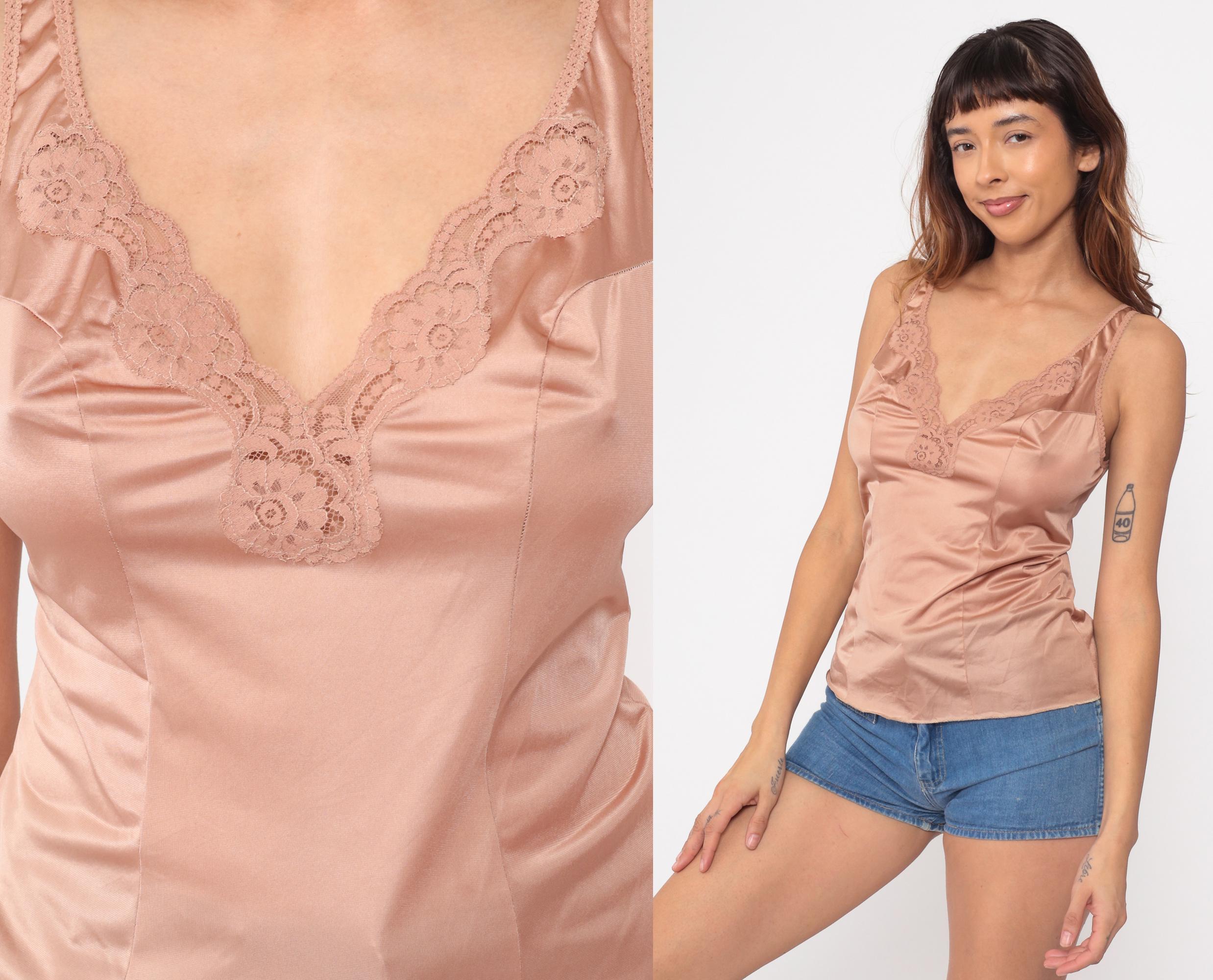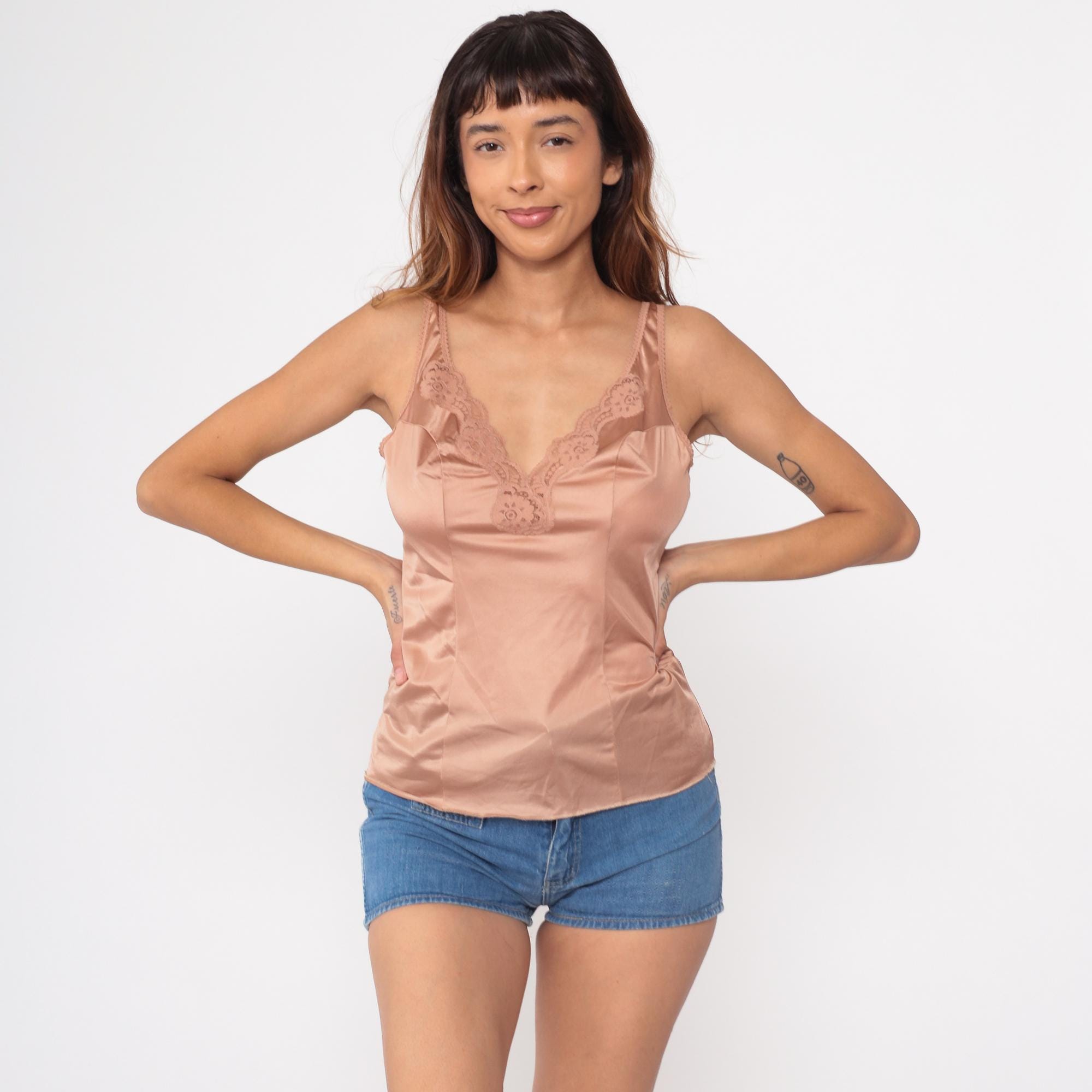 80s vintage beige camisole in silky satin material. Features beautiful scalloped lace trim along the V neckline and straps. Fitted silhouette with princess seams down the front for a flattering shape. Low scoop back with additional lace trim detail.