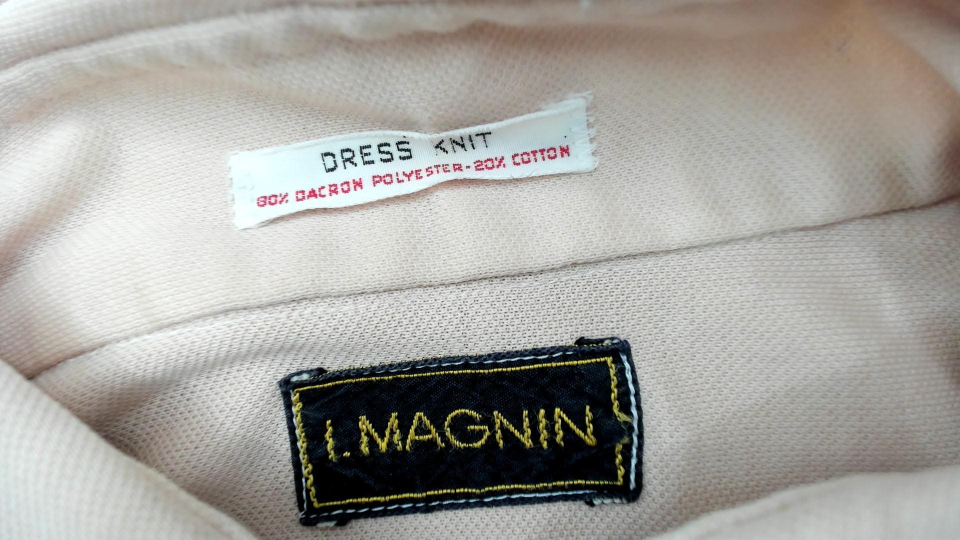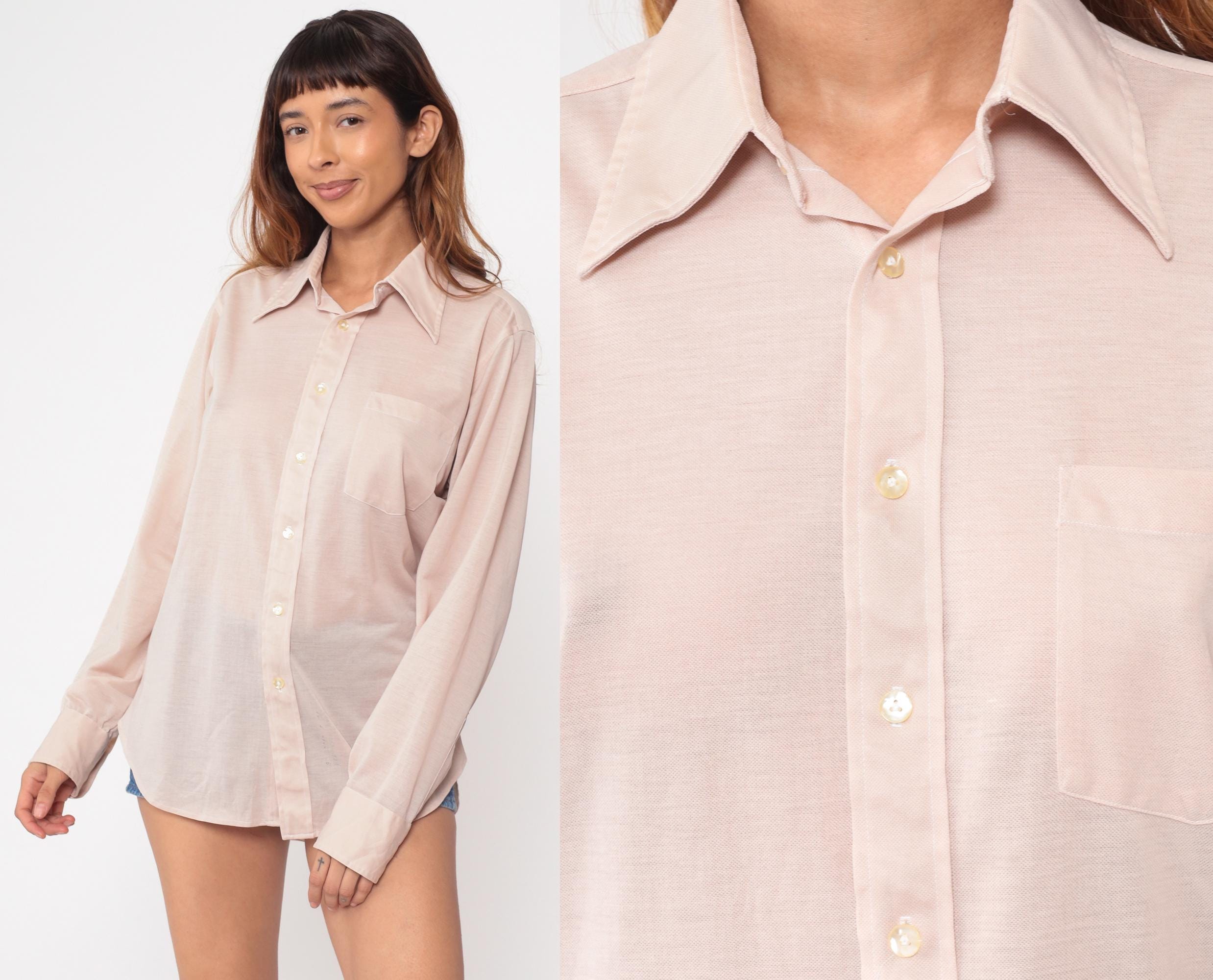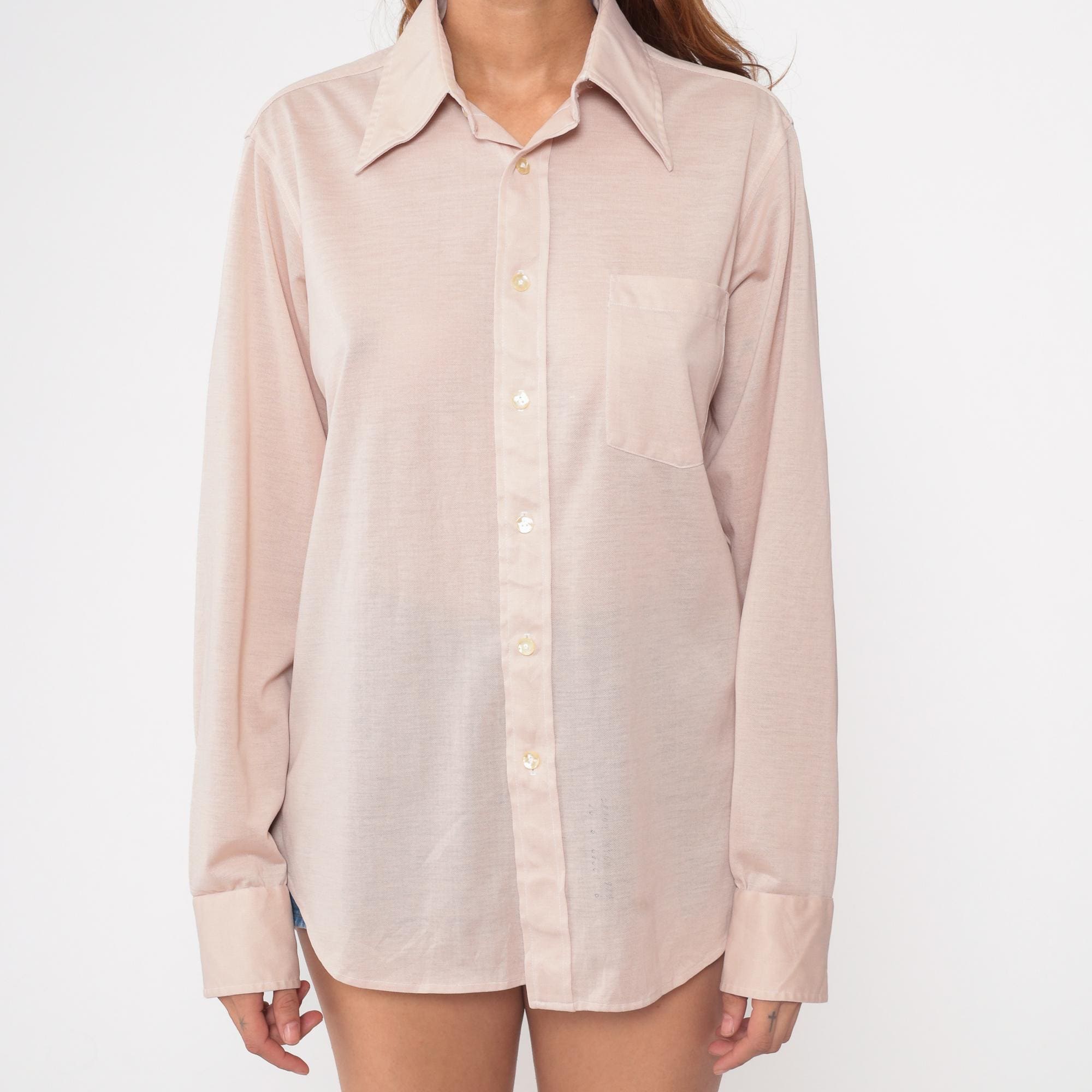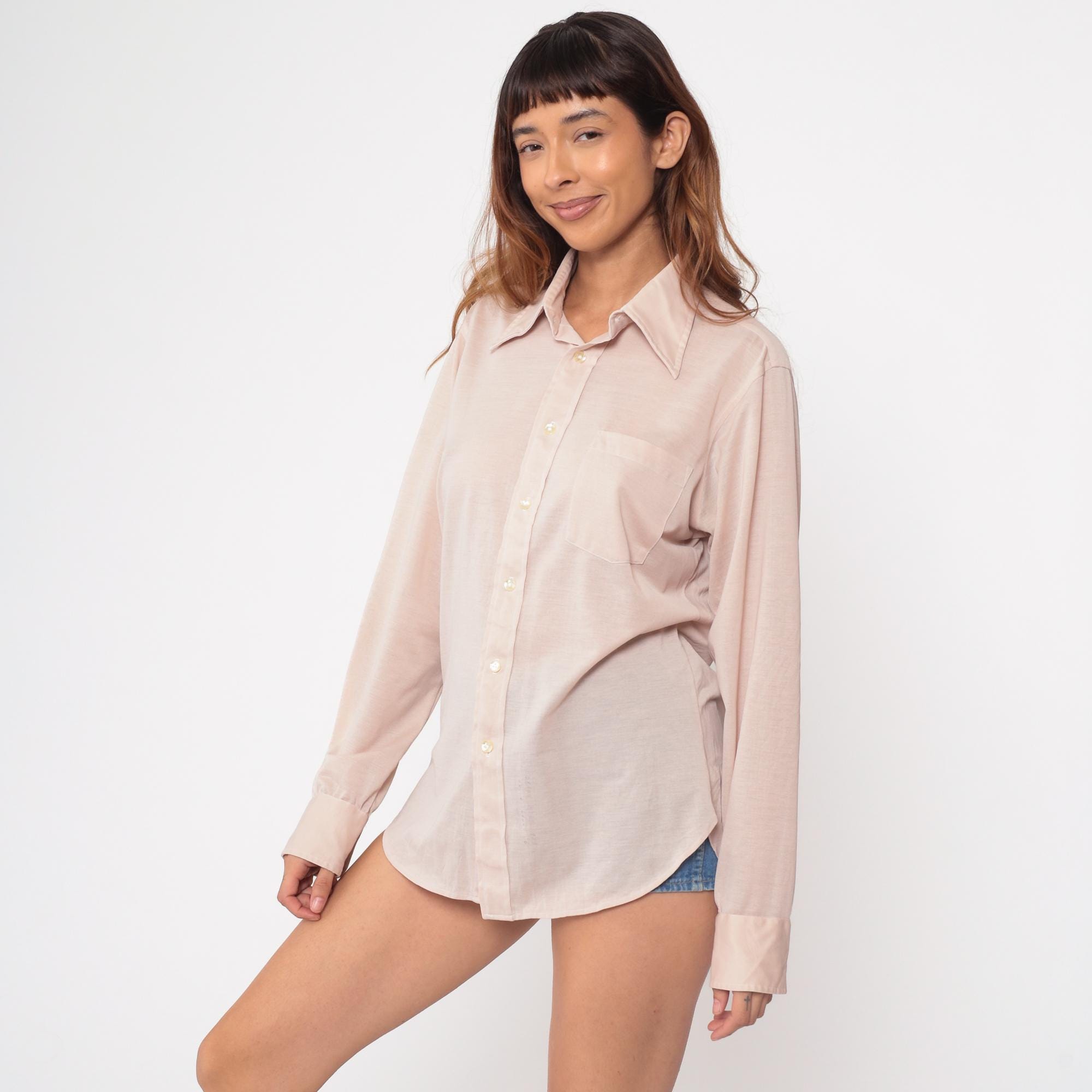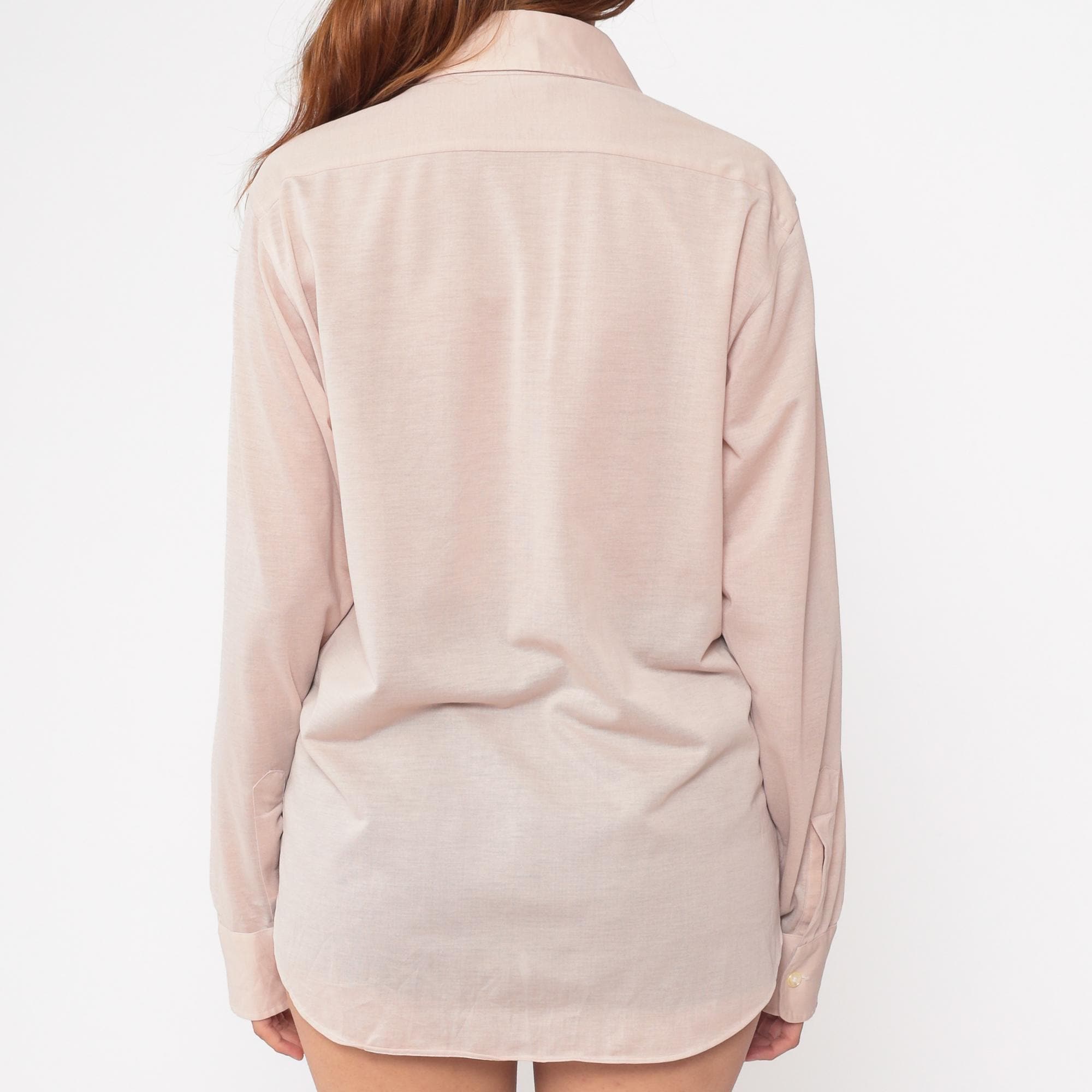Vintage 1970s button-up shirt by i magnin in a light tan/blush beige shade. Features a classic pointed collar, full button front with pearlescent buttons, and one chest pocket. Long sleeves with buttoned cuffs.