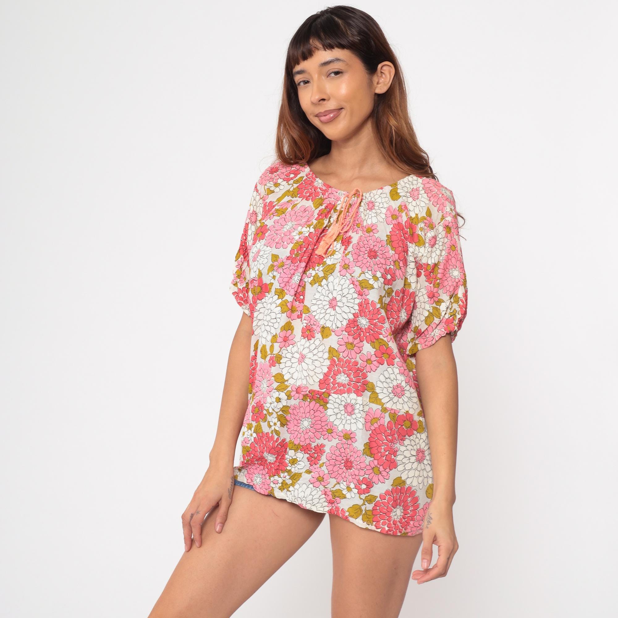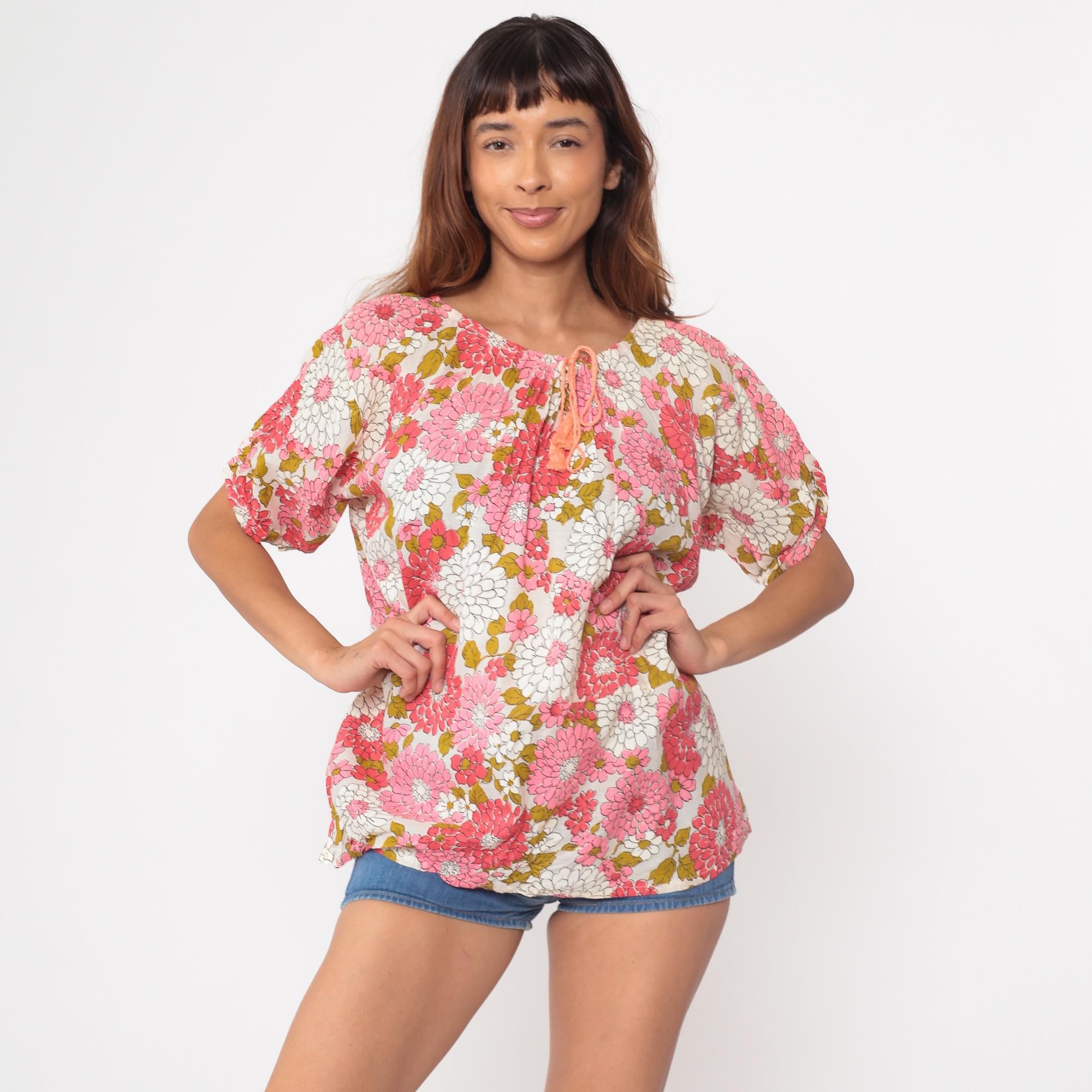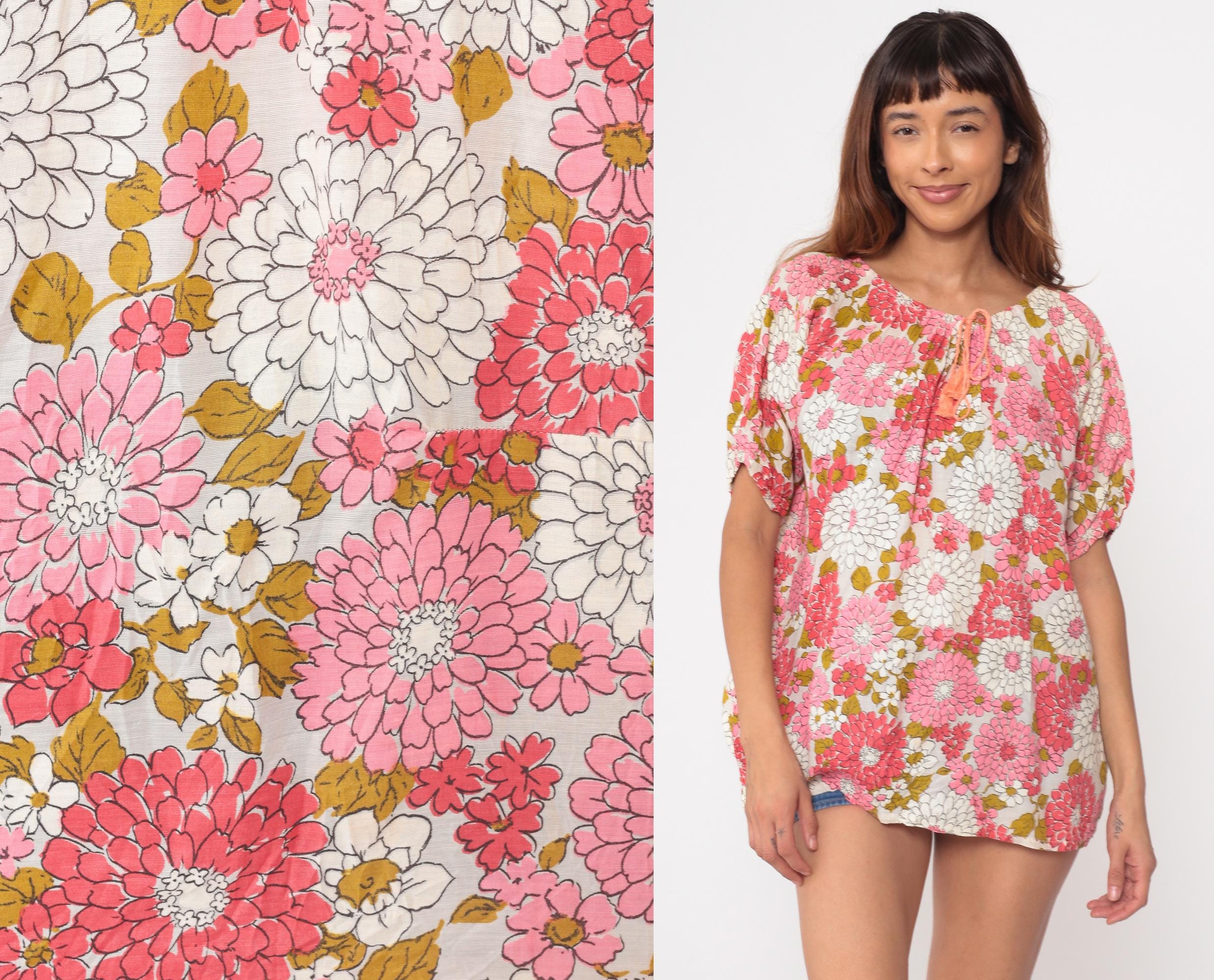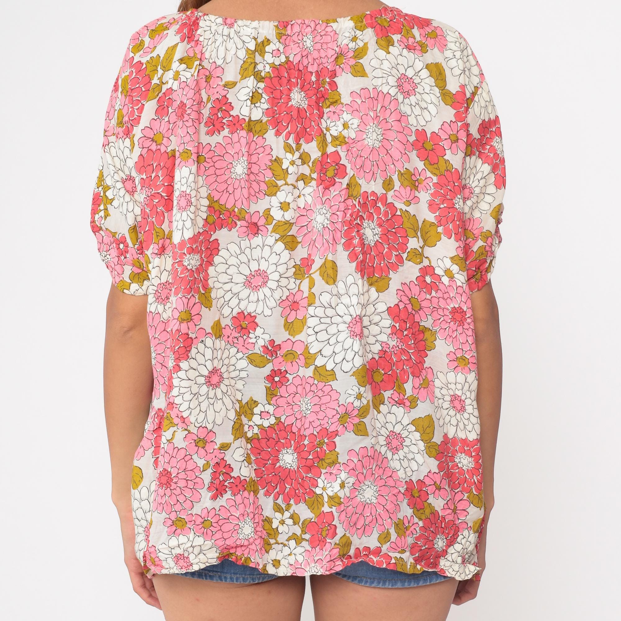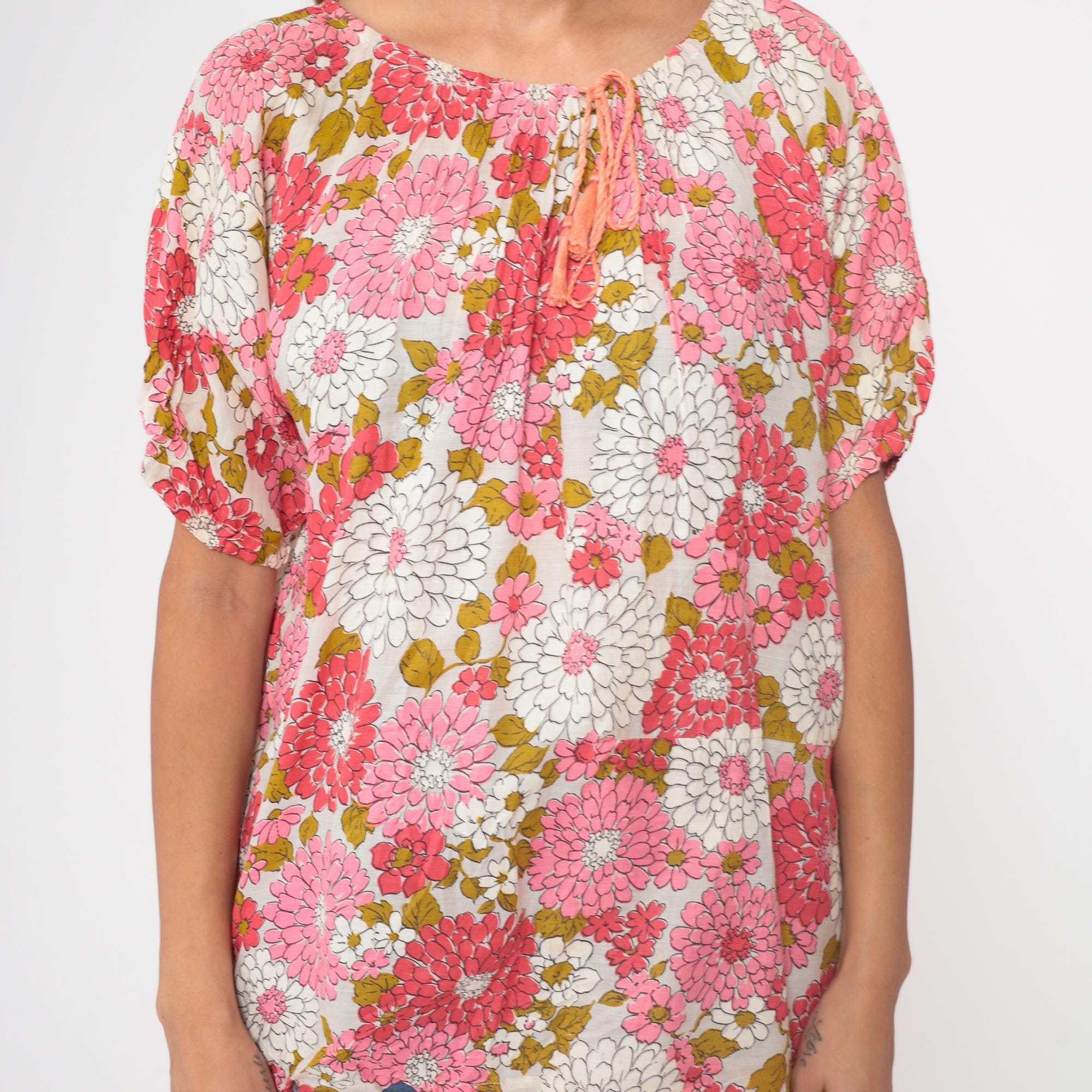 Vintage 1970s cottagecore blouse featuring a vibrant pink and white daisy print with olive green leaves on a cream background. Relaxed peasant style with gathered neckline and pink tie closure. Short puff sleeves with elasticized cuffs