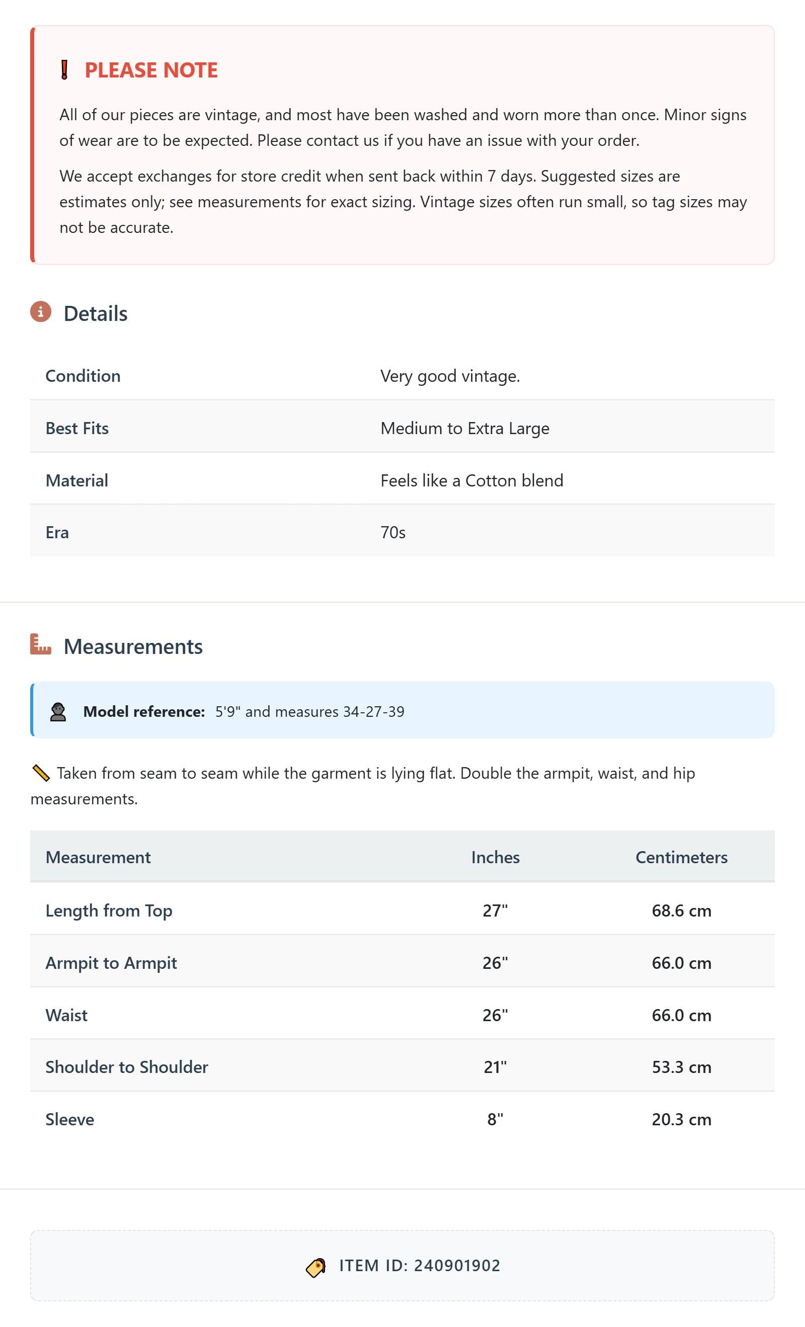 Suggested sizes are estimates only; see measurements for exact sizing. Vintage sizes often run small, so tag sizes may not be accurate.