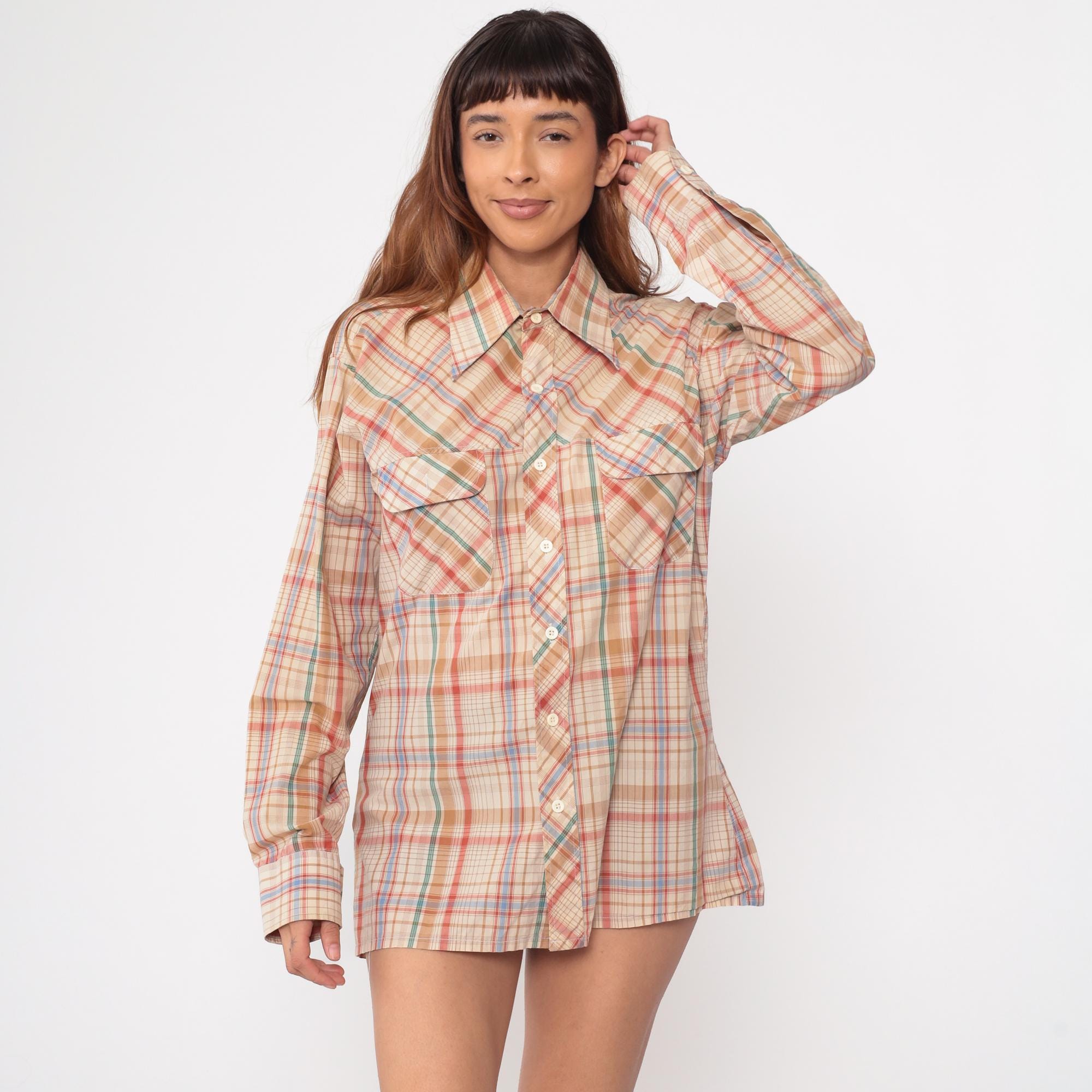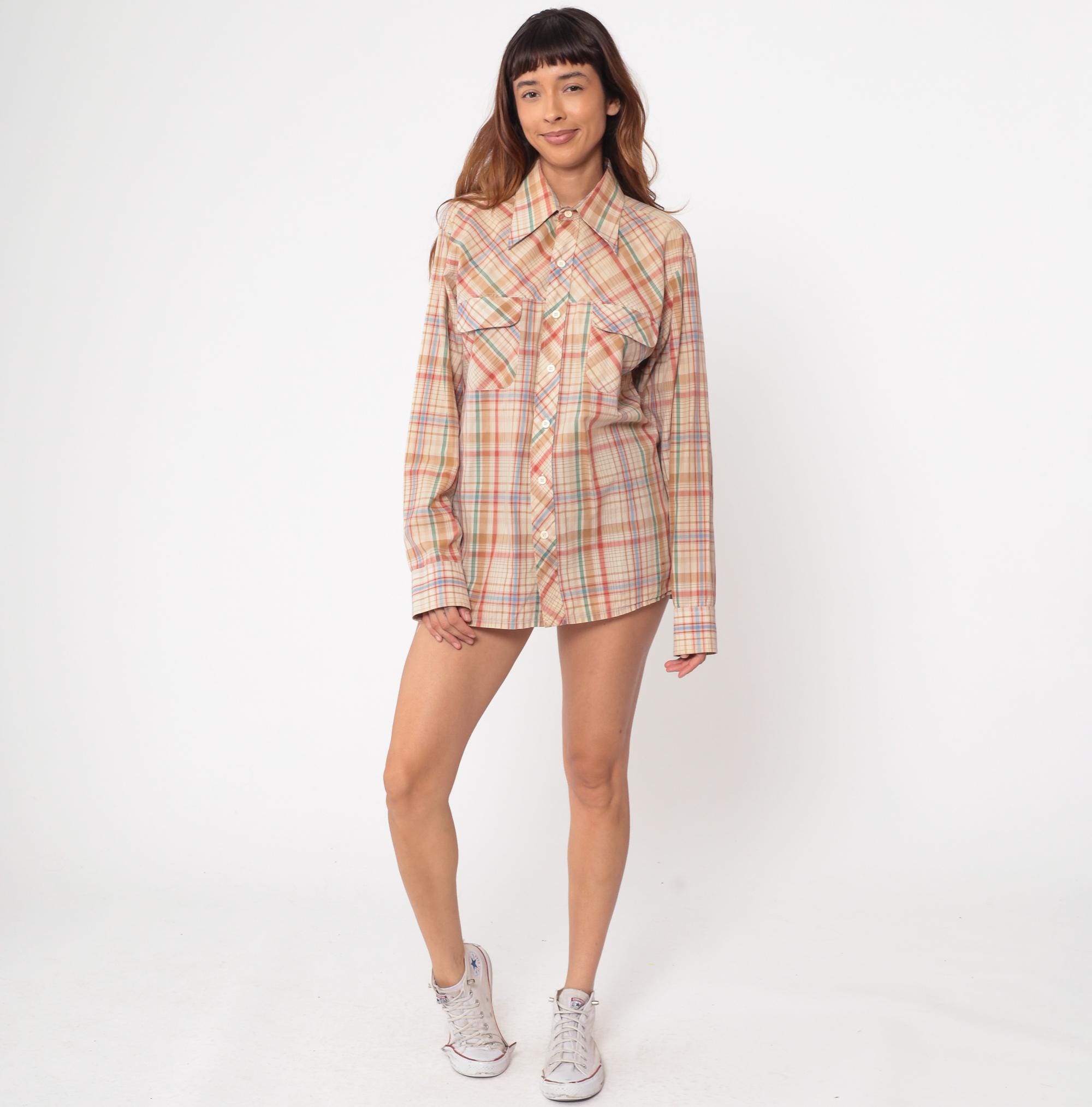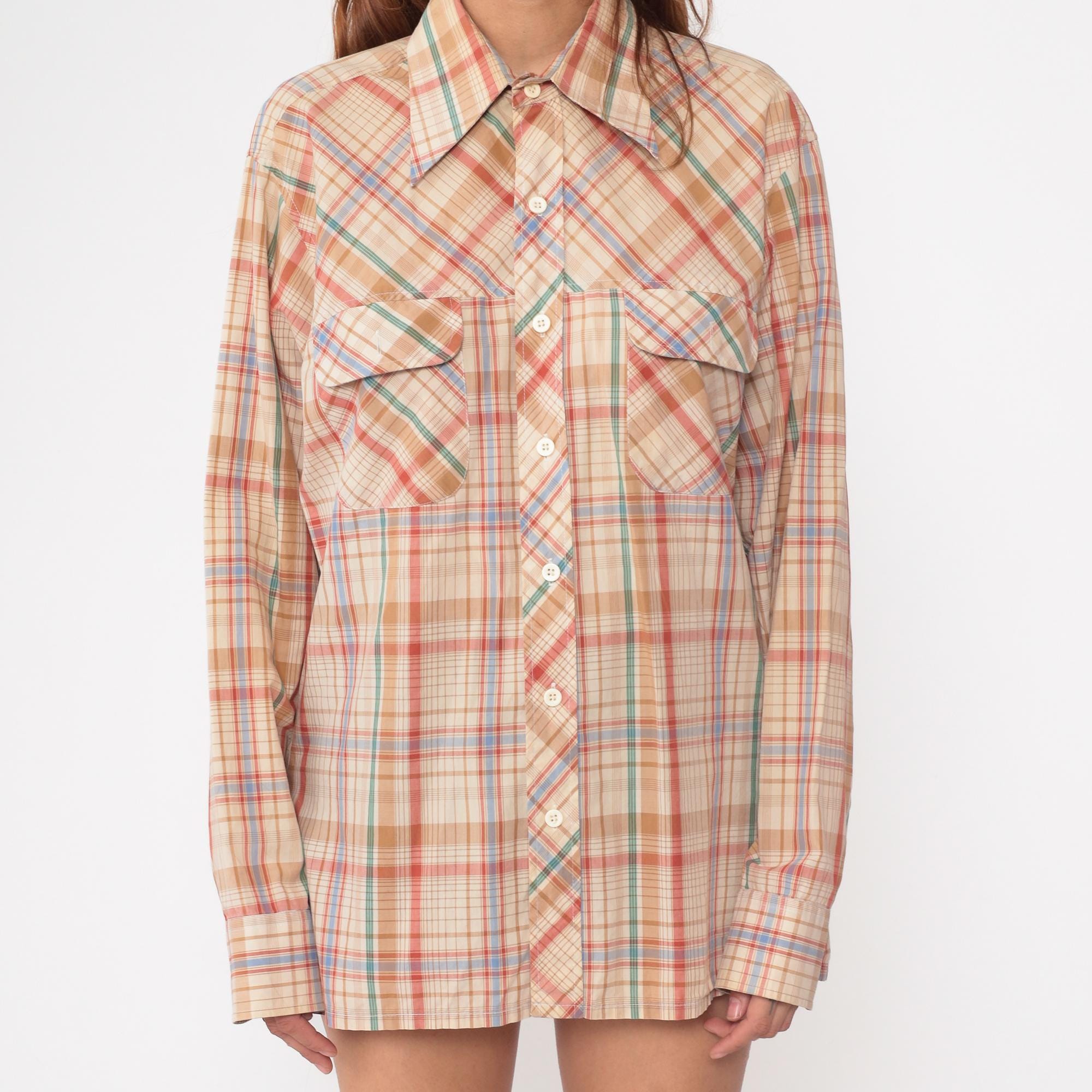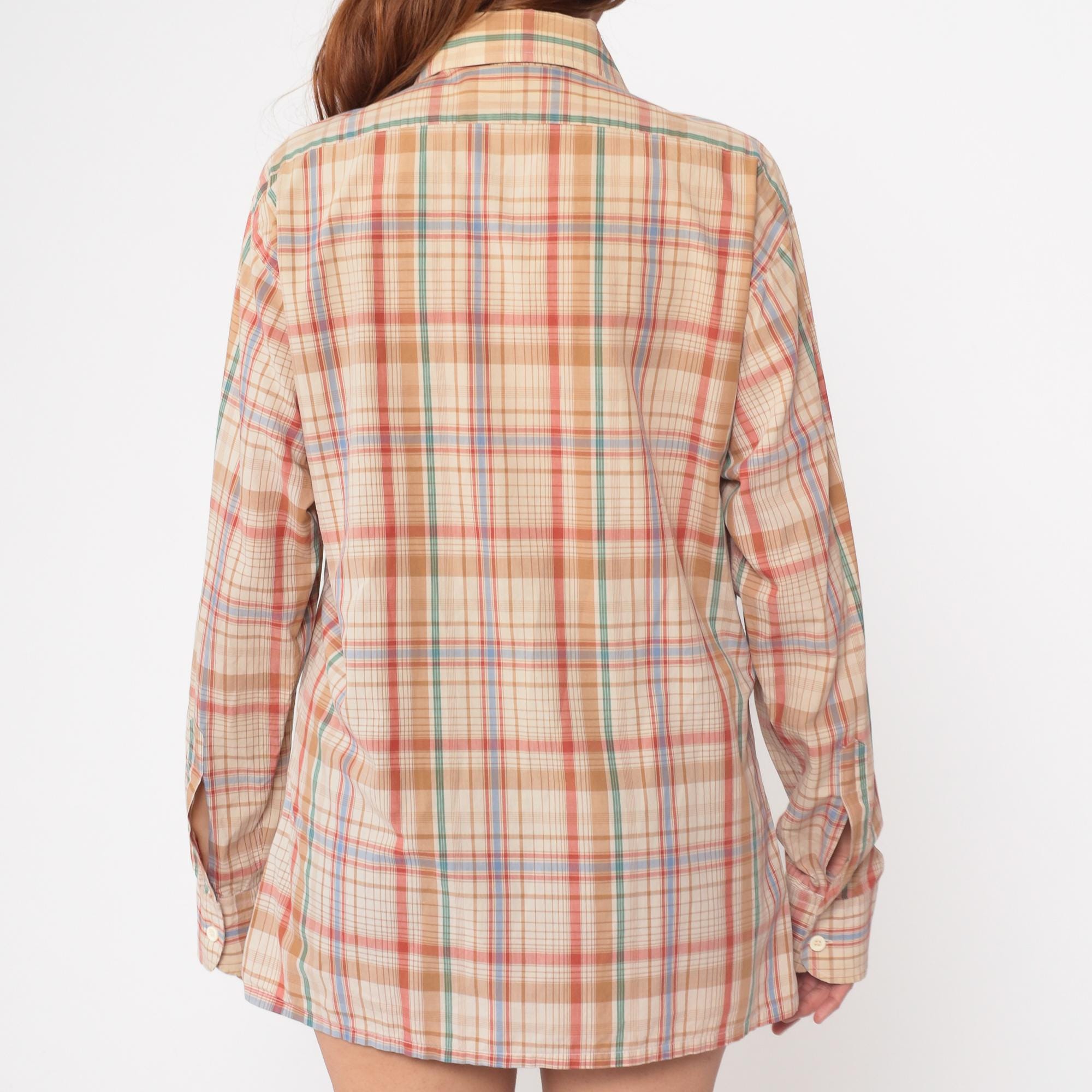 Vintage 1980s Rags Shirtmakers western style plaid shirt in a beautiful pastel color palette. Features a peach, green, and blue plaid pattern on a cream background. Classic western details include a pointed collar, front button placket, and two chest pockets with button flaps. Long sleeves with button cuffs and a relaxed, slightly oversized fit.