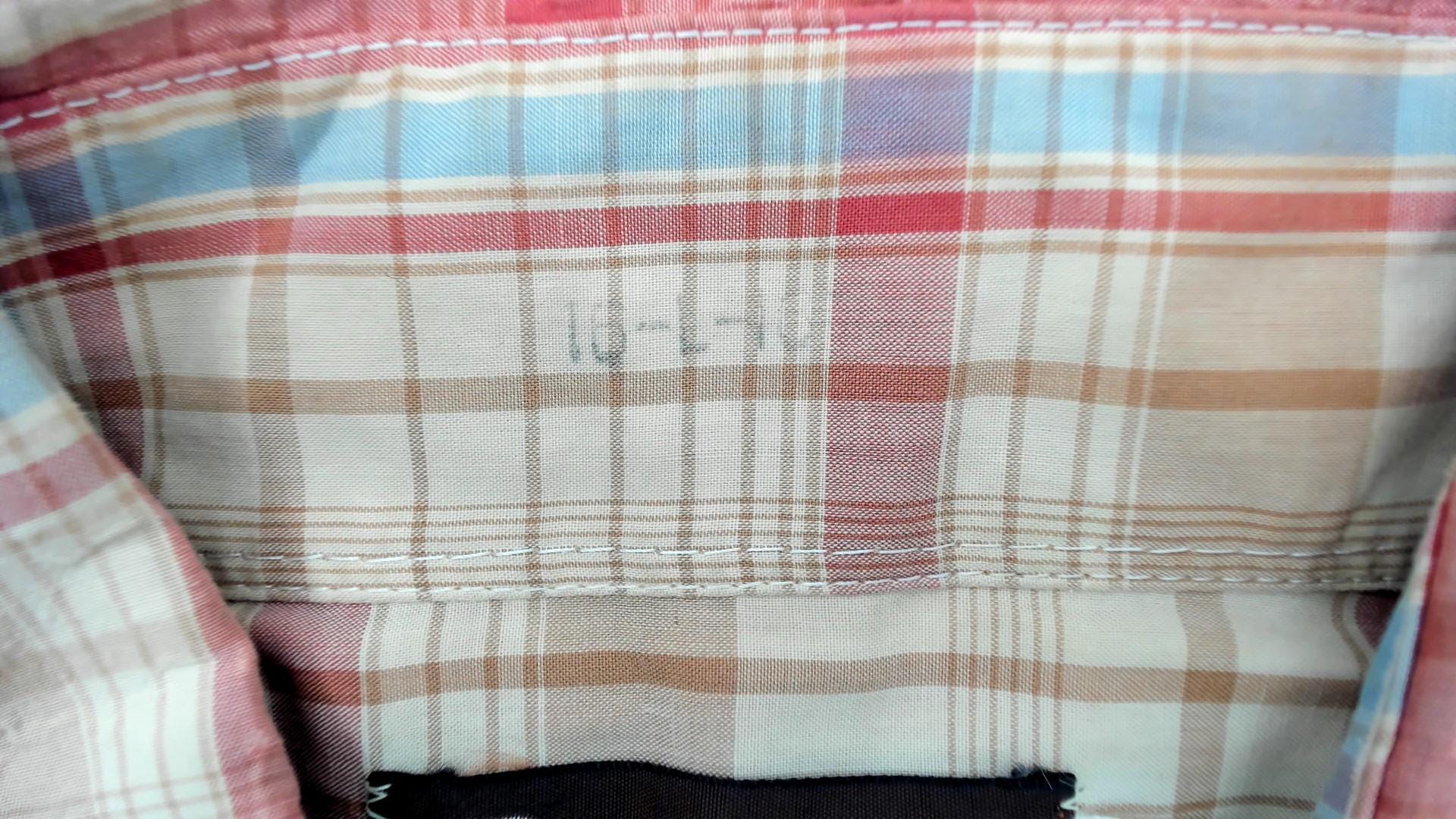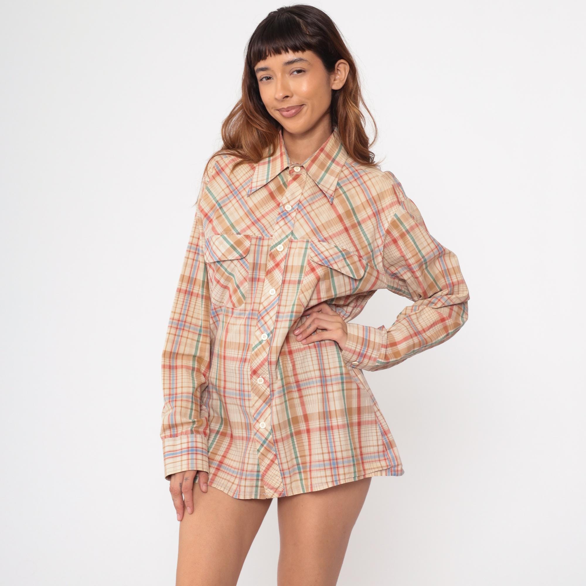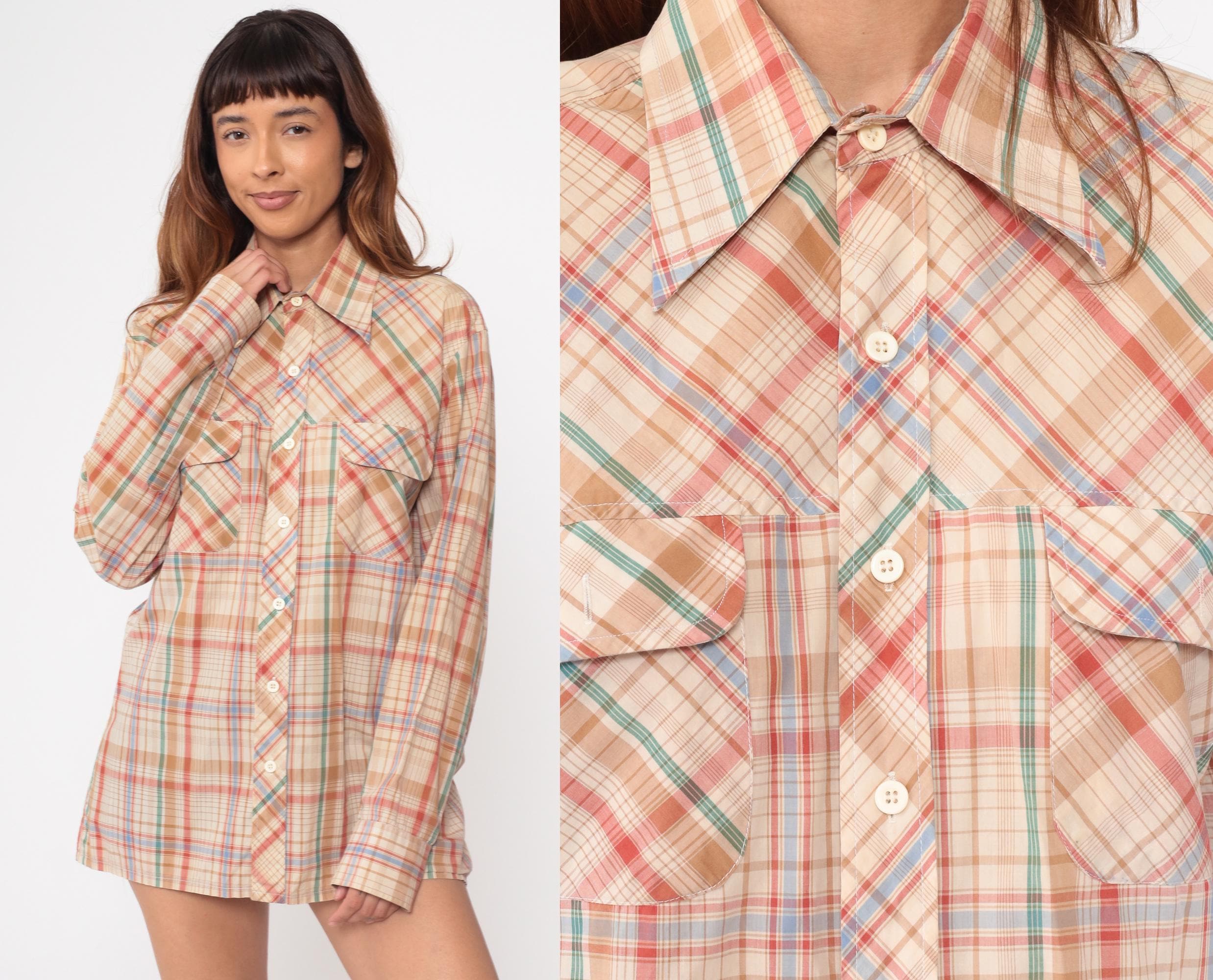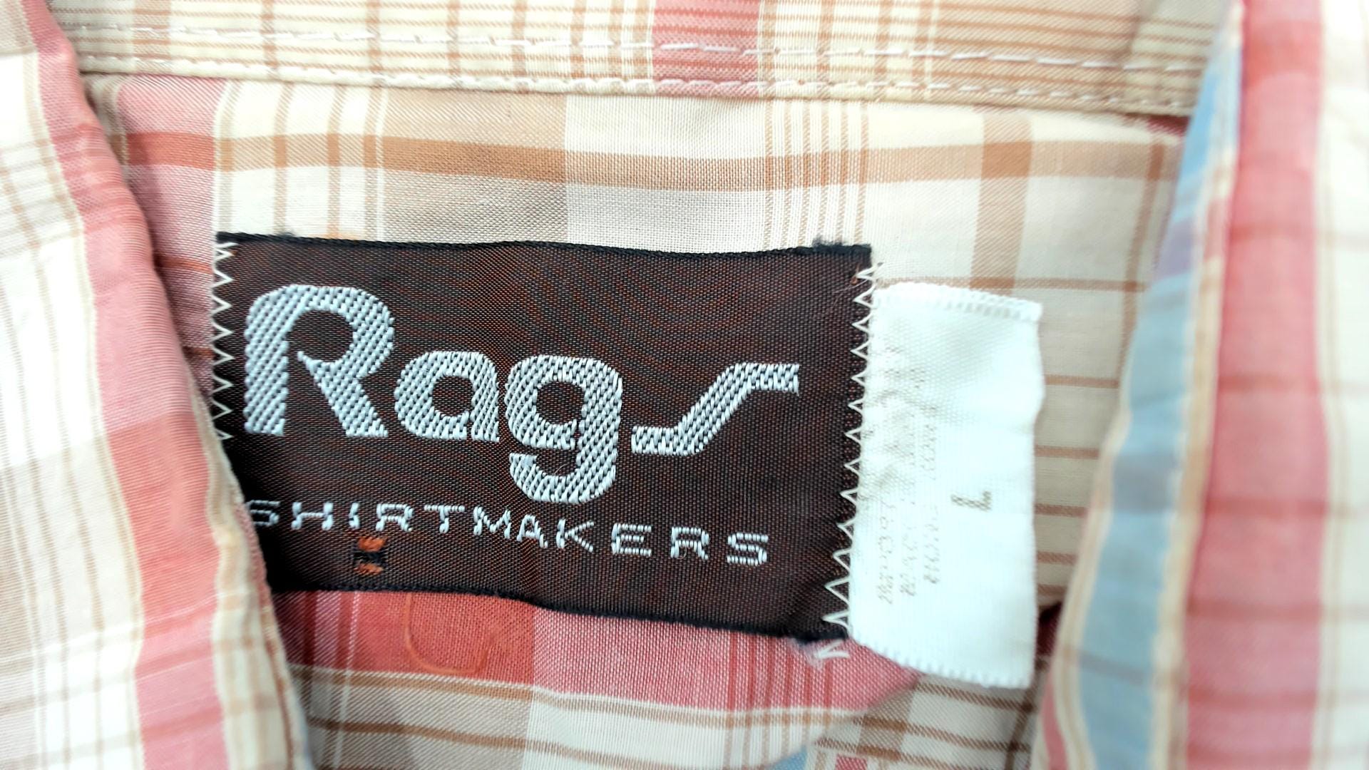 Vintage 1980s Rags Shirtmakers western style plaid shirt in a beautiful pastel color palette. Features a peach, green, and blue plaid pattern on a cream background. Classic western details include a pointed collar, front button placket, and two chest pockets with button flaps. Long sleeves with button cuffs and a relaxed, slightly oversized fit.