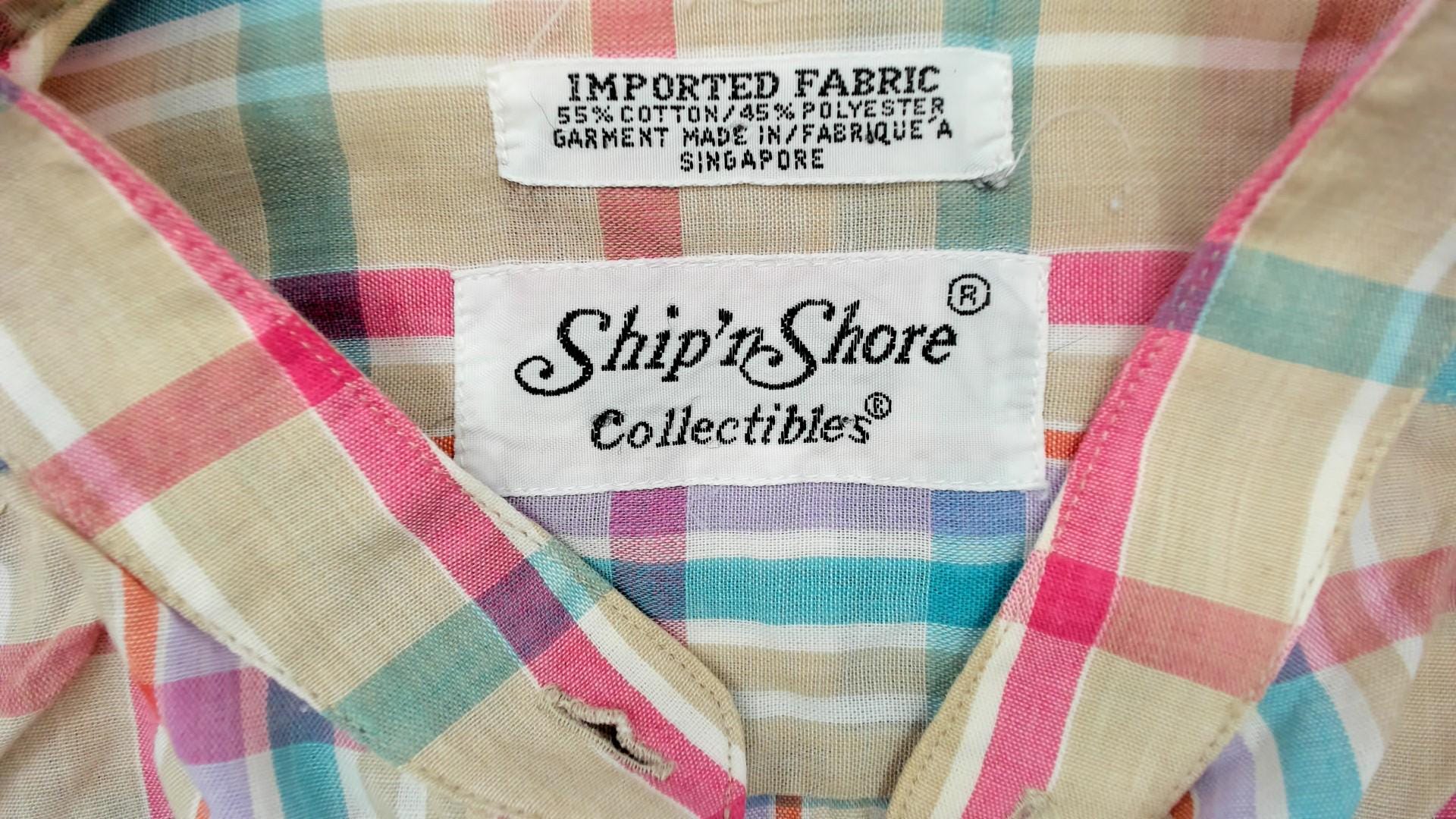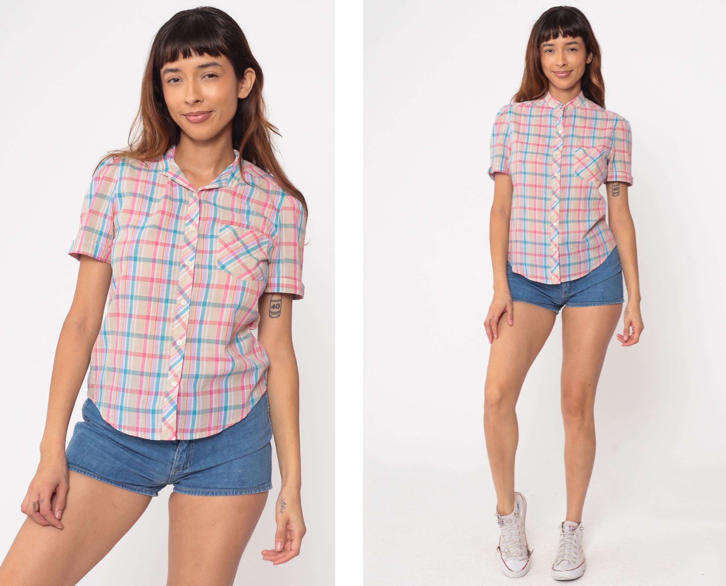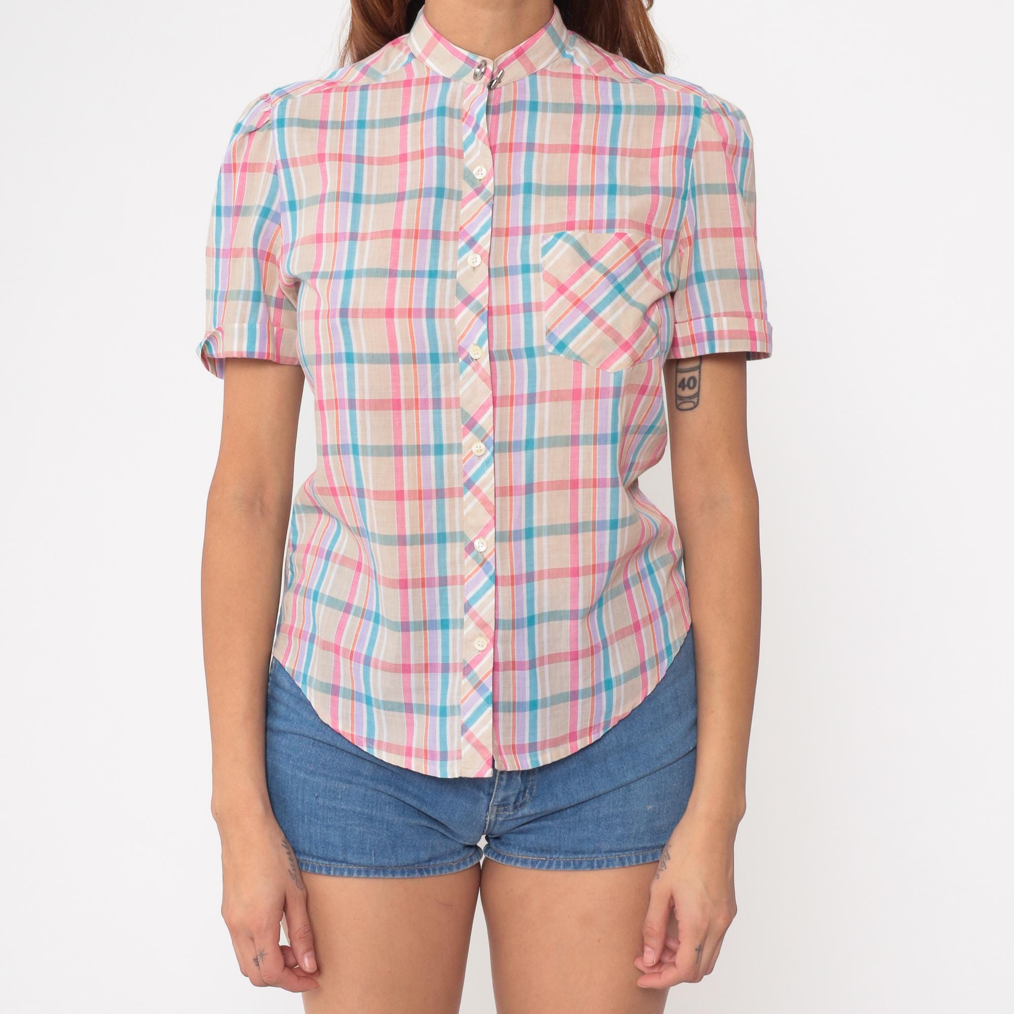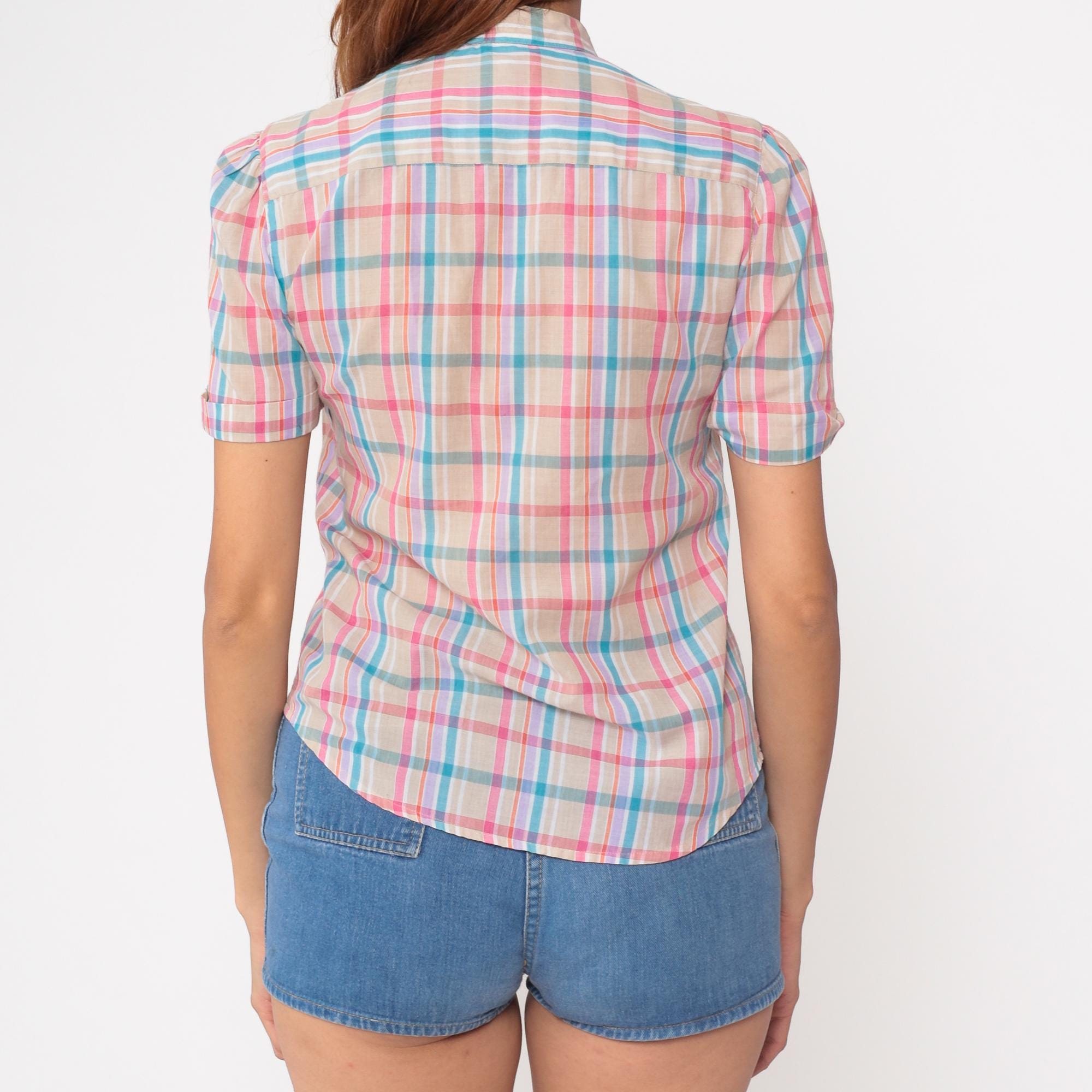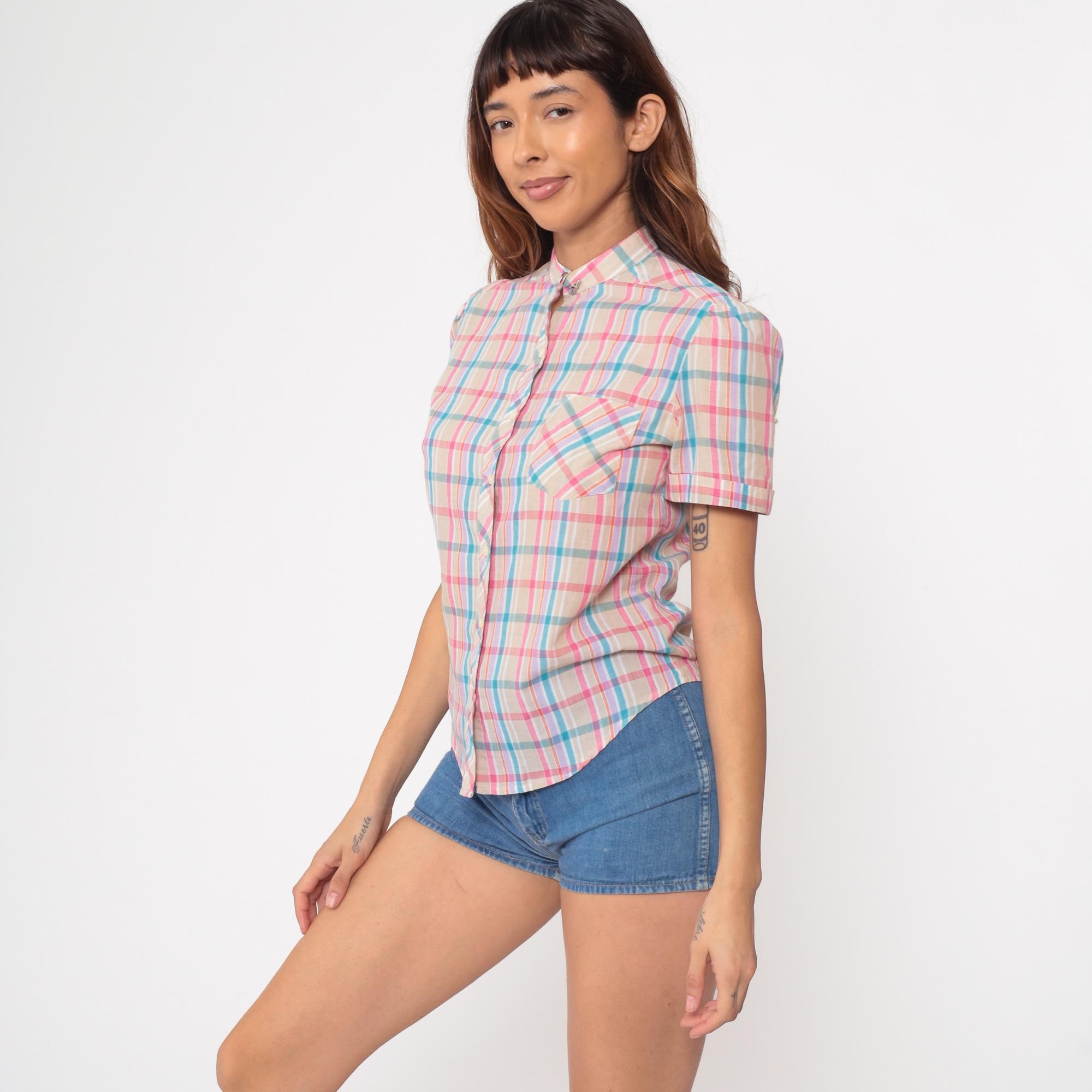 Vintage 80s shirt in a tan with pink, purple, and blue checkered print. Short sleeves, buttons up the front.