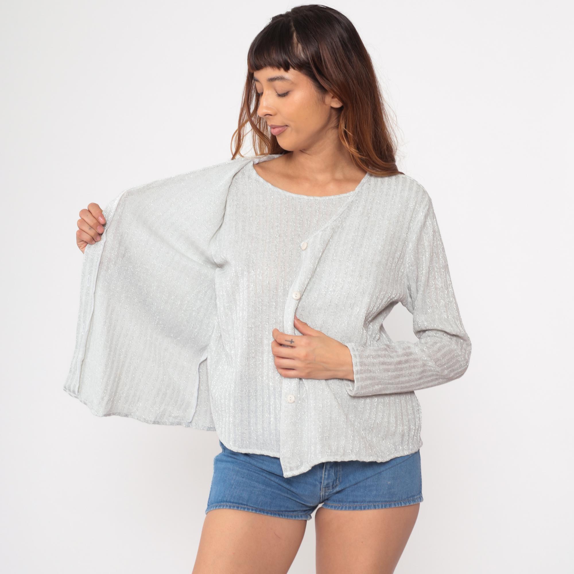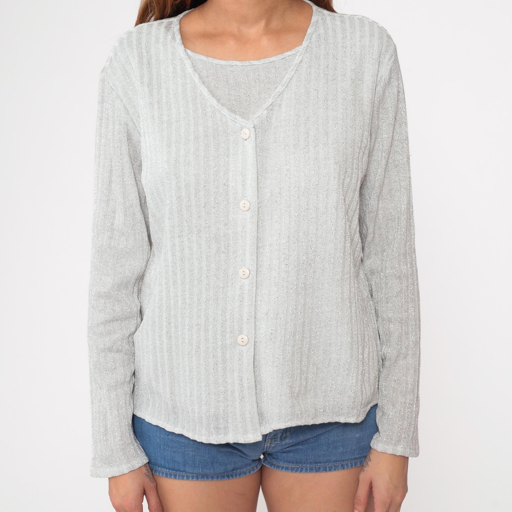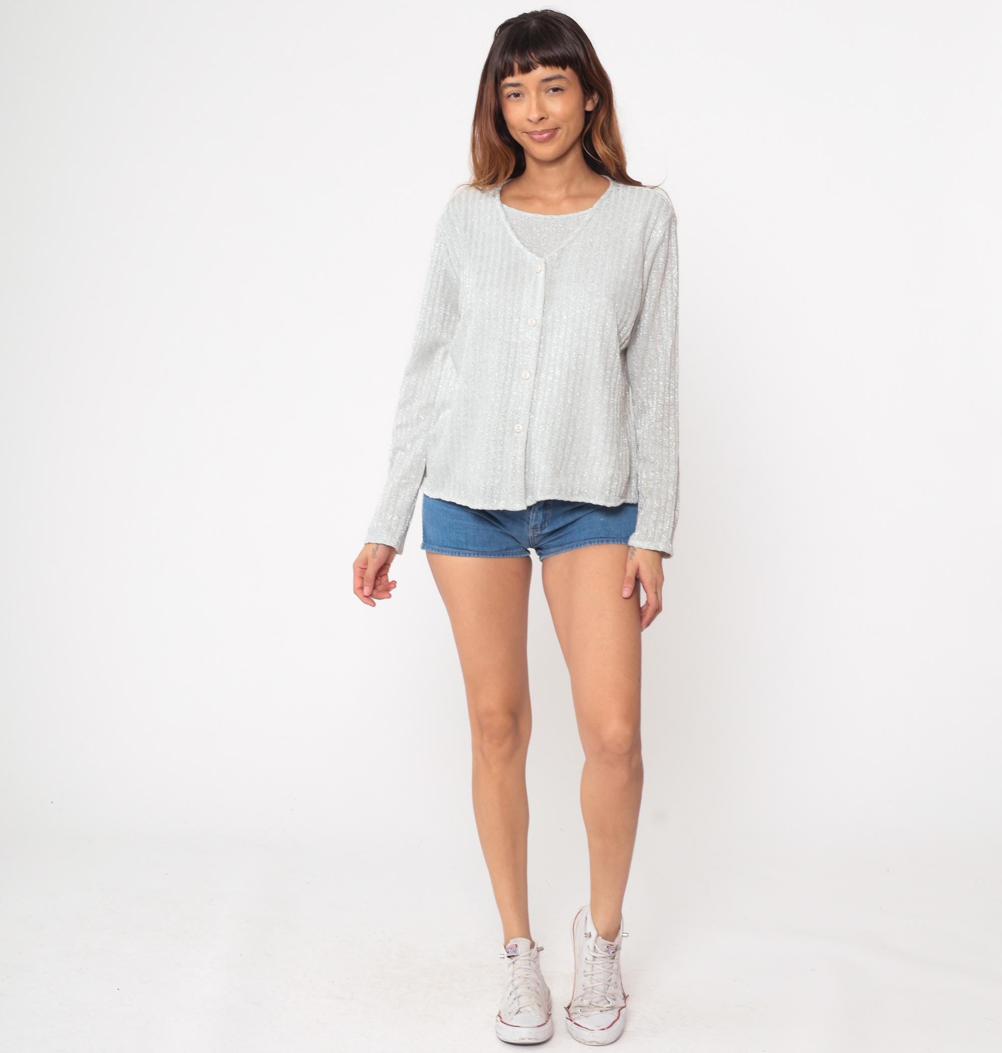 70s Lauren Lee silver metallic ribbed cardigan. Features vertical ribbed texture throughout with sparkly lurex blend fabric. Button-up front with white round buttons. Cropped silhouette with scoop neckline.