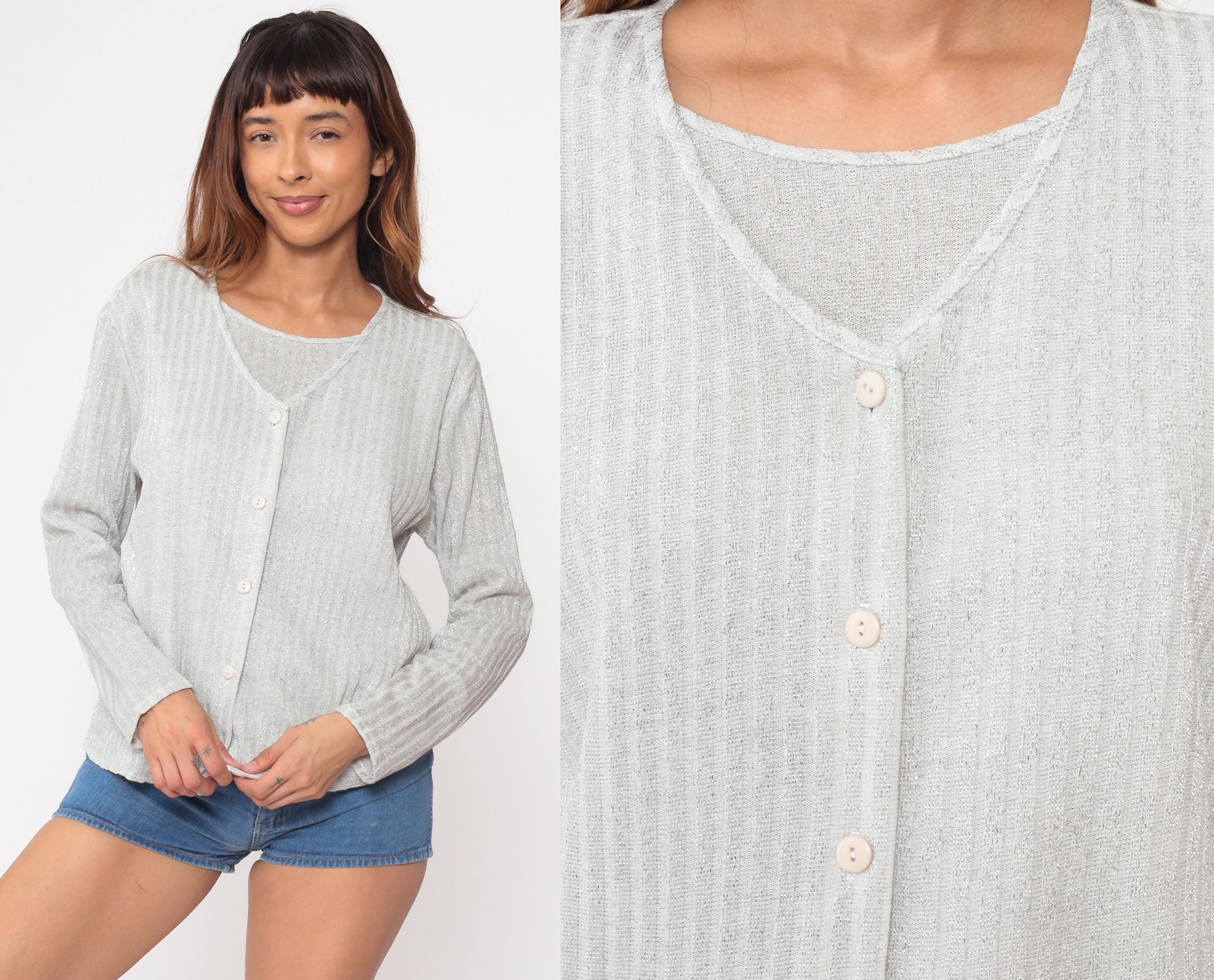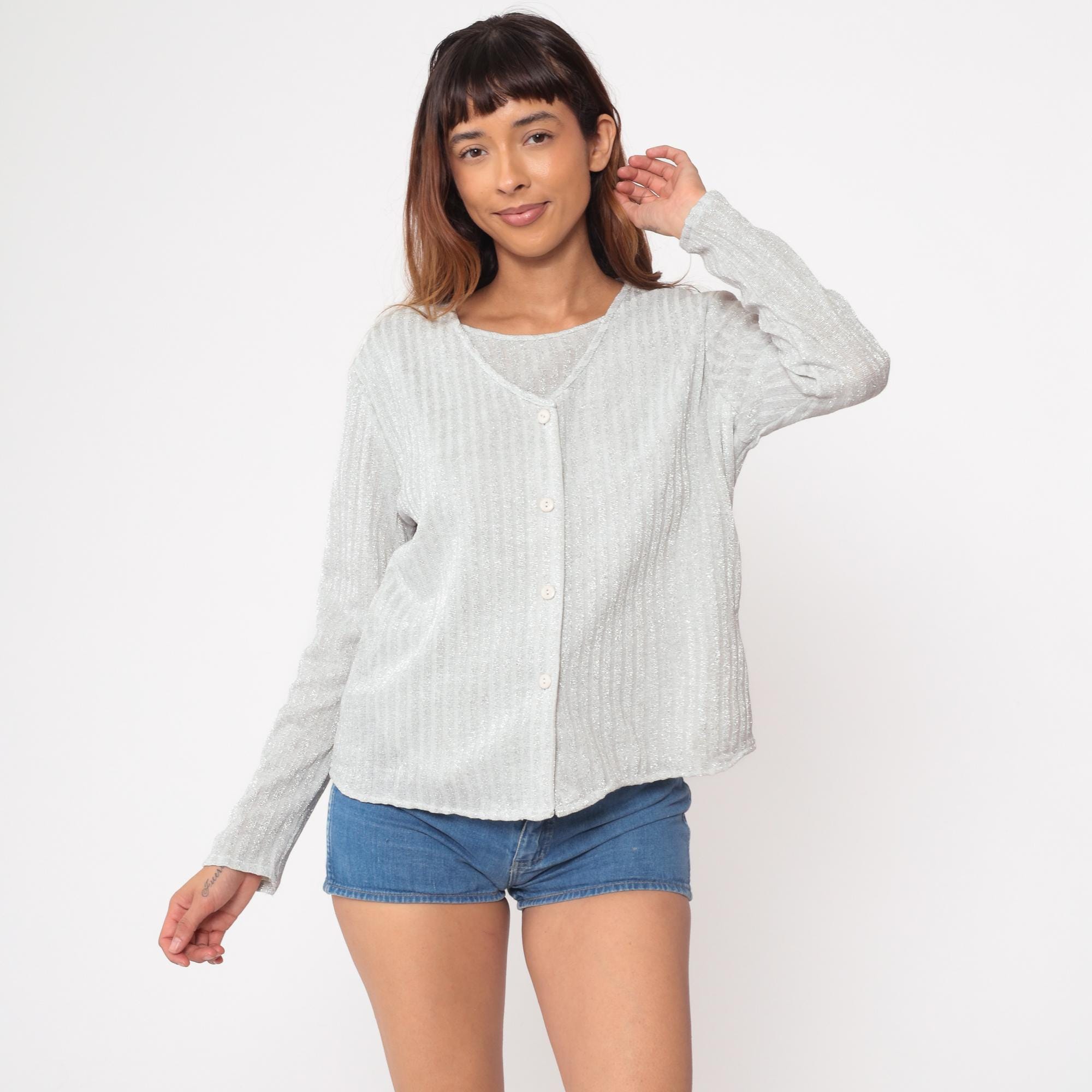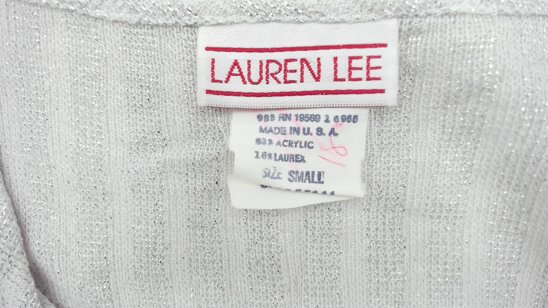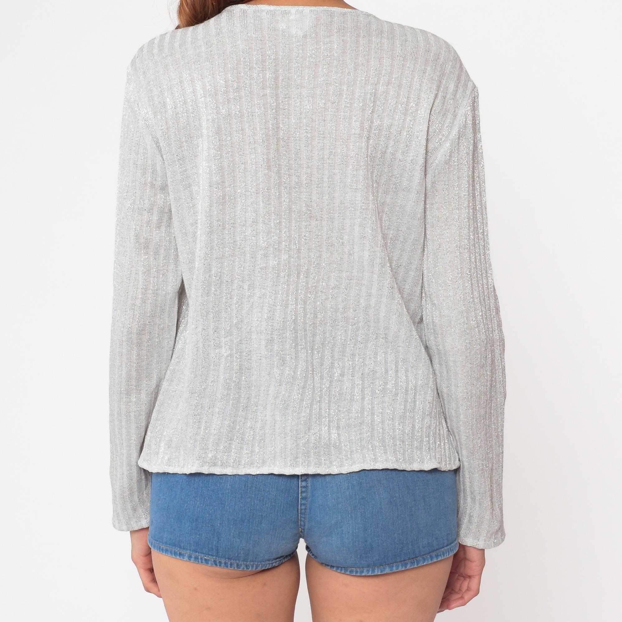 70s Lauren Lee silver metallic ribbed cardigan. Features vertical ribbed texture throughout with sparkly lurex blend fabric. Button-up front with white round buttons. Cropped silhouette with scoop neckline.