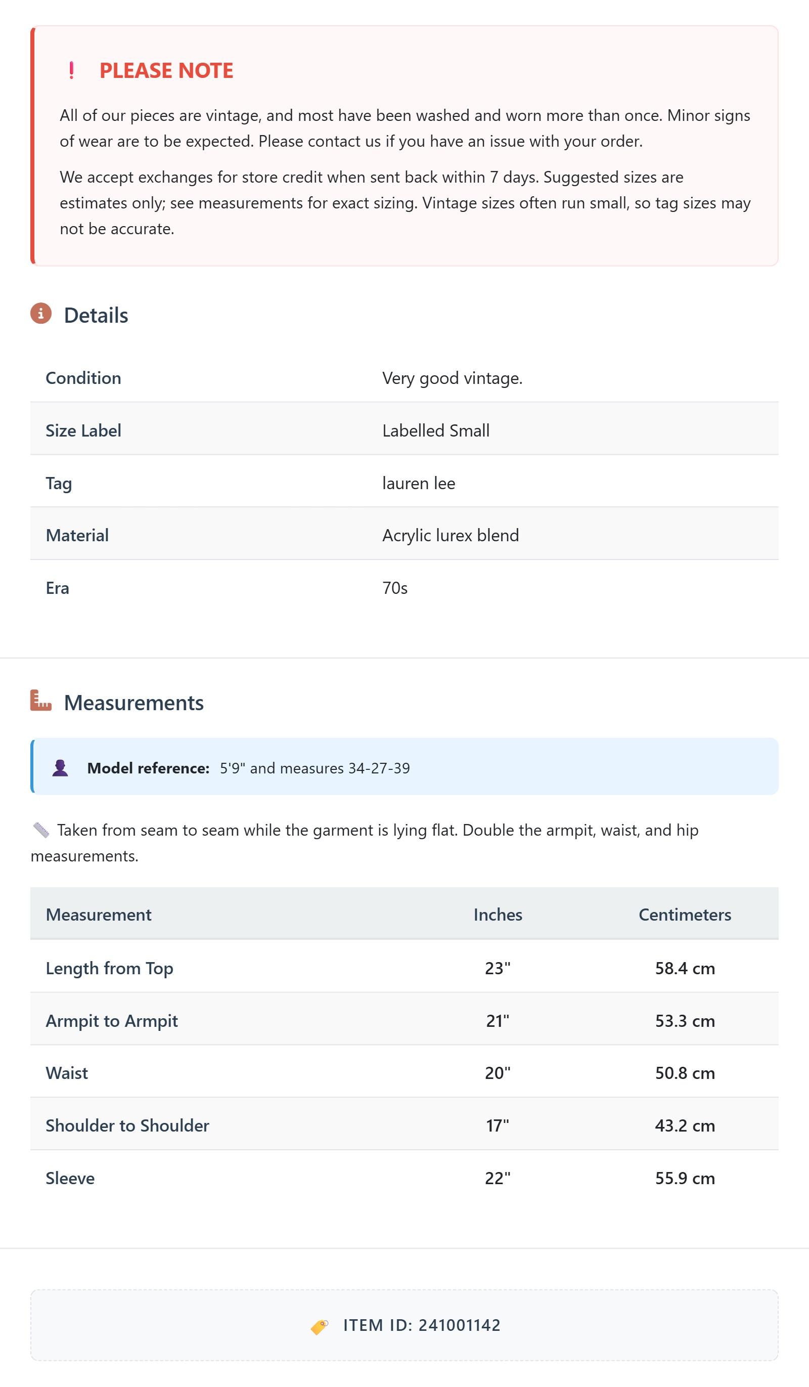 Suggested sizes are estimates only; see measurements for exact sizing. Vintage sizes often run small, so tag sizes may not be accurate.
