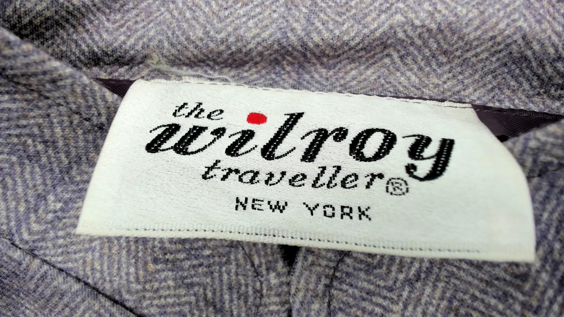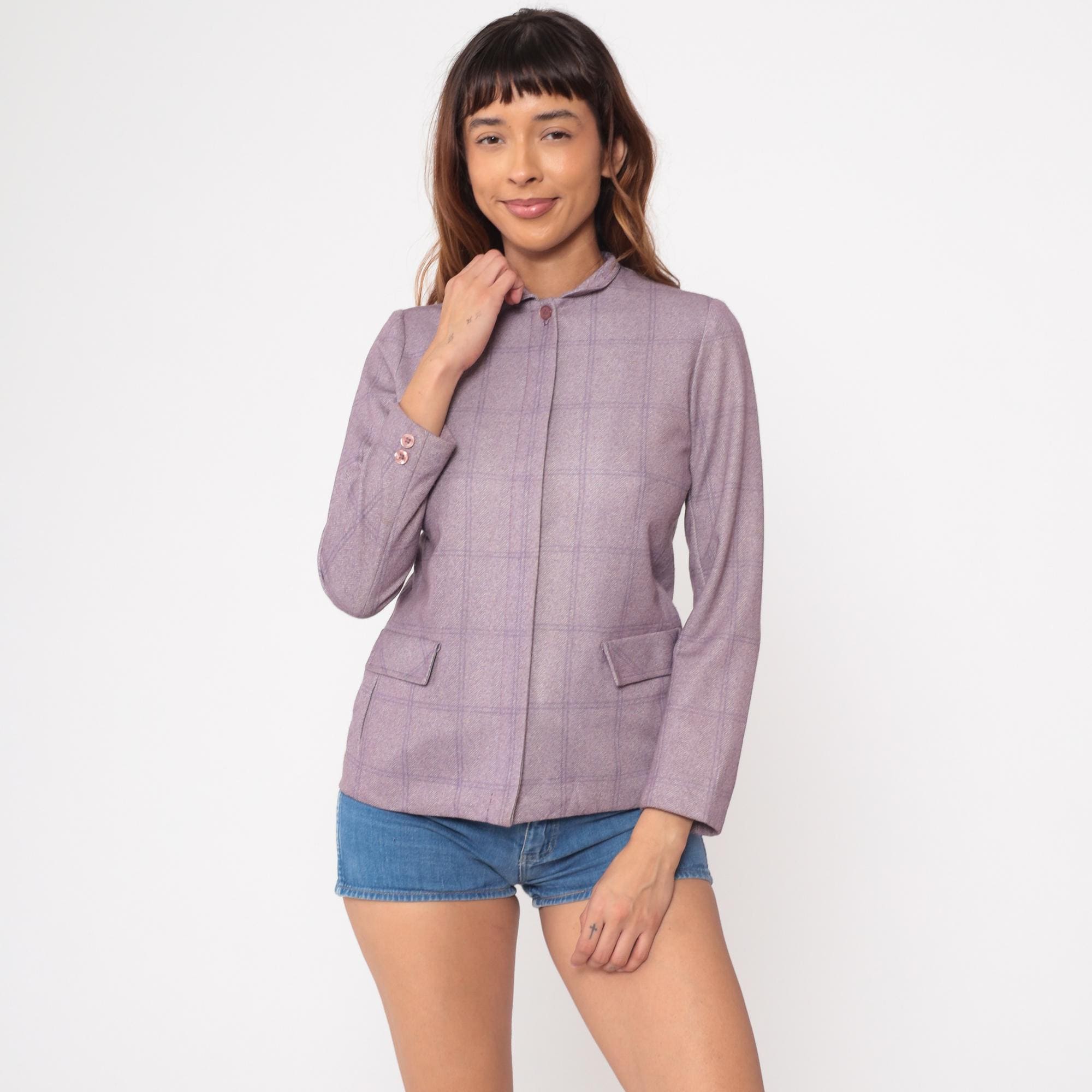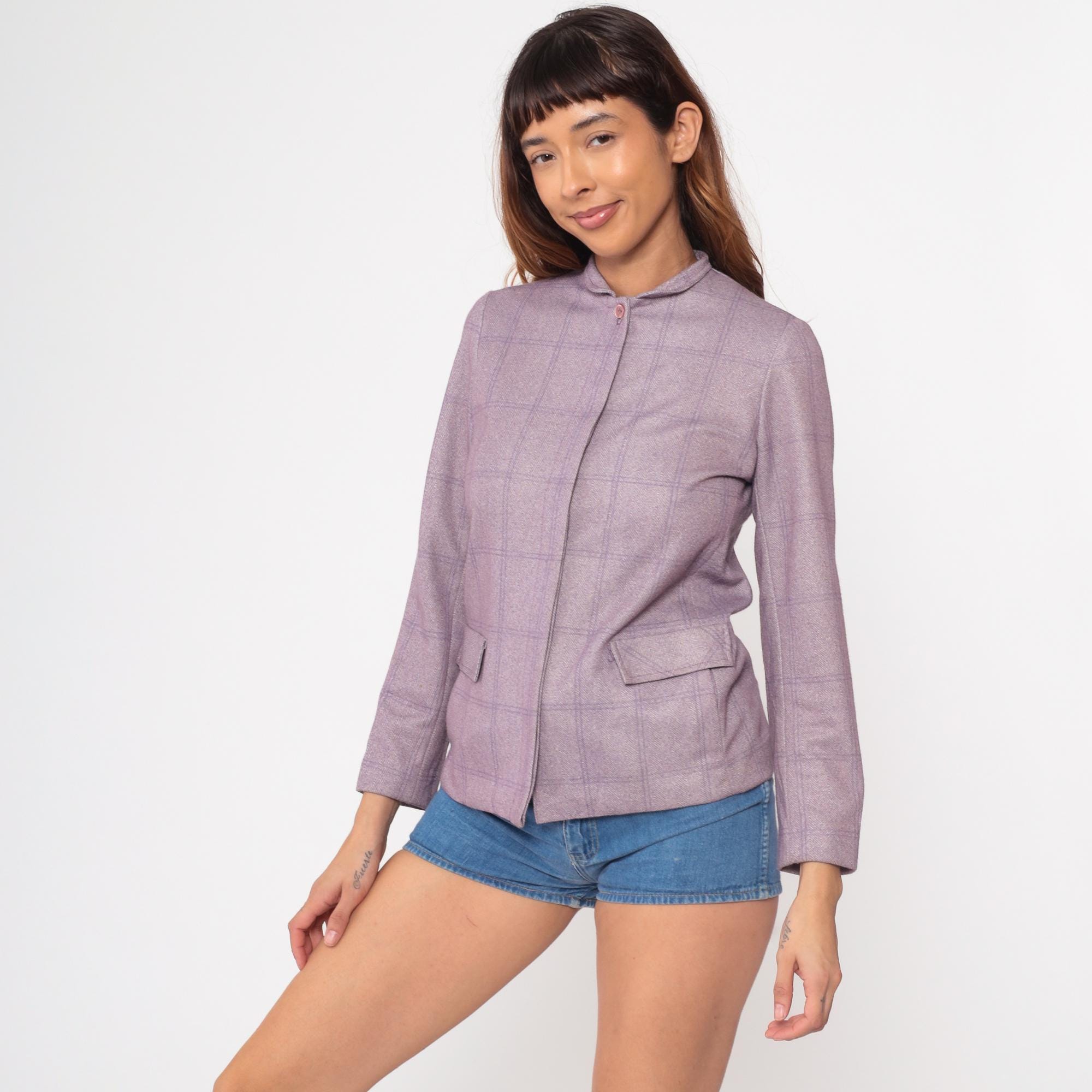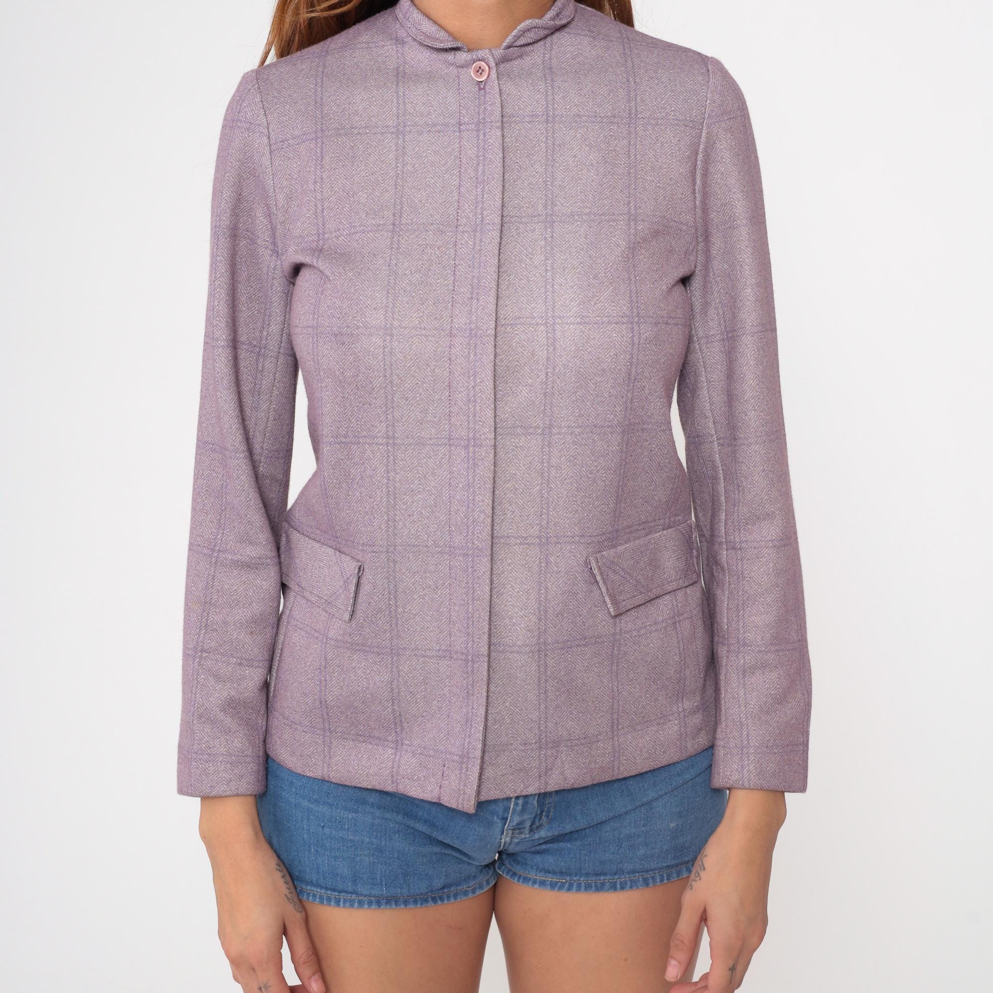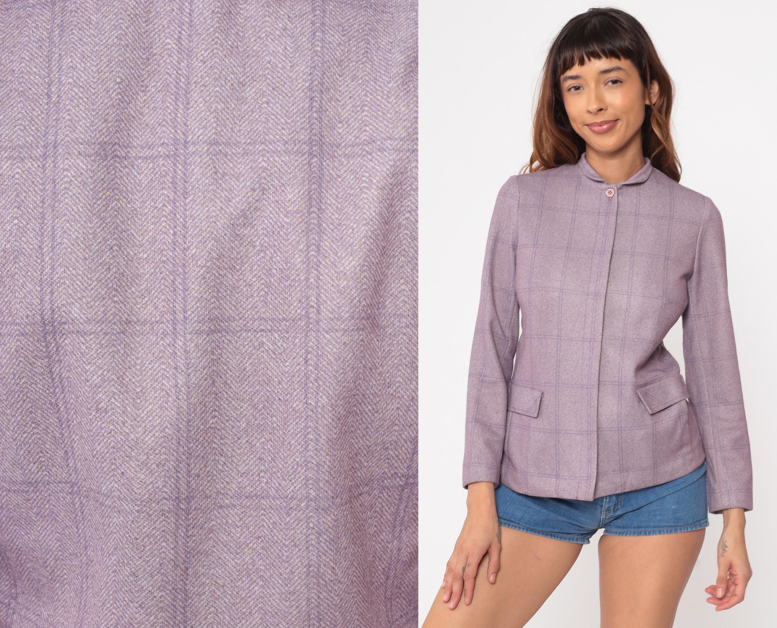80s Wilroy Traveler blazer in lilac purple herringbone with subtle windowpane check pattern. Features mandarin collar, hidden front closure, and two functional front pockets. Structured silhouette with tailored fit.