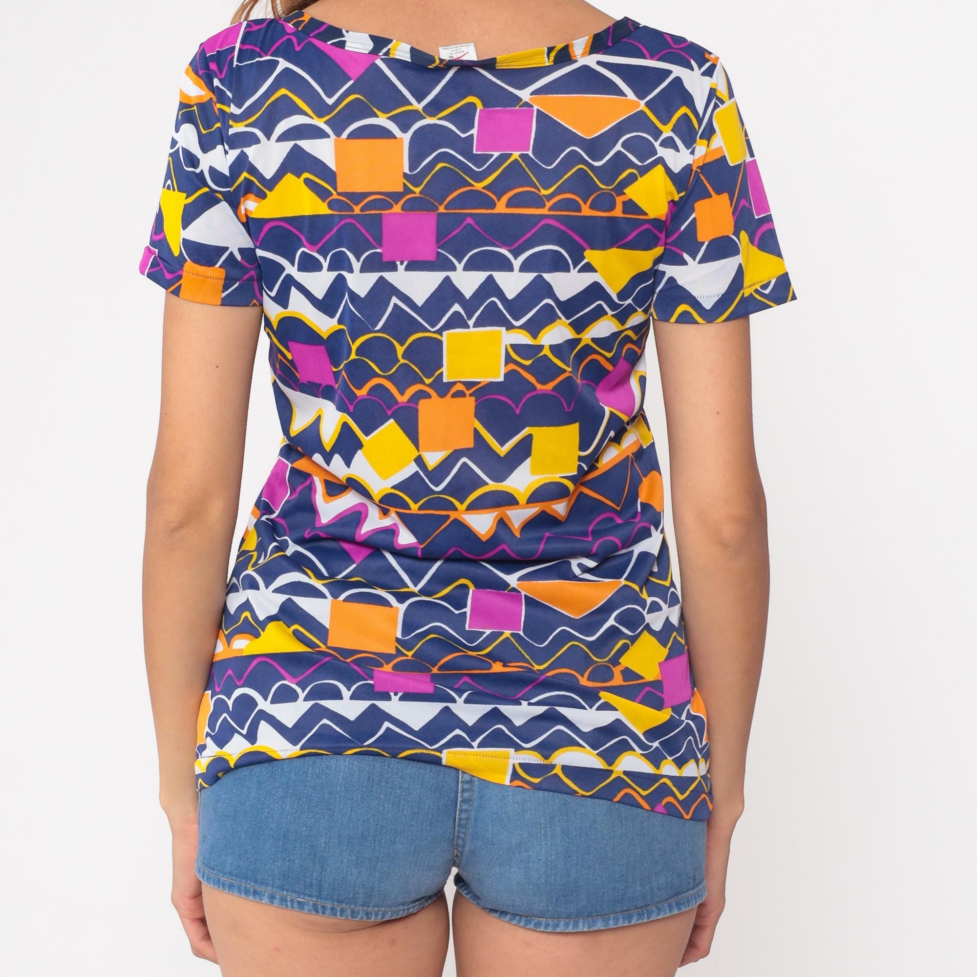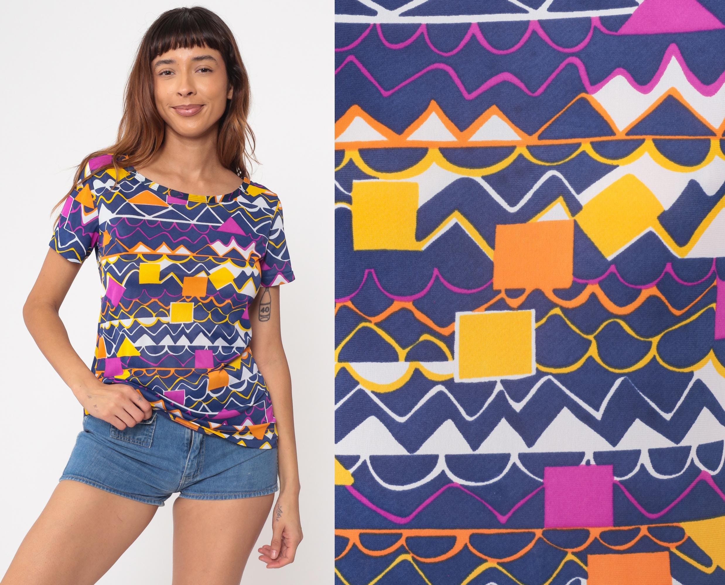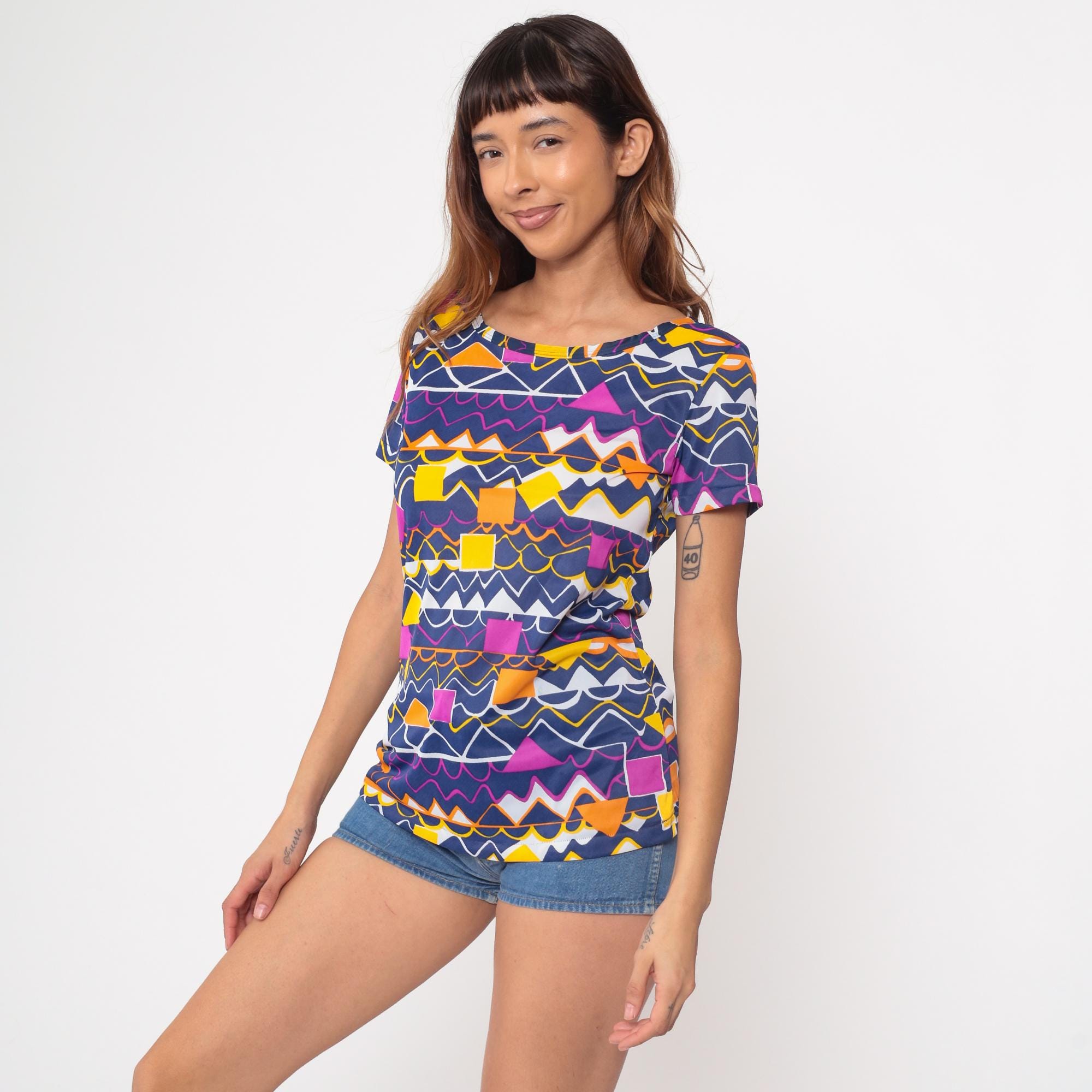 Vintage 1980s Speedo graphic top with a scoop neckline, straight hem, and a bold geometric pattern. Navy blue background with vibrant pink, yellow, orange, and white abstract designs including zigzags, waves, squares, and triangles.