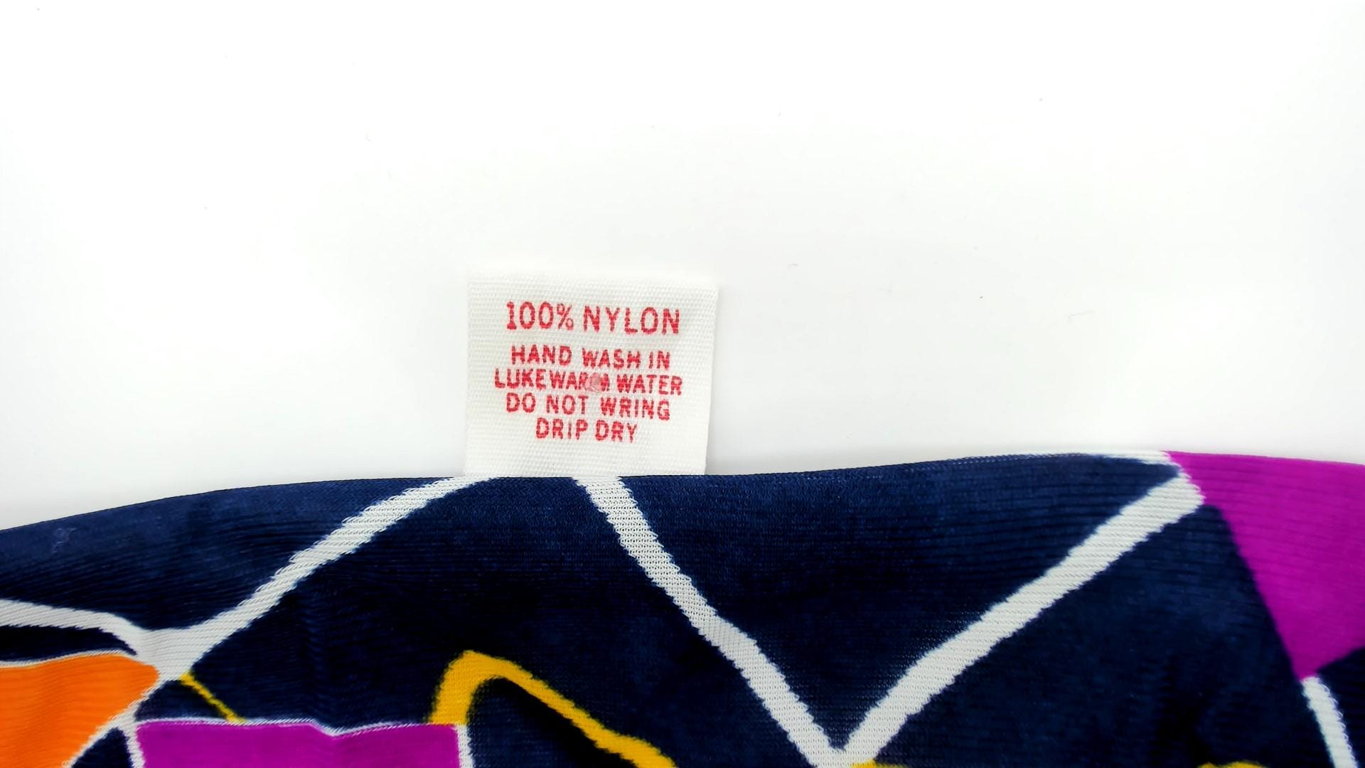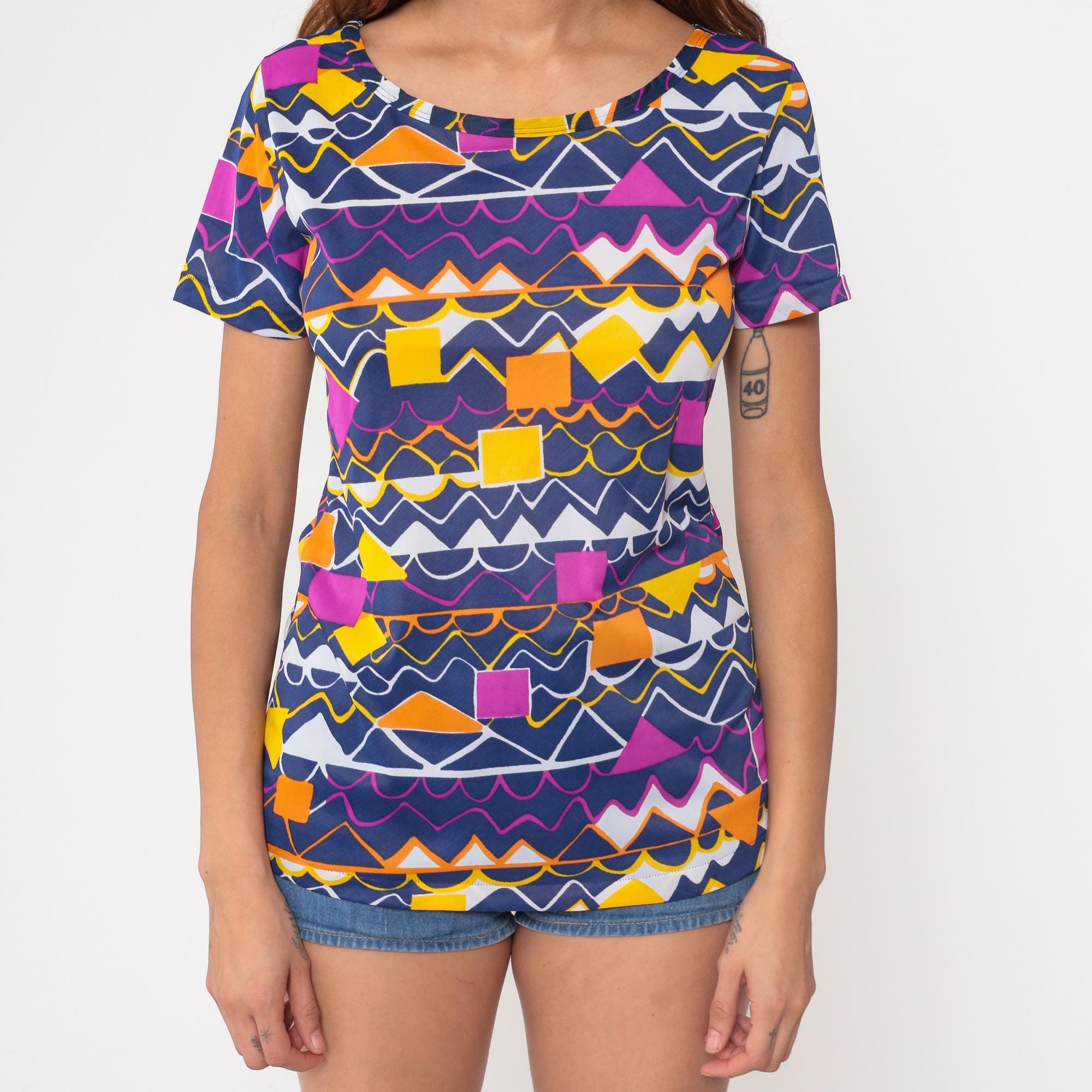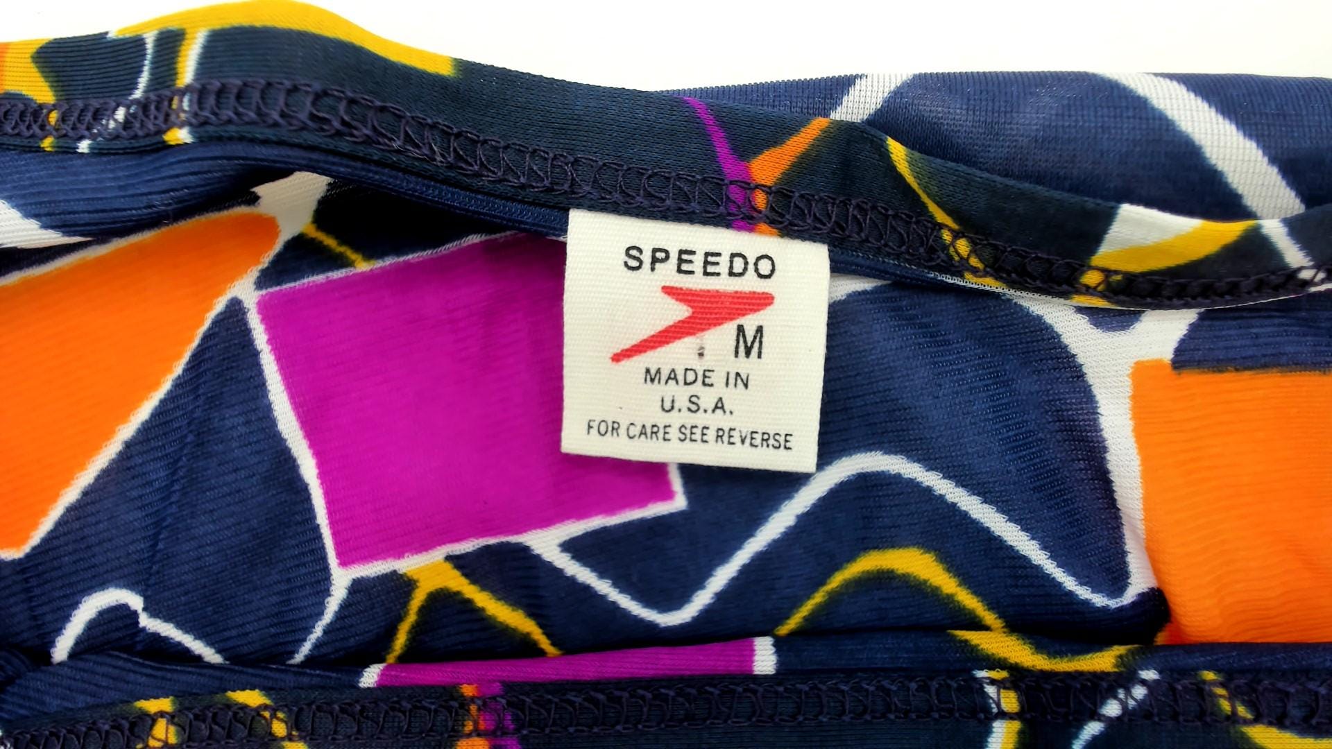 Vintage 1980s Speedo graphic top with a scoop neckline, straight hem, and a bold geometric pattern. Navy blue background with vibrant pink, yellow, orange, and white abstract designs including zigzags, waves, squares, and triangles.