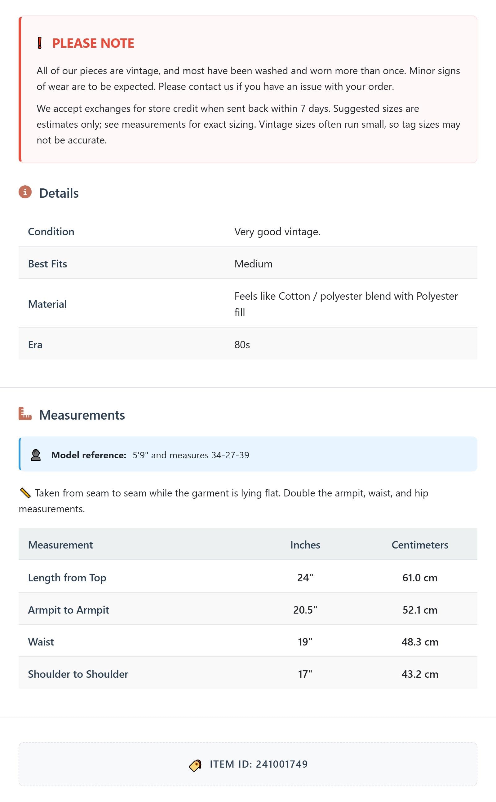 Suggested sizes are estimates only; see measurements for exact sizing. Vintage sizes often run small, so tag sizes may not be accurate.