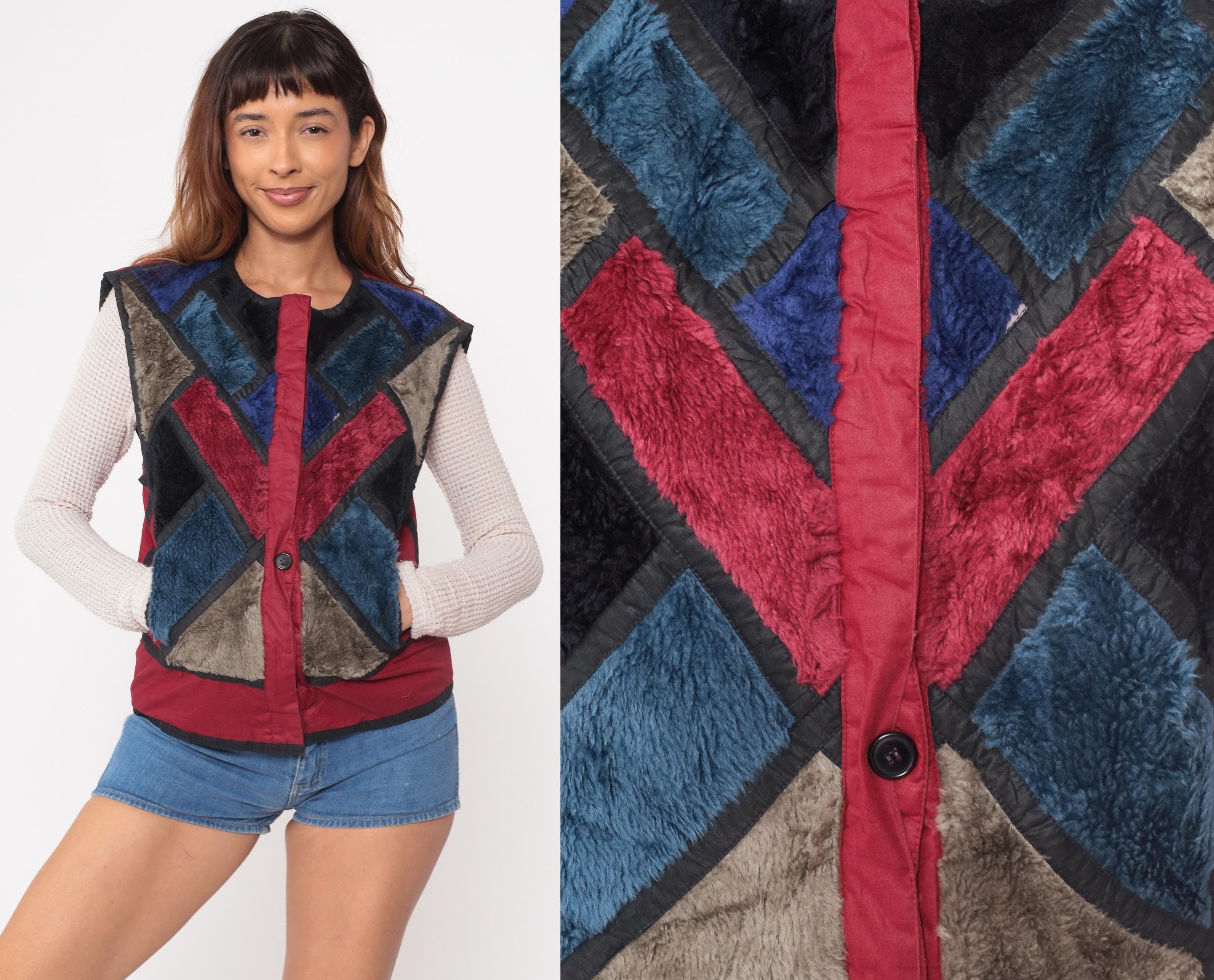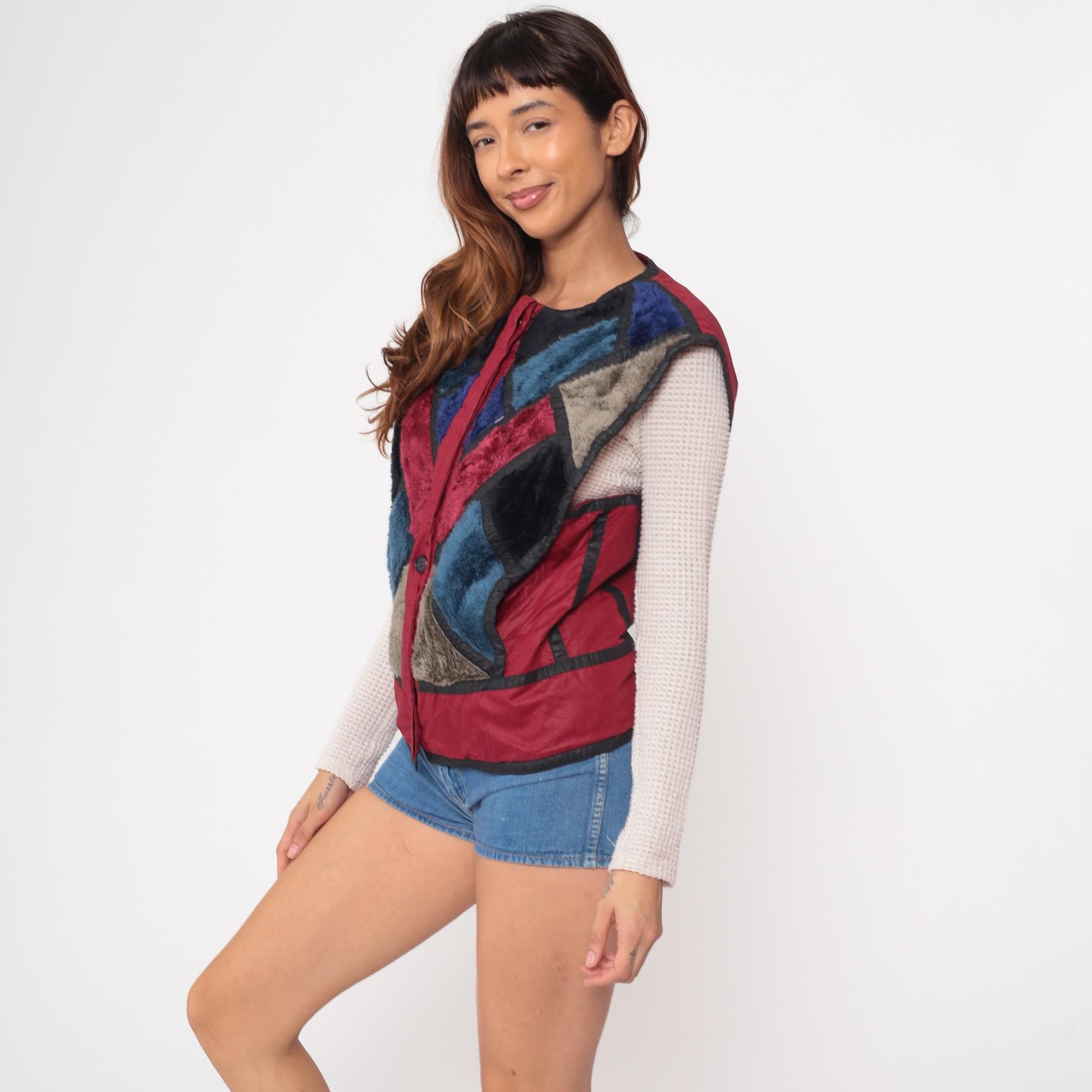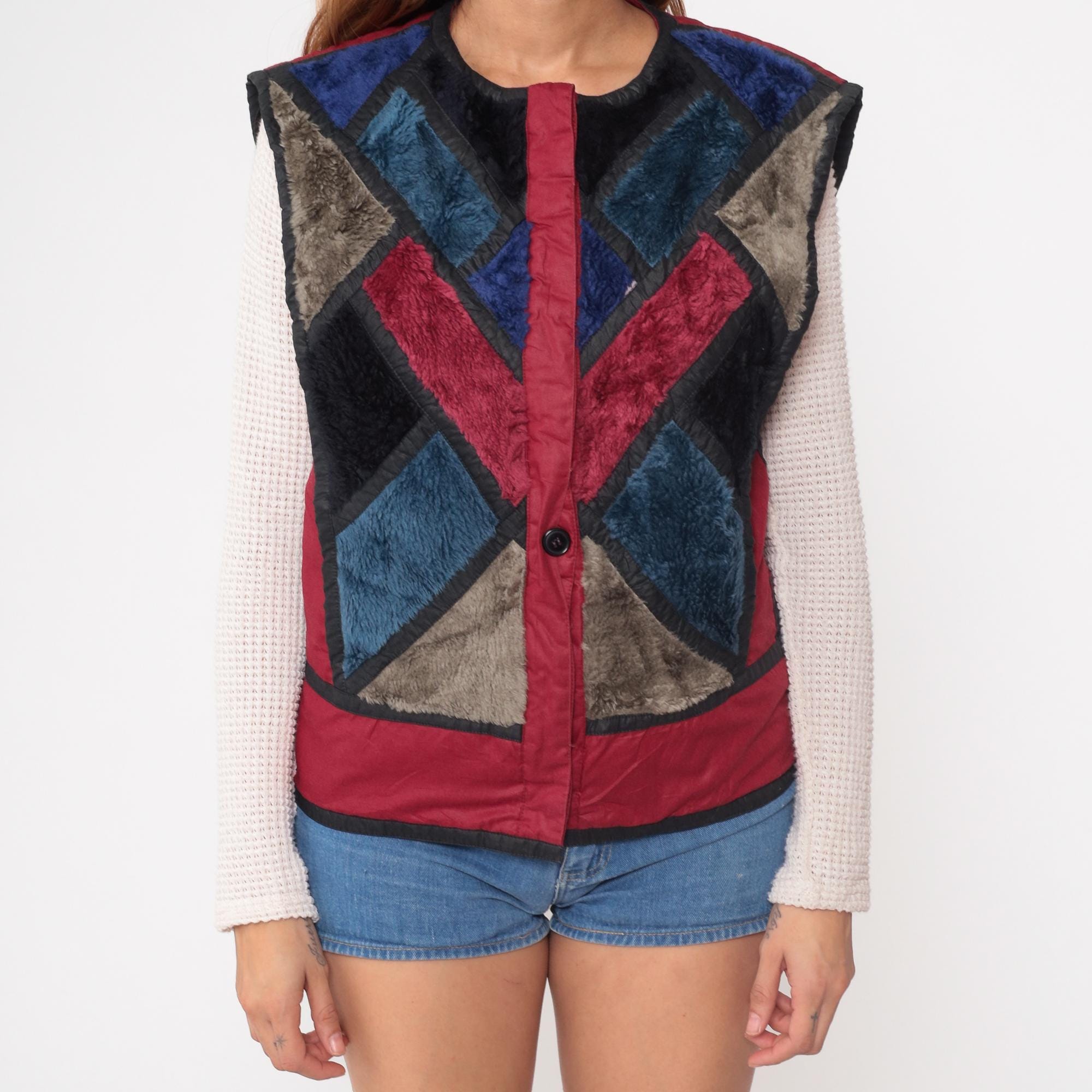 Vintage 1980s patchwork vest featuring a geometric design of plush faux fur panels in burgundy, navy blue, teal blue, black, and gray. Button front closure with burgundy trim and black piping throughout. Lined in burgundy fabric.