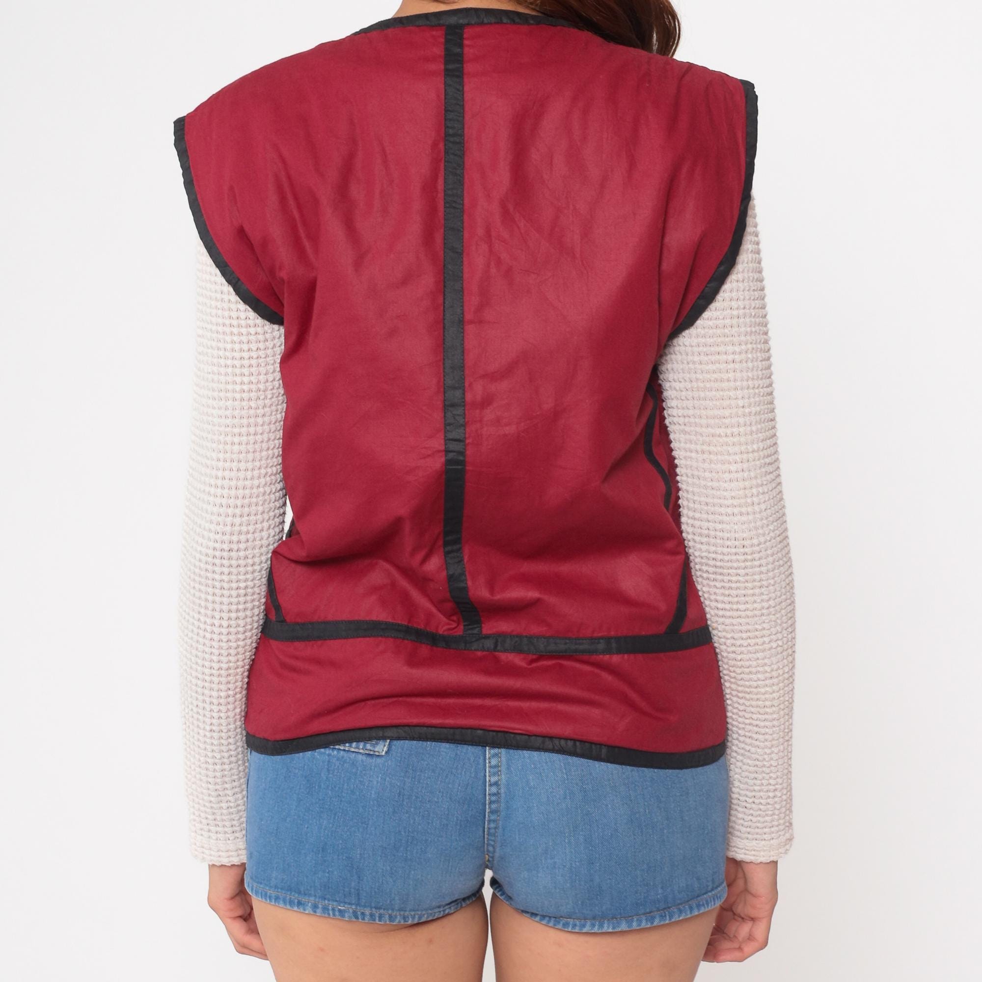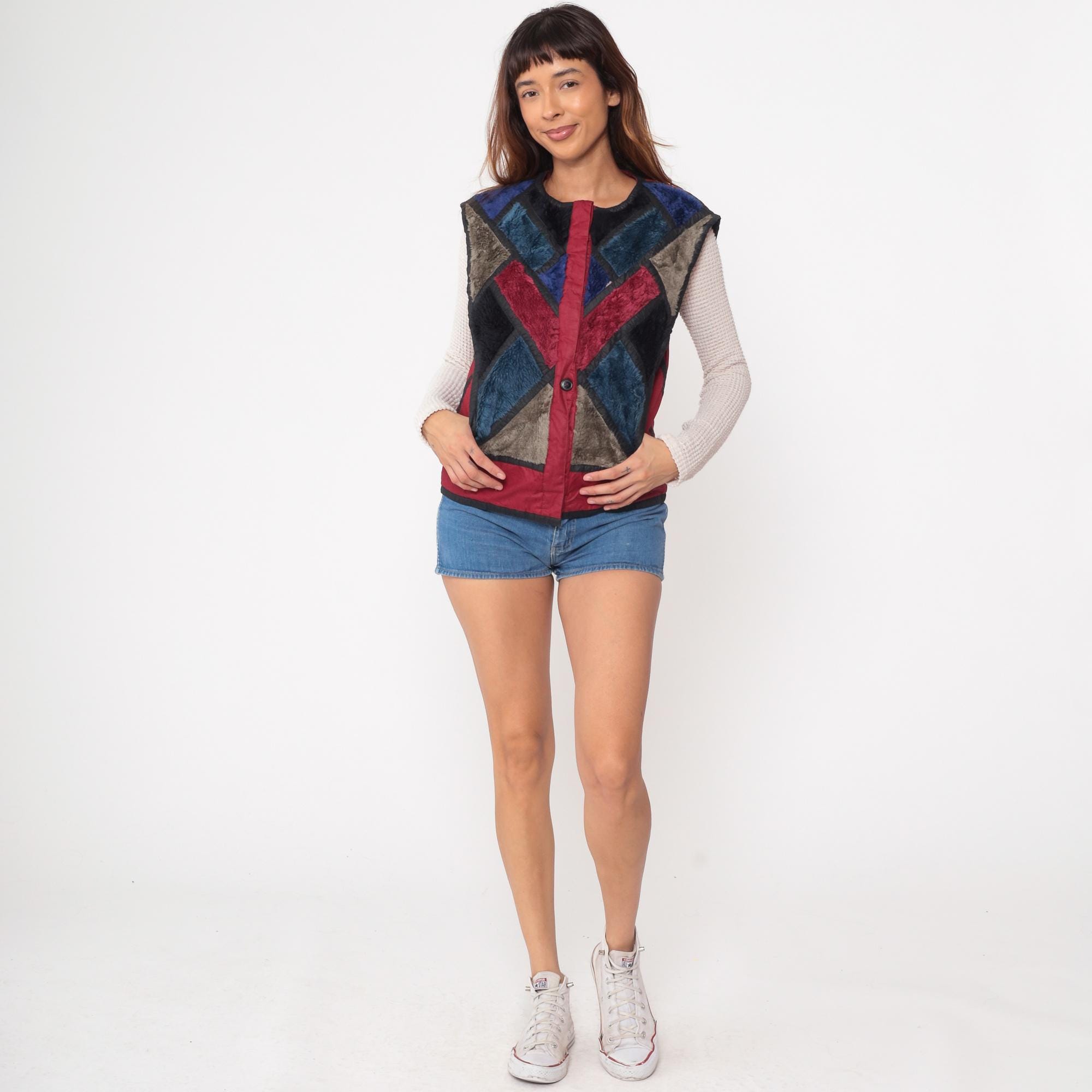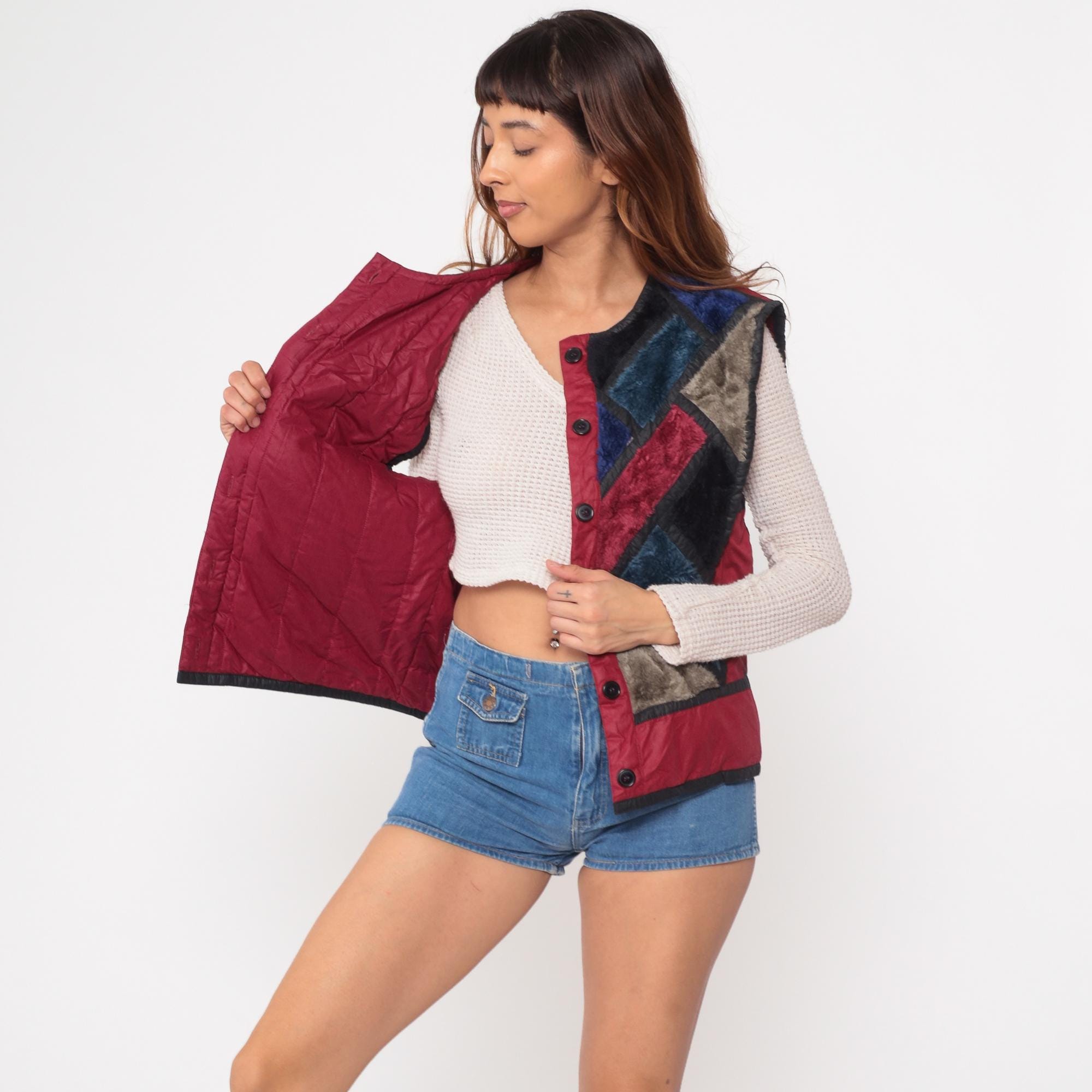 Vintage 1980s patchwork vest featuring a geometric design of plush faux fur panels in burgundy, navy blue, teal blue, black, and gray. Button front closure with burgundy trim and black piping throughout. Lined in burgundy fabric.