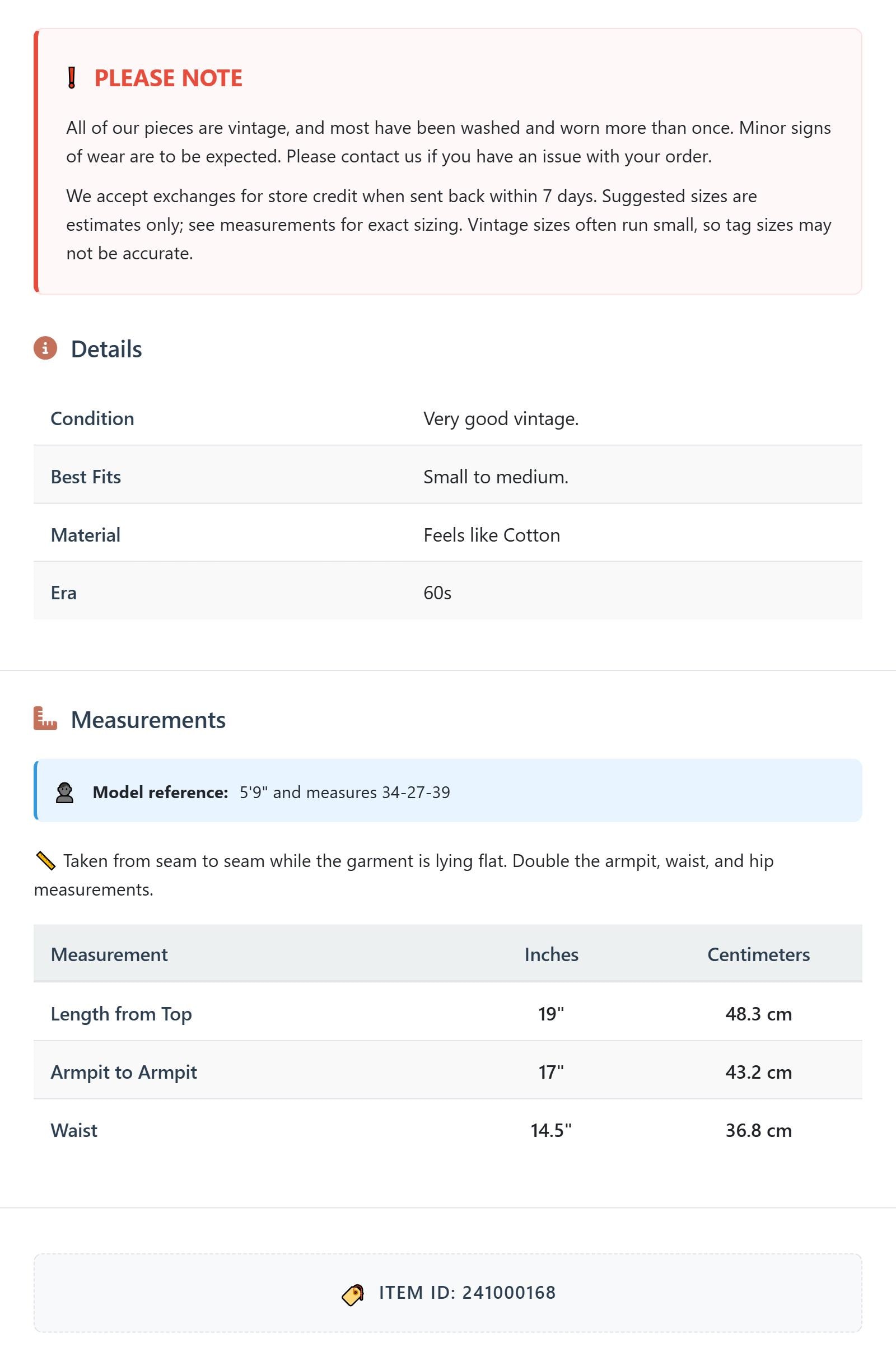 All of our pieces are vintage, and most have been washed and worn more than once. Minor signs of wear are to be expected. Please contact us if you have an issue with your order. We accept exchanges for store credit when sent back within 7 days.