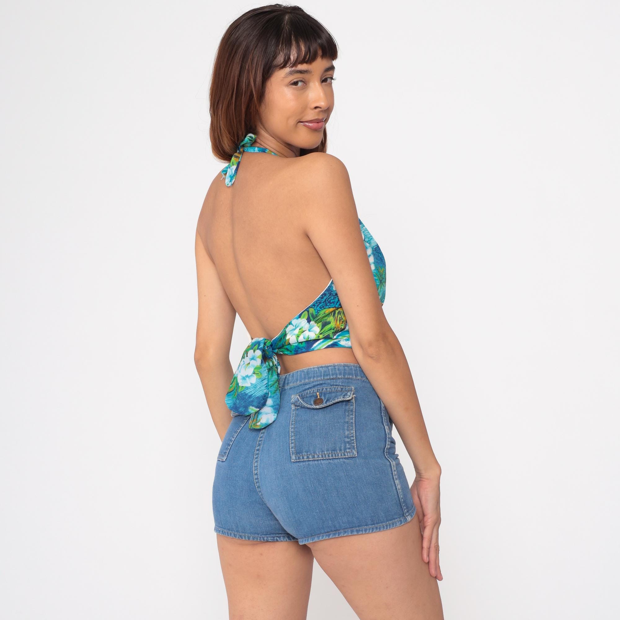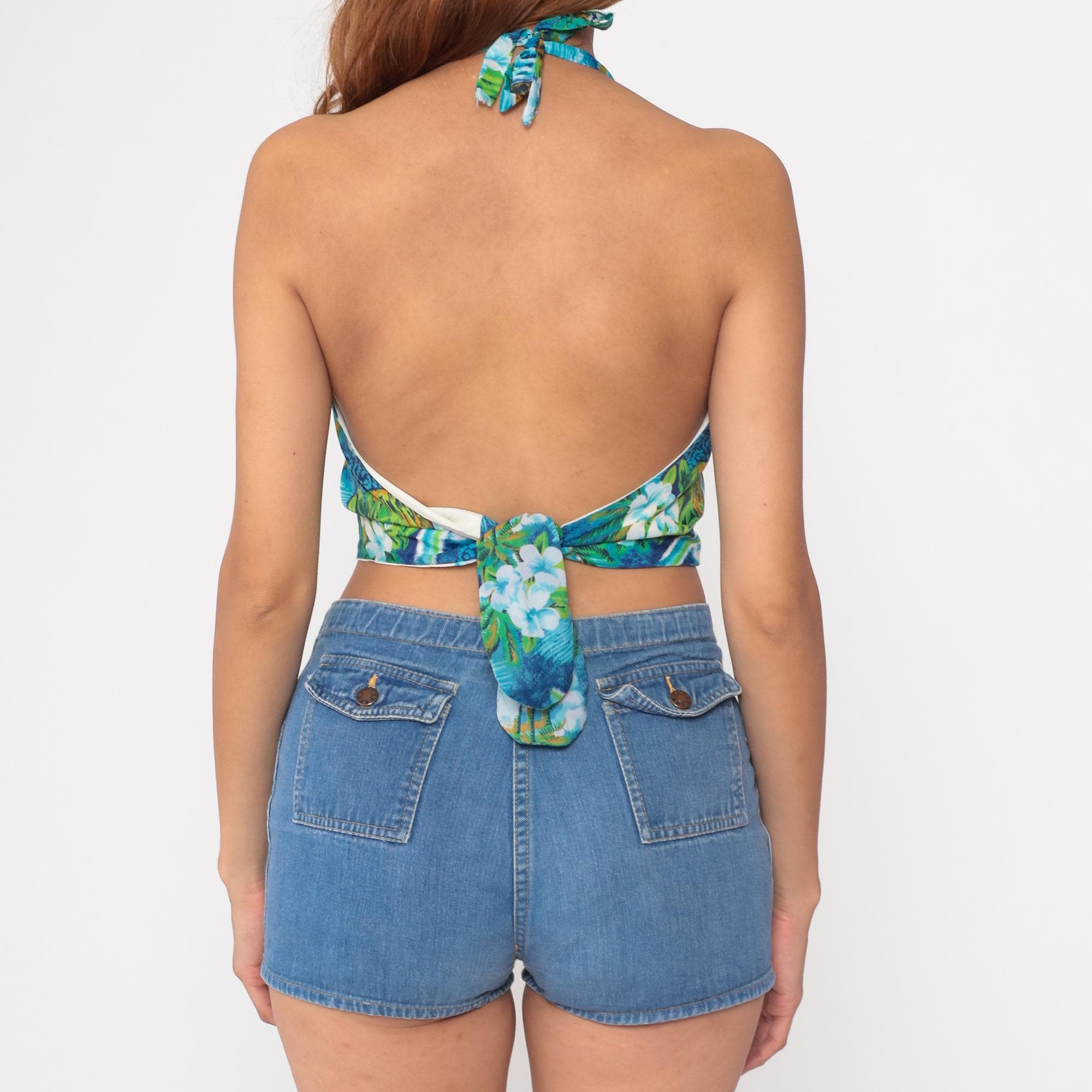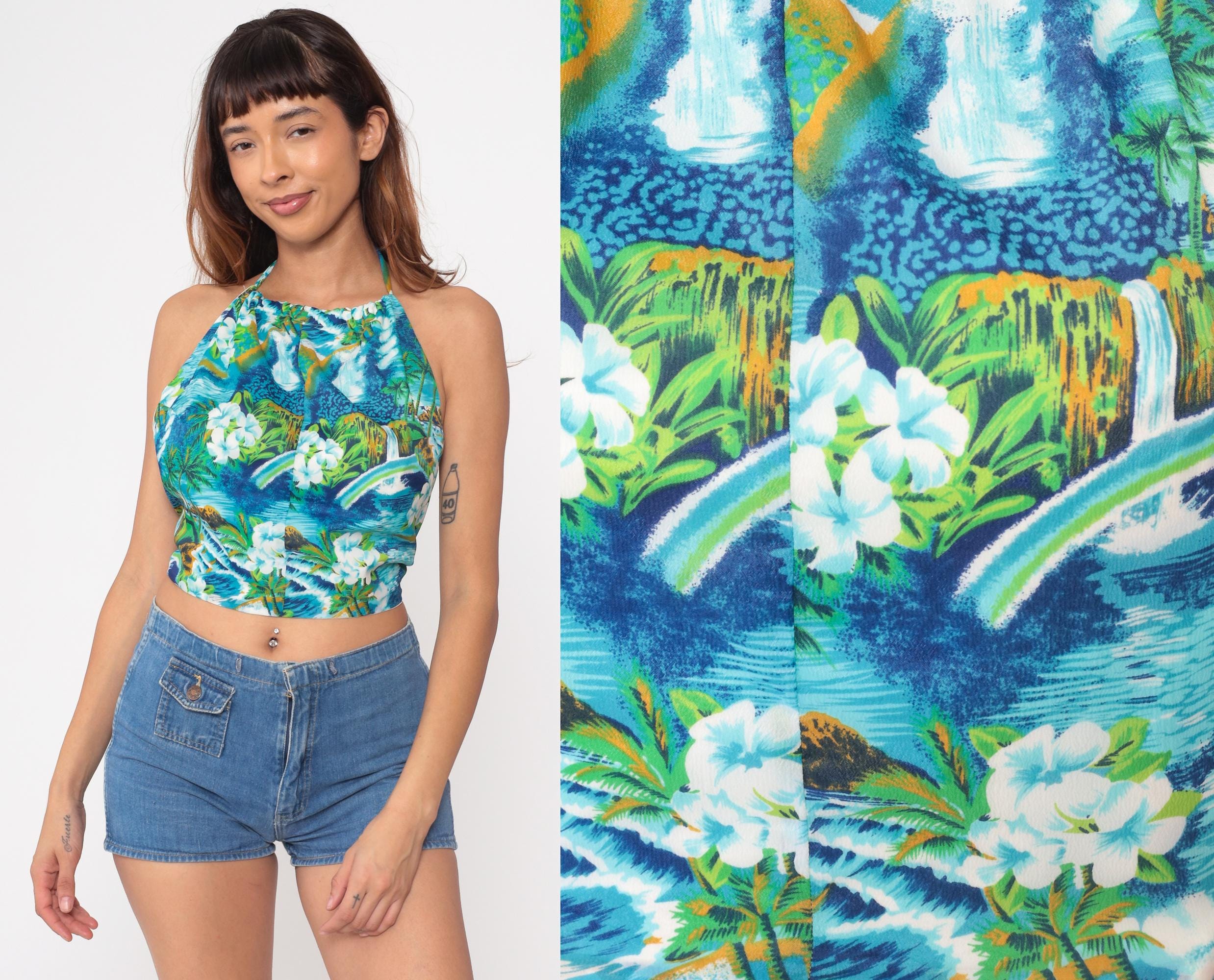 Vintage 1960s Hawaiian halter top featuring a vibrant tropical print with blue waters, white flowers, and green palm trees. This sleeveless crop top has a high neck halter design with tie closure at the neck and back. The backless style showcases a decorative tie detail.