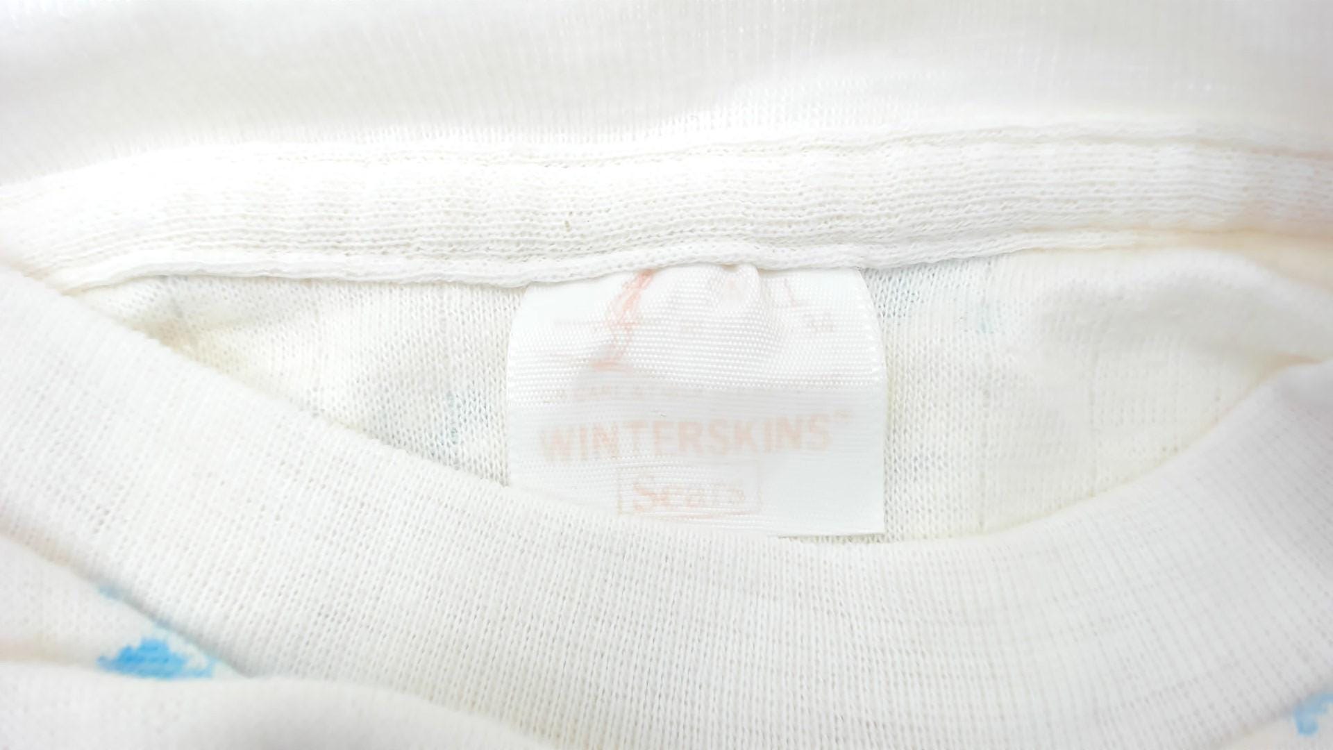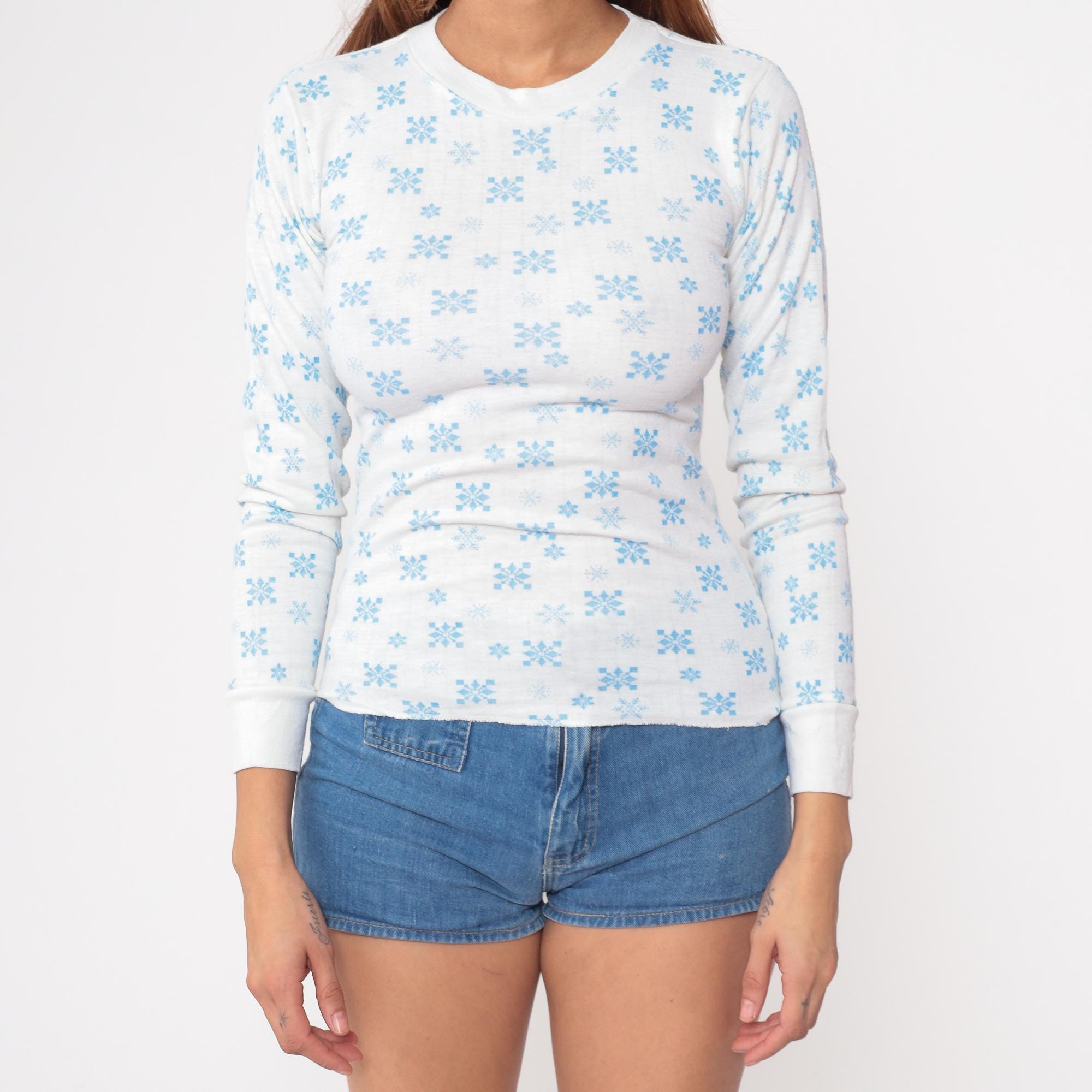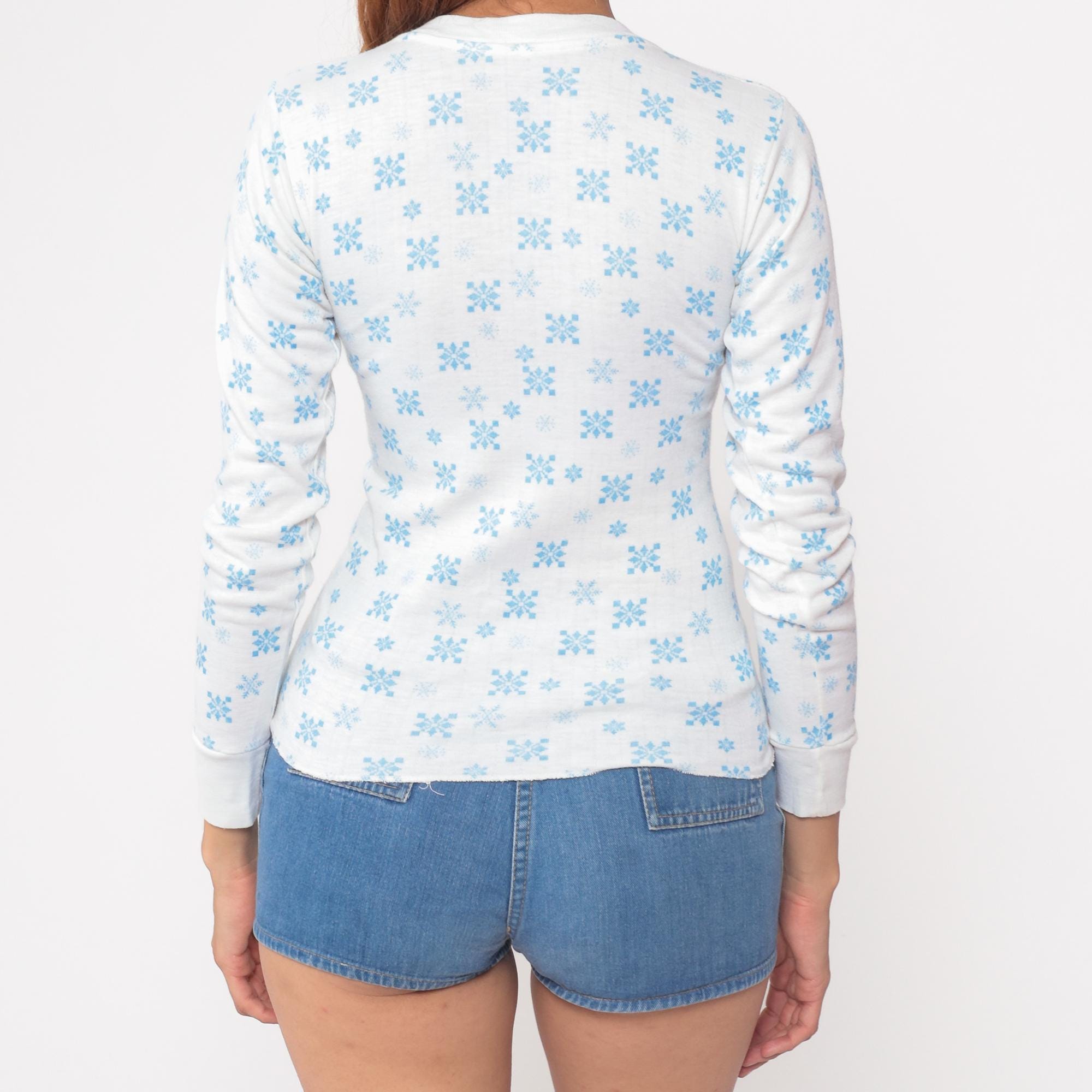 Vintage 80s shirt in white with a blue snowflake design.