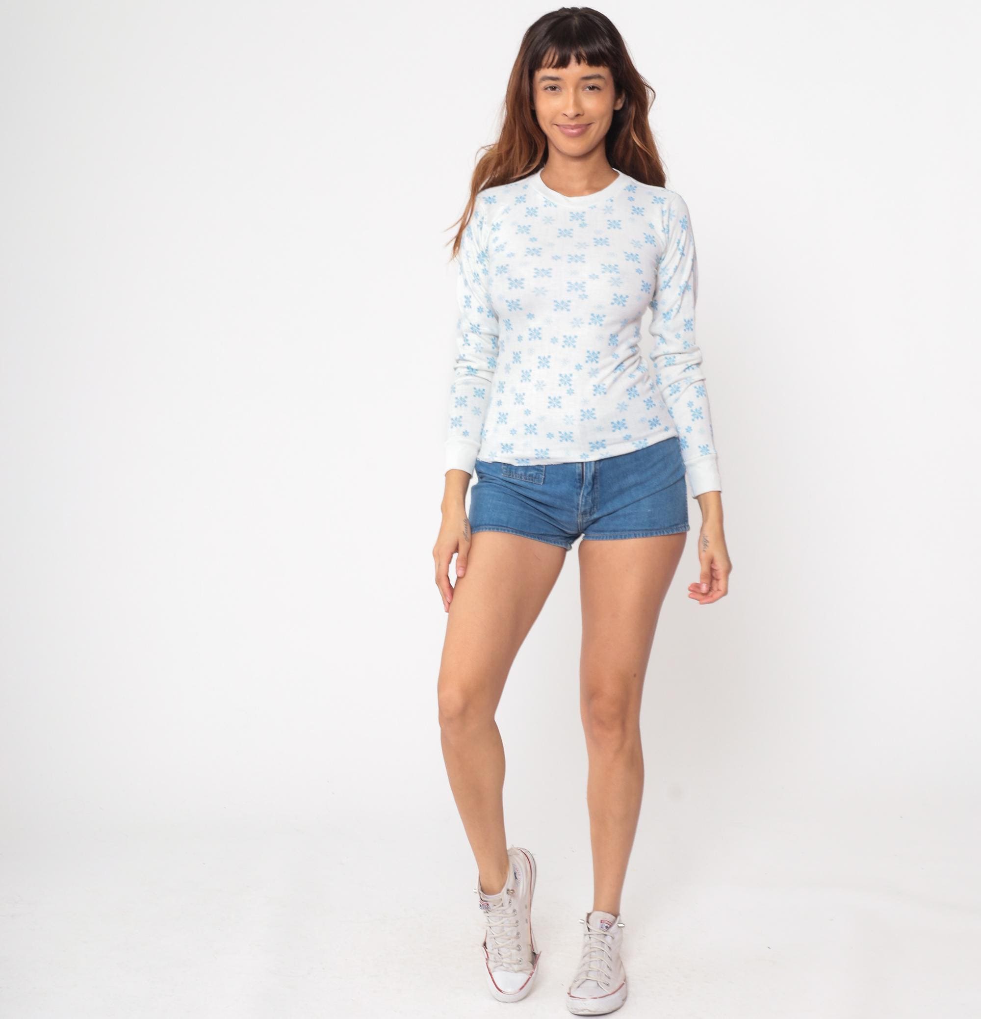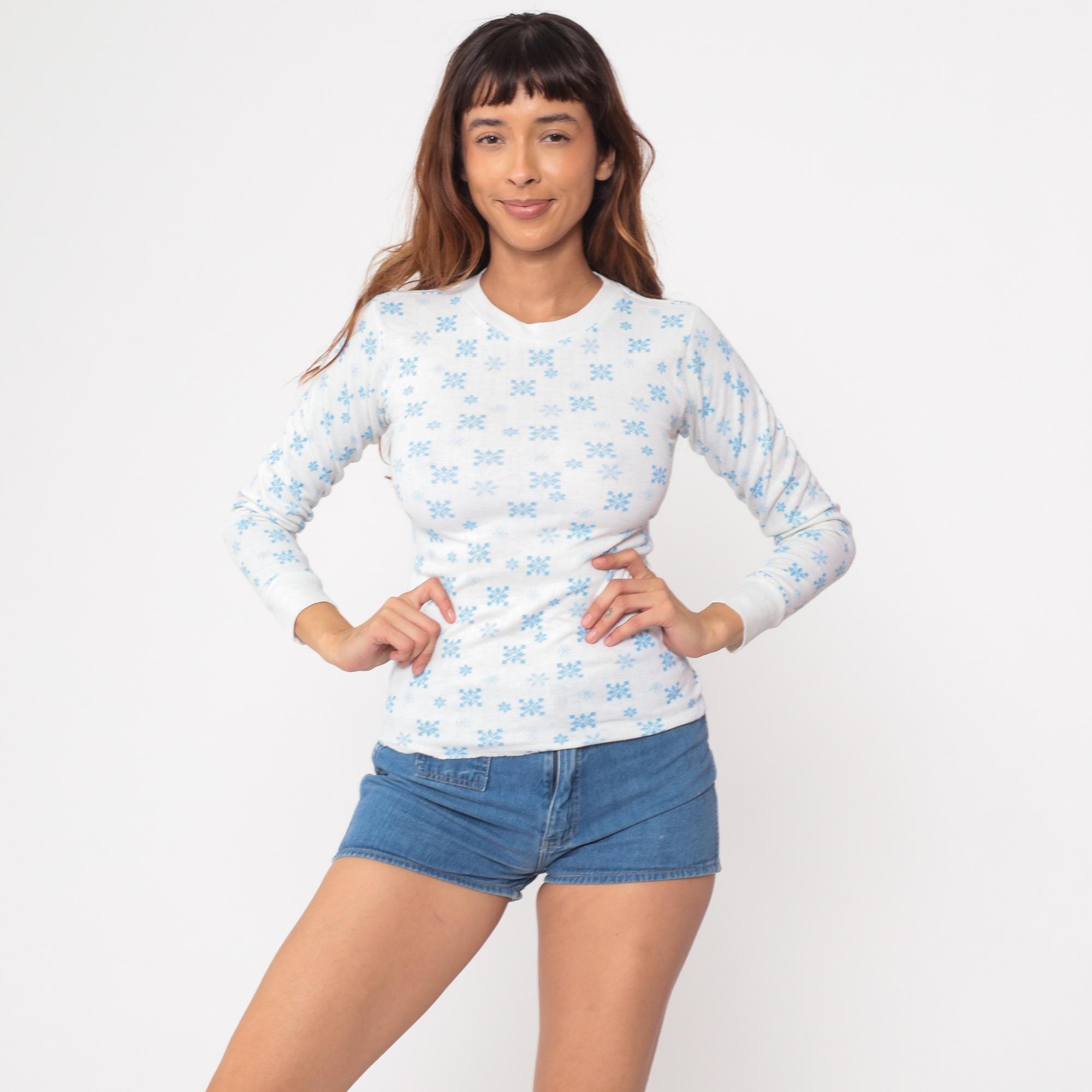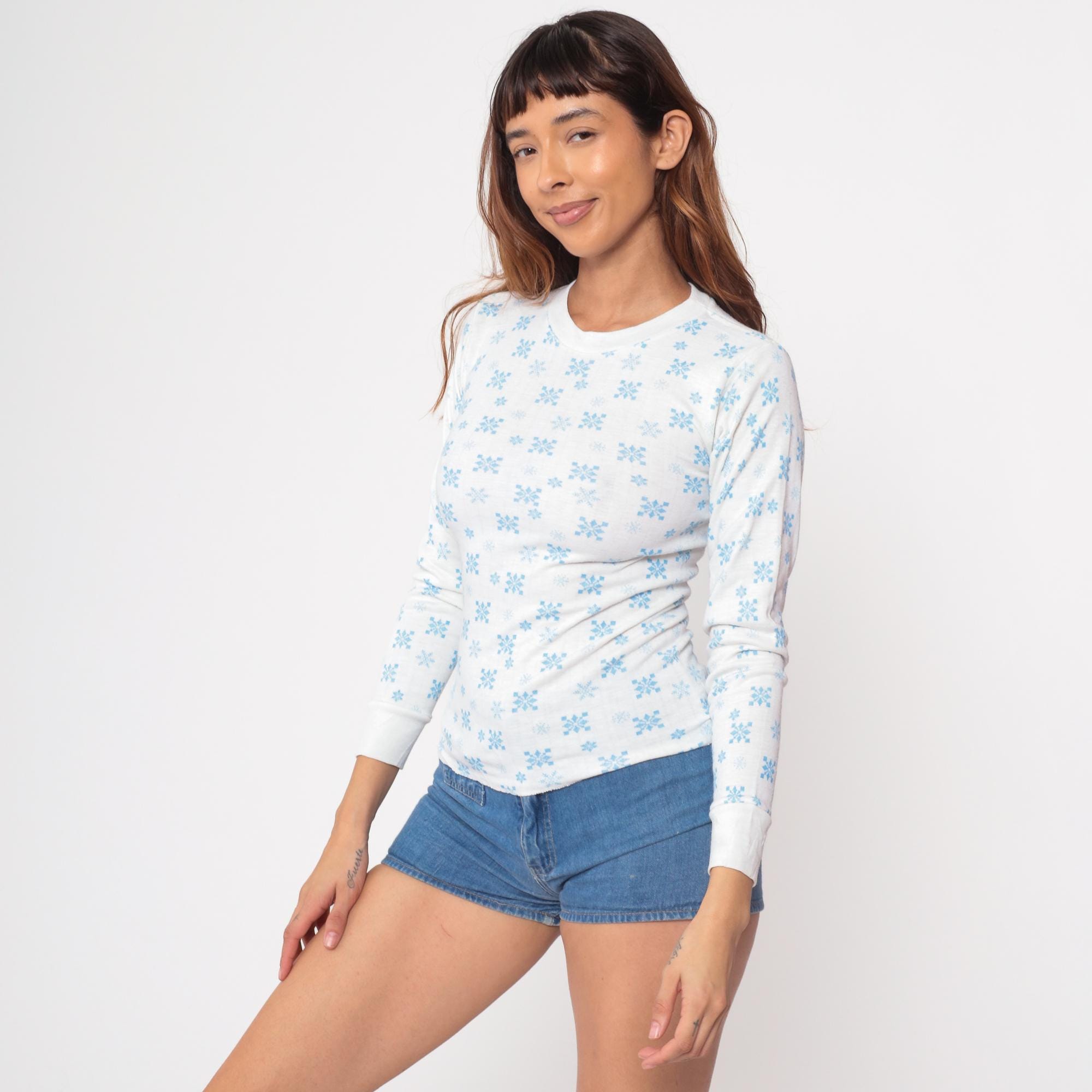 Vintage 80s shirt in white with a blue snowflake design.