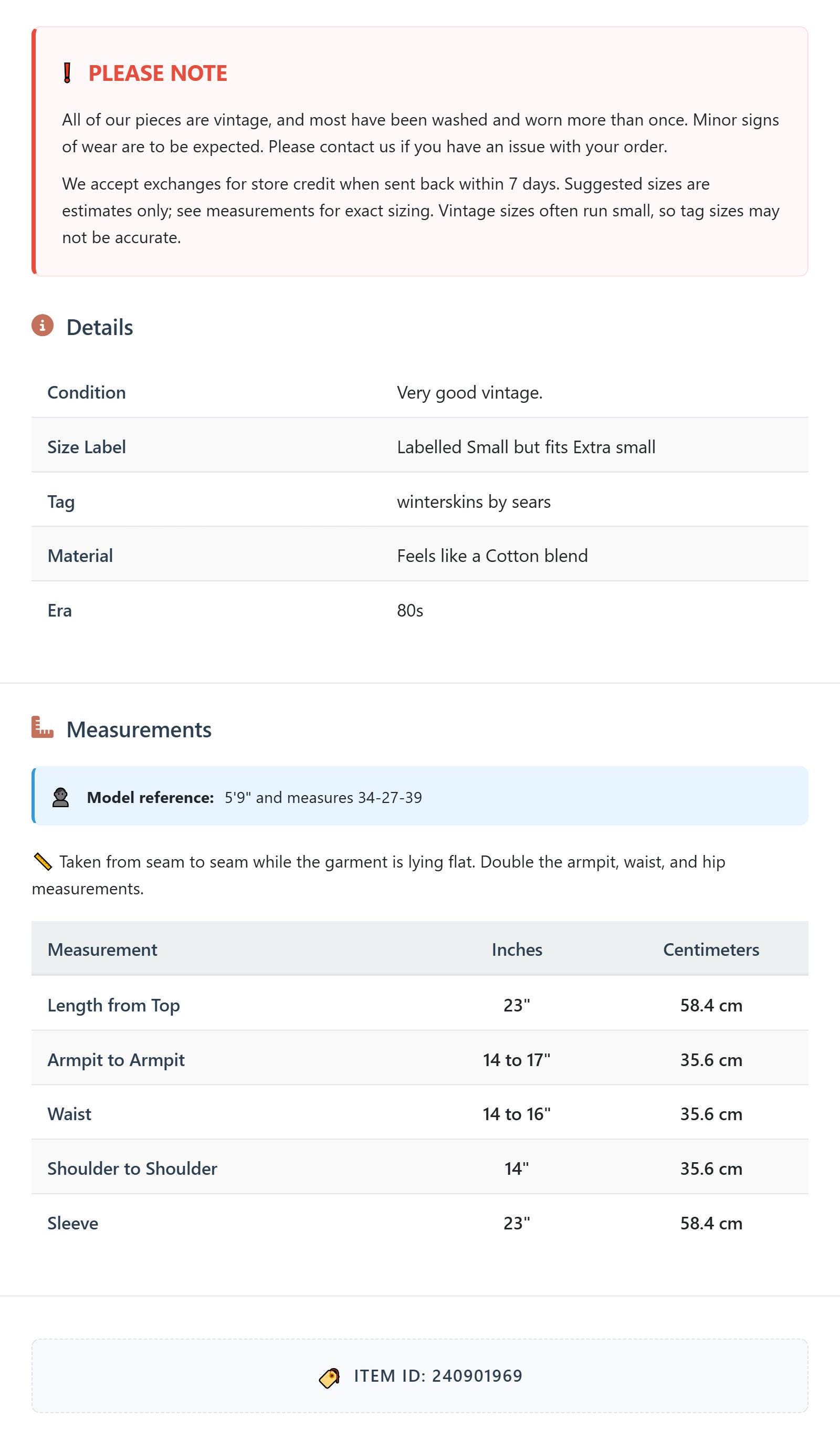 All of our pieces are vintage, and most have been washed and worn more than once. Minor signs of wear are to be expected. Please contact us if you have an issue with your order. We accept exchanges for store credit when sent back within 7 days.