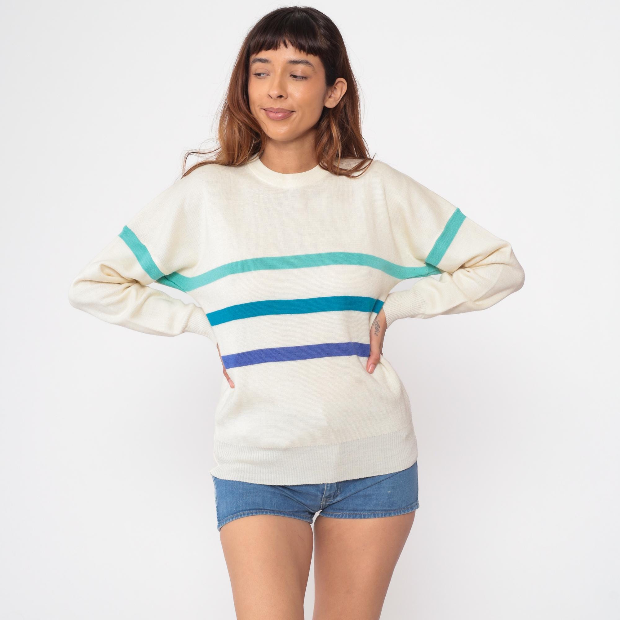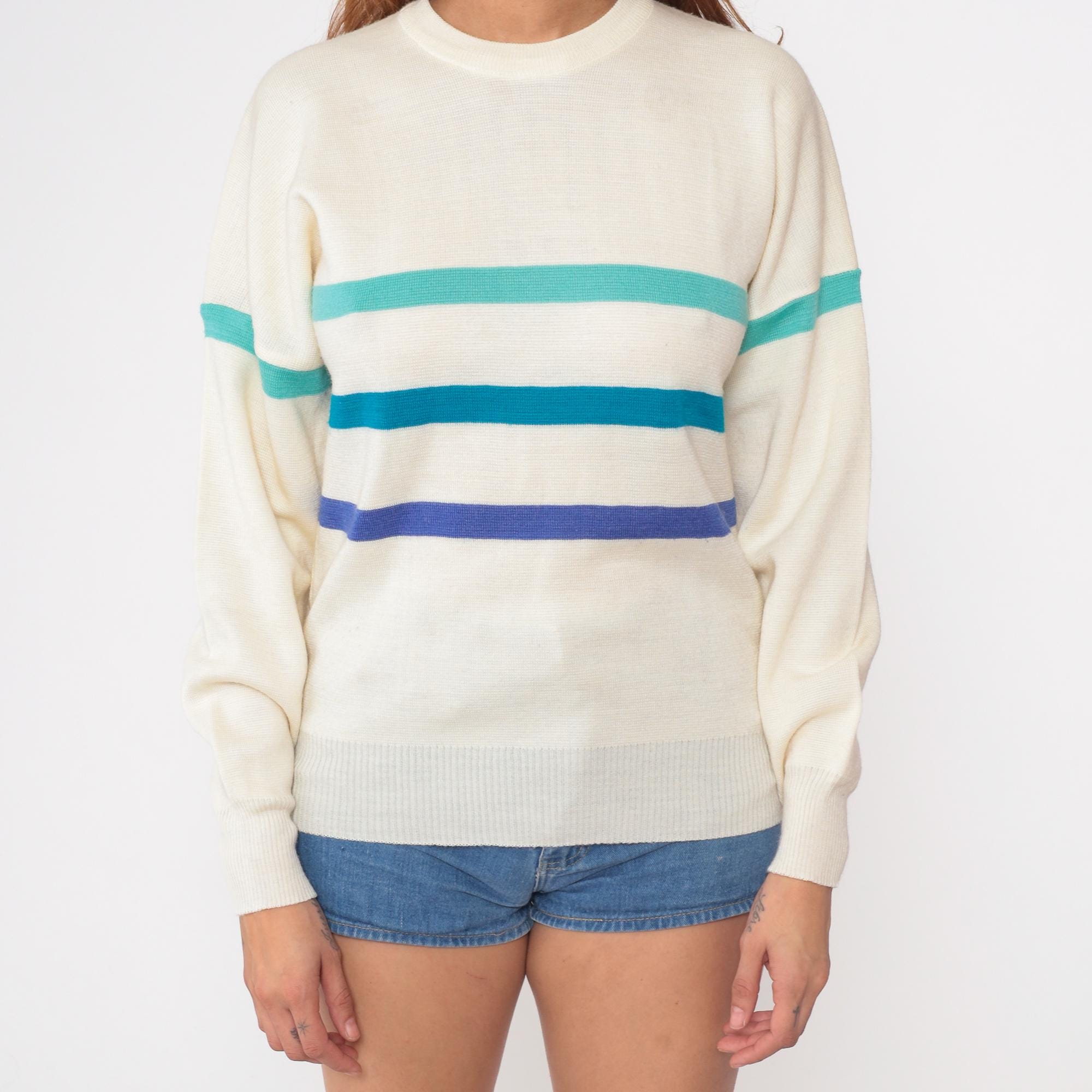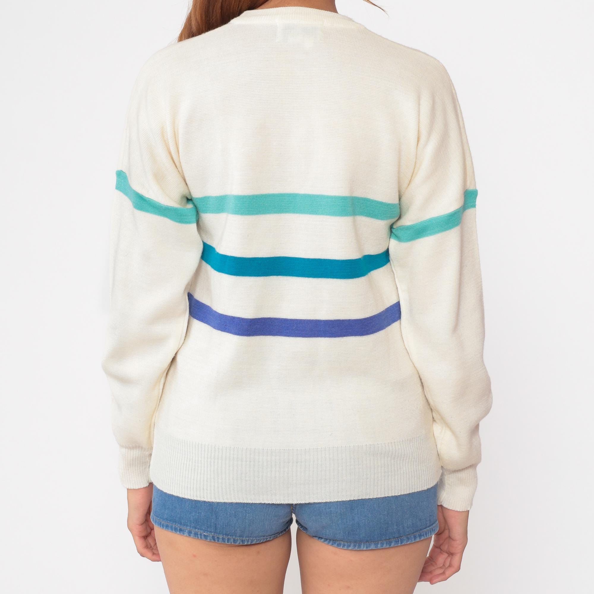 Vintage 1980s Mount Cervin ski sweater with horizontal stripes in mint, turquoise, and navy blue on an ivory background. Features a classic crewneck and ribbed cuffs and hem.
