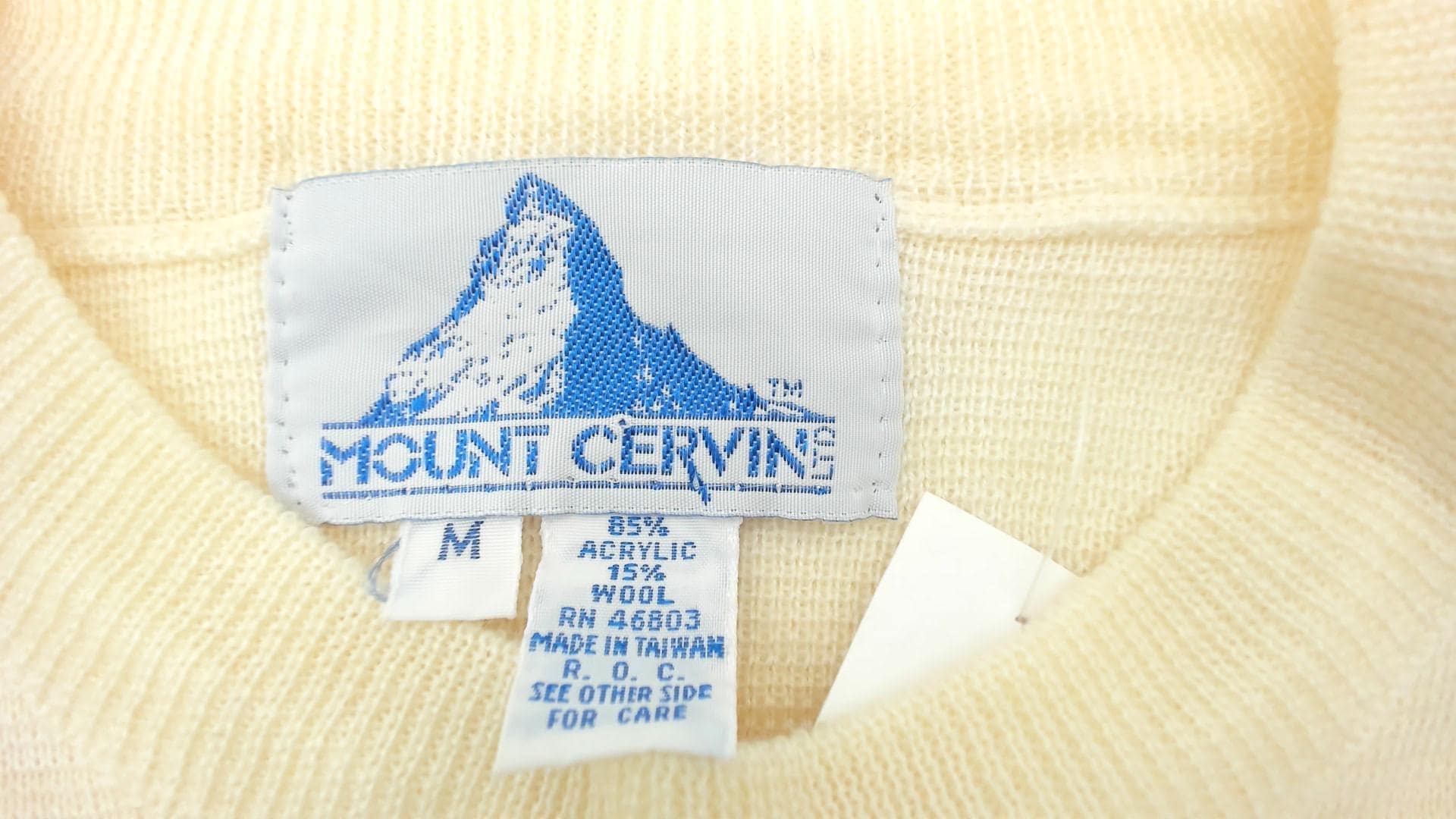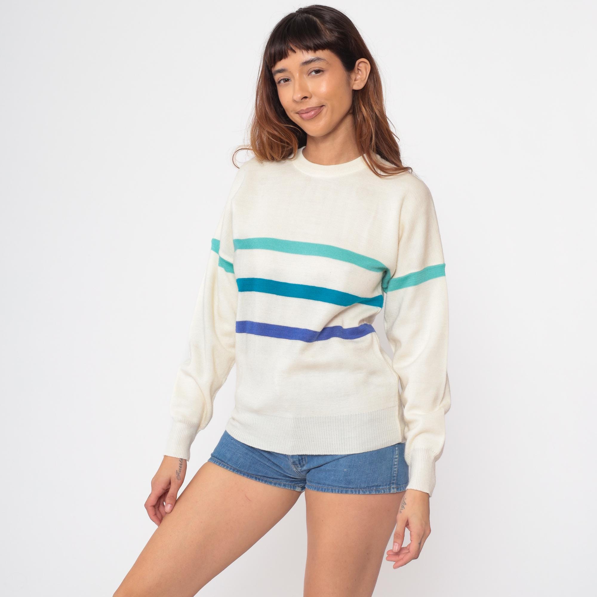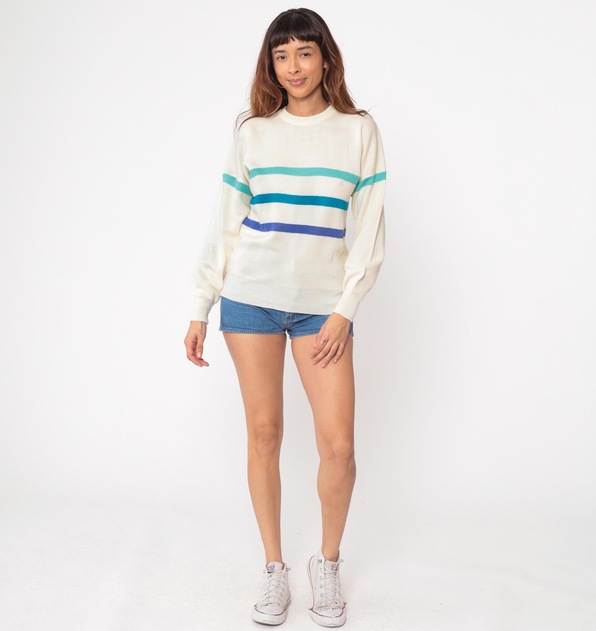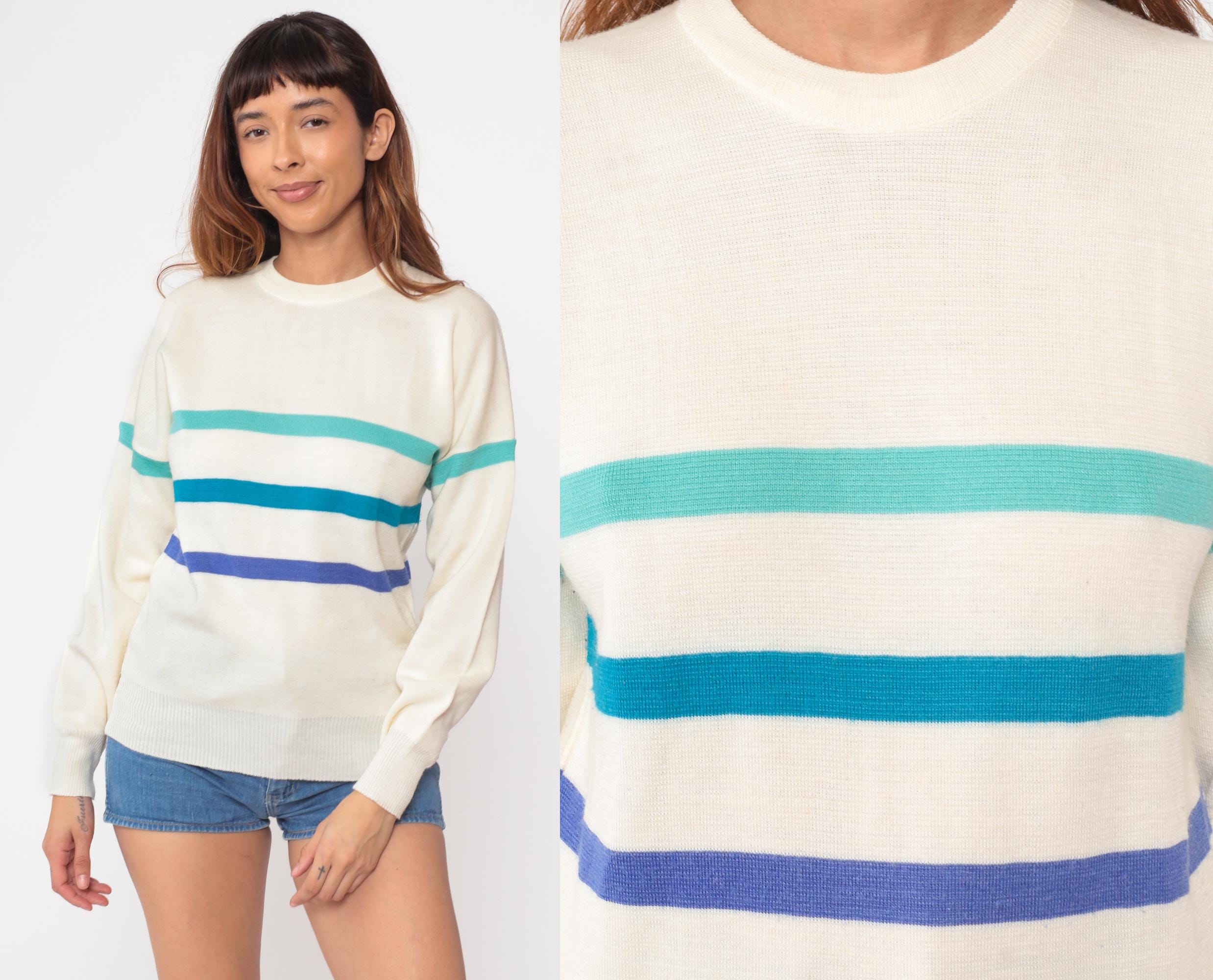 Vintage 1980s Mount Cervin ski sweater with horizontal stripes in mint, turquoise, and navy blue on an ivory background. Features a classic crewneck and ribbed cuffs and hem.
