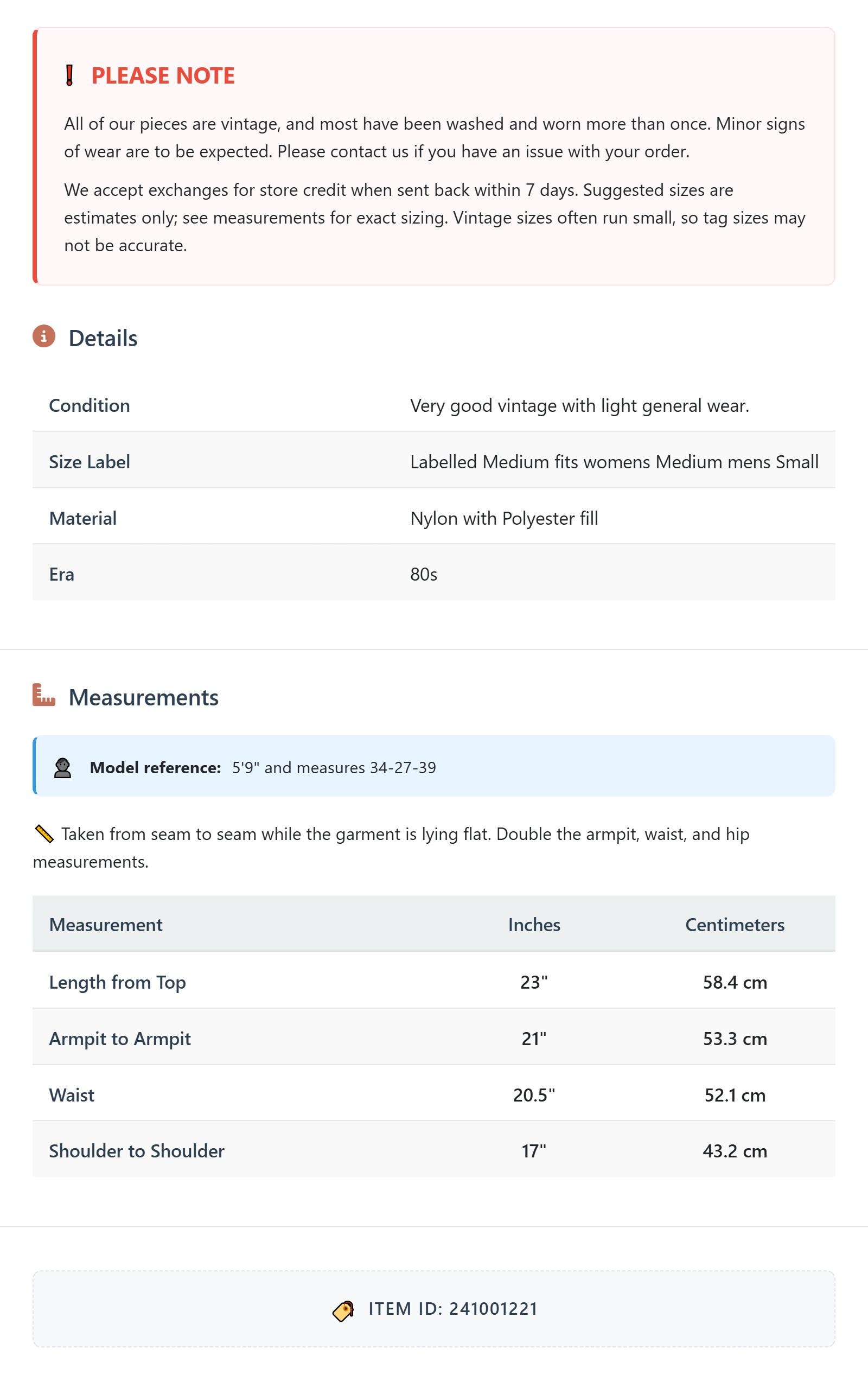 Suggested sizes are estimates only; see measurements for exact sizing. Vintage sizes often run small, so tag sizes may not be accurate.