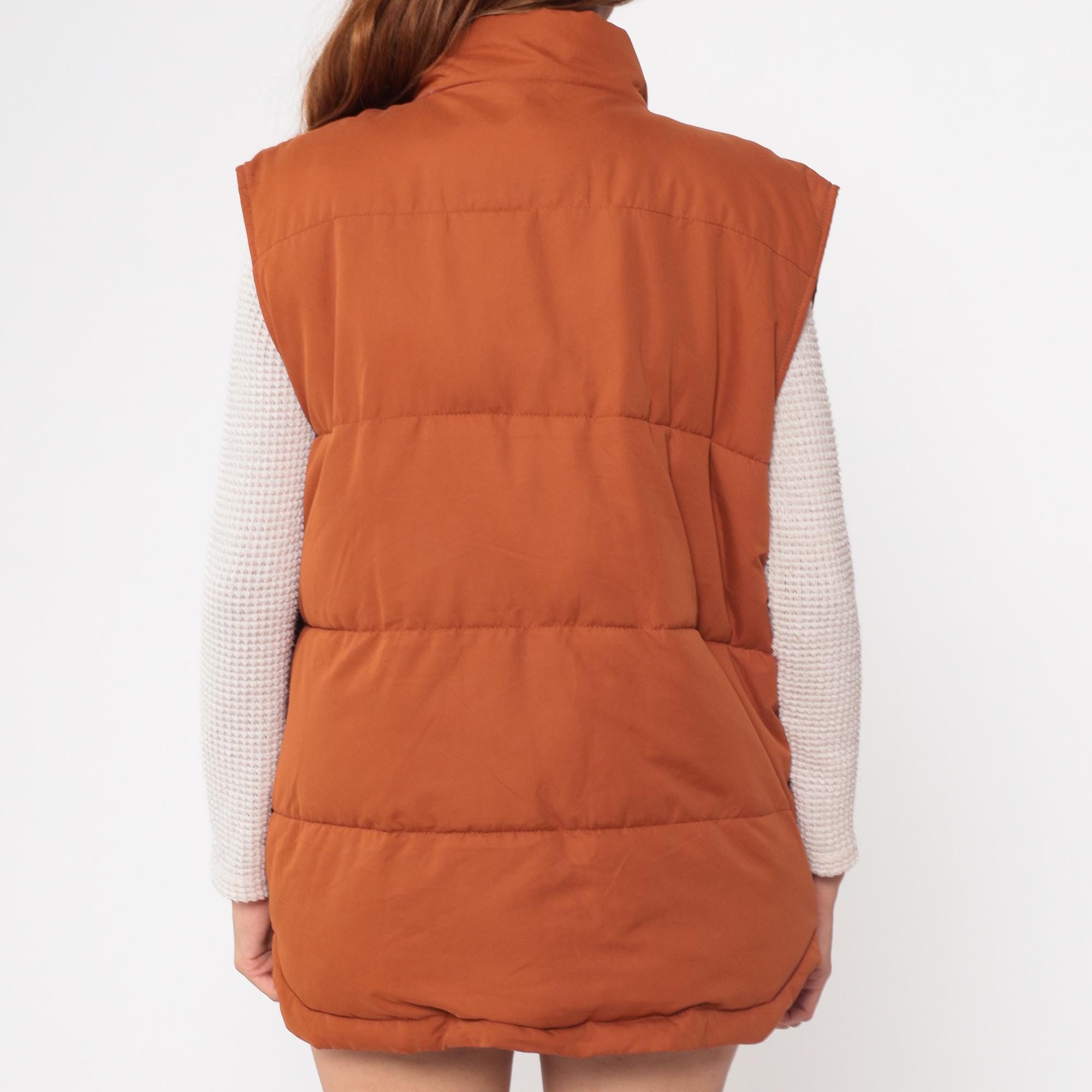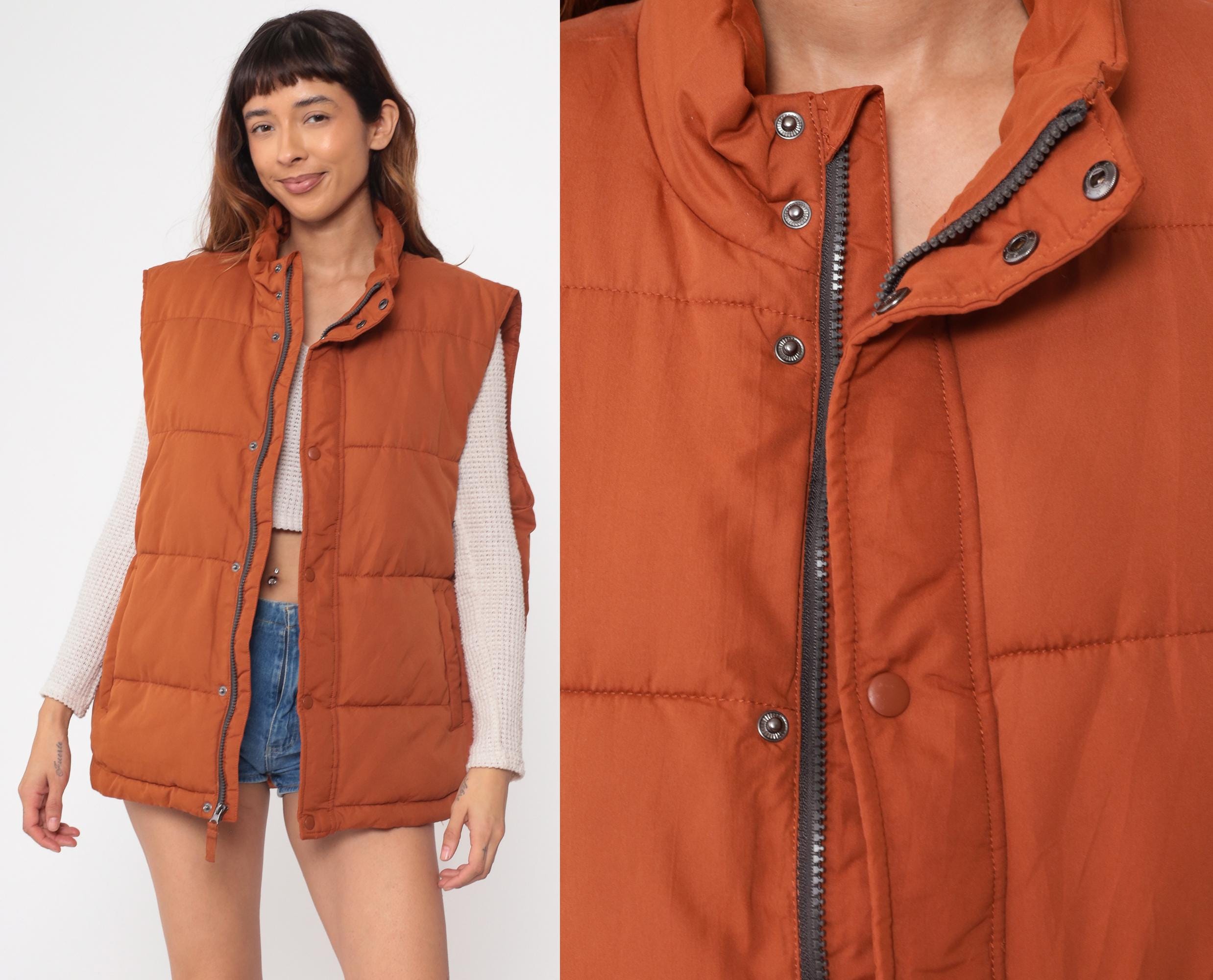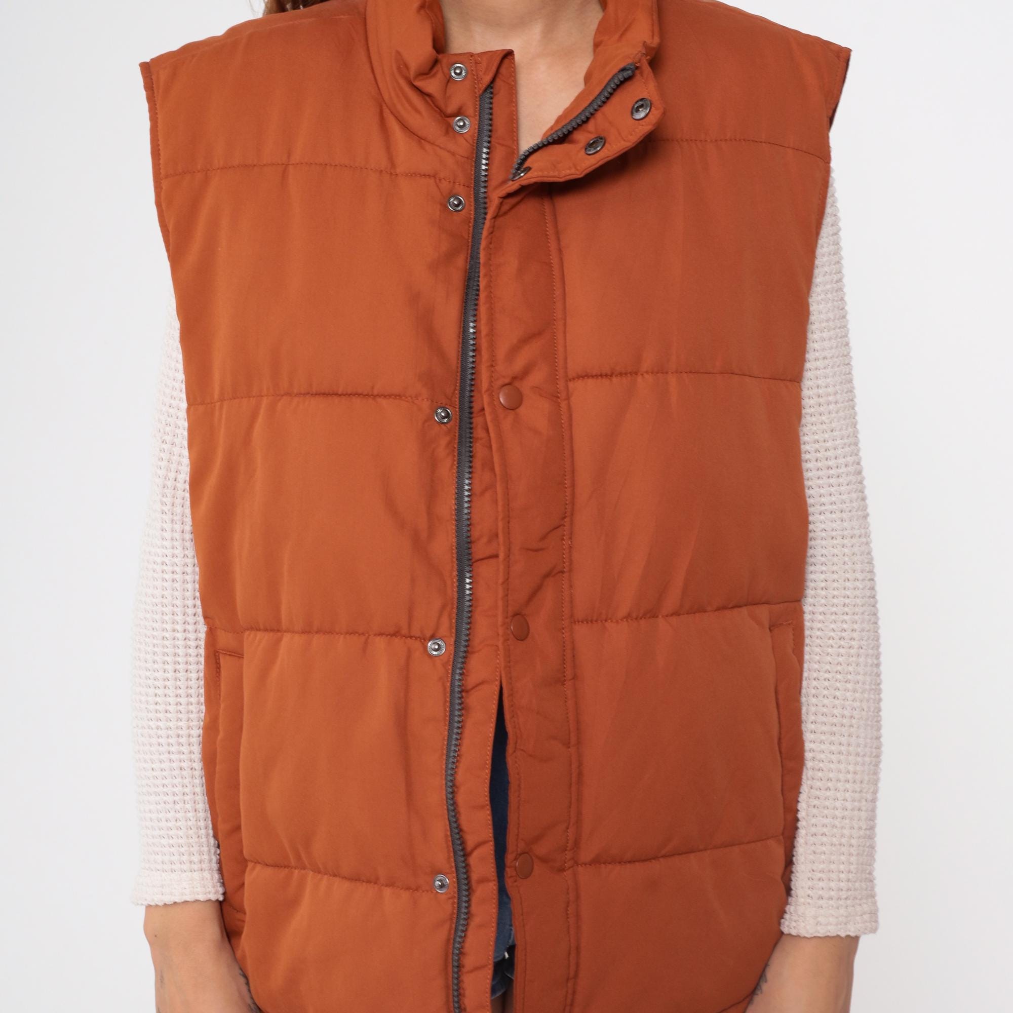 Vintage Y2K St Johns Bay puffer vest in burnt orange. Features quilted design, zip front with snap closure, and stand-up collar.