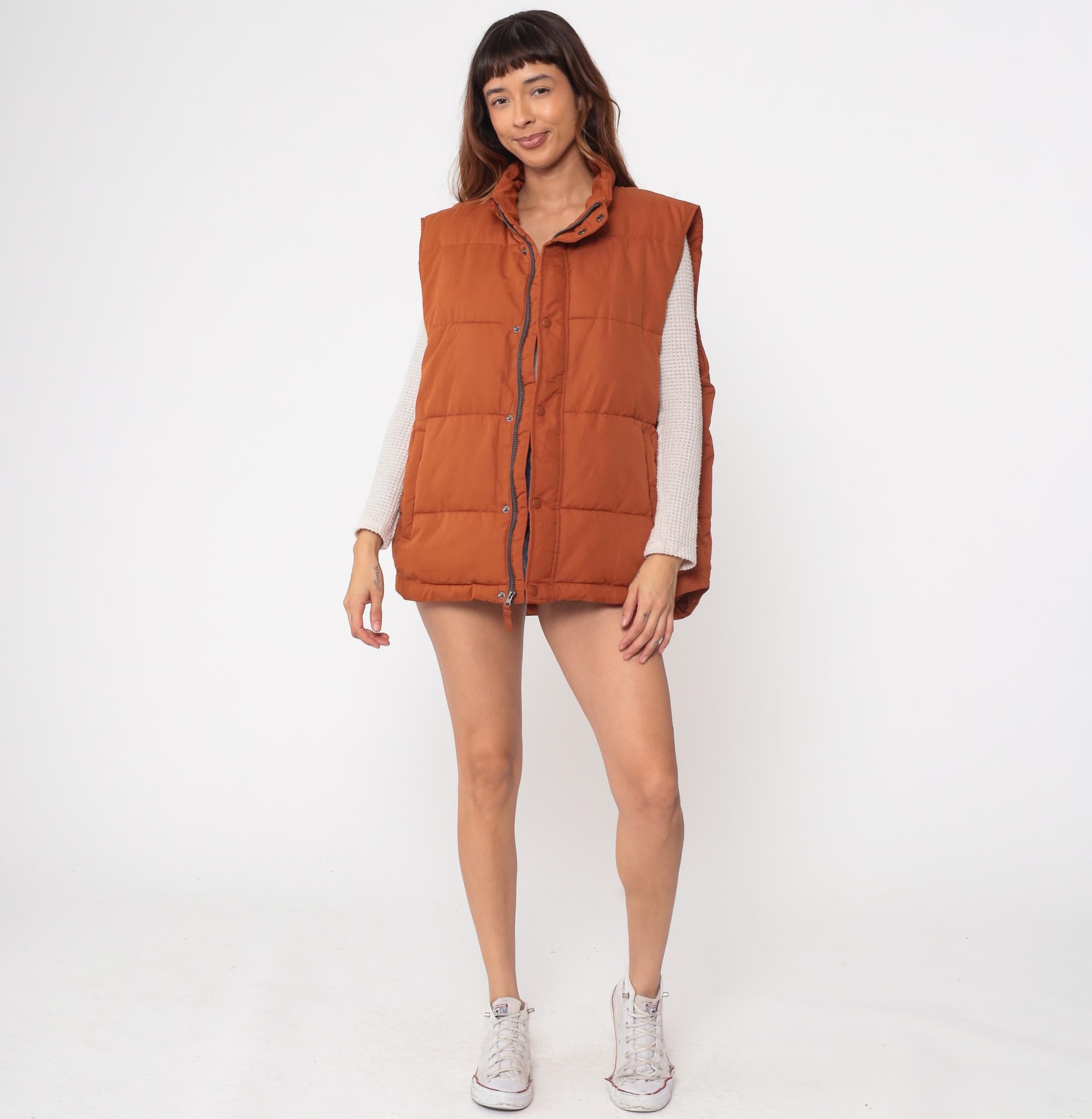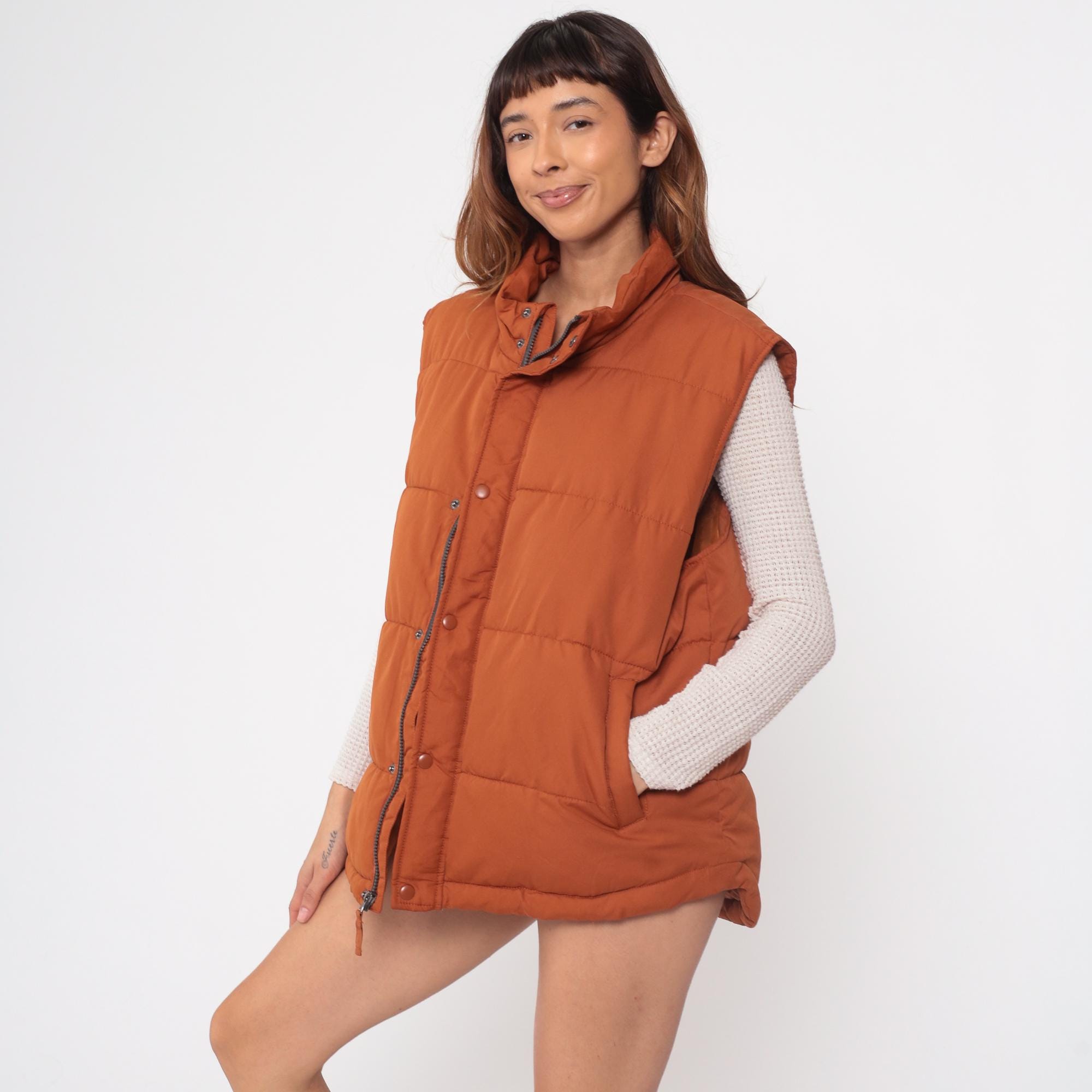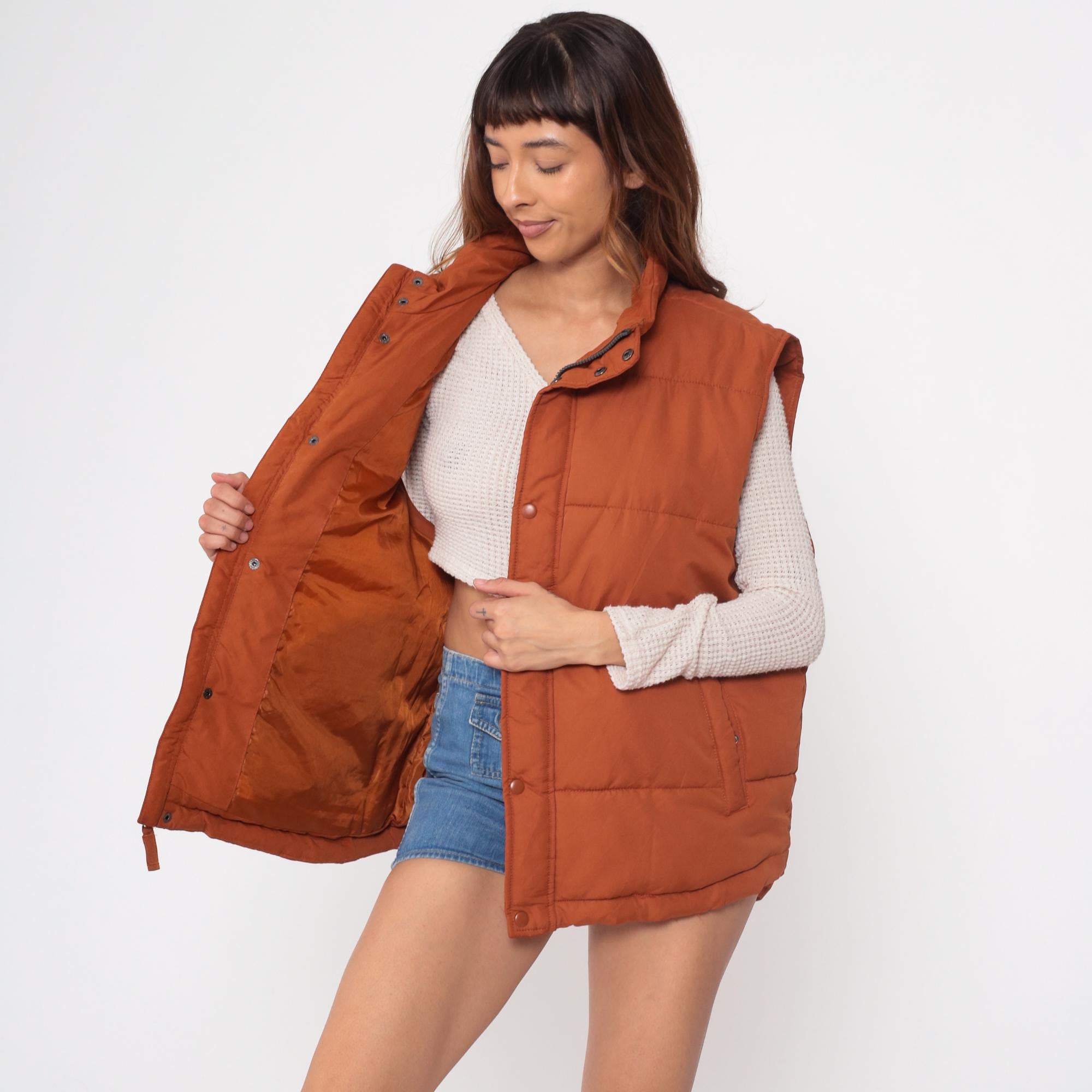 Vintage Y2K St Johns Bay puffer vest in burnt orange. Features quilted design, zip front with snap closure, and stand-up collar.
