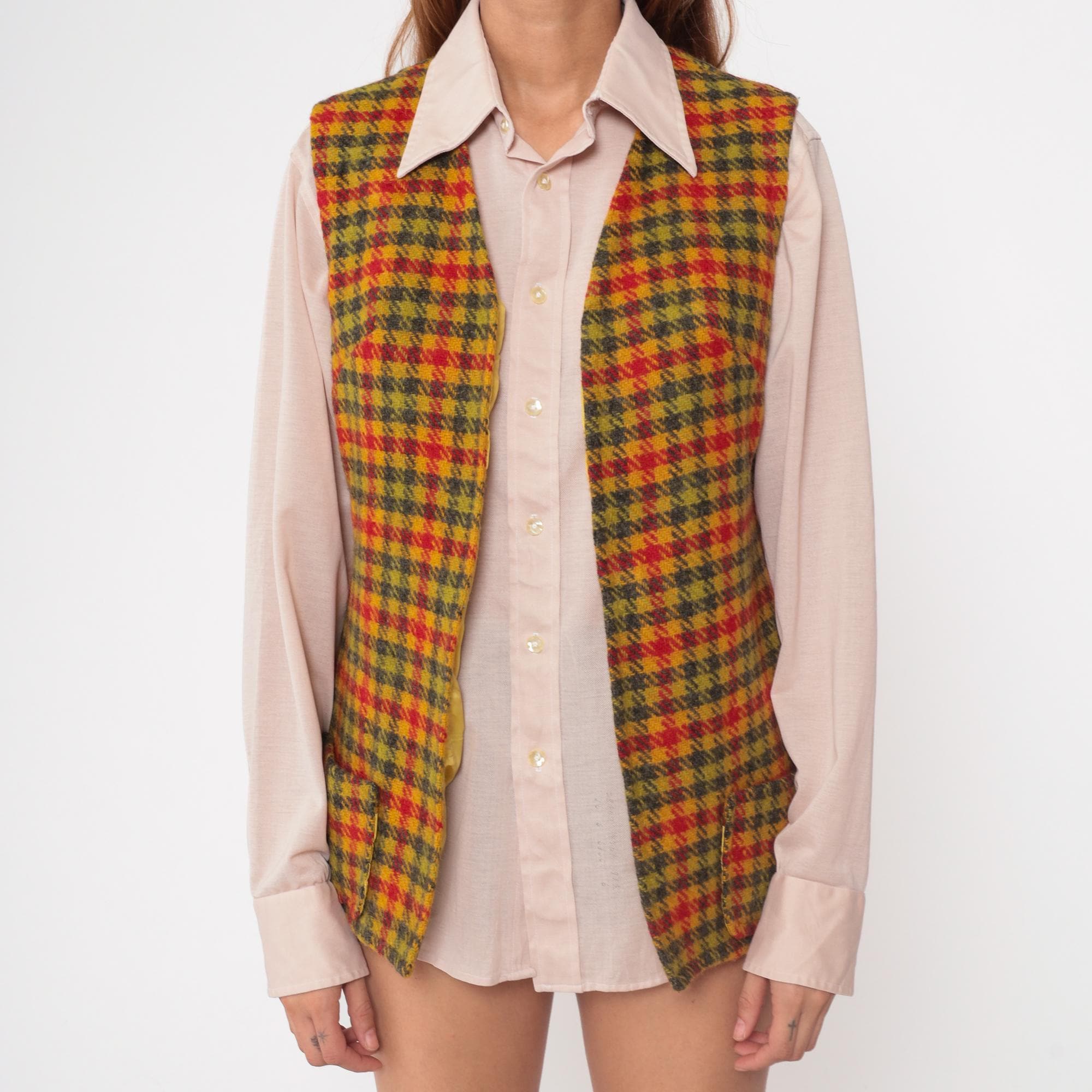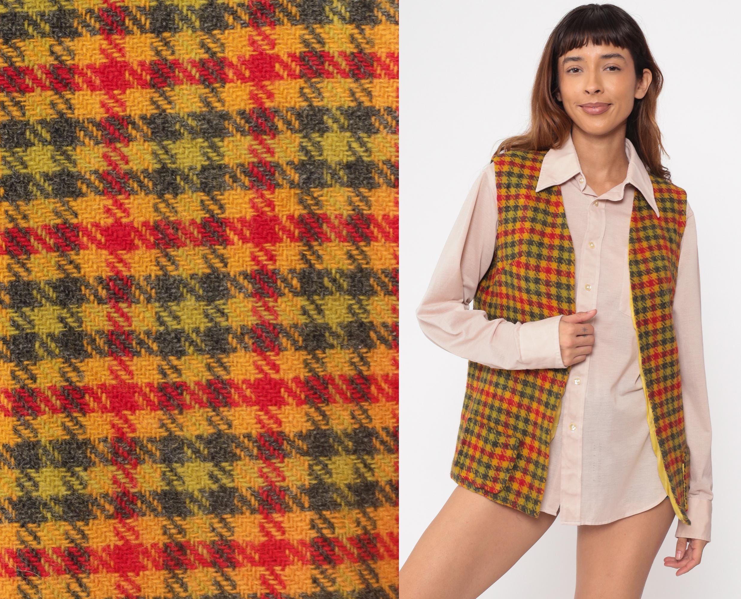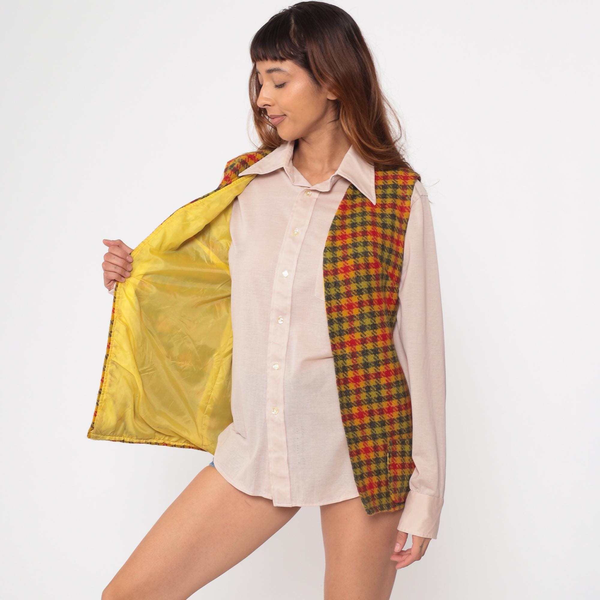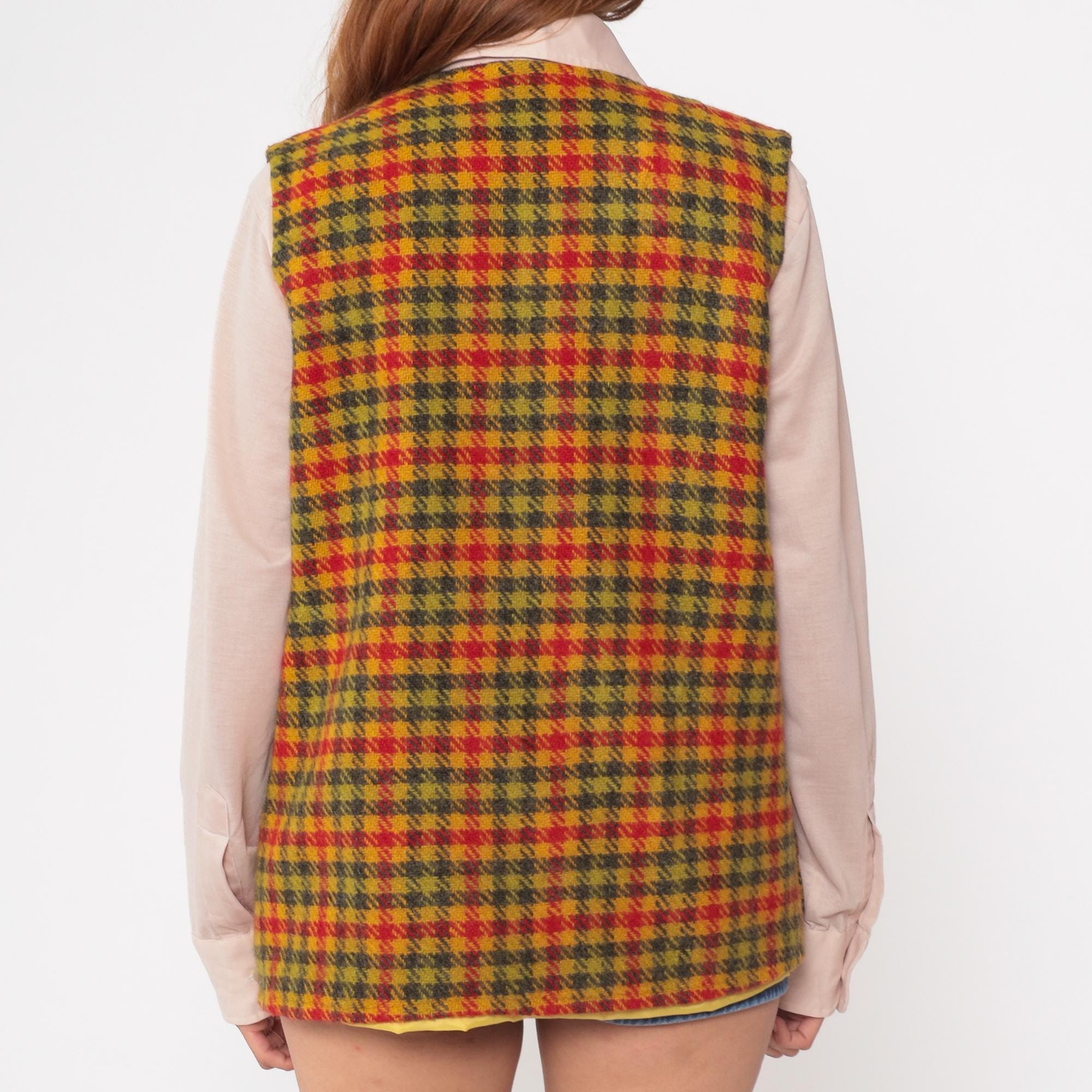 Vintage 1970s plaid wool blend vest in mustard yellow, red, and dark green check pattern. Classic collegiate style with straight cut and side slits.