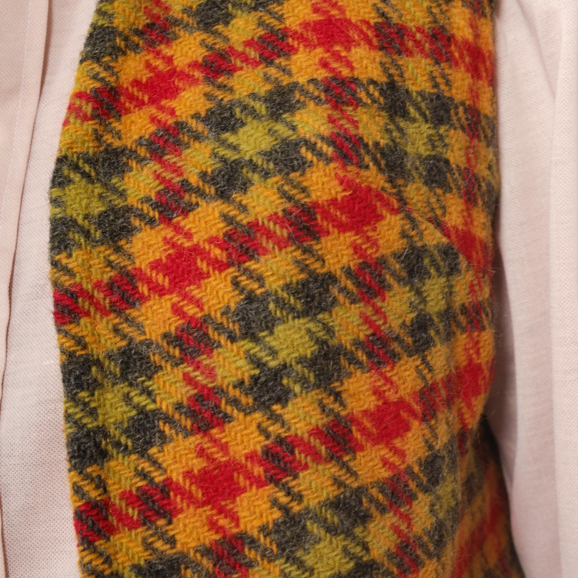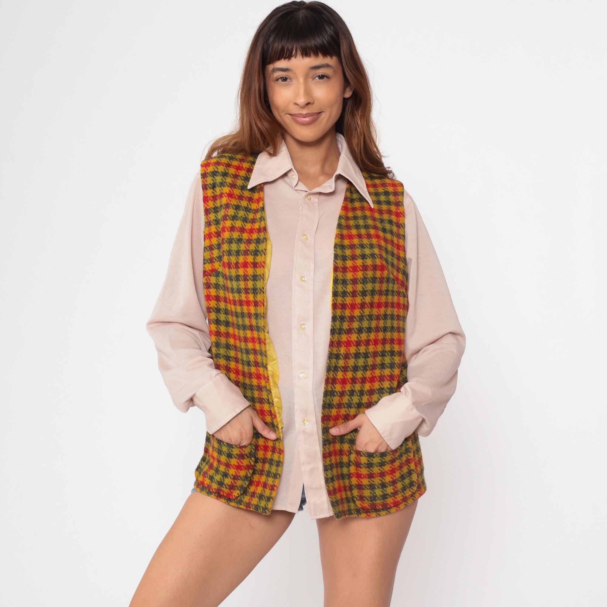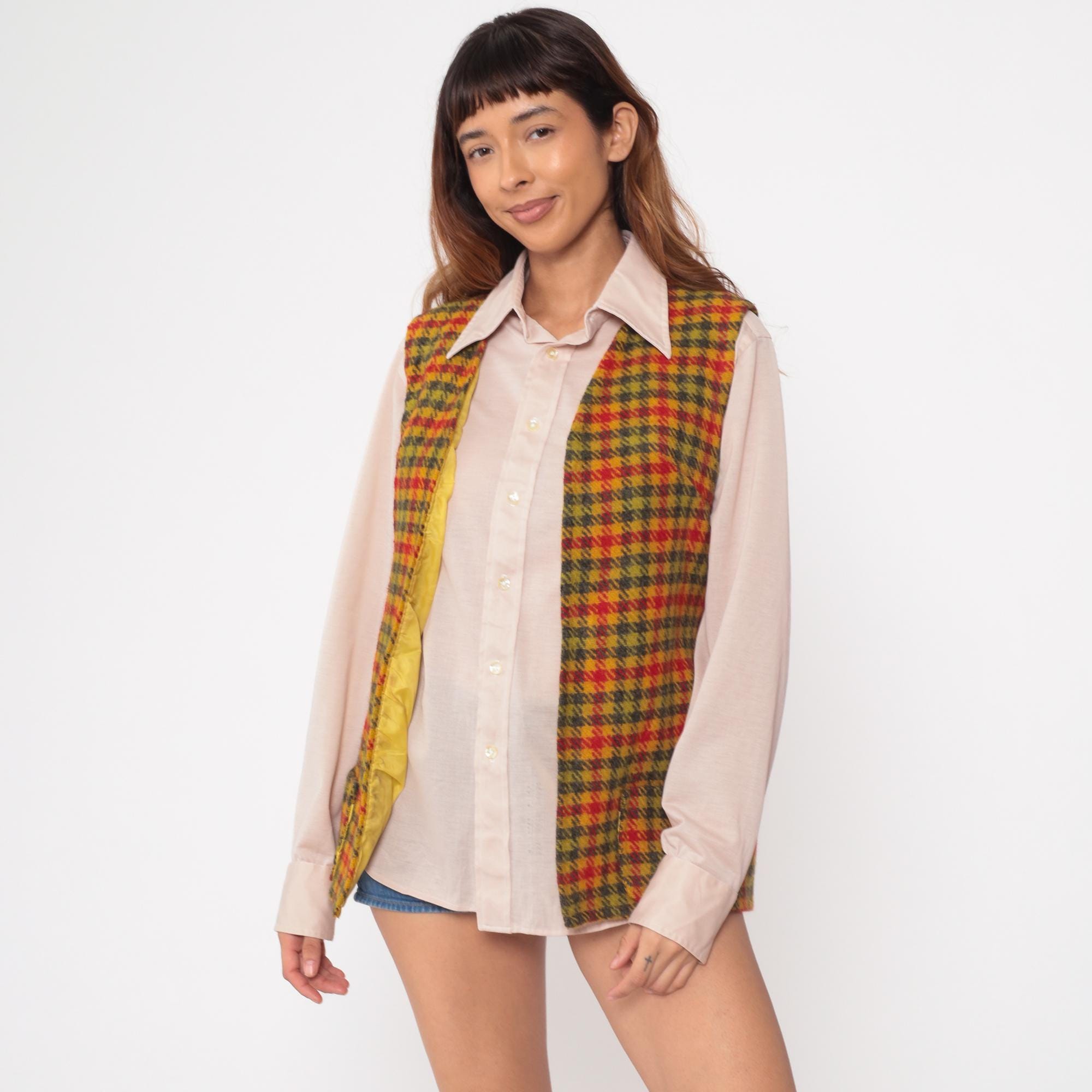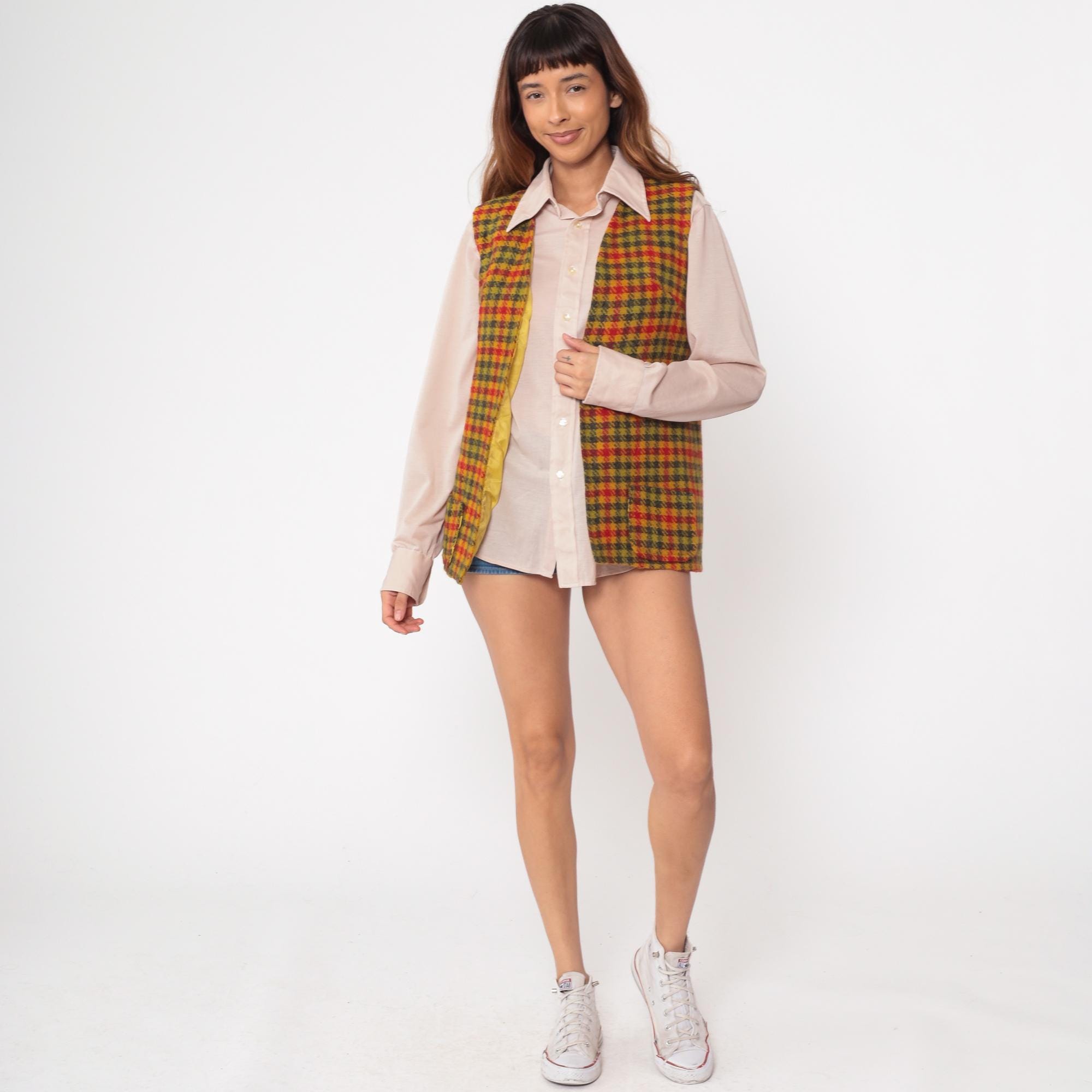 Vintage 1970s plaid wool blend vest in mustard yellow, red, and dark green check pattern. Classic collegiate style with straight cut and side slits.