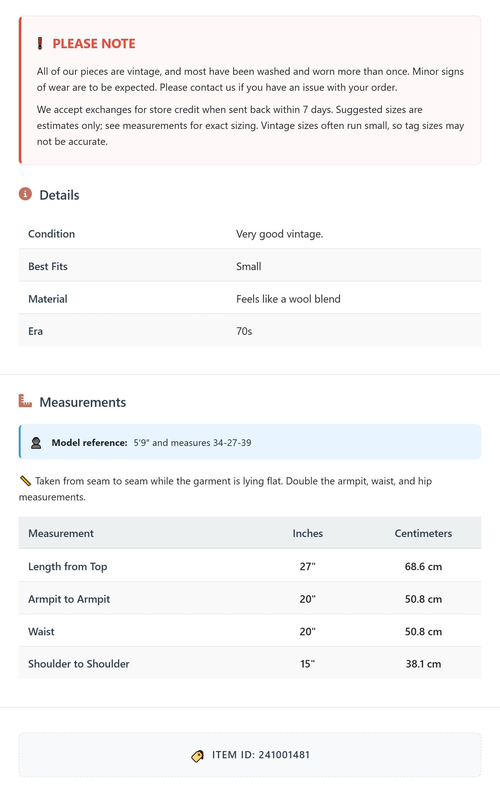 Suggested sizes are estimates only; see measurements for exact sizing. Vintage sizes often run small, so tag sizes may not be accurate.