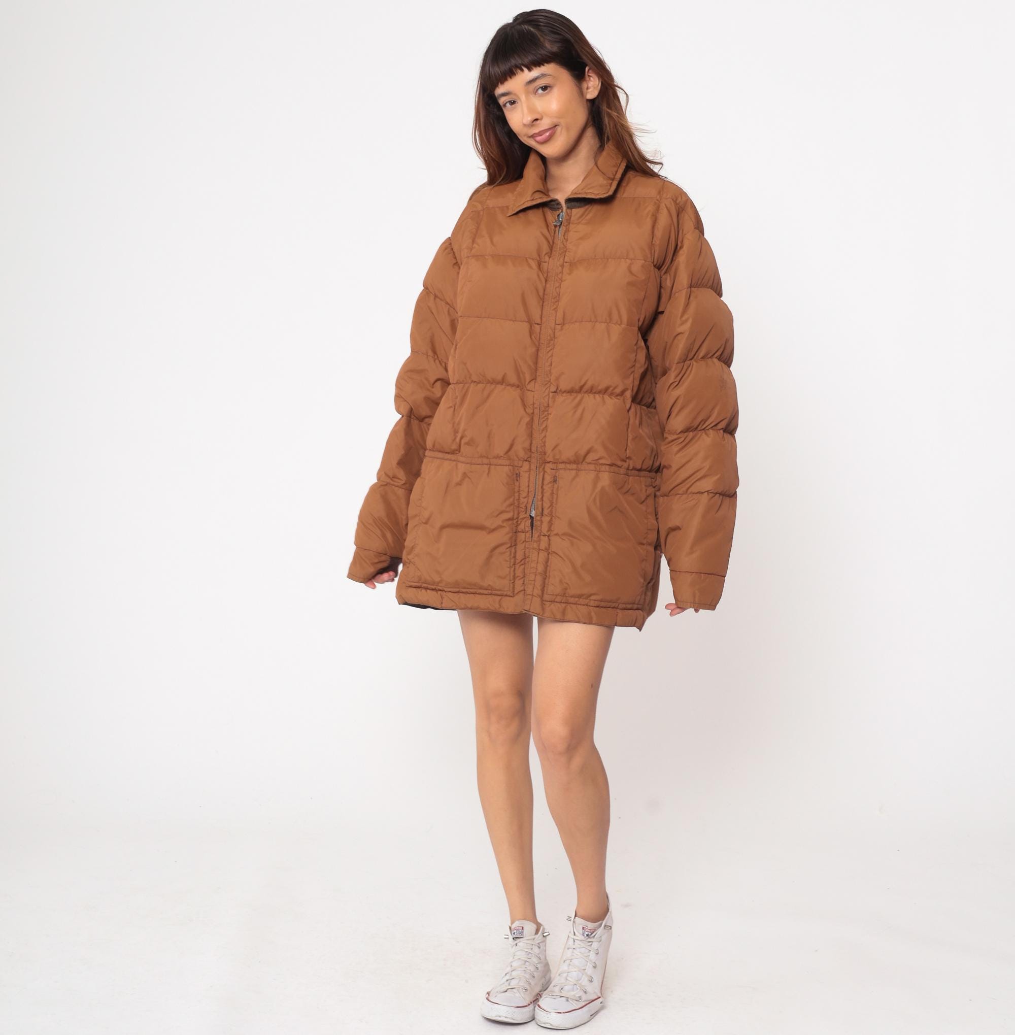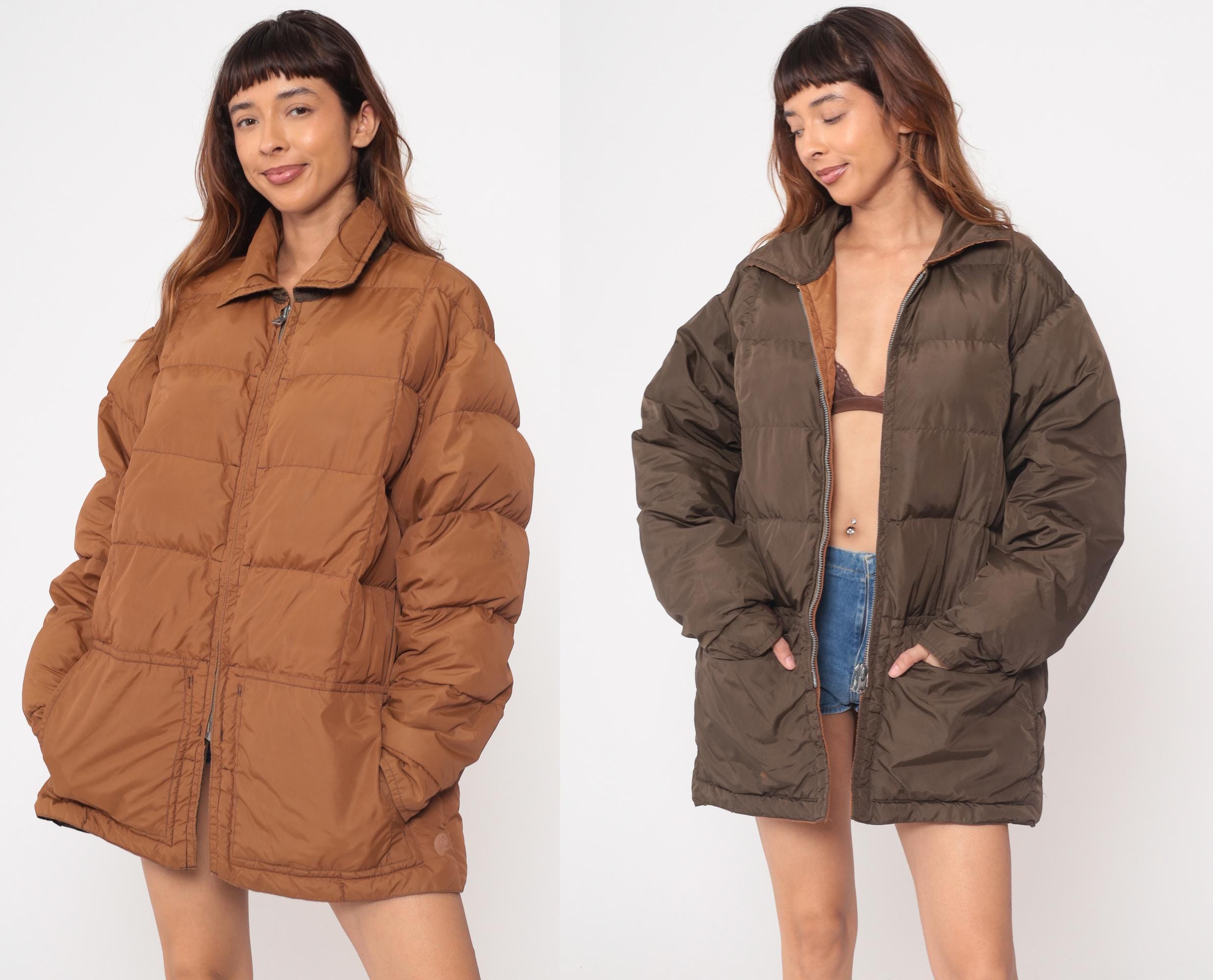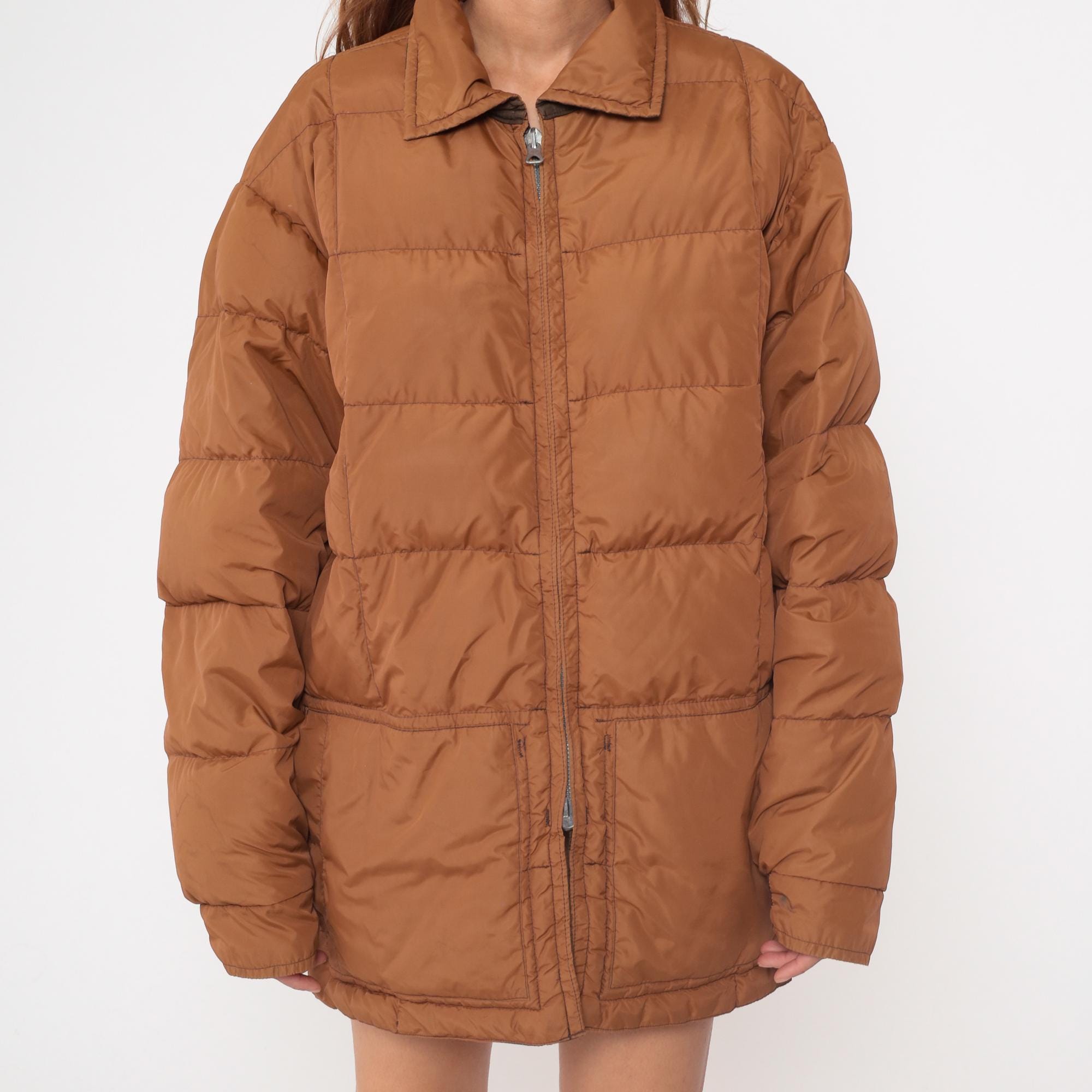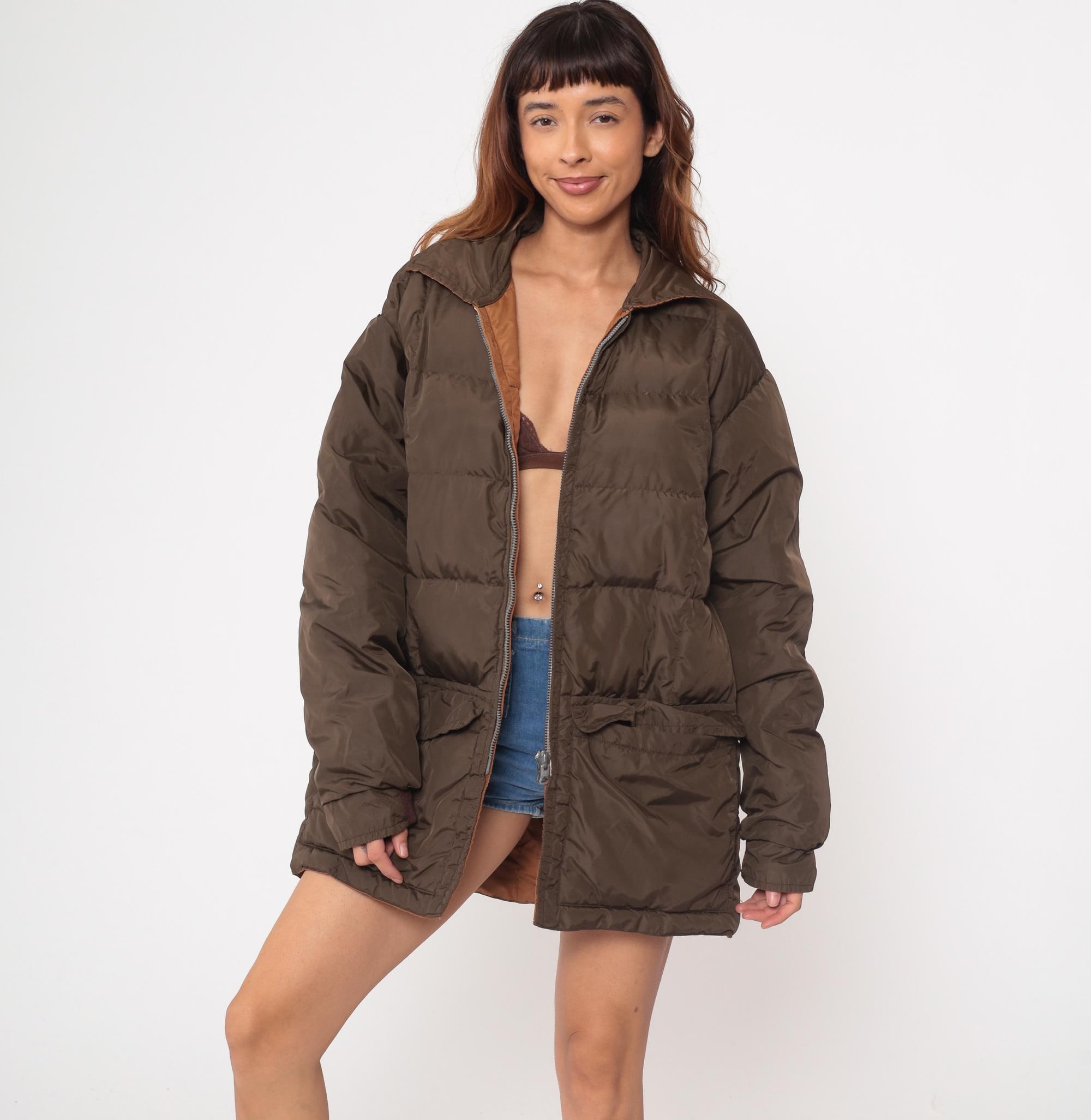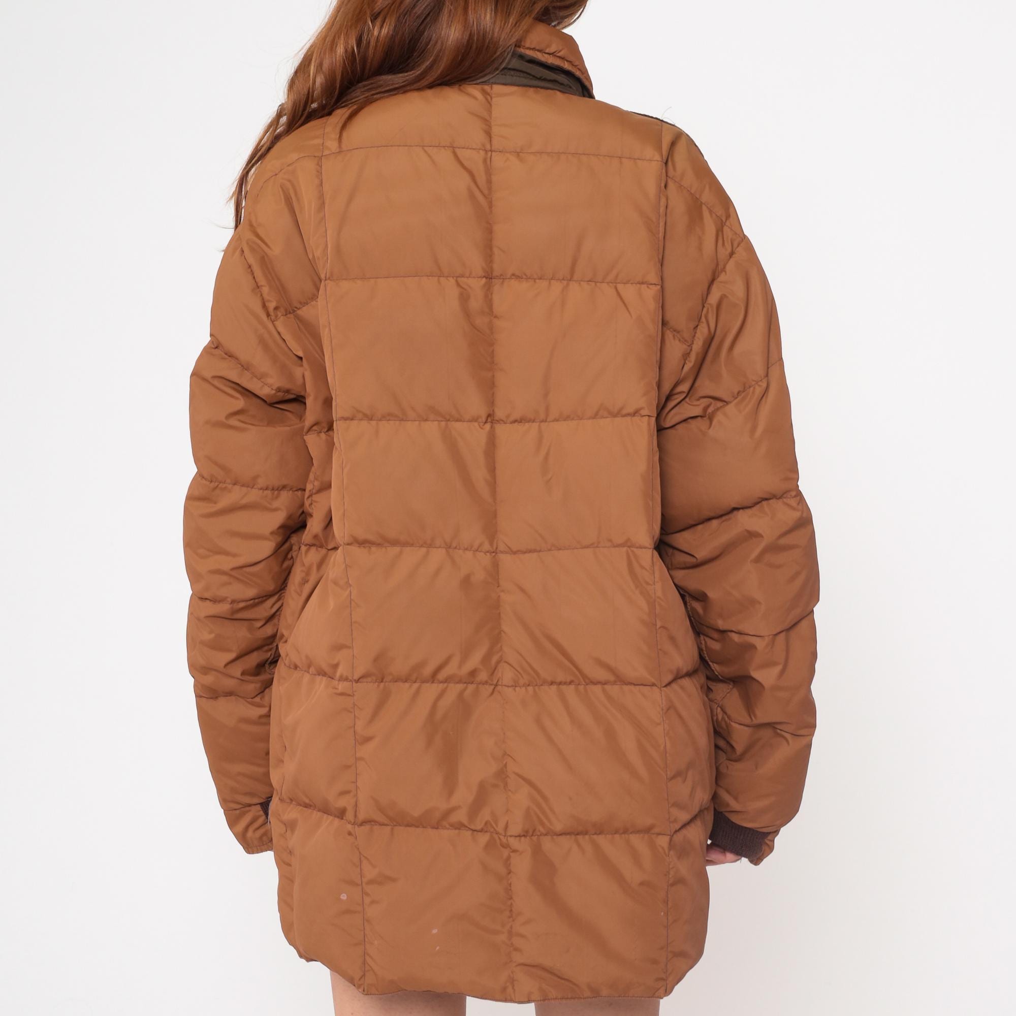 1980s reversible down puffer jacket by Comfy Seattle Quilt. Features caramel brown quilted nylon on one side and olive green quilted nylon on the reverse for two complete looks in one garment. Full zip front closure with fold-down collar. Classic horizontal quilted pattern with generous down fill for substantial warmth. Side zip pockets on both sides for functionality whichever way you wear it. Elastic cuffs and straight hem for a relaxed fit.