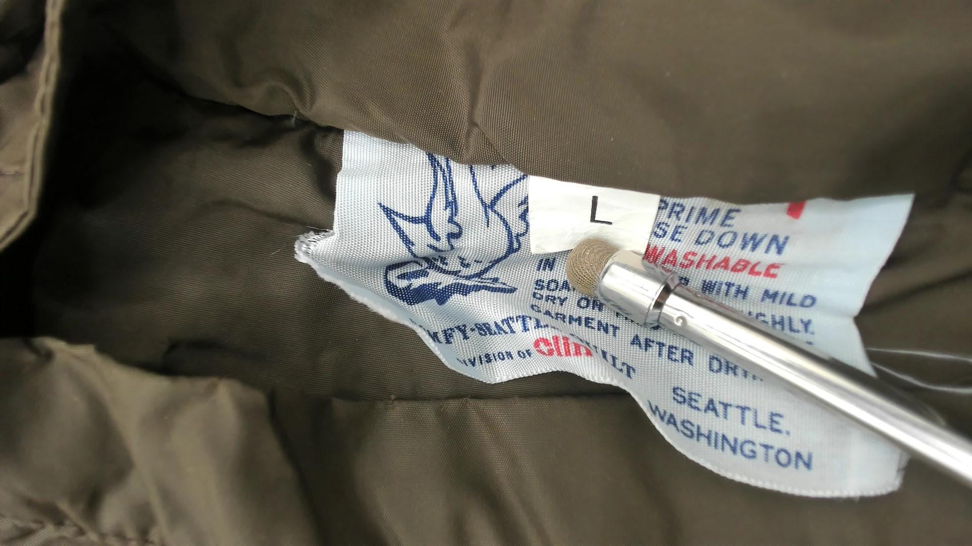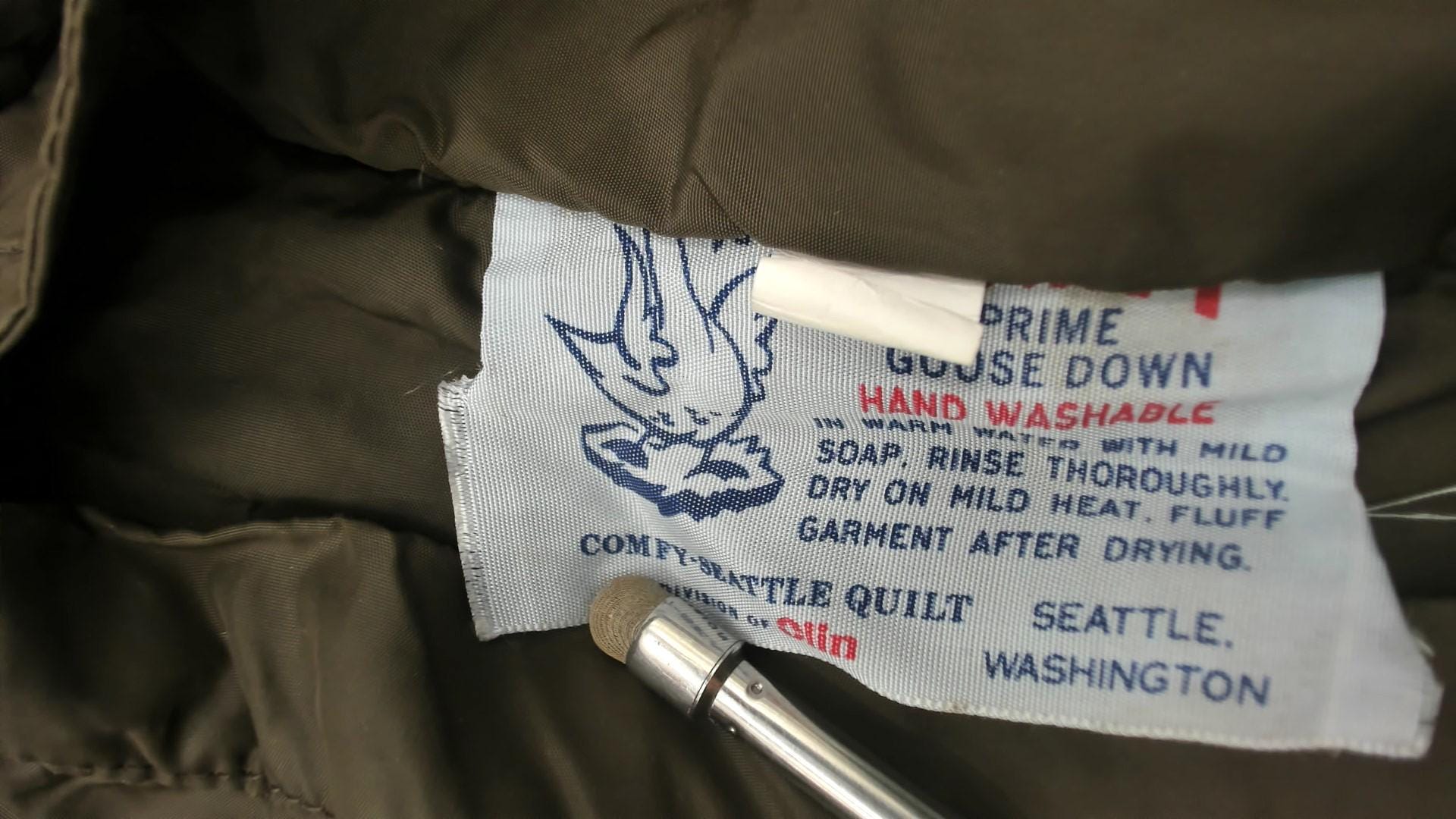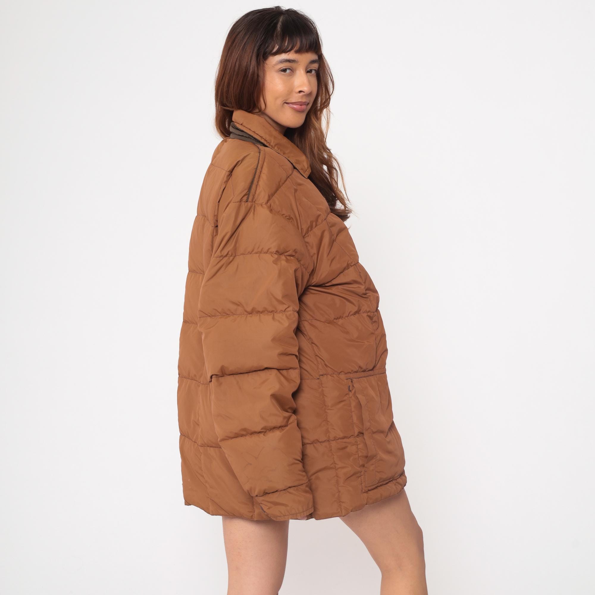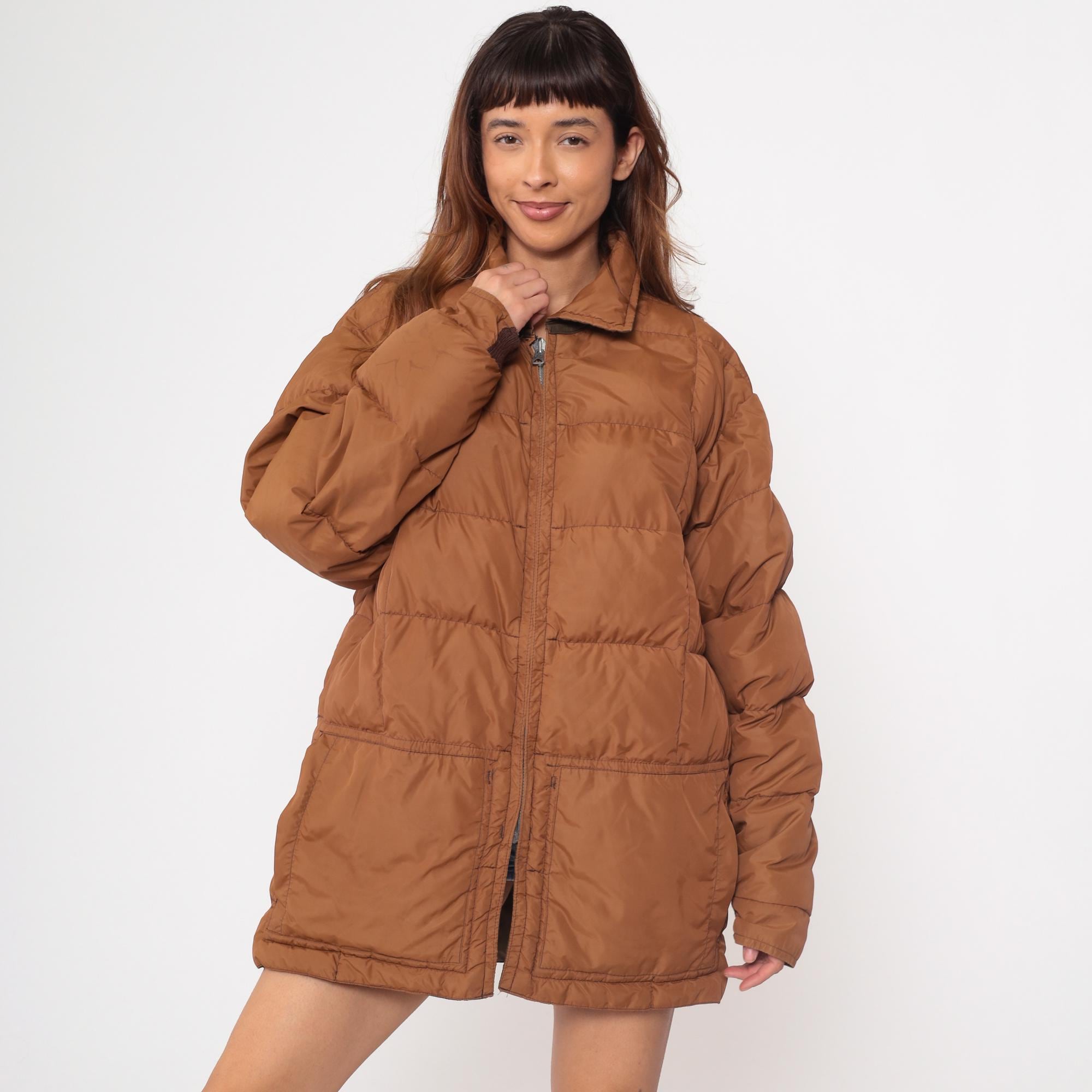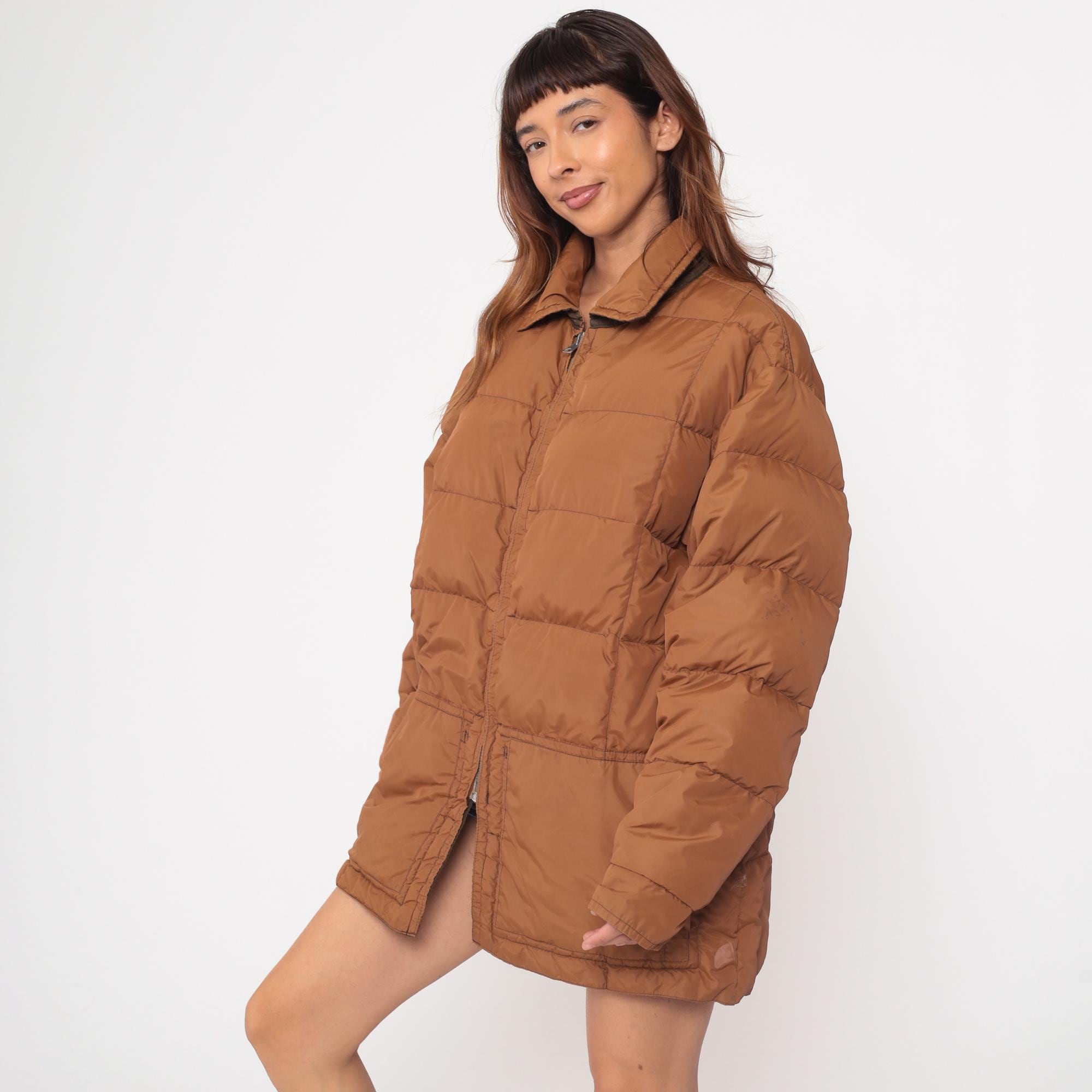1980s reversible down puffer jacket by Comfy Seattle Quilt. Features caramel brown quilted nylon on one side and olive green quilted nylon on the reverse for two complete looks in one garment. Full zip front closure with fold-down collar. Classic horizontal quilted pattern with generous down fill for substantial warmth. Side zip pockets on both sides for functionality whichever way you wear it. Elastic cuffs and straight hem for a relaxed fit.