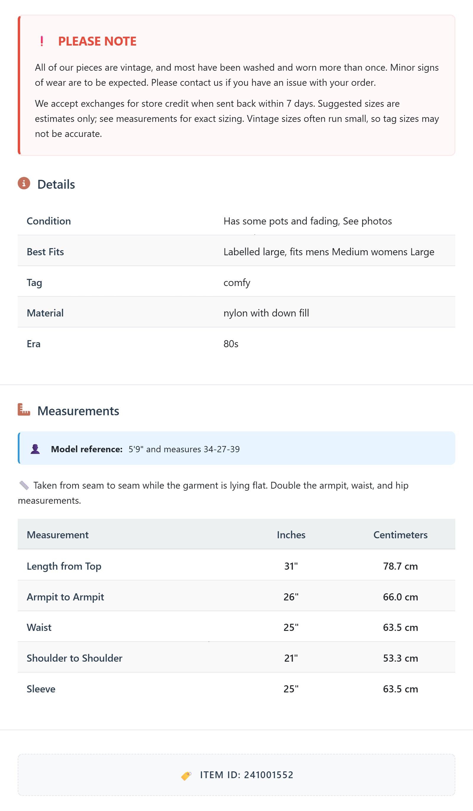 Suggested sizes are estimates only; see measurements for exact sizing. Vintage sizes often run small, so tag sizes may not be accurate.
