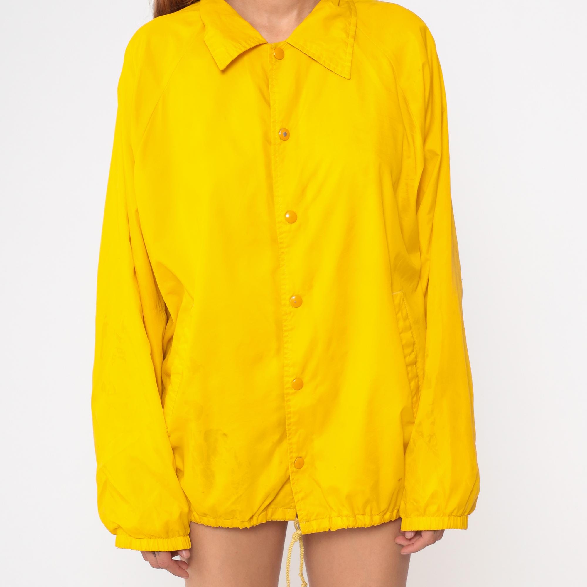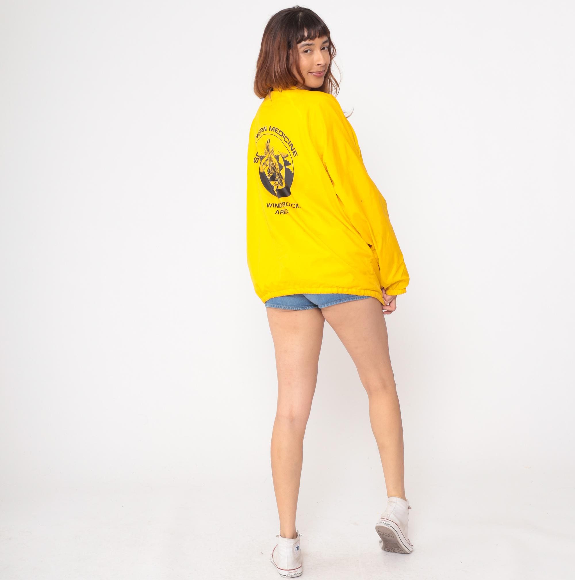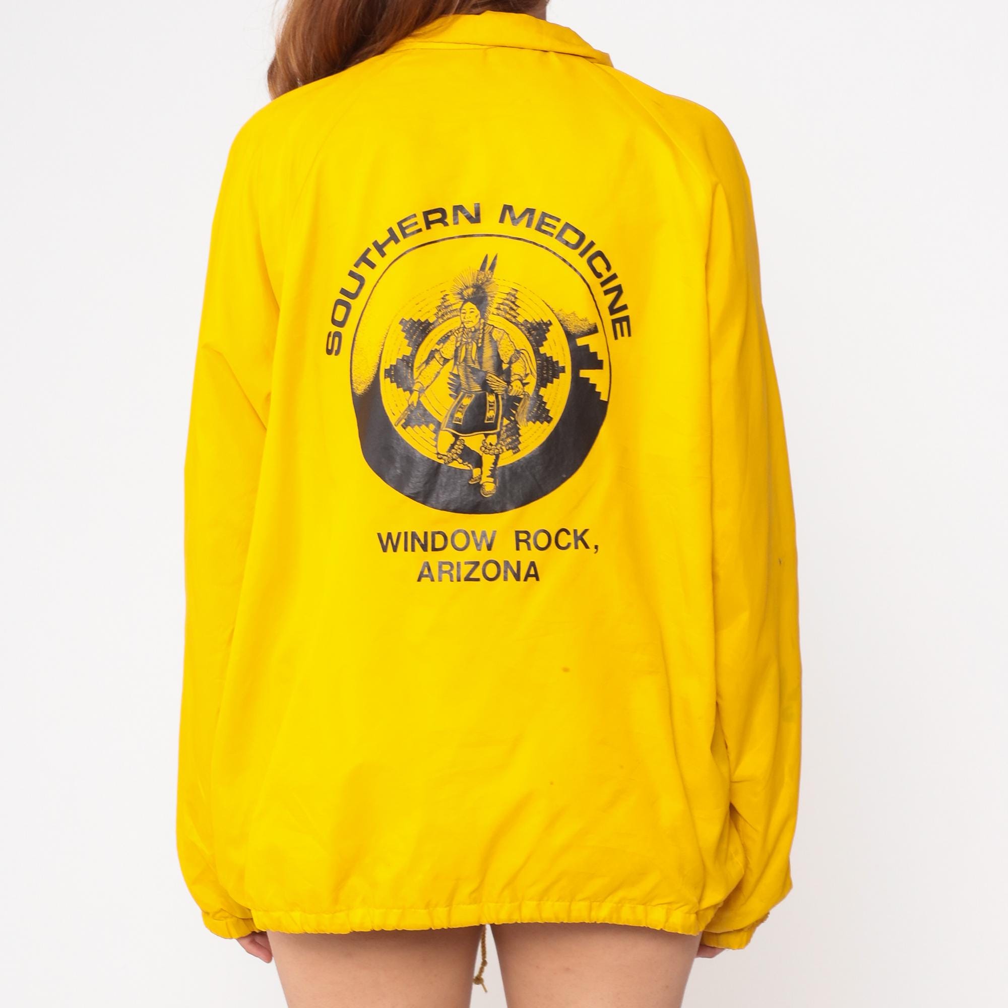 1980s Southern Medicine bright yellow windbreaker featuring a prominent Native American graphic on back. Official souvenir from Window Rock, Arizona with traditional Indigenous dancer illustration in black print. Button-front coach jacket style with classic pointed collar. Drawstring hem for adjustable fit.