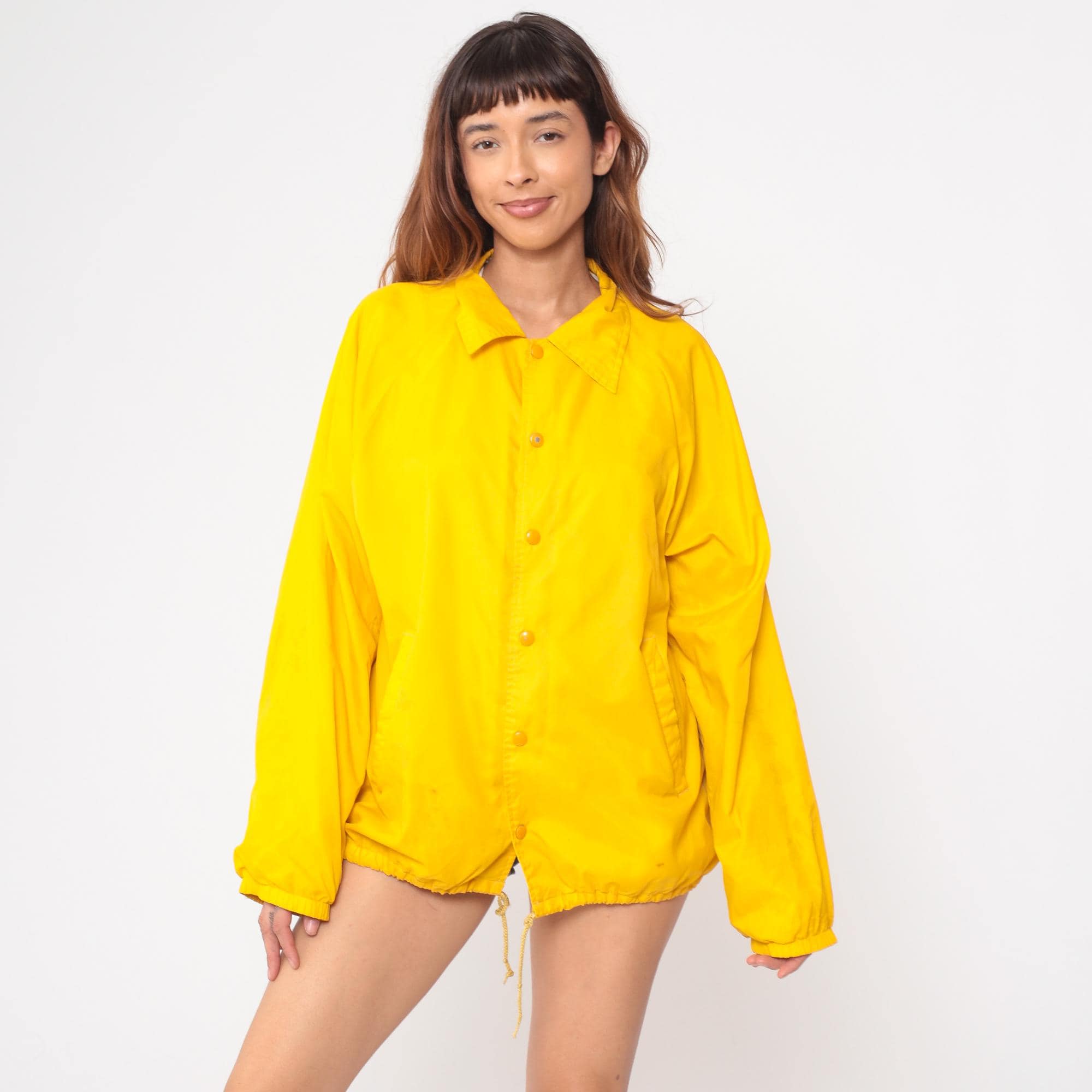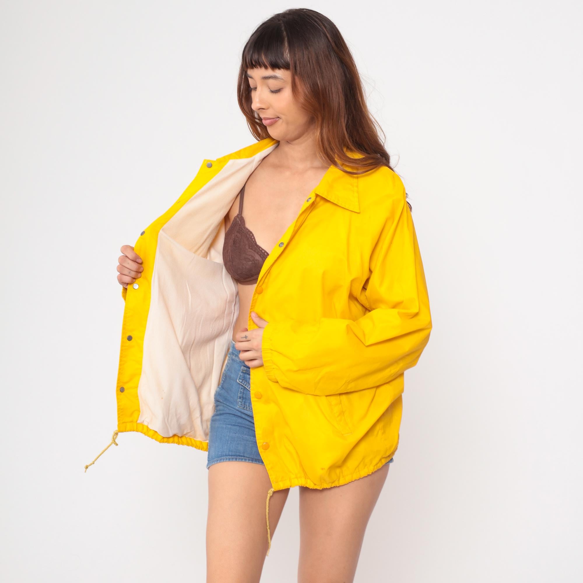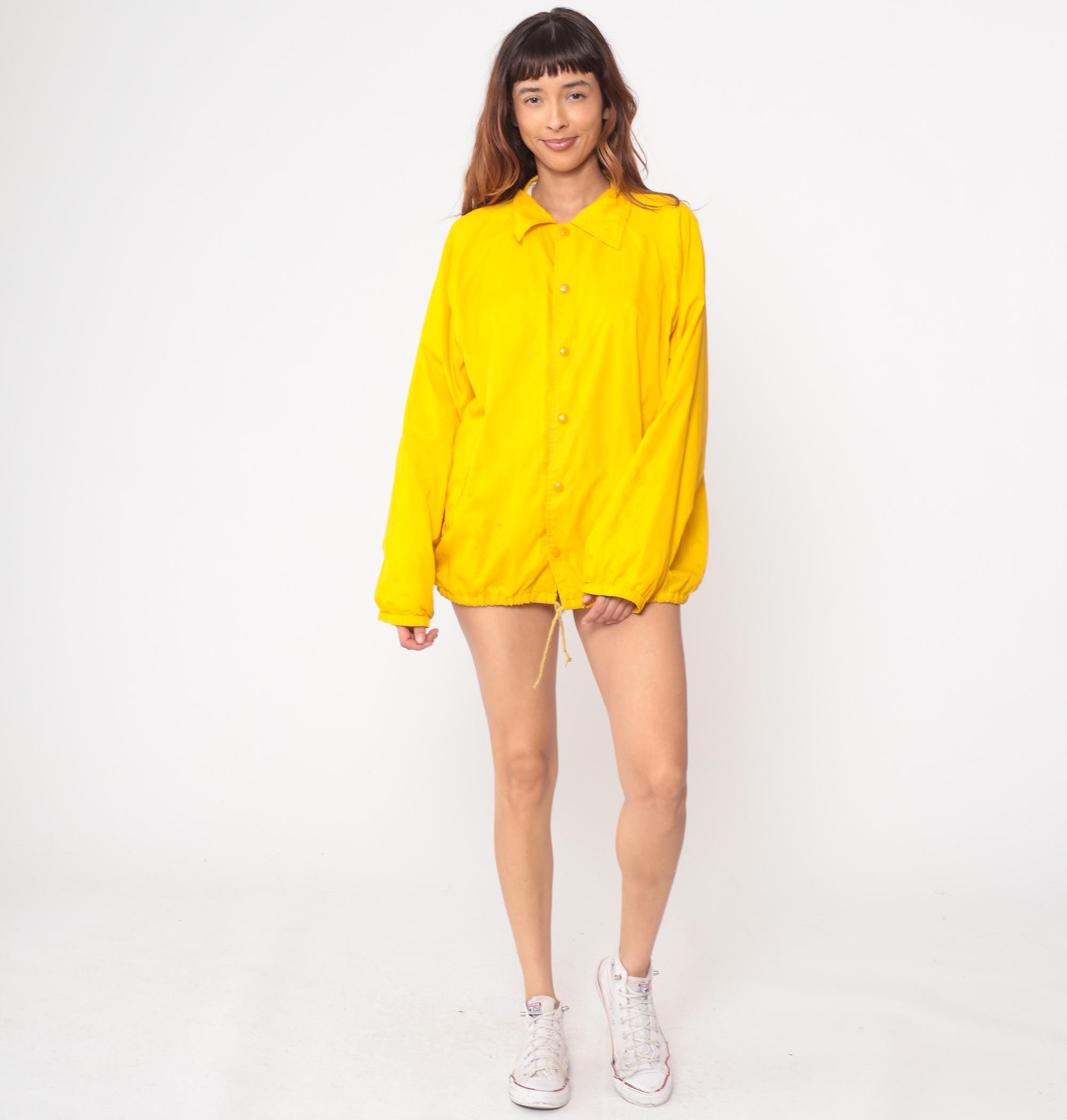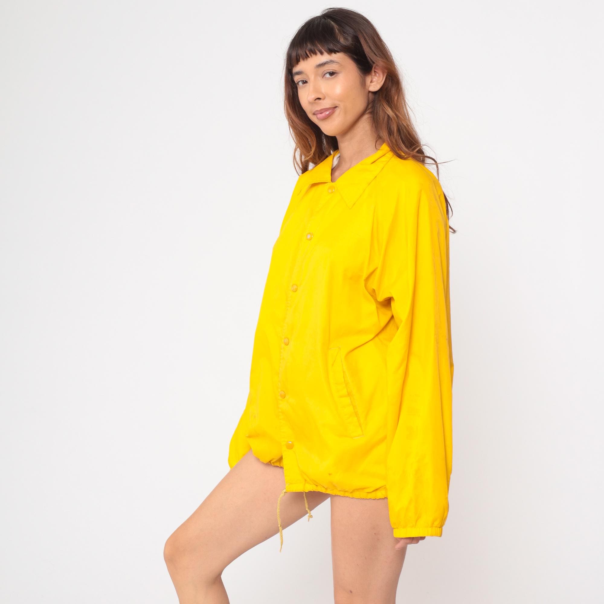 1980s Southern Medicine bright yellow windbreaker featuring a prominent Native American graphic on back. Official souvenir from Window Rock, Arizona with traditional Indigenous dancer illustration in black print. Button-front coach jacket style with classic pointed collar. Drawstring hem for adjustable fit.