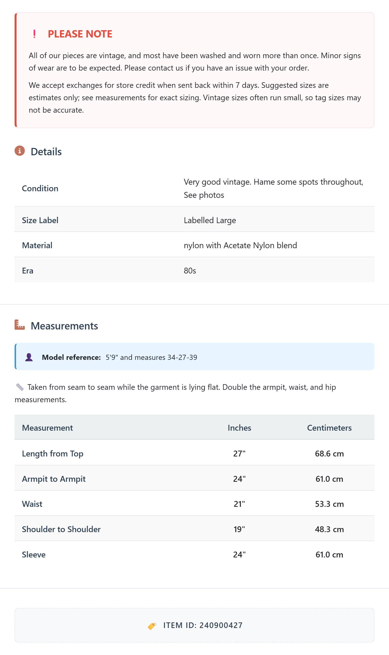 All of our pieces are vintage, and most have been washed and worn more than once. Minor signs of wear are to be expected. Please contact us if you have an issue with your order. We accept exchanges for store credit when sent back within 7 days.
