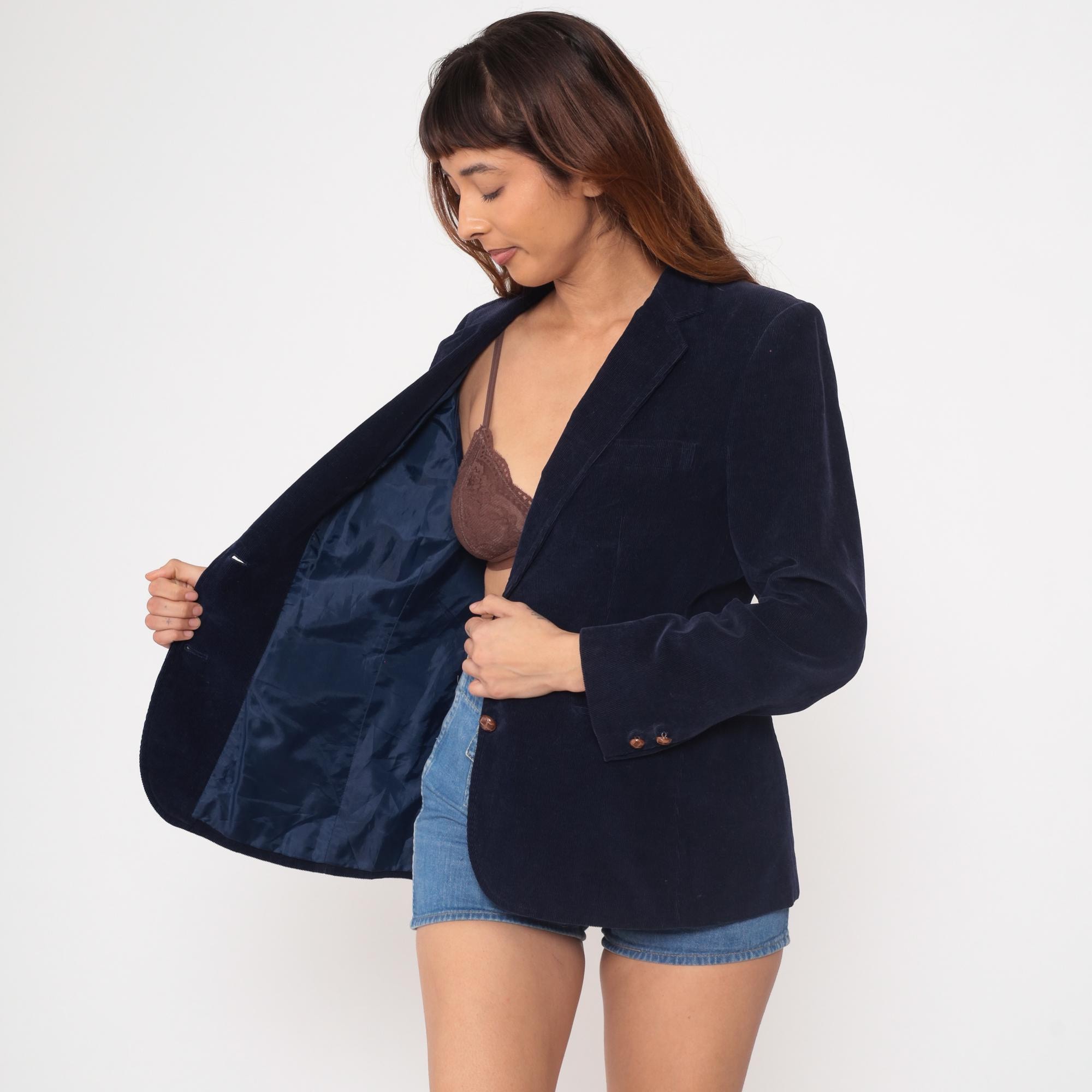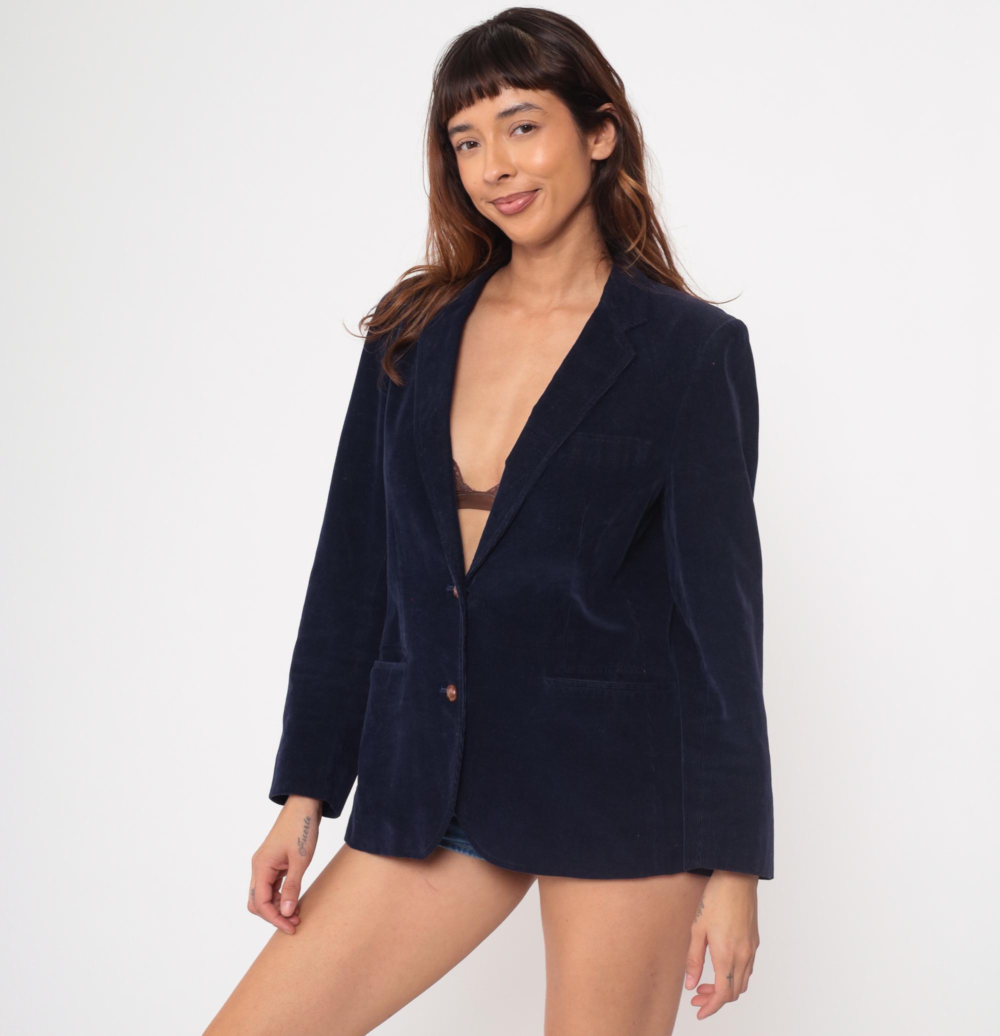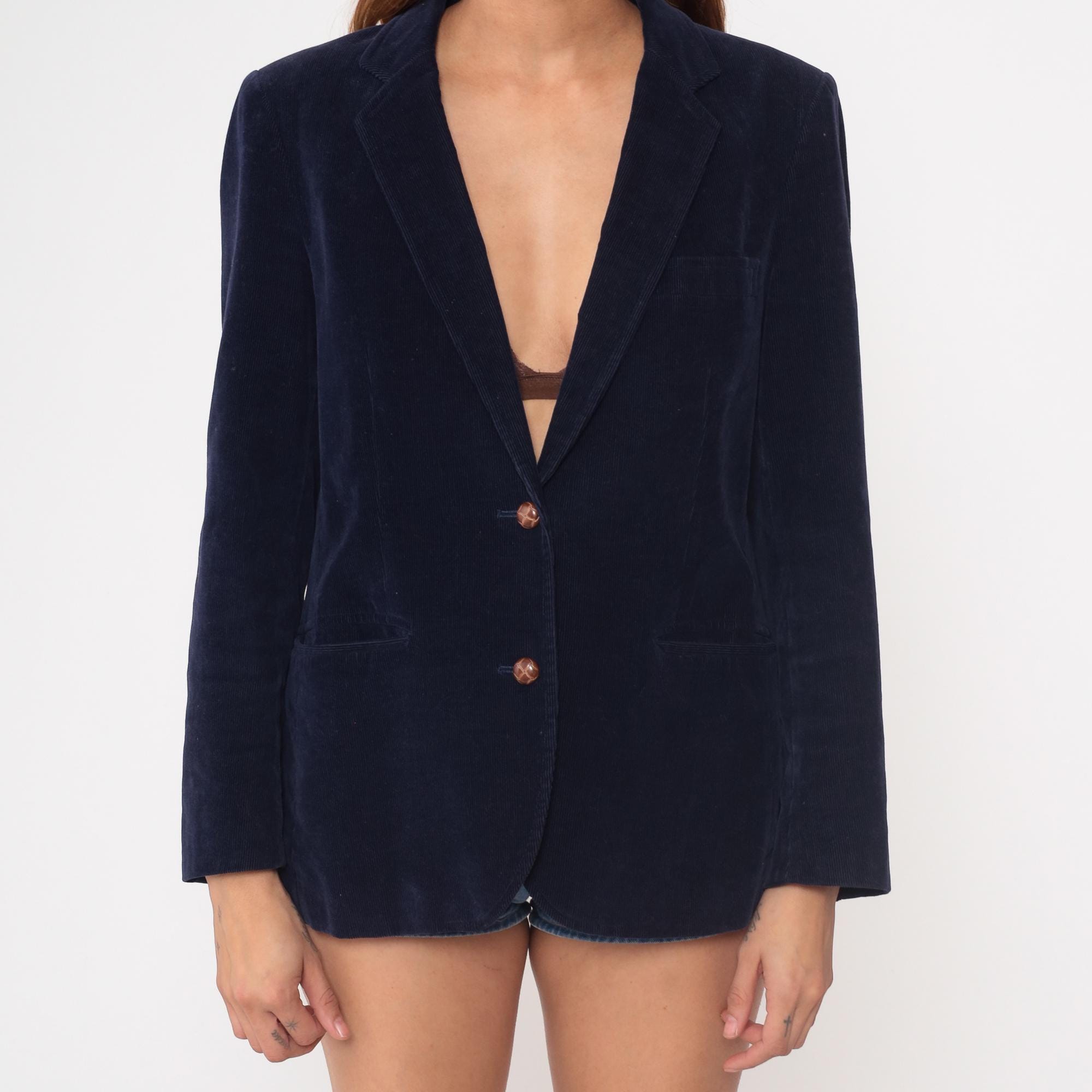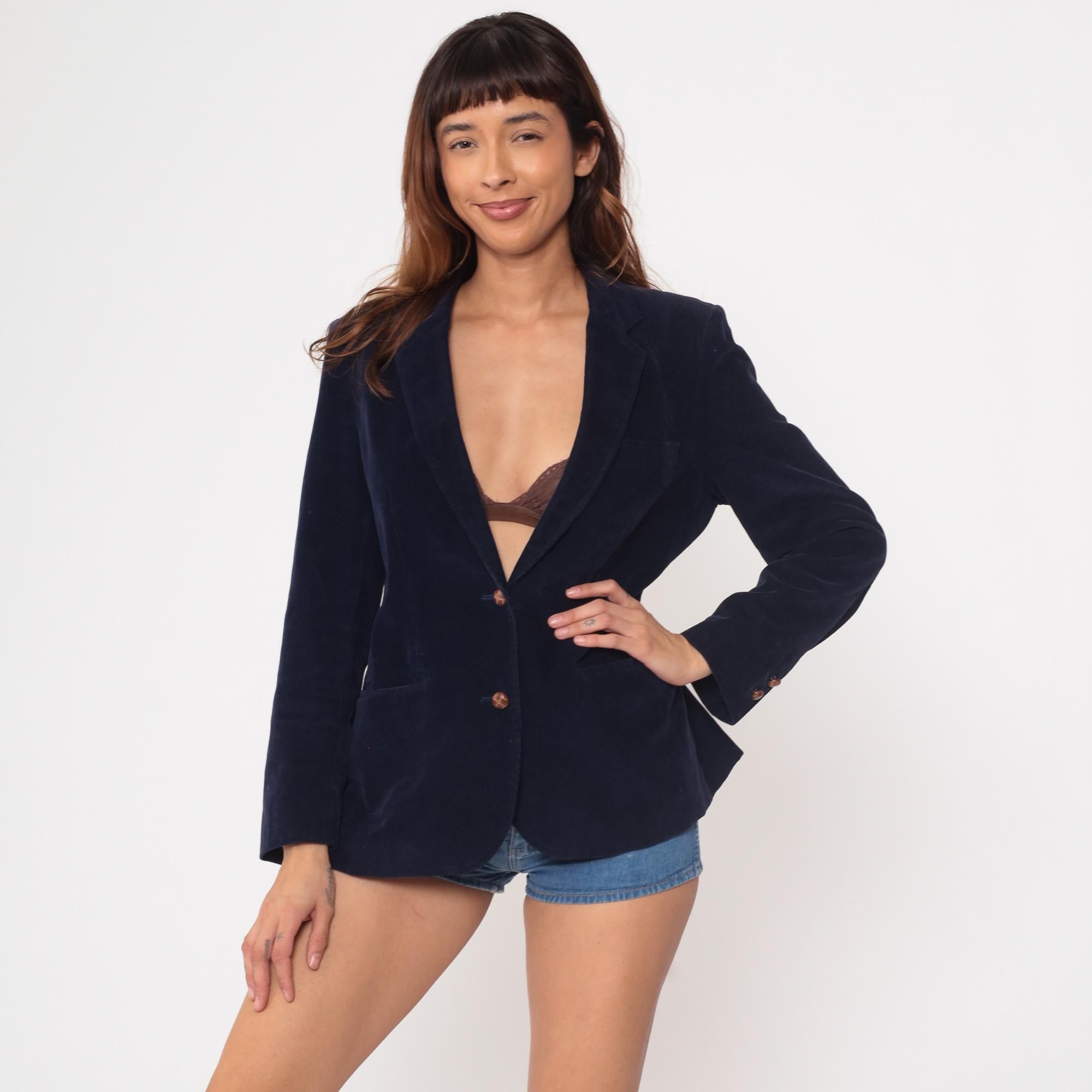 1980s De Mera navy blue corduroy blazer made in Japan. Features a sophisticated deep plunging V-neckline for a dramatic silhouette. Fine wale cotton corduroy with a luxuriously soft texture and rich midnight blue color. Two amber-colored buttons at front closure and matching buttons at cuffs. Classic notched lapel and single breast pocket.