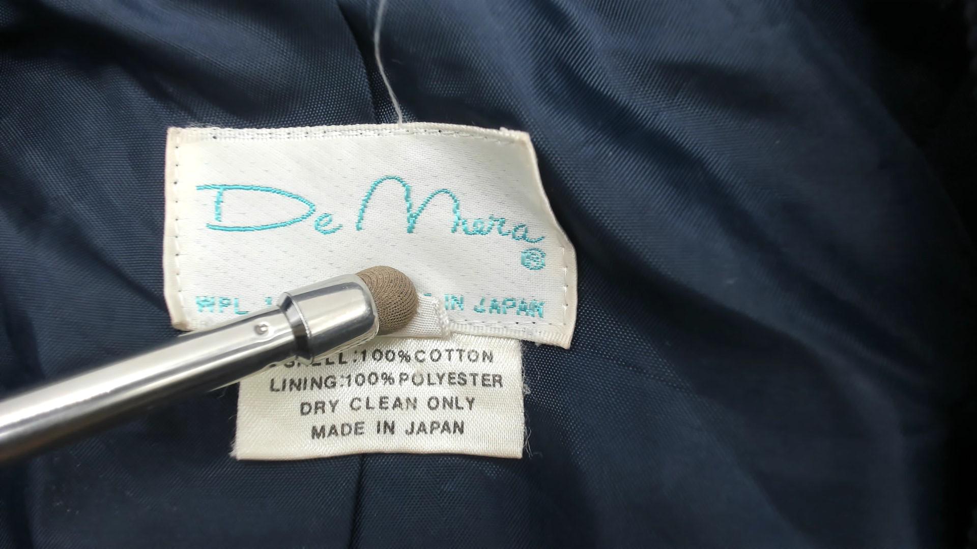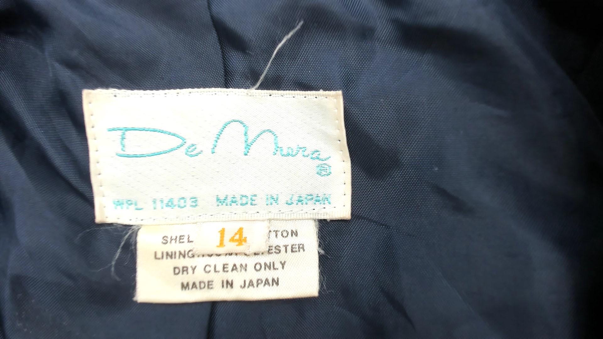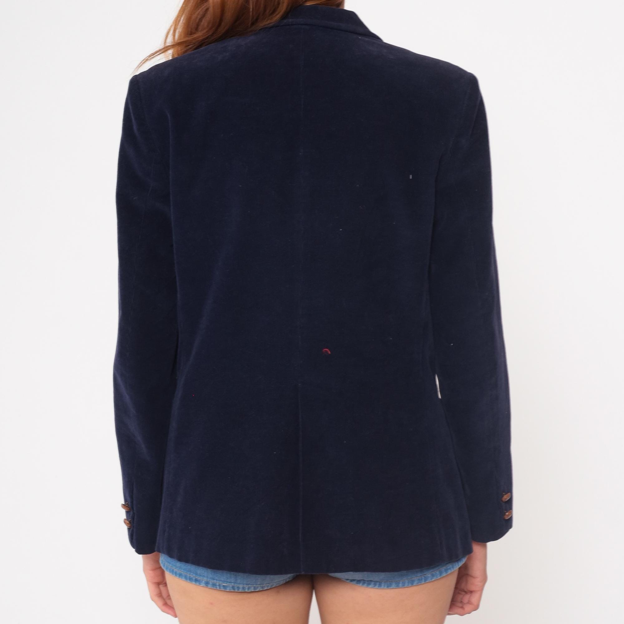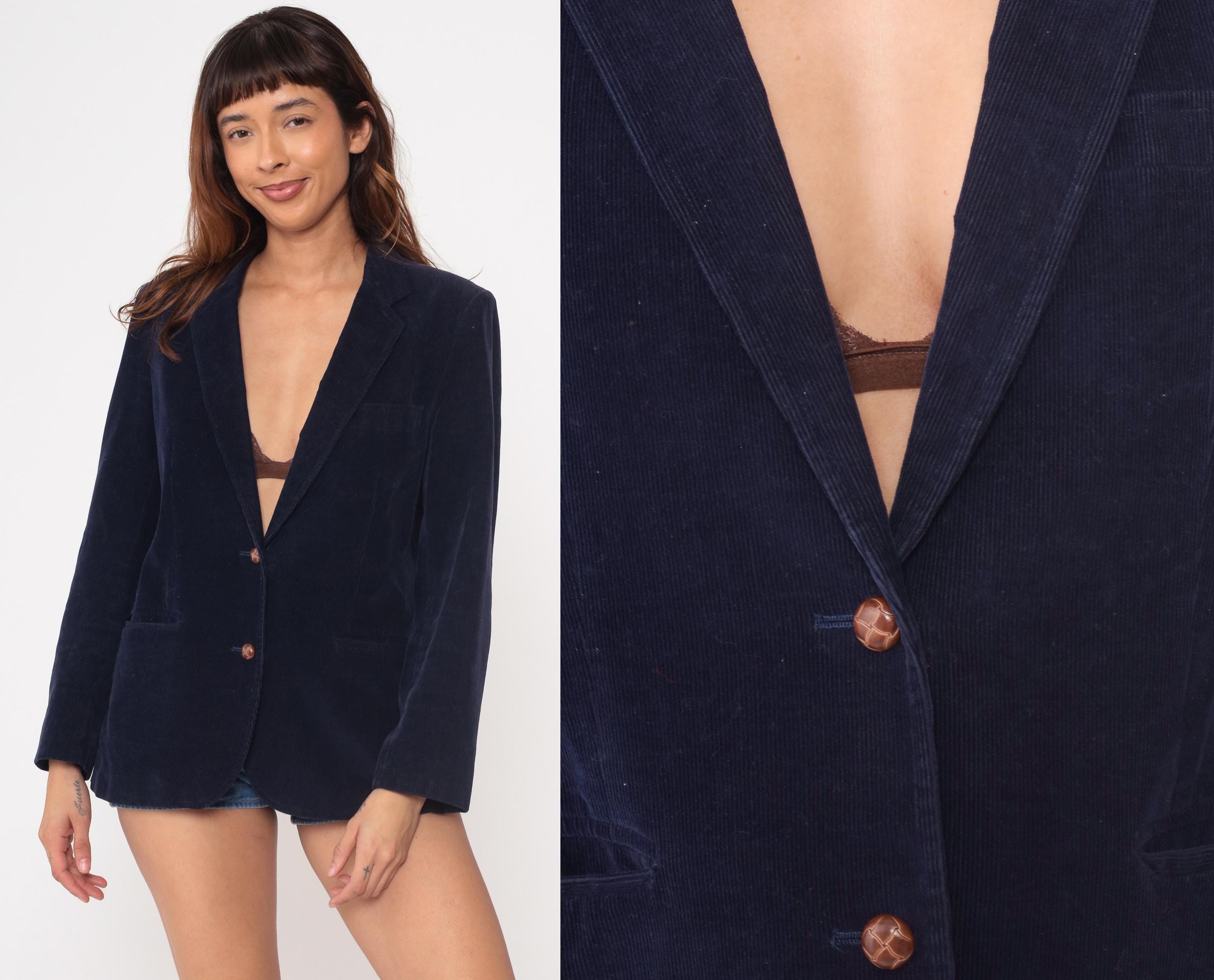 1980s De Mera navy blue corduroy blazer made in Japan. Features a sophisticated deep plunging V-neckline for a dramatic silhouette. Fine wale cotton corduroy with a luxuriously soft texture and rich midnight blue color. Two amber-colored buttons at front closure and matching buttons at cuffs. Classic notched lapel and single breast pocket.