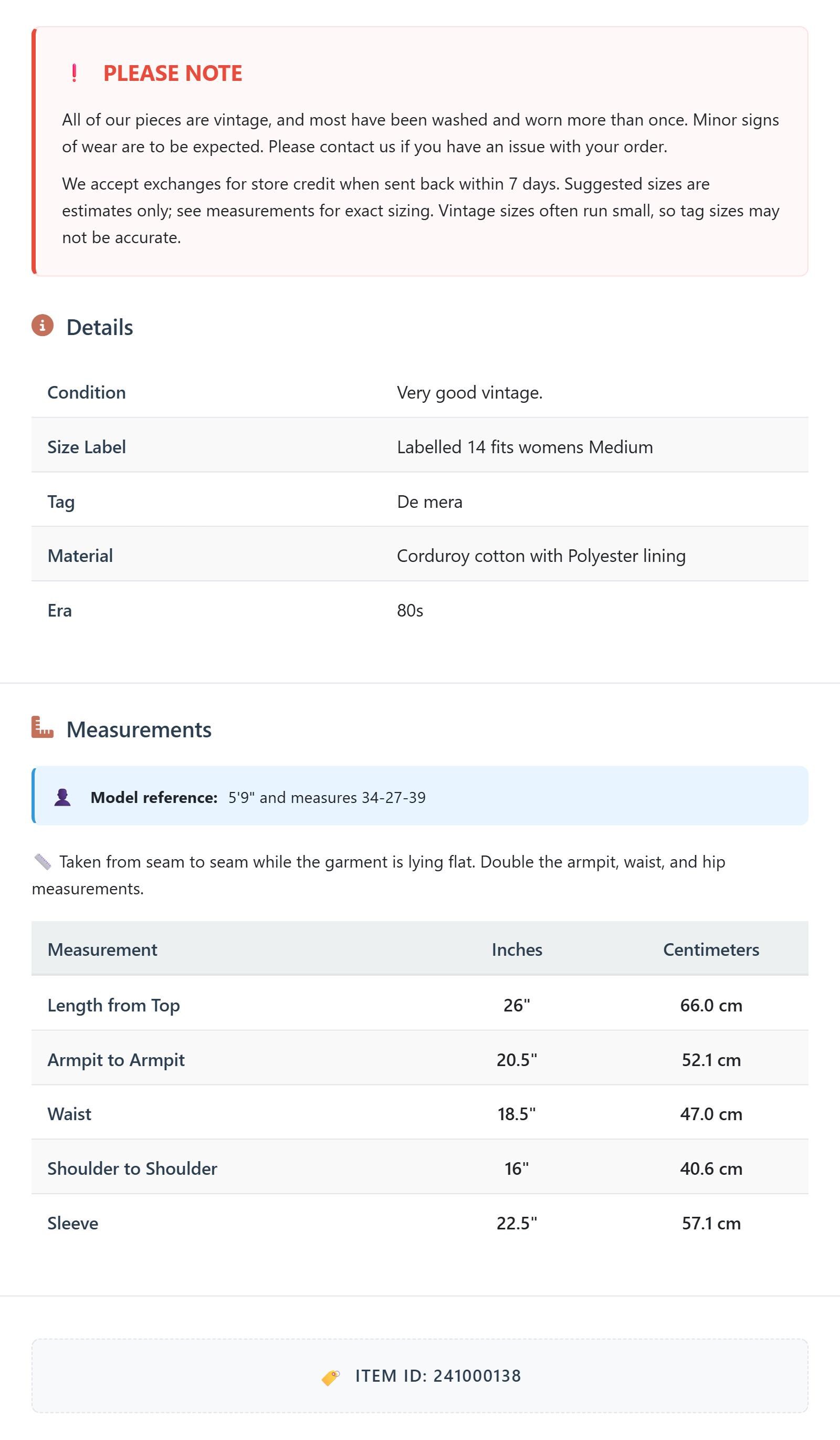Suggested sizes are estimates only; see measurements for exact sizing. Vintage sizes often run small, so tag sizes may not be accurate.