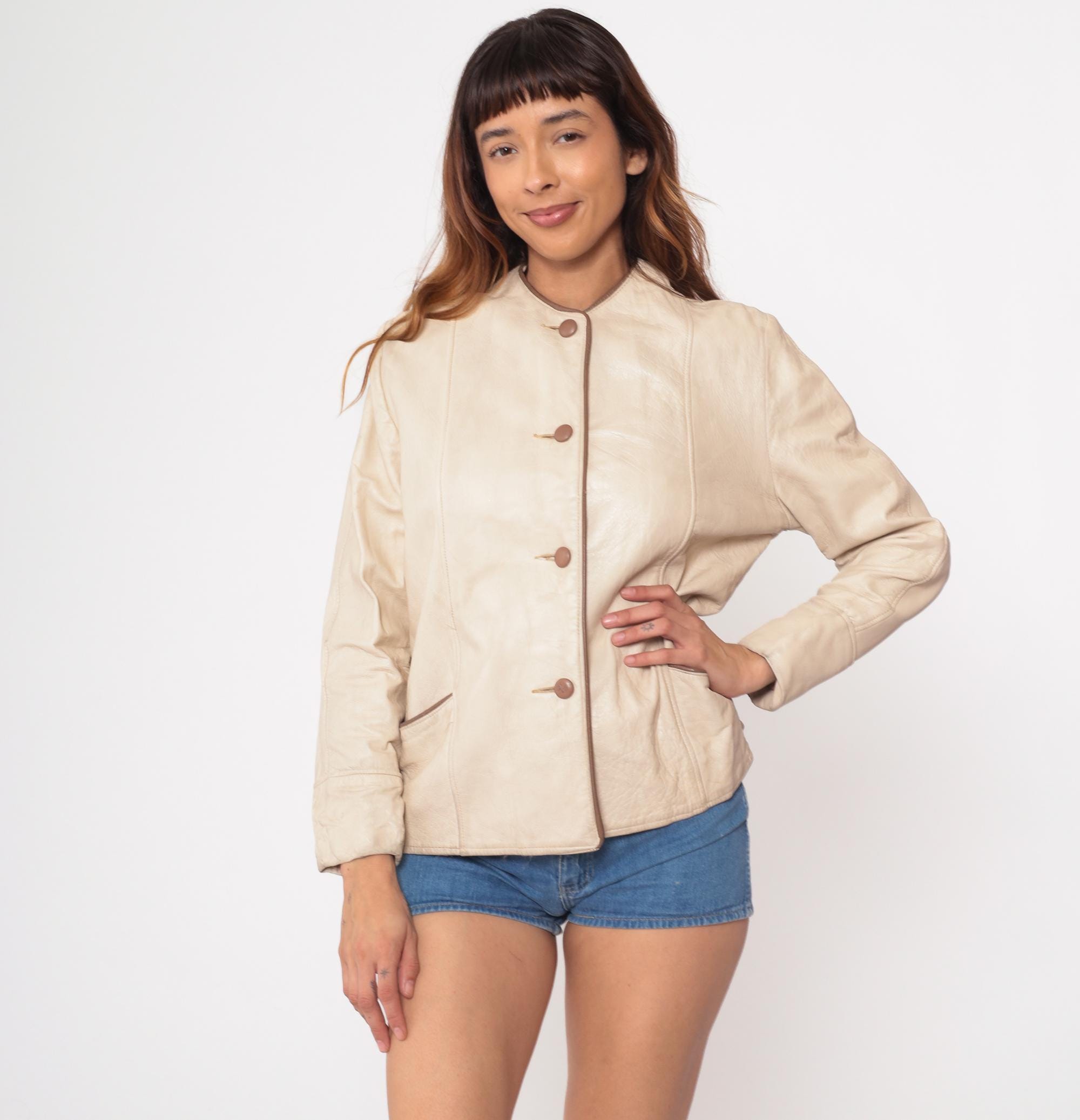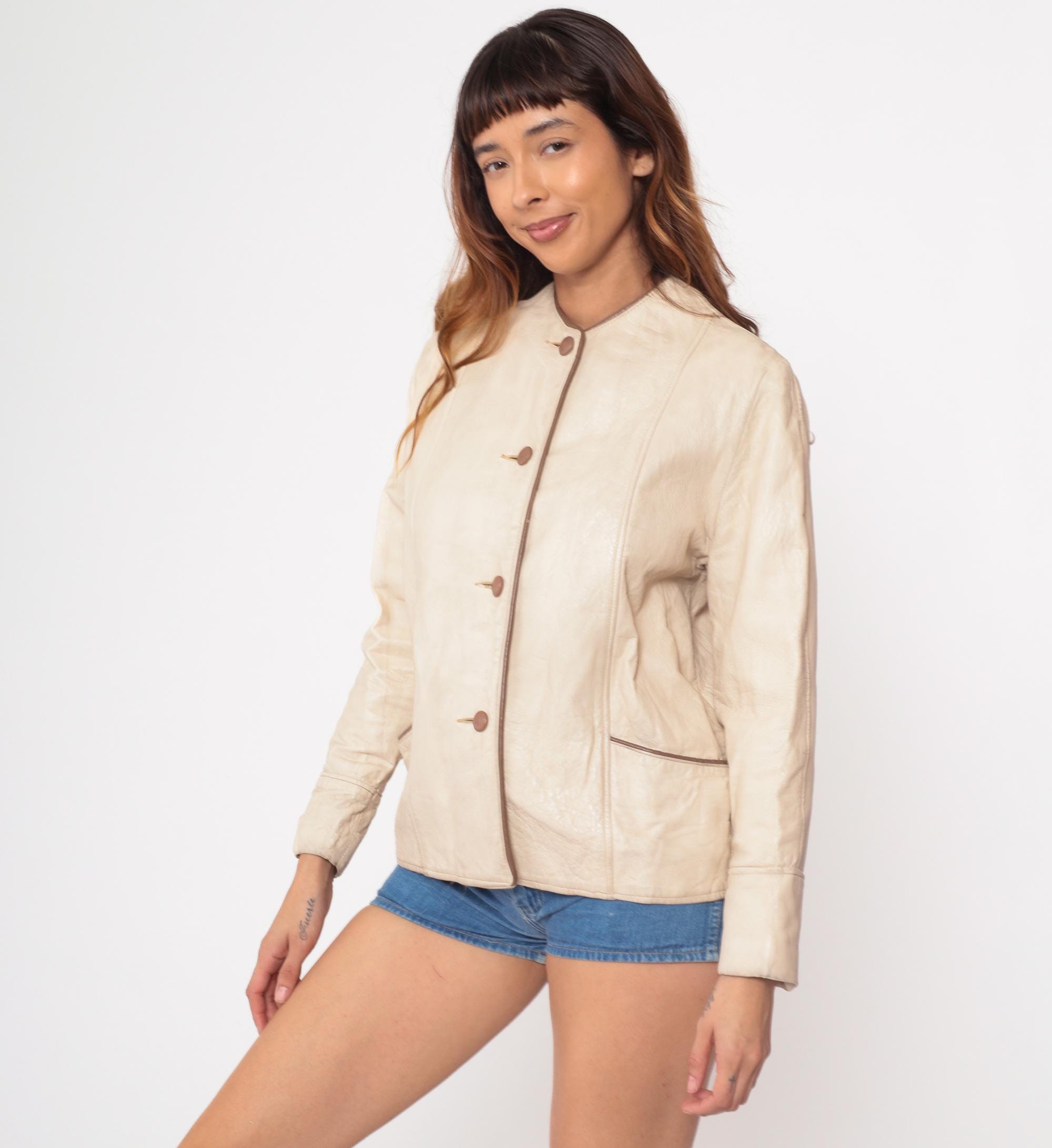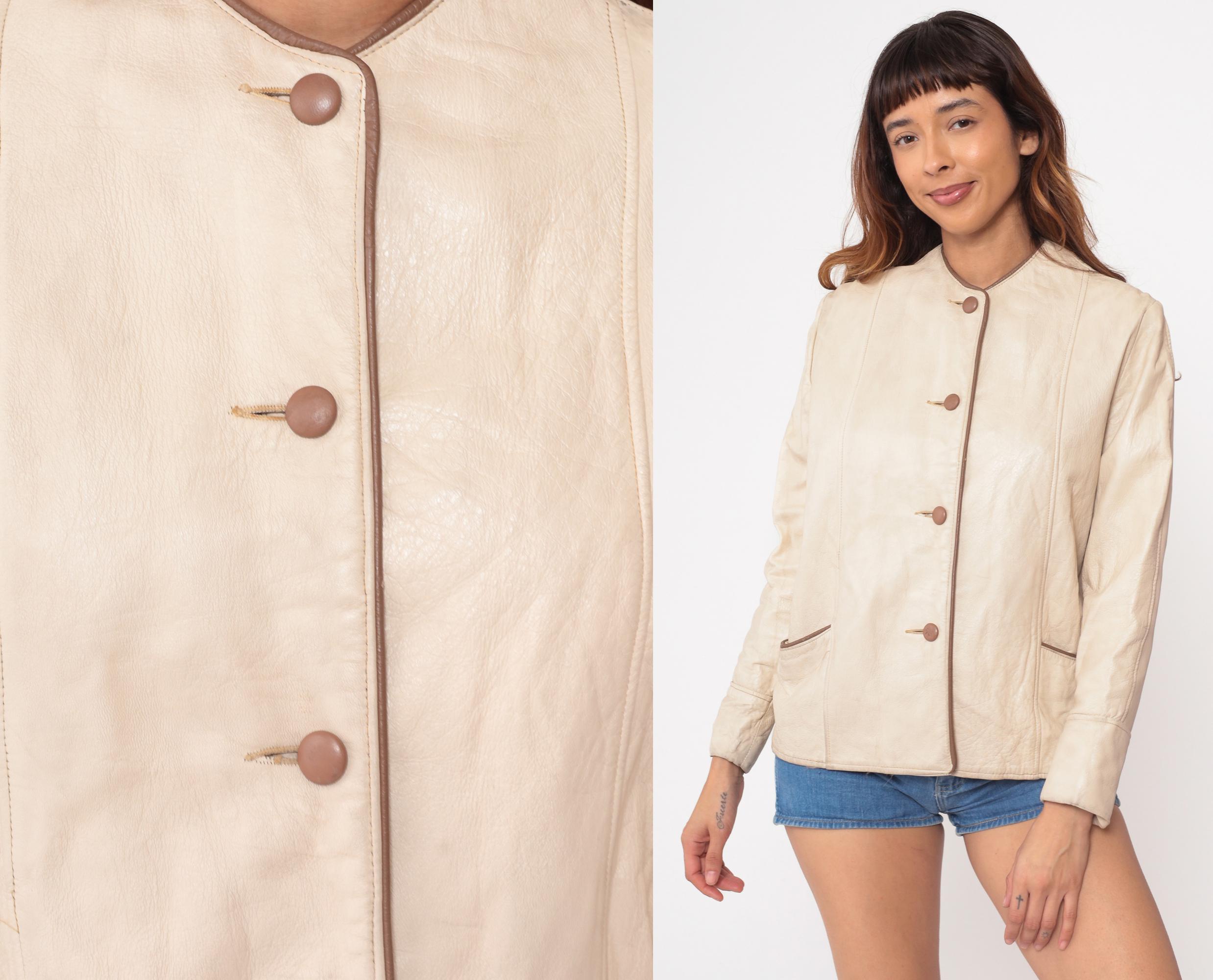 1970s minimalist leather jacket in a soft cream/off-white tone. Features a sleek collarless design with clean architectural lines. Four button front closure with distinctive brown-covered buttons. Brown piping trim along front edges and pocket openings creates elegant contrast detailing.