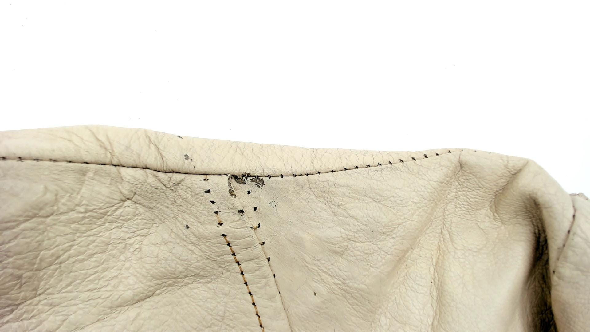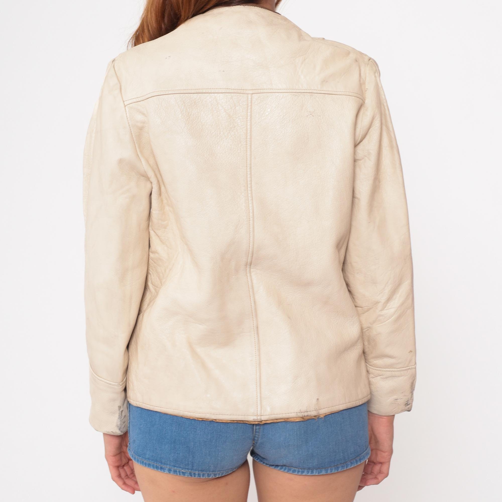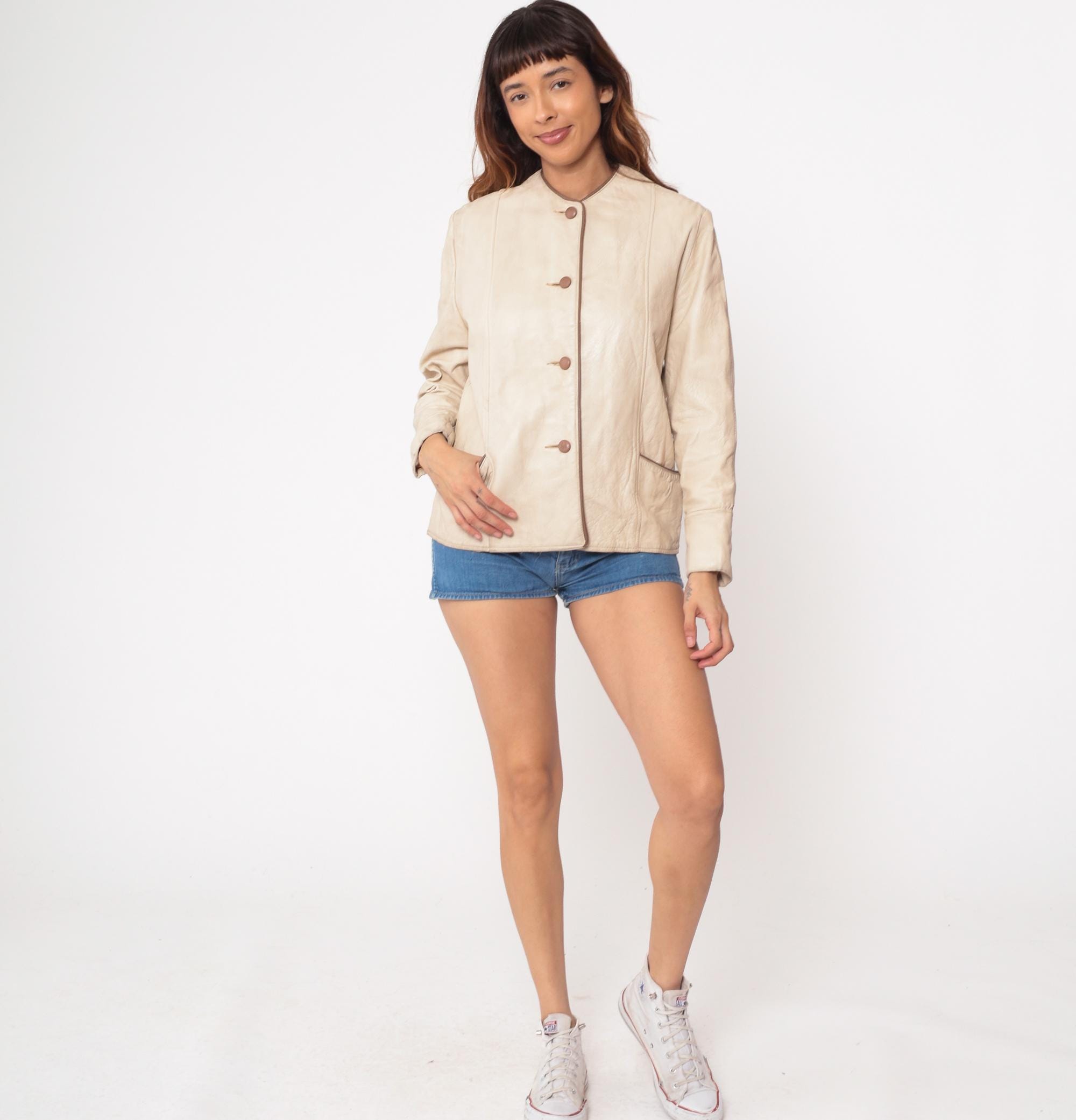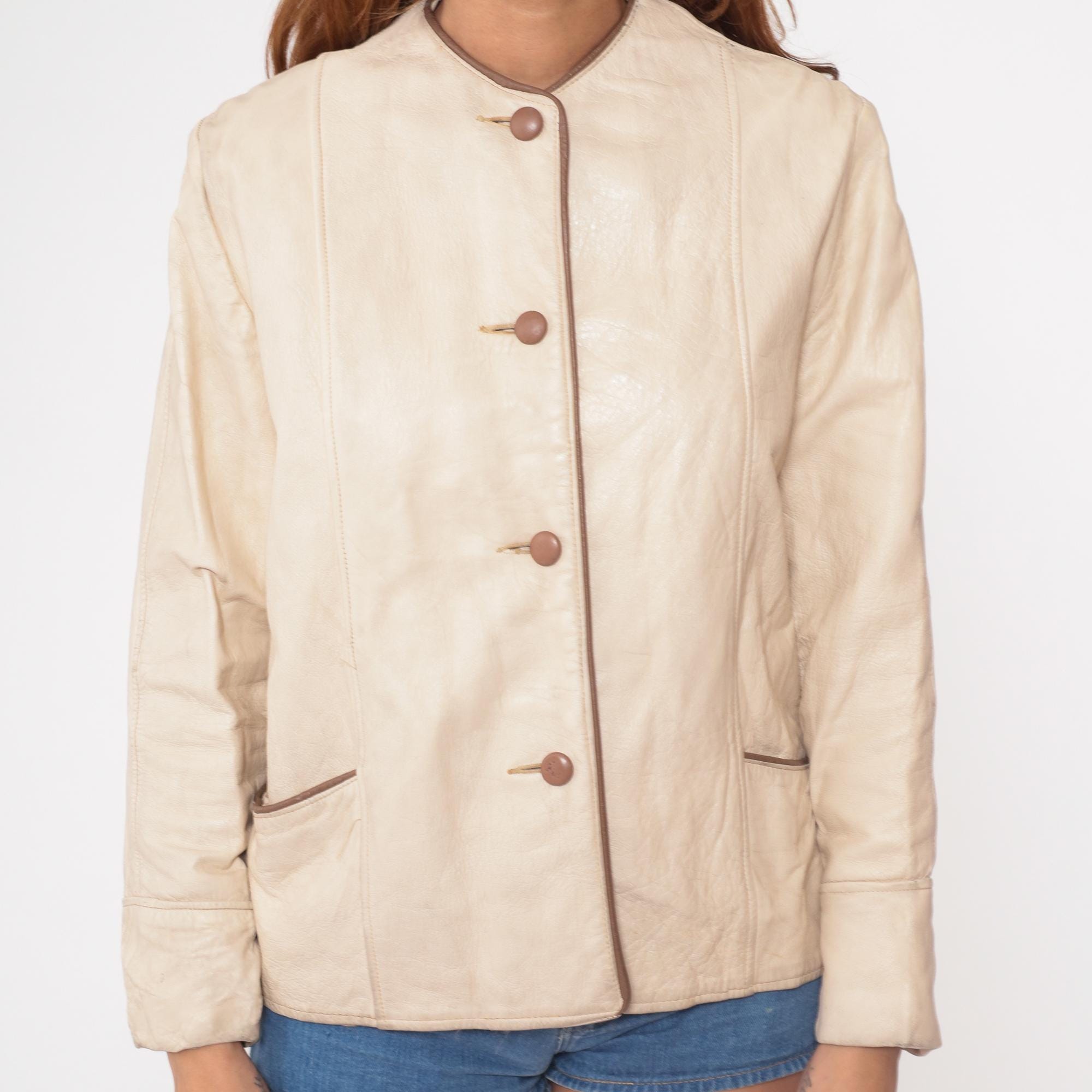1970s minimalist leather jacket in a soft cream/off-white tone. Features a sleek collarless design with clean architectural lines. Four button front closure with distinctive brown-covered buttons. Brown piping trim along front edges and pocket openings creates elegant contrast detailing.