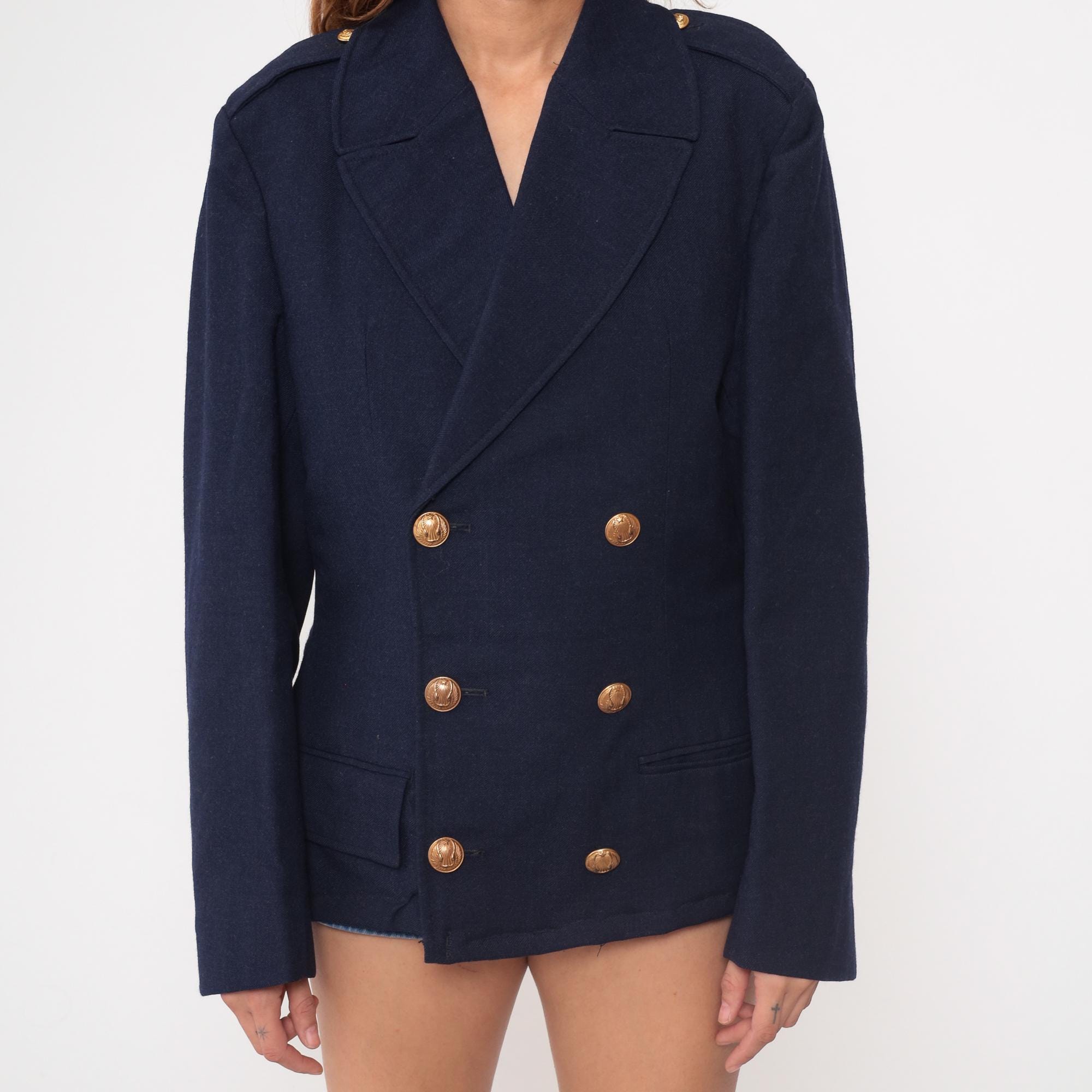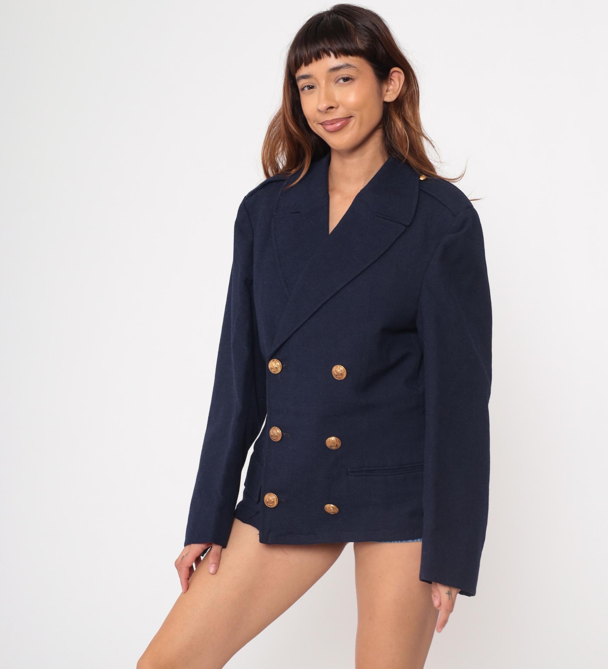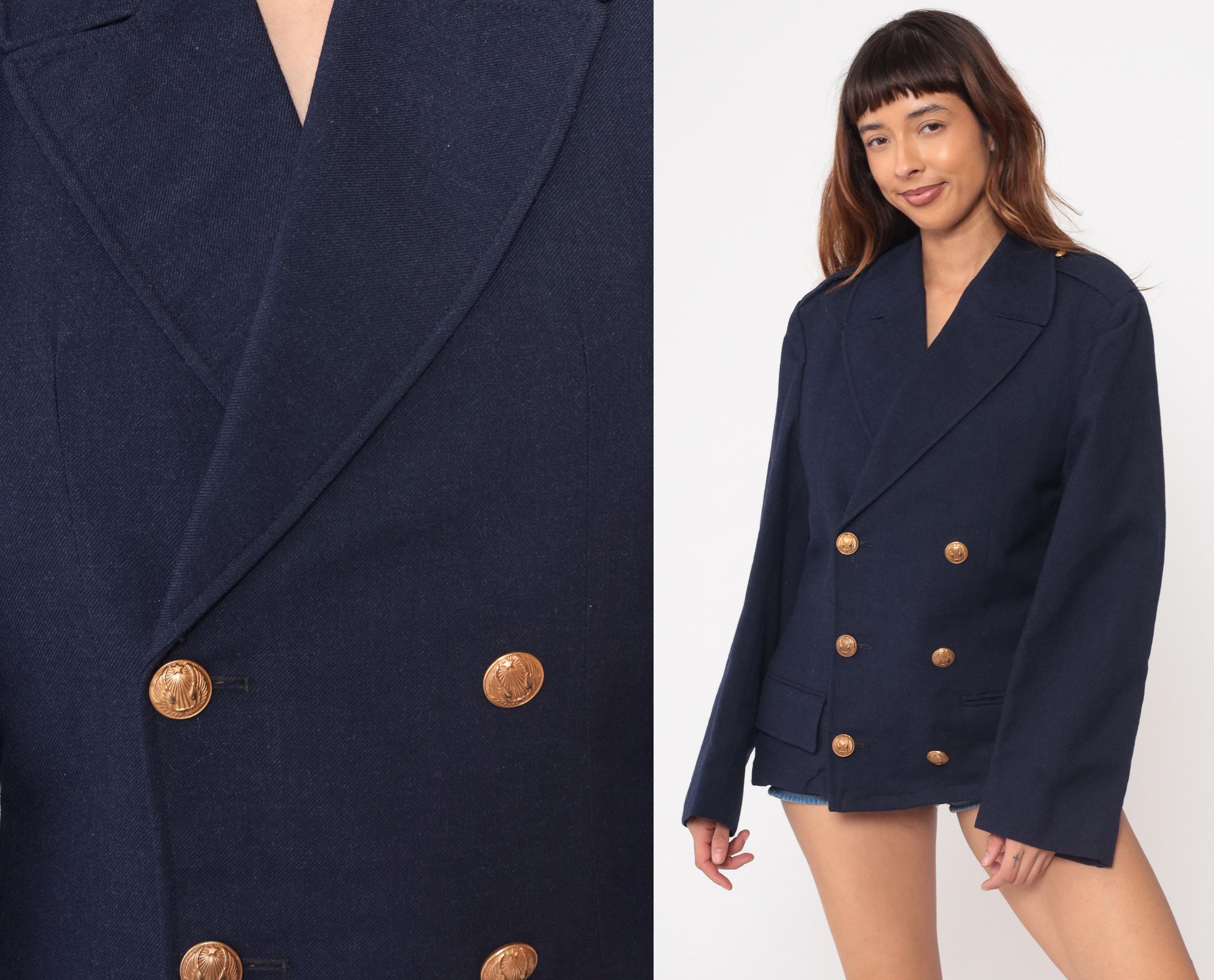 1970s navy blue wool blazer in classic maritime style. Features authentic nautical details including double-breasted front with six decorative anchor-embossed gold buttons. Traditional naval styling with wide lapels and structured shoulders. Two functional front pockets with flaps.