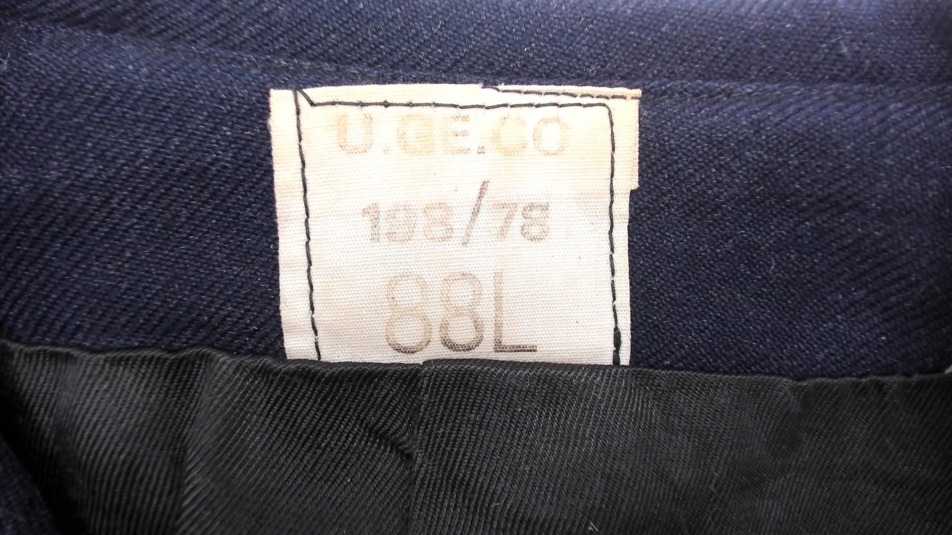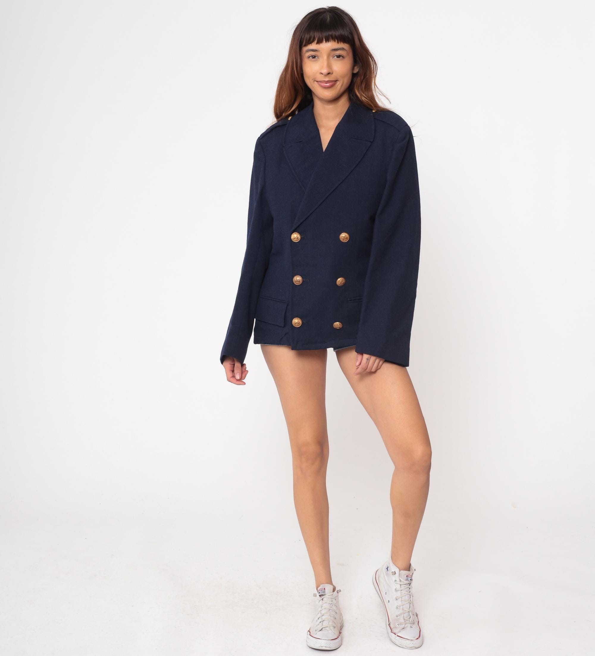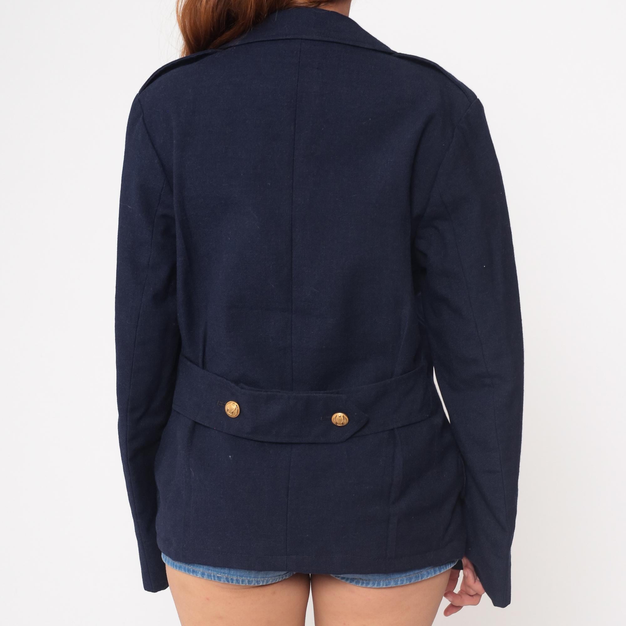 1970s navy blue wool blazer in classic maritime style. Features authentic nautical details including double-breasted front with six decorative anchor-embossed gold buttons. Traditional naval styling with wide lapels and structured shoulders. Two functional front pockets with flaps.