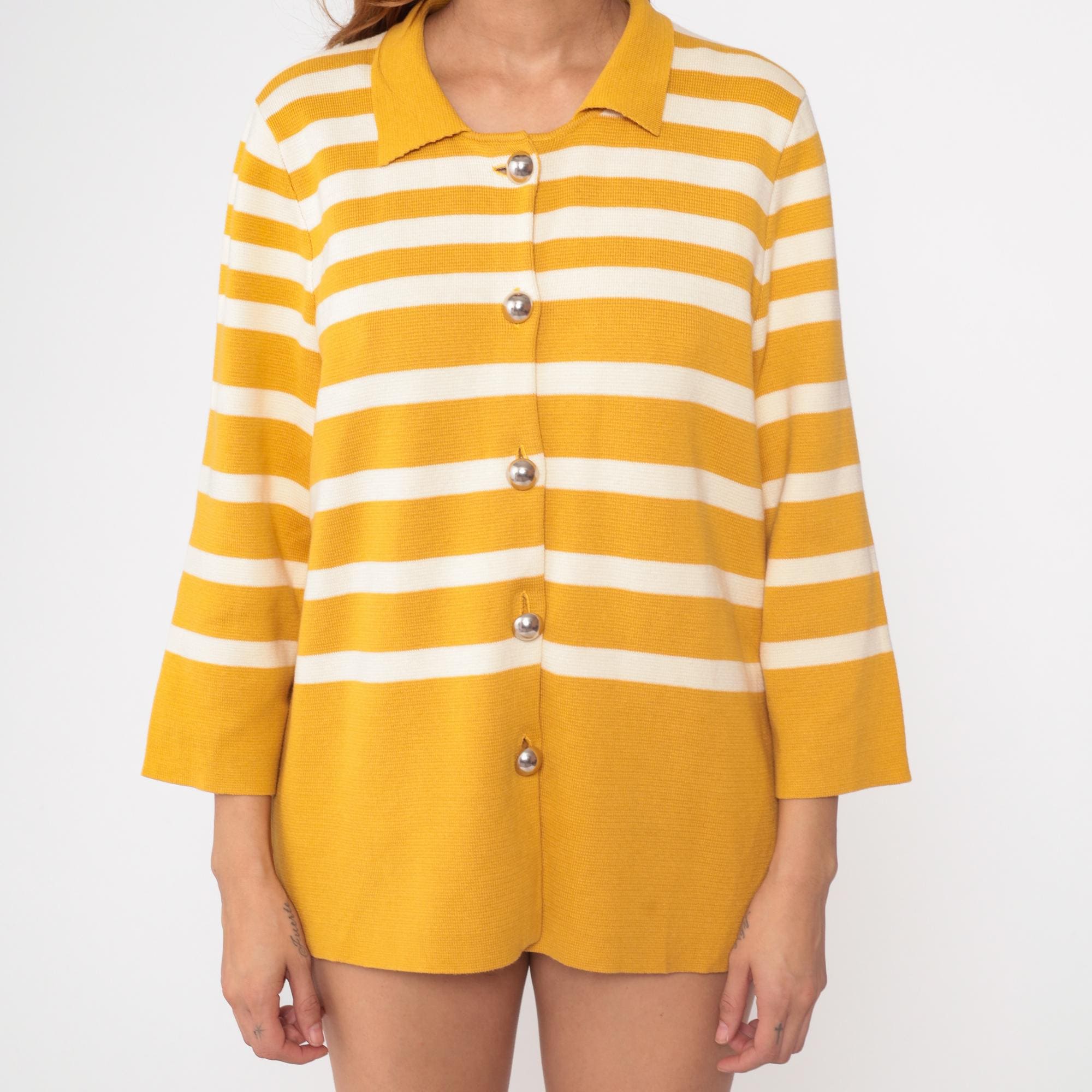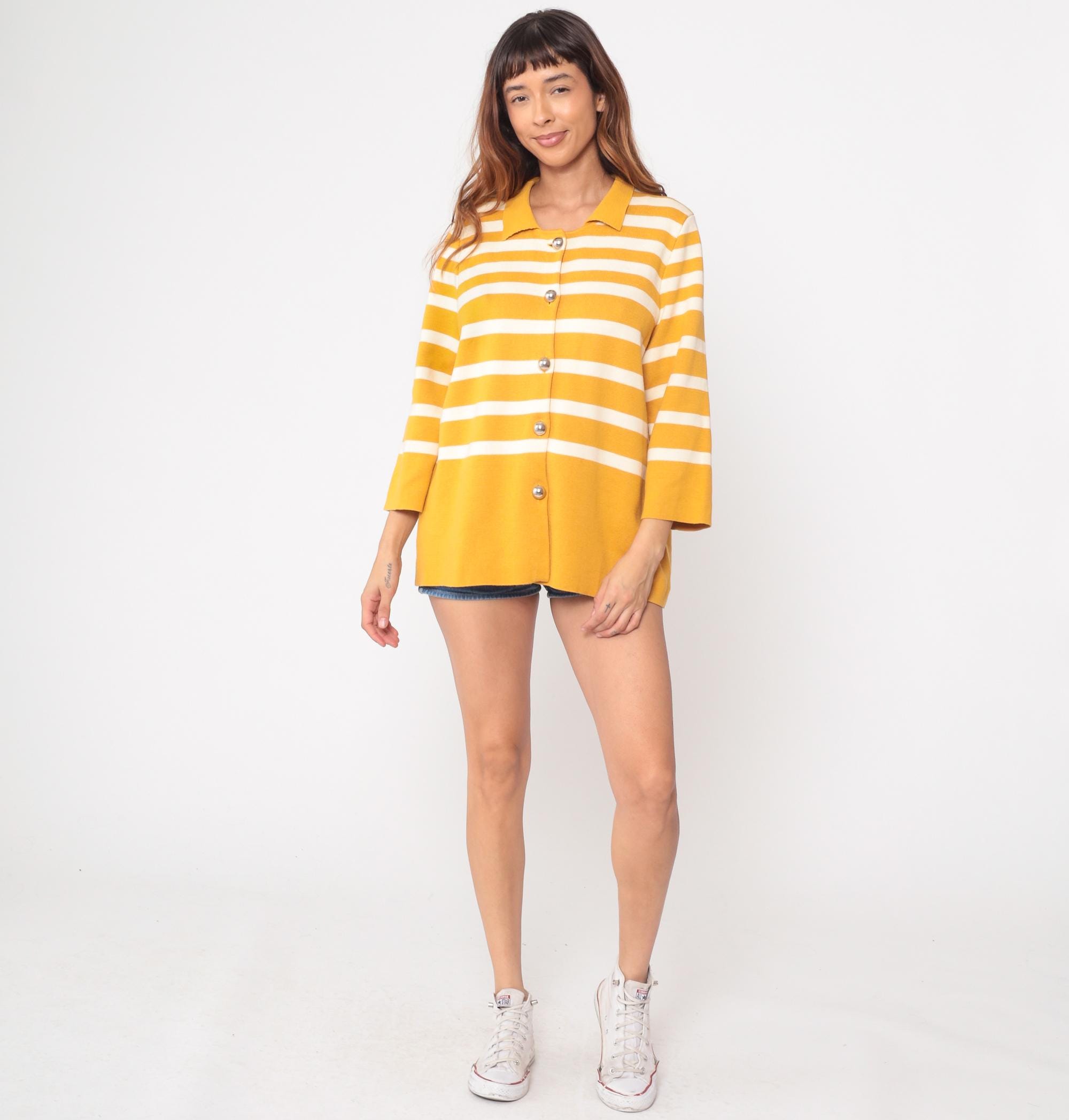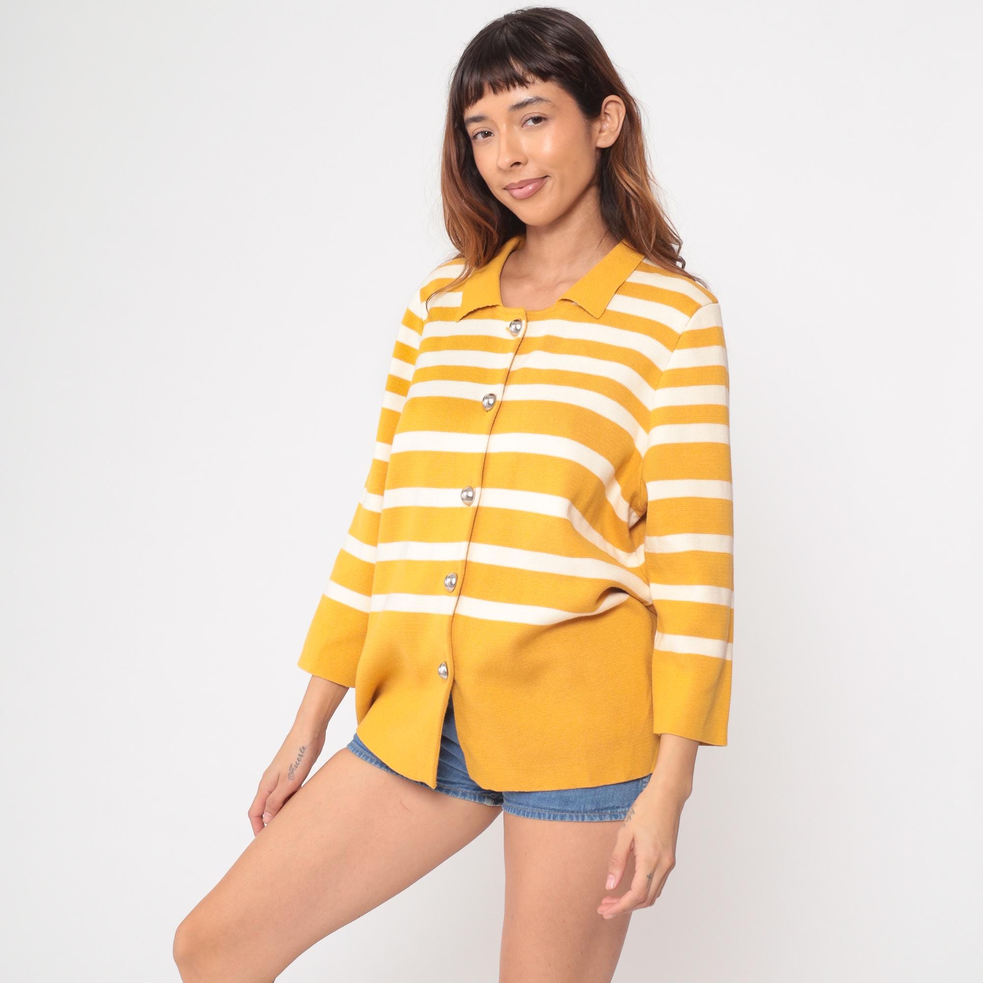 Y2K Liz Claiborne cardigan featuring bold mustard yellow and white horizontal stripes. Designed with a pointed collar, silver-tone button front, and boxy relaxed fit.